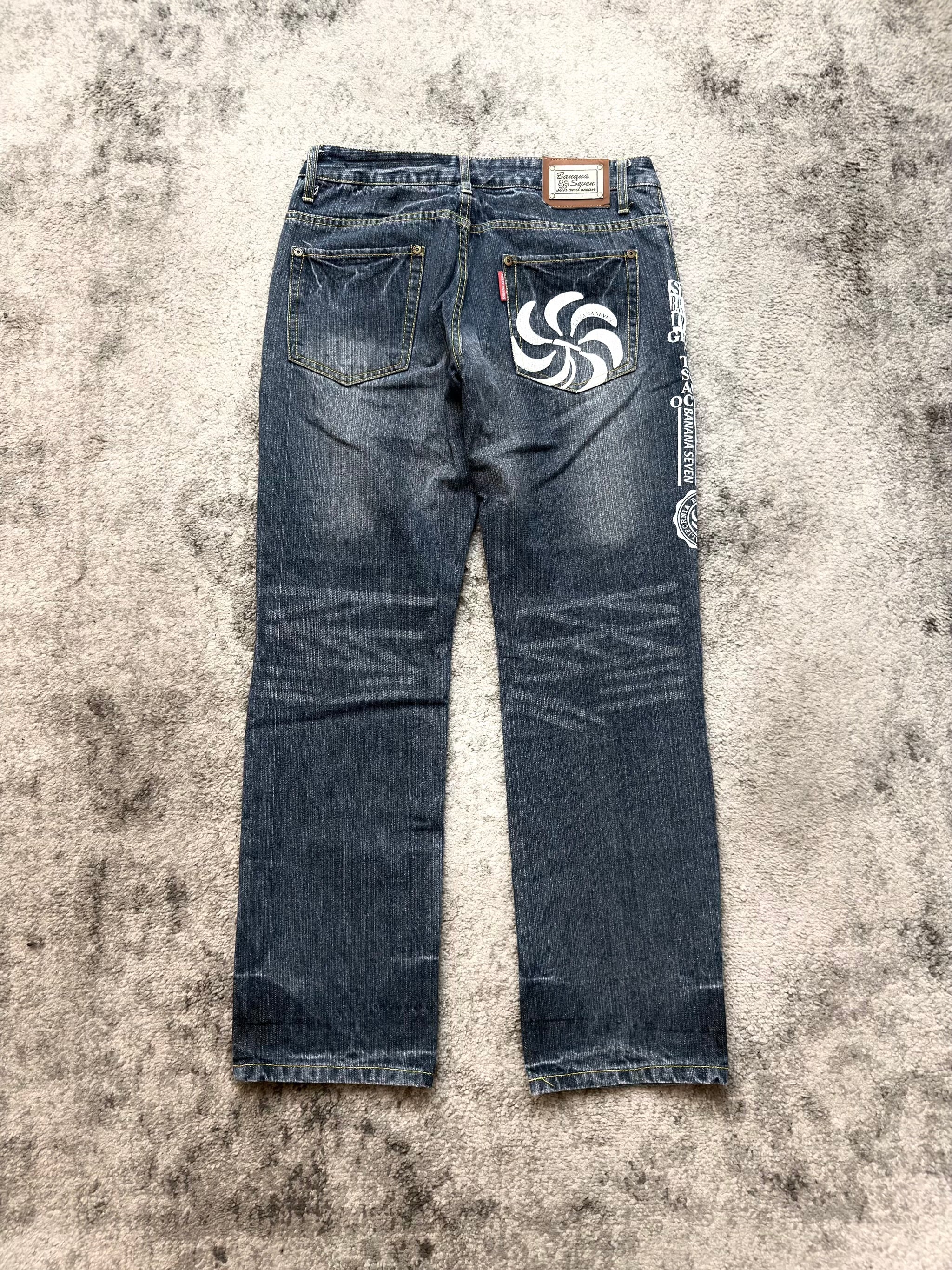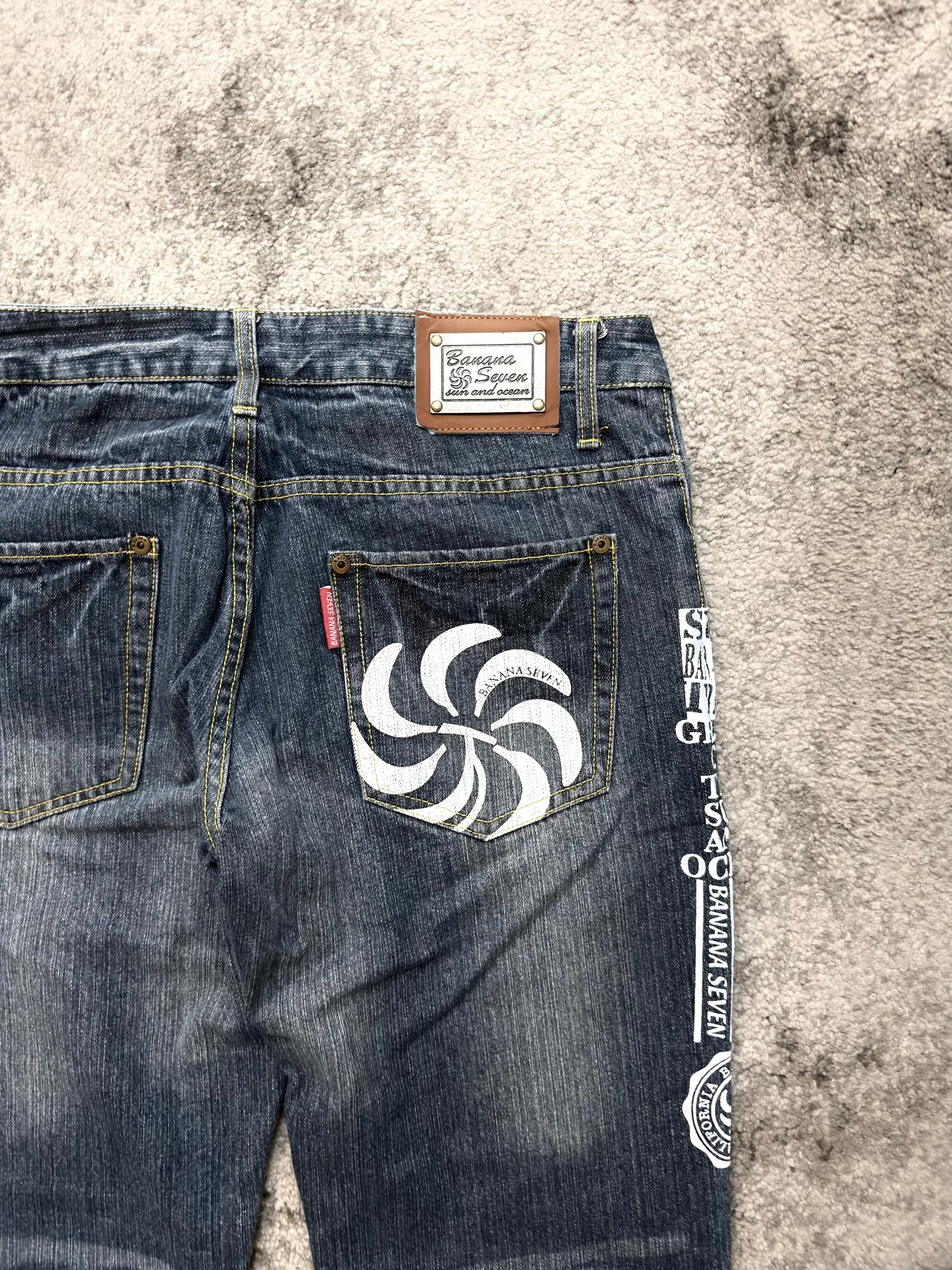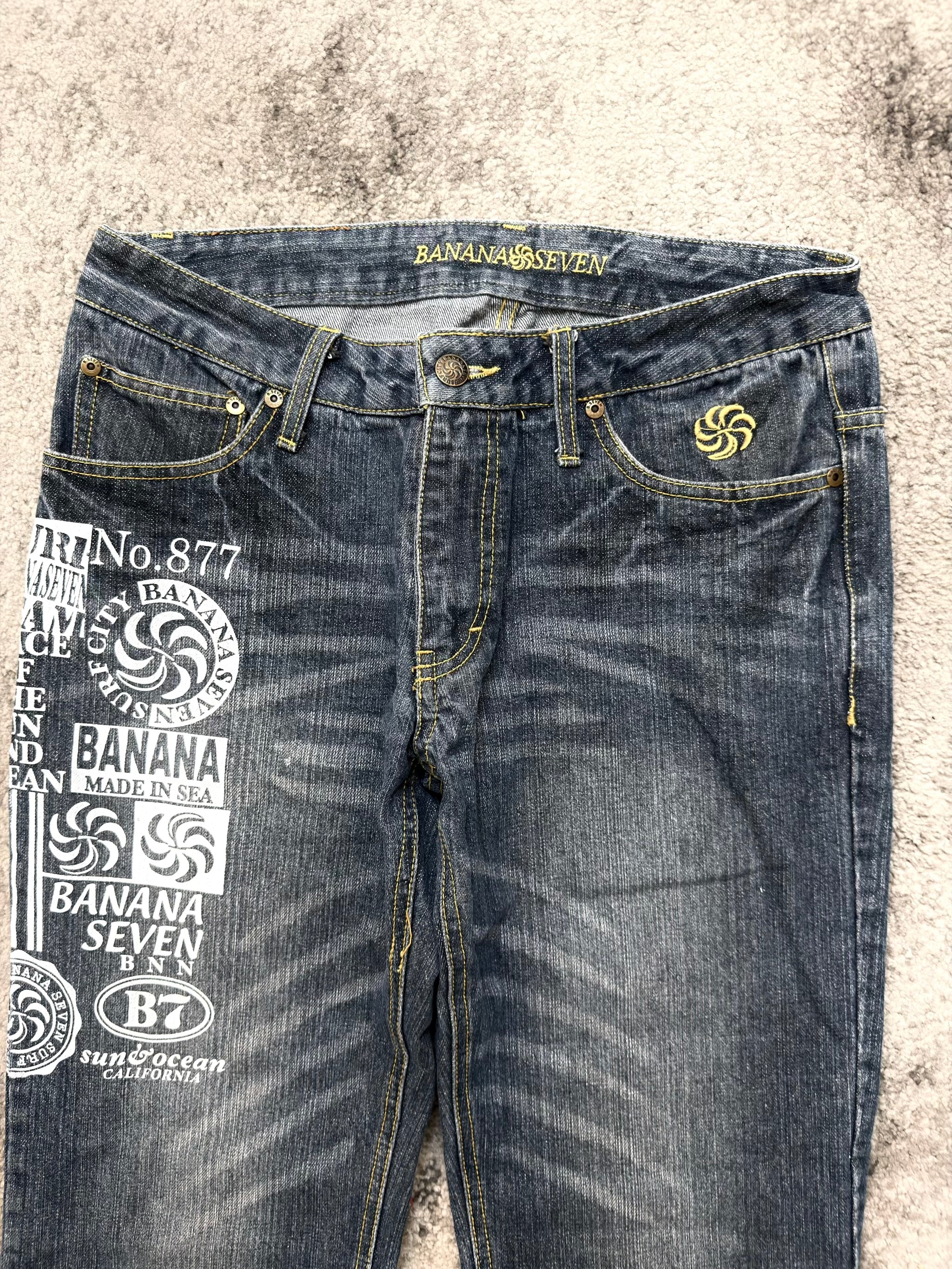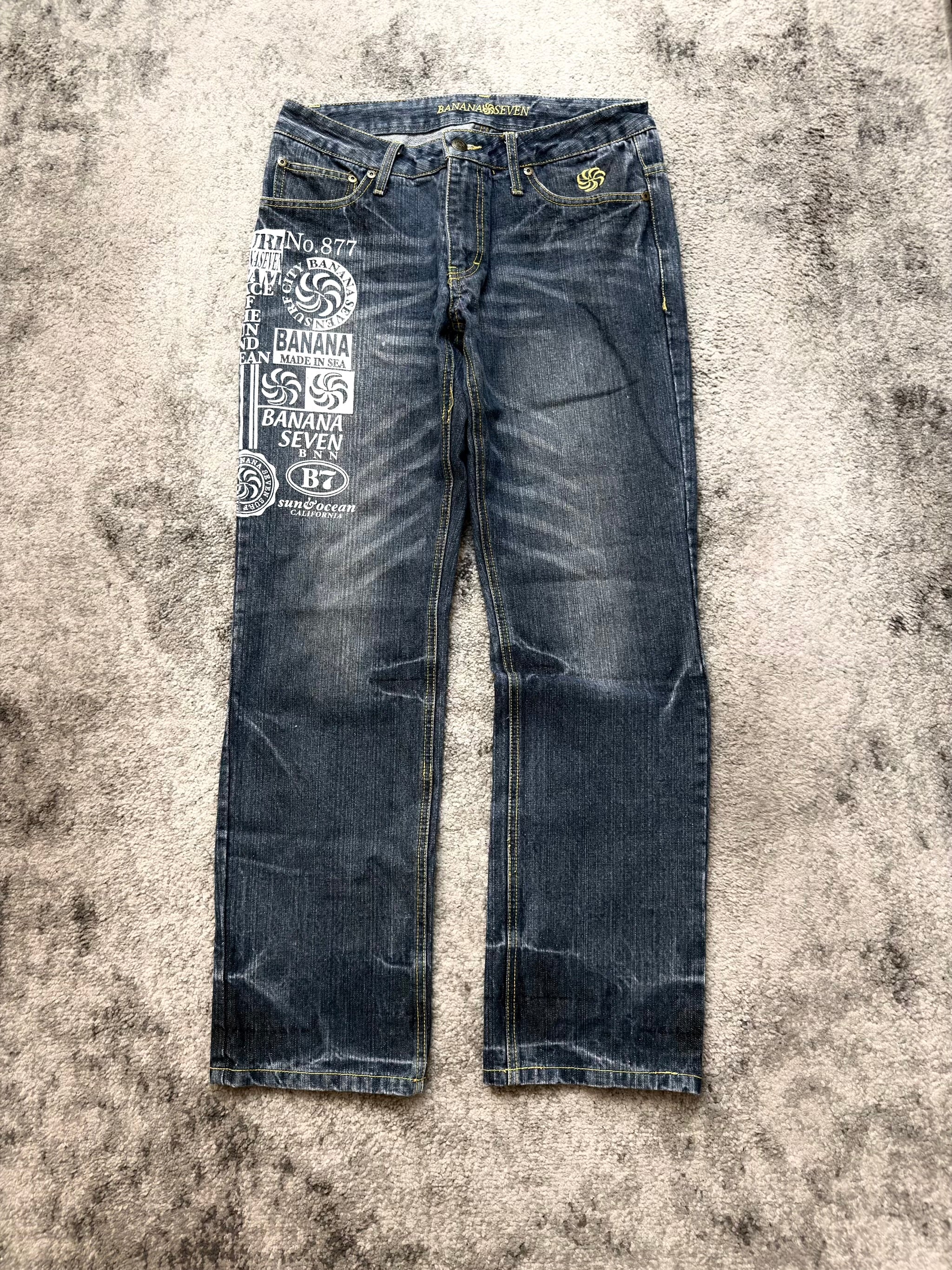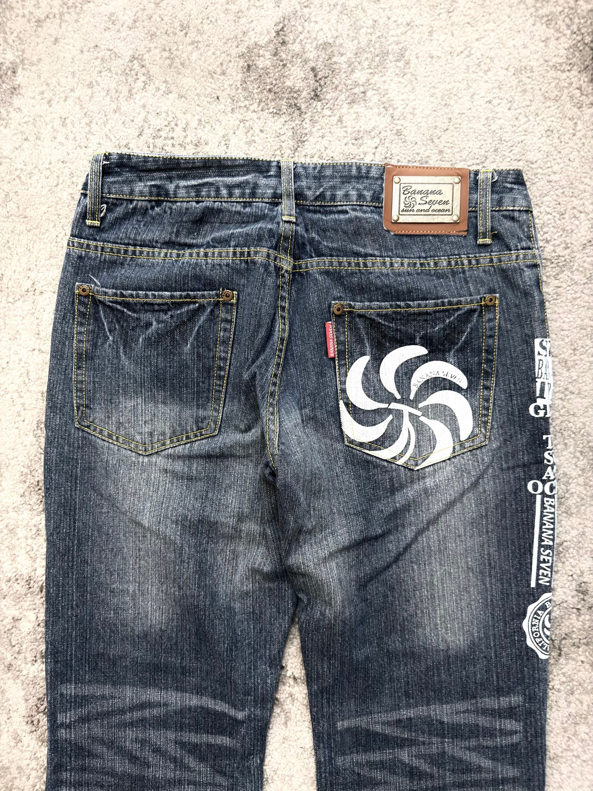 A true piece of early-2000s Japanese street heritage — these BANANA SEVEN jeans blend skate culture energy with that unmistakable Harajuku edge. Featuring bold graphic prints on the thigh and back pocket, the design feels like a snapshot of an era where denim was art and rebellion was a lifestyle.