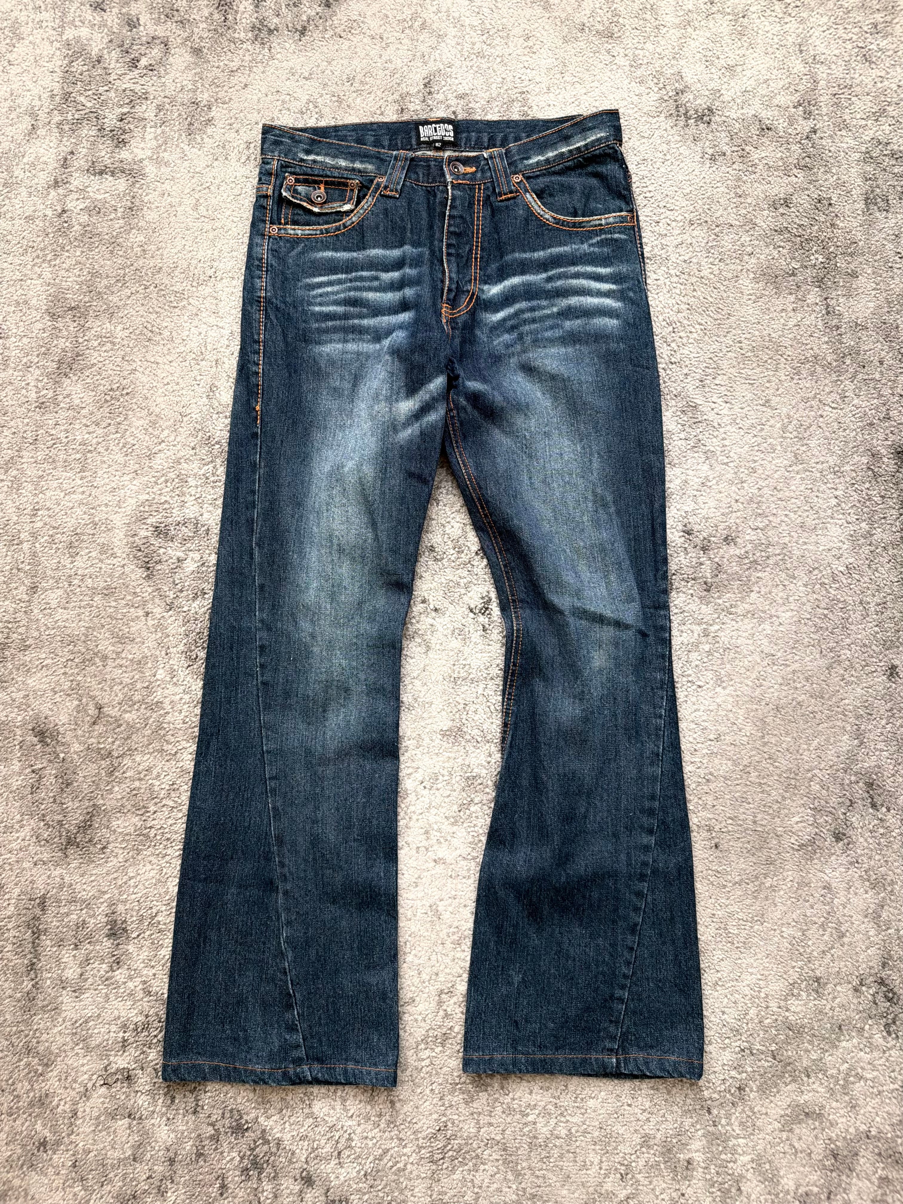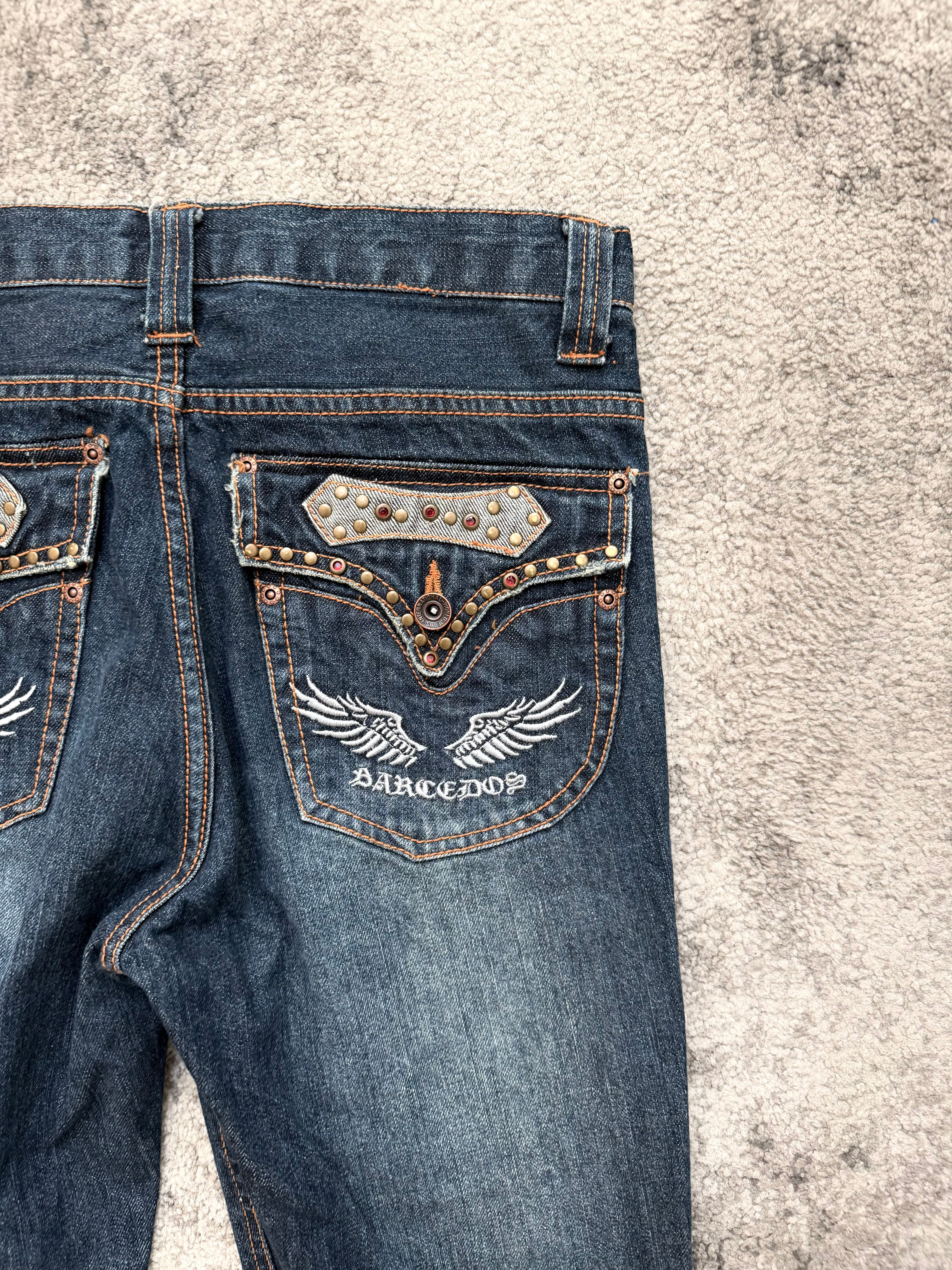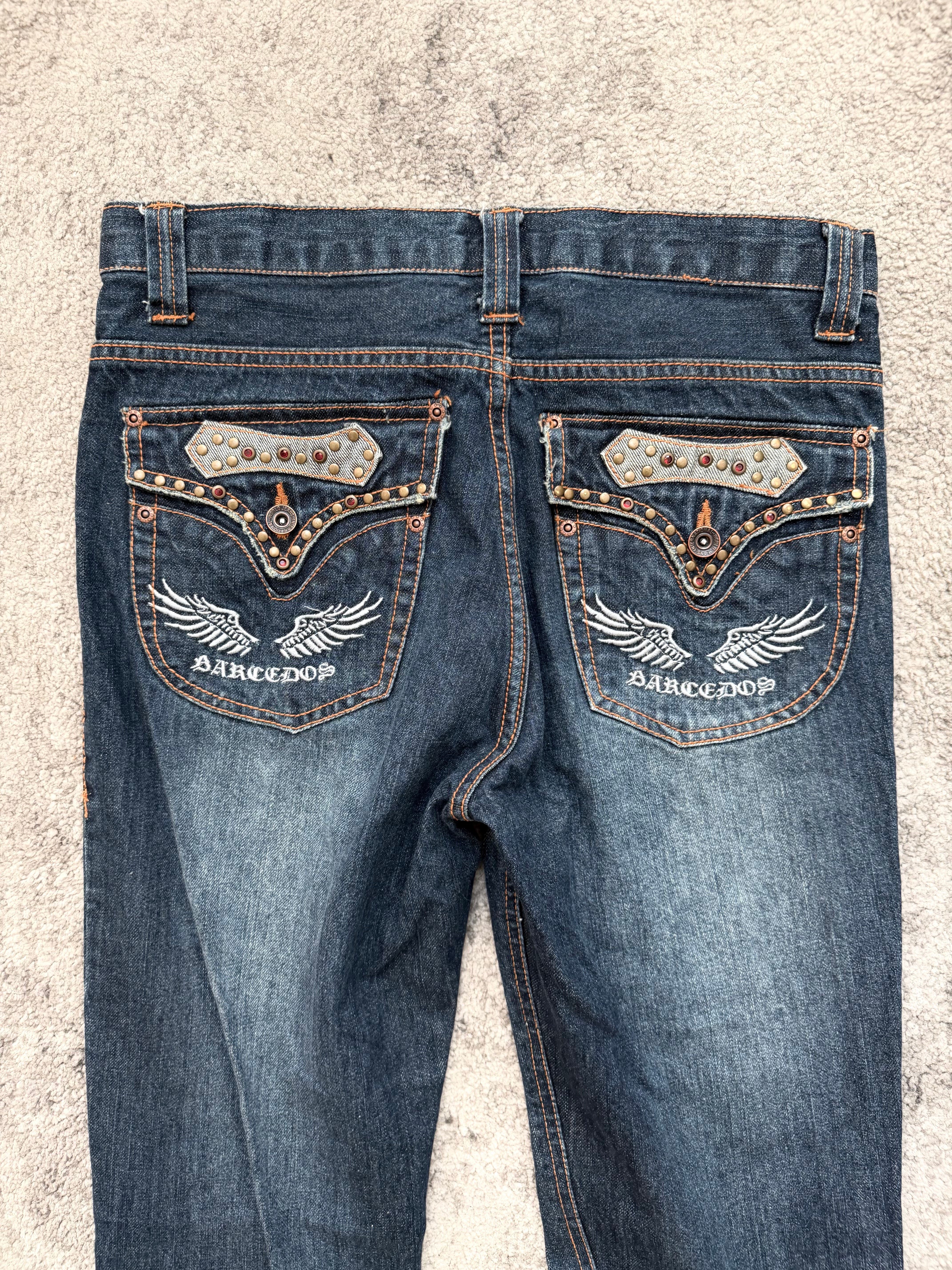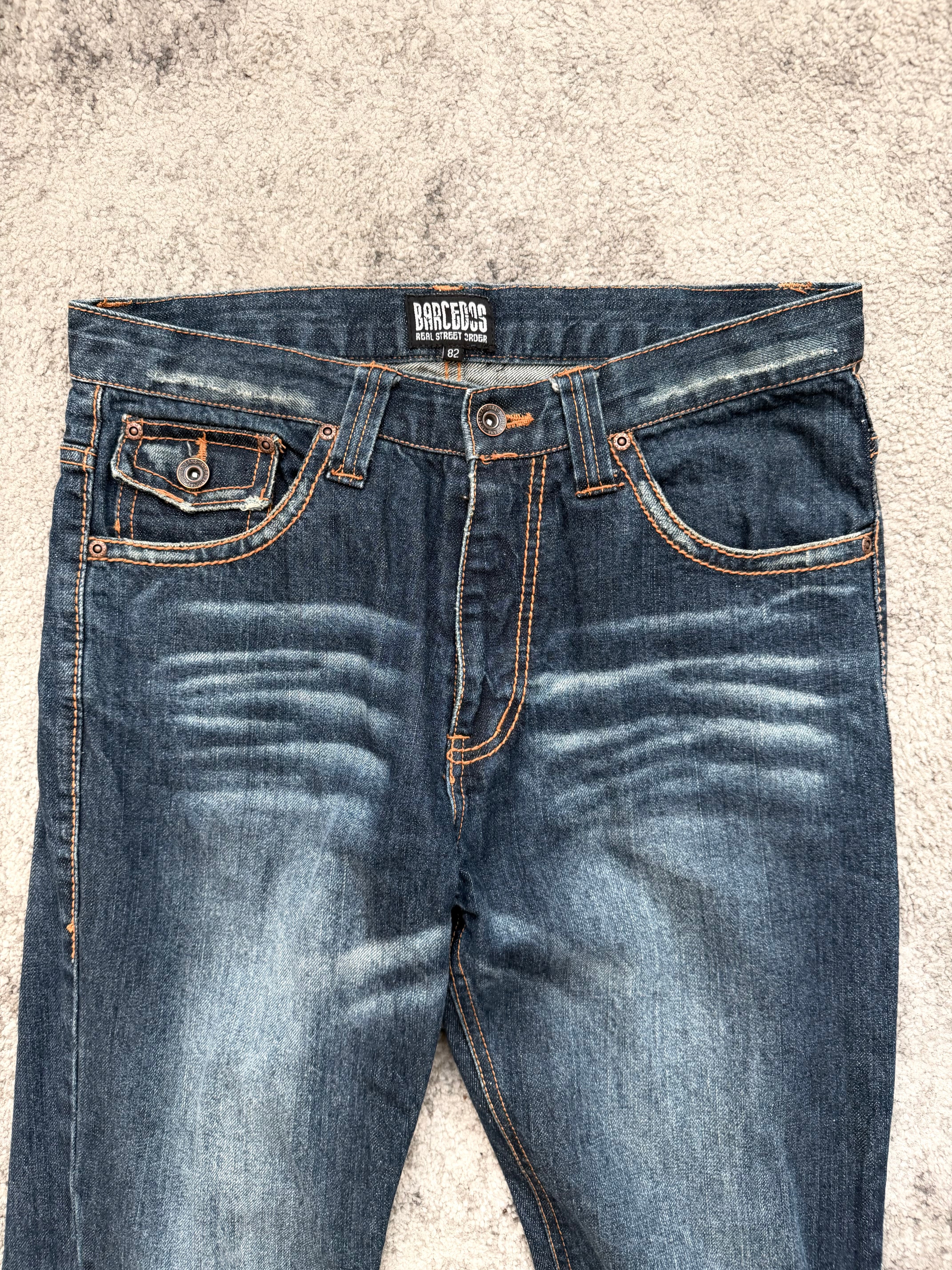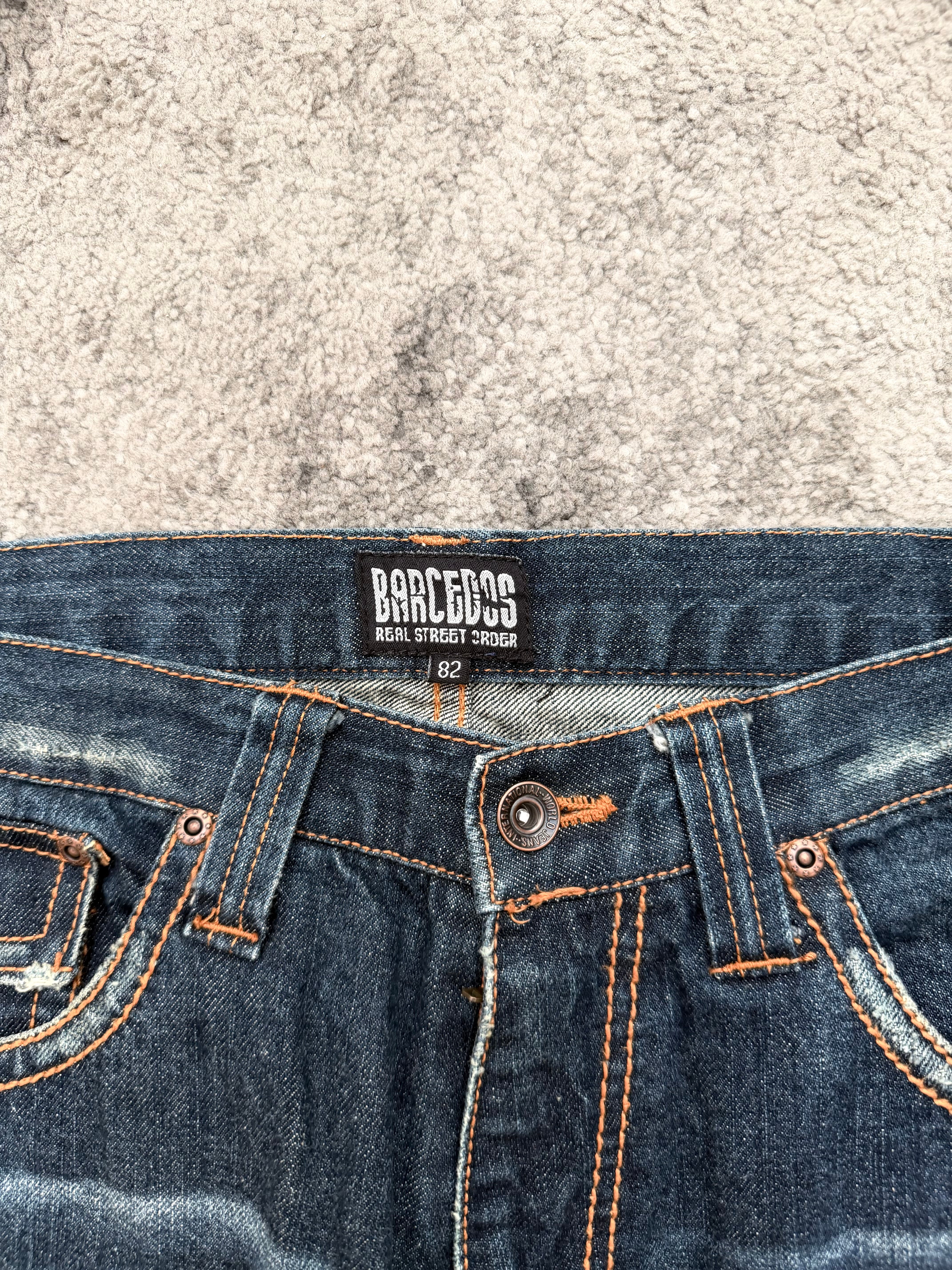 A rare BARCEDES Japan piece — raw attitude meets precision detail. These jeans carry that early 2000s Tokyo archive spirit, blending craftsmanship with a bold, rebellious edge. The deep indigo denim has aged beautifully, with authentic fading through the thighs and knees that adds texture and depth.