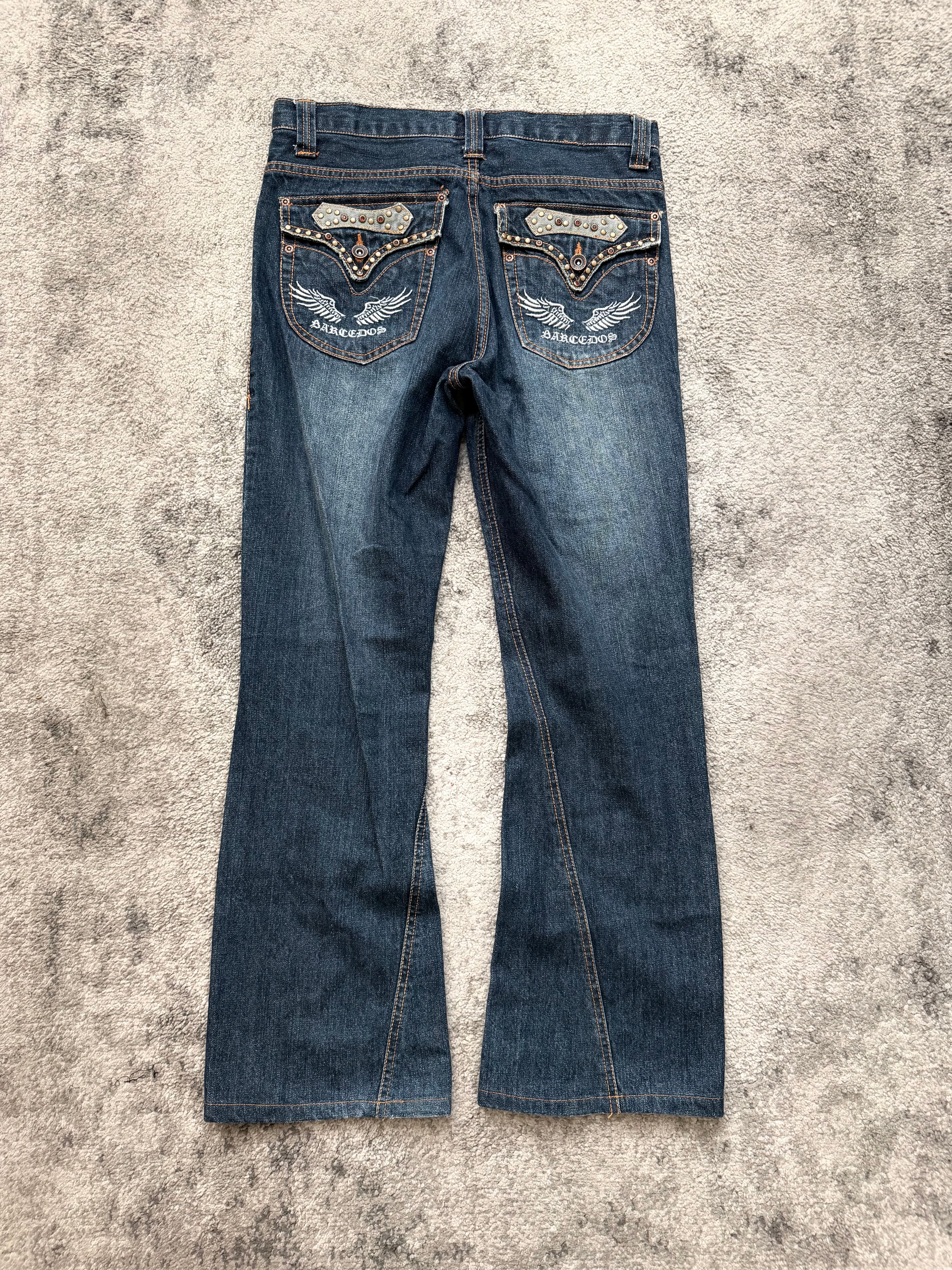 The back pockets steal the show — studded wing embroidery and layered stitching give it a rock-infused aesthetic reminiscent of Number (N)ine and Ifsixwasnine silhouettes. Built from premium Japanese cotton denim, slightly flared for movement and shape, with contrast stitching throughout.