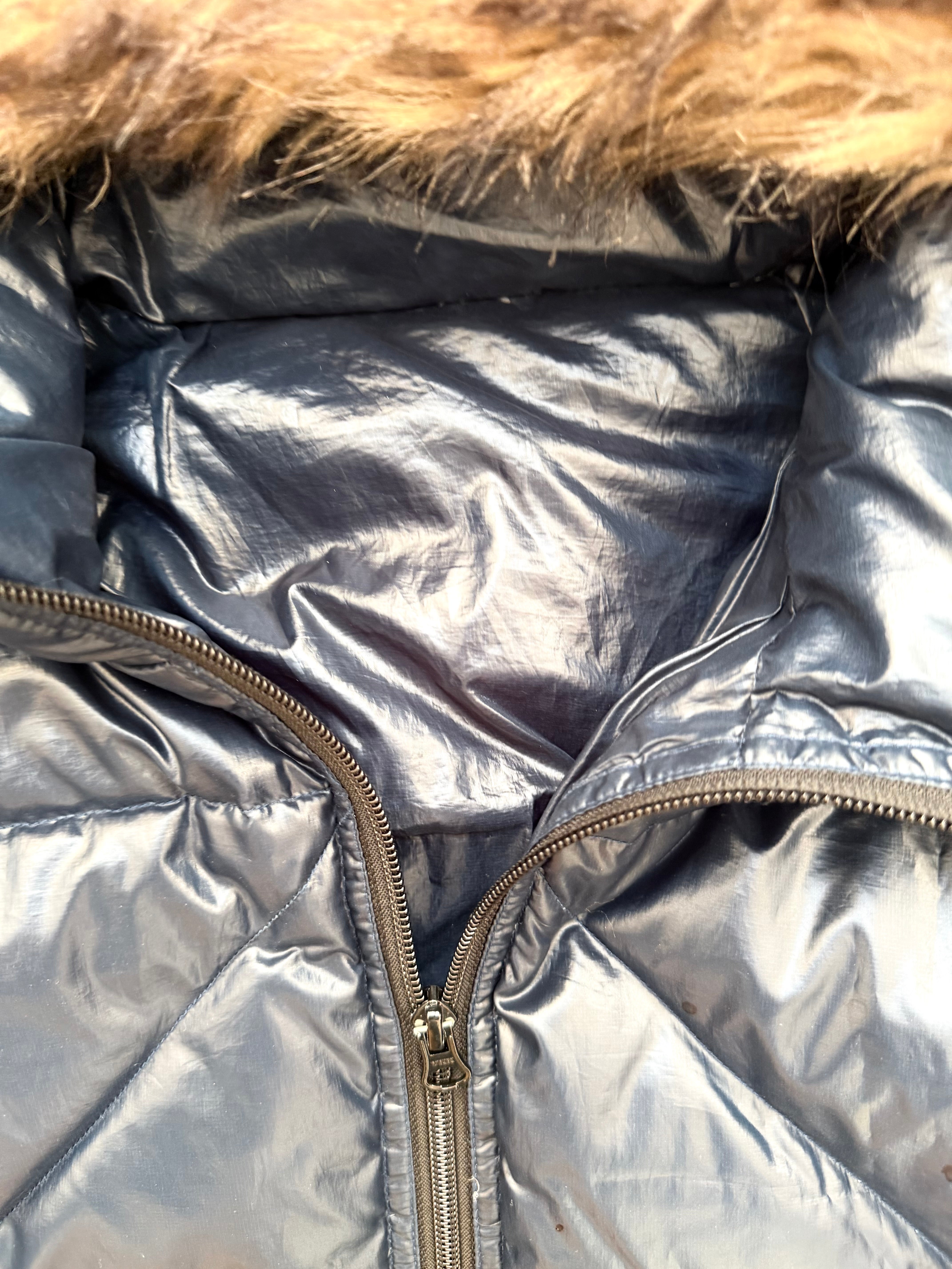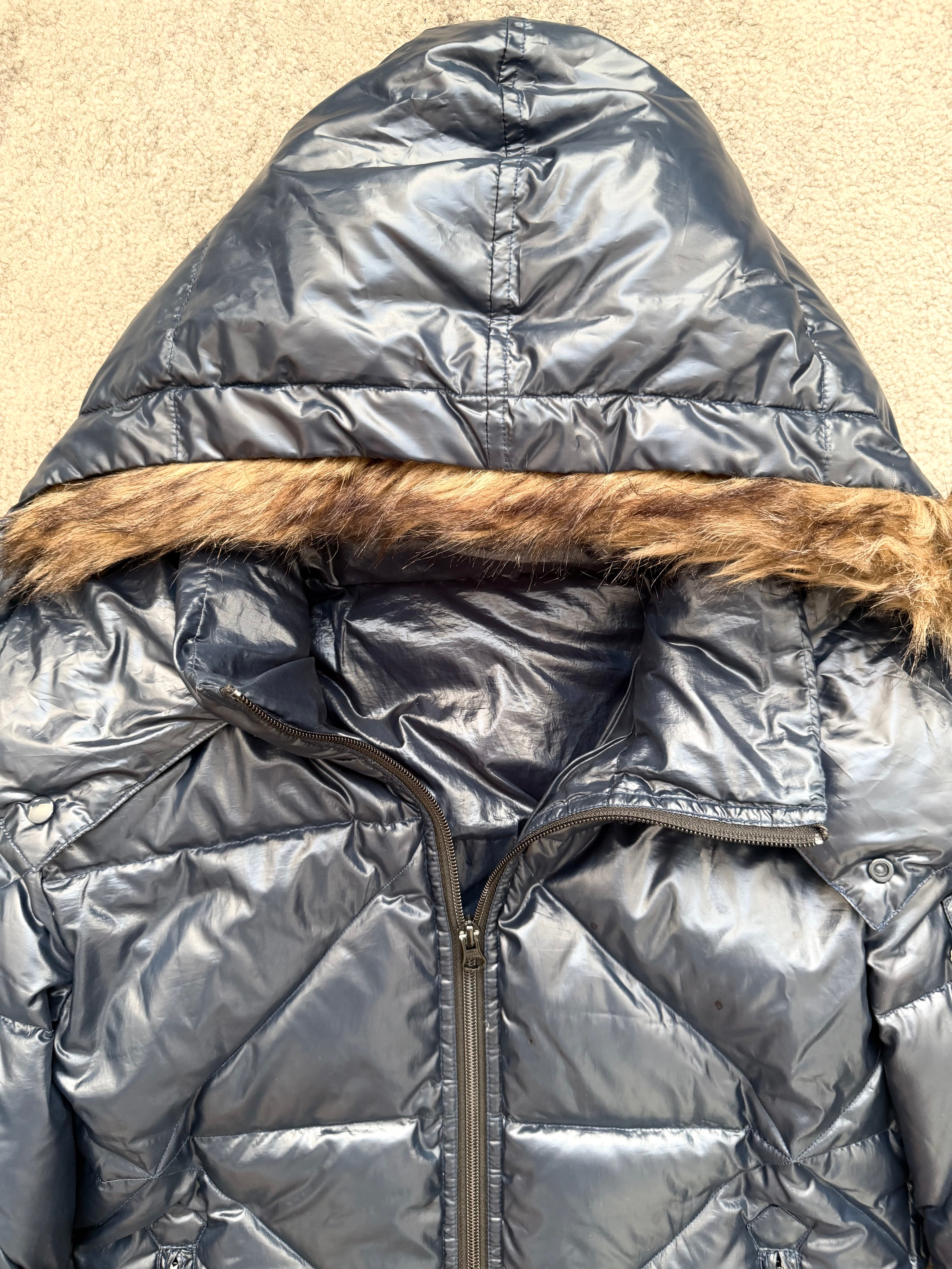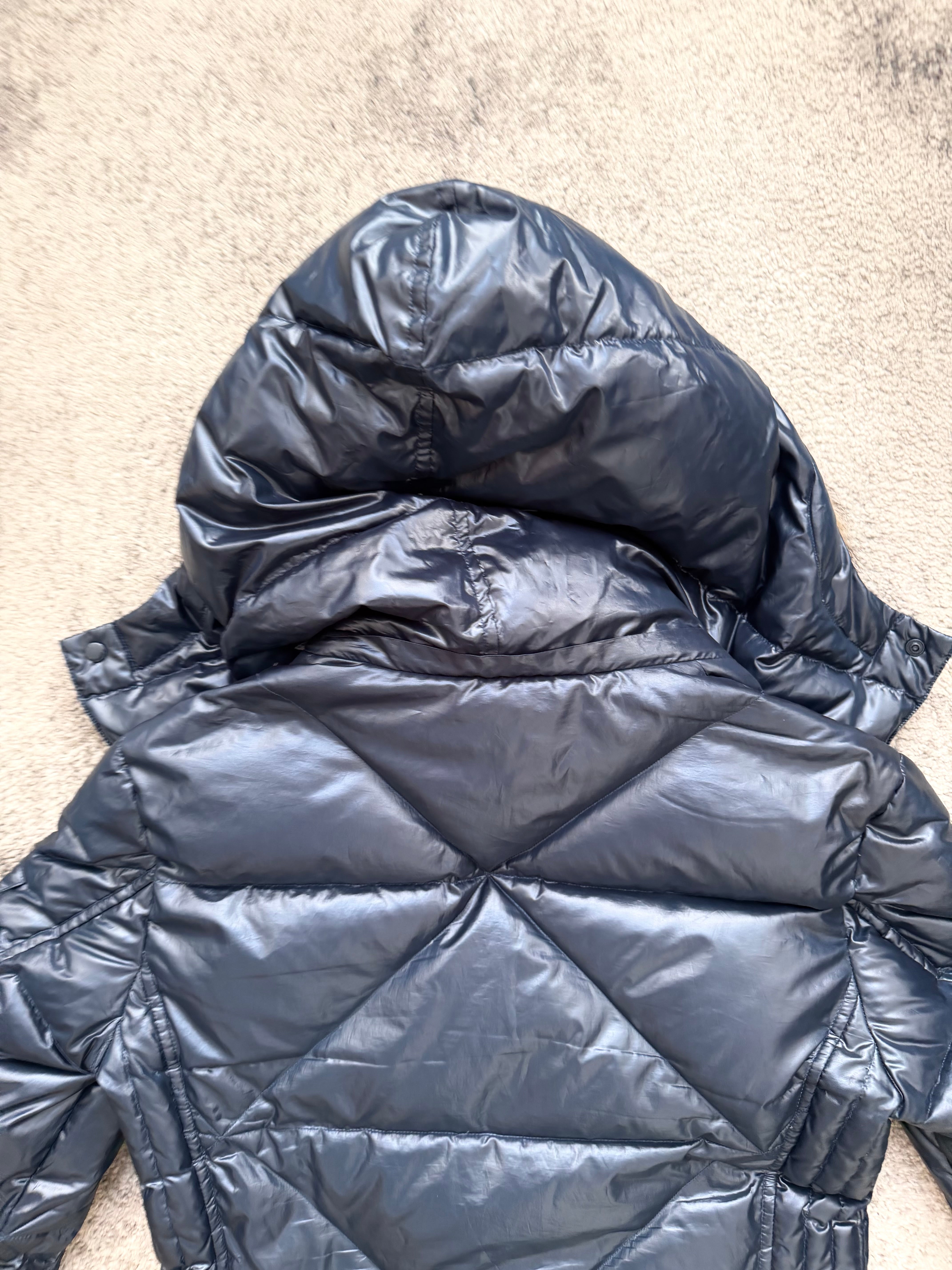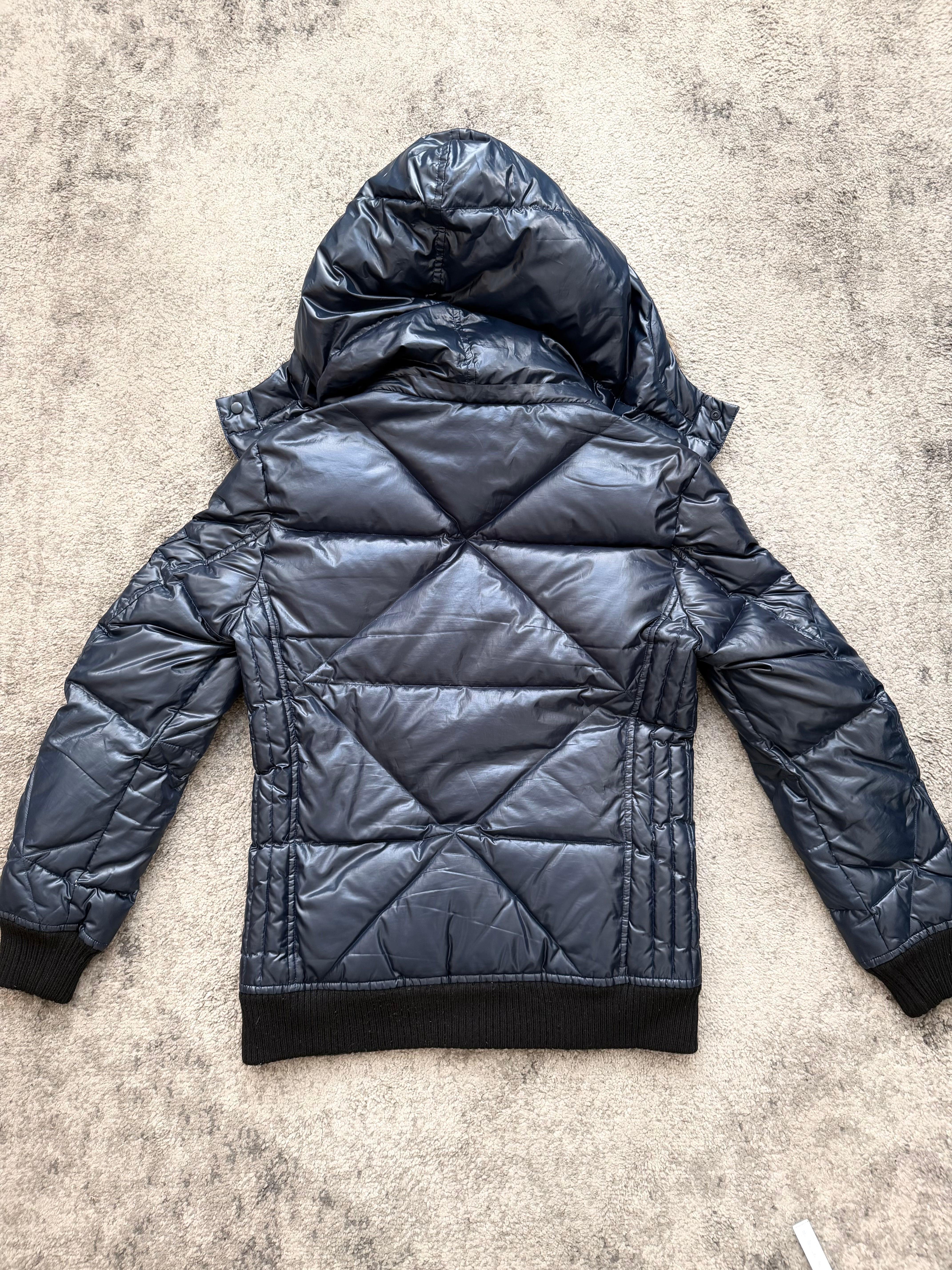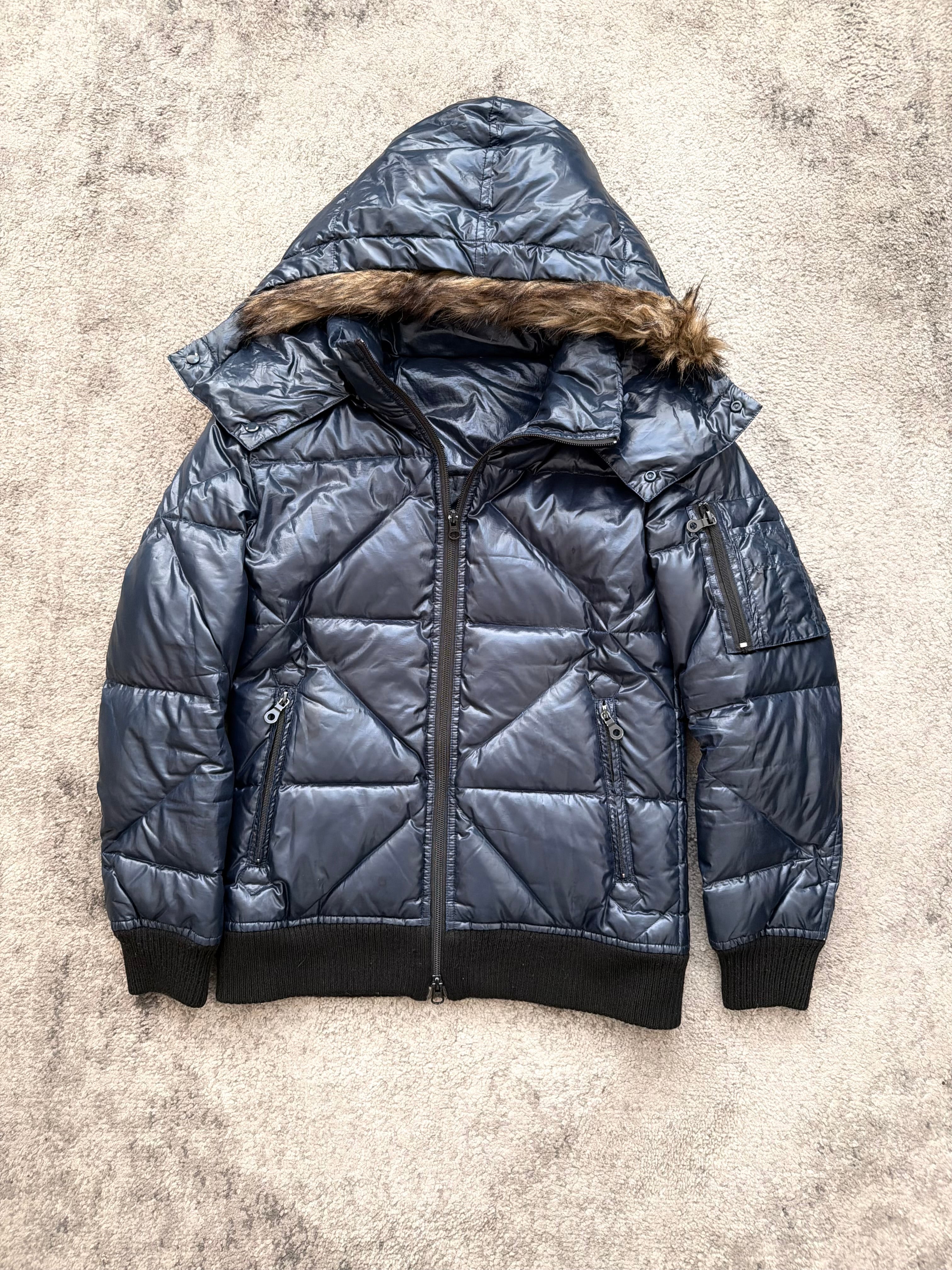 Crafted from deep navy nylon with a geometric quilt pattern and structured silhouette. The detachable faux-fur hood, ribbed cuffs, and sleeve utility pocket balance function and edge — evoking that fusion of street and refinement seen in vintage Harajuku outerwear.