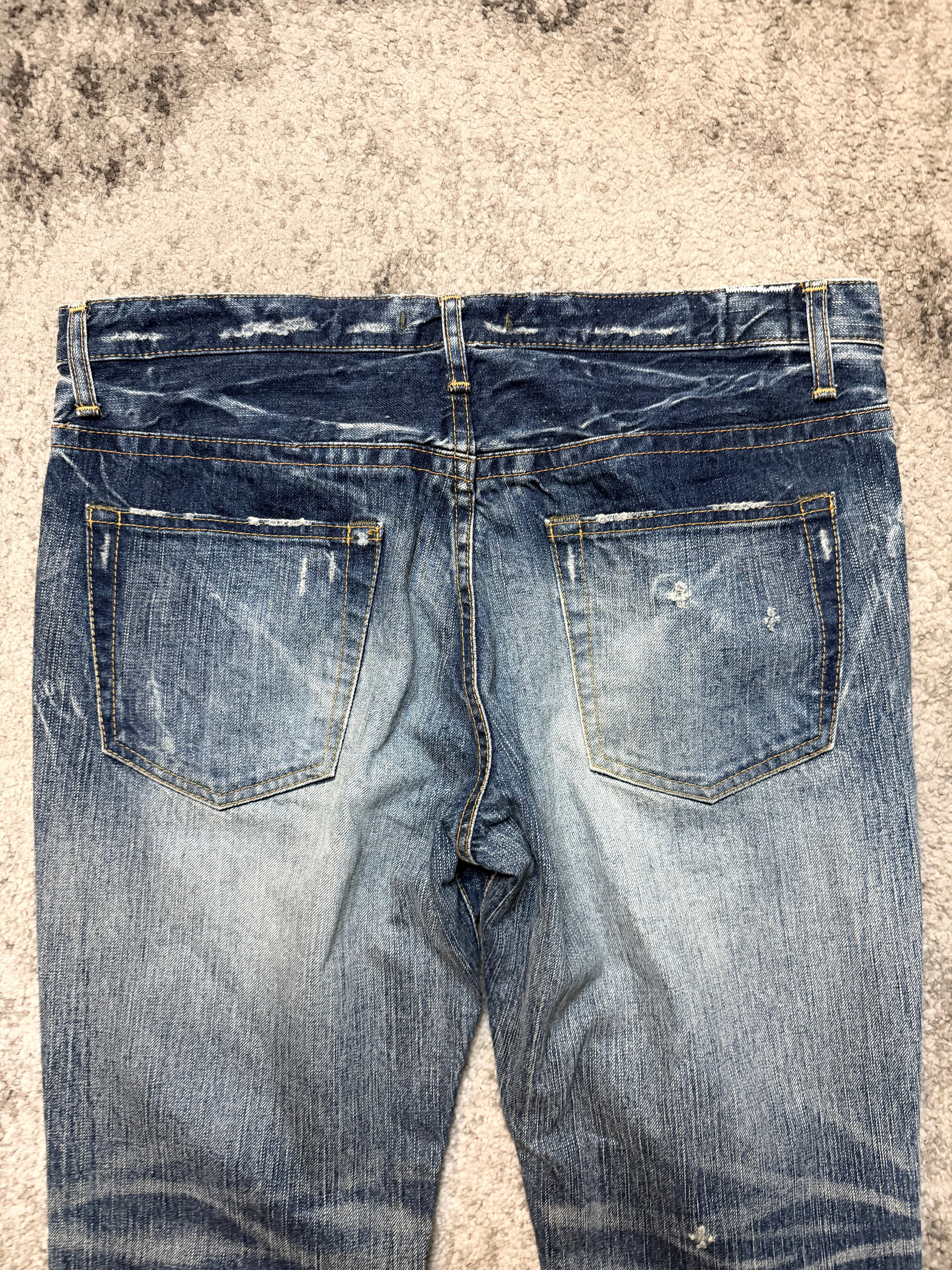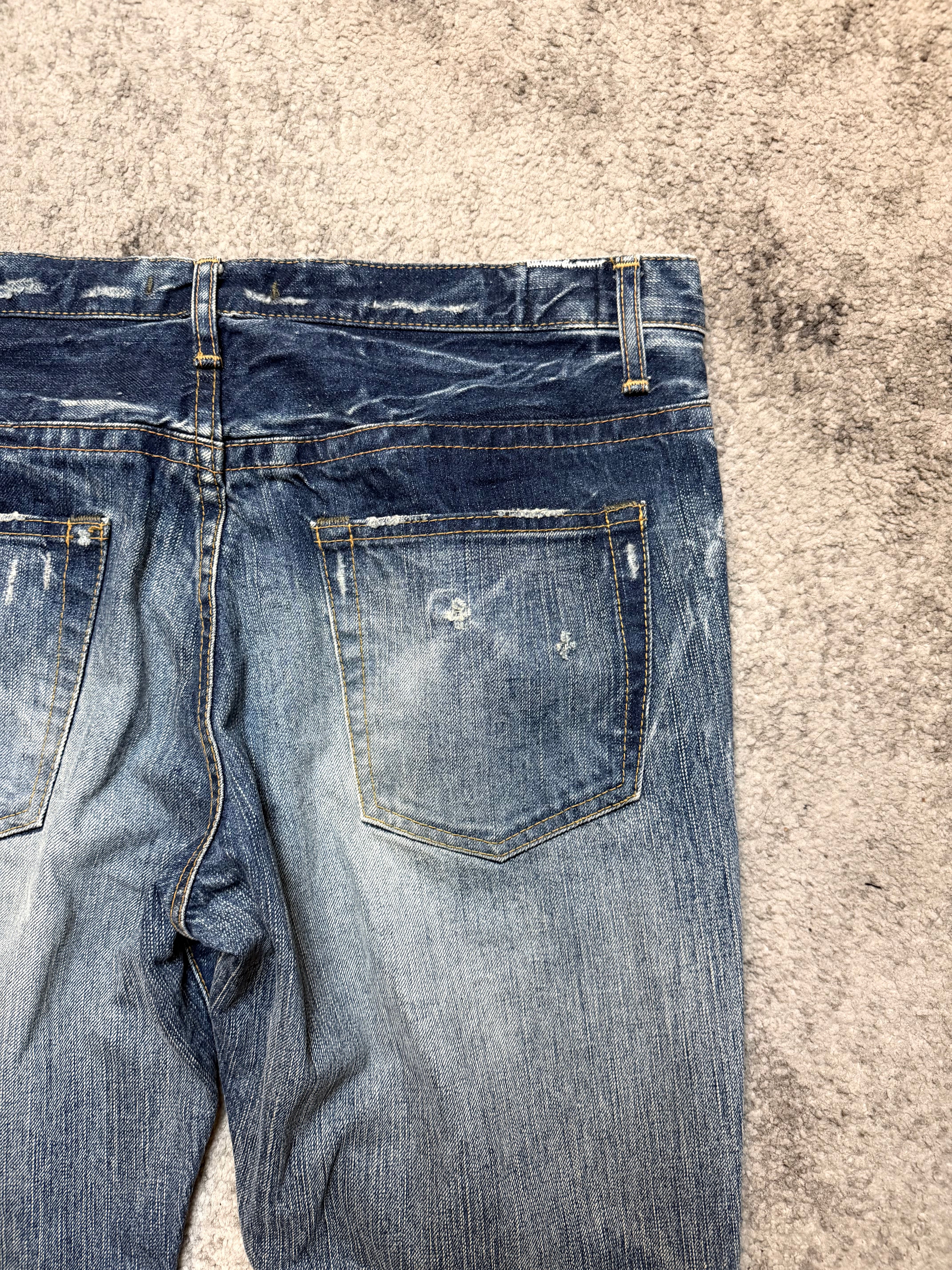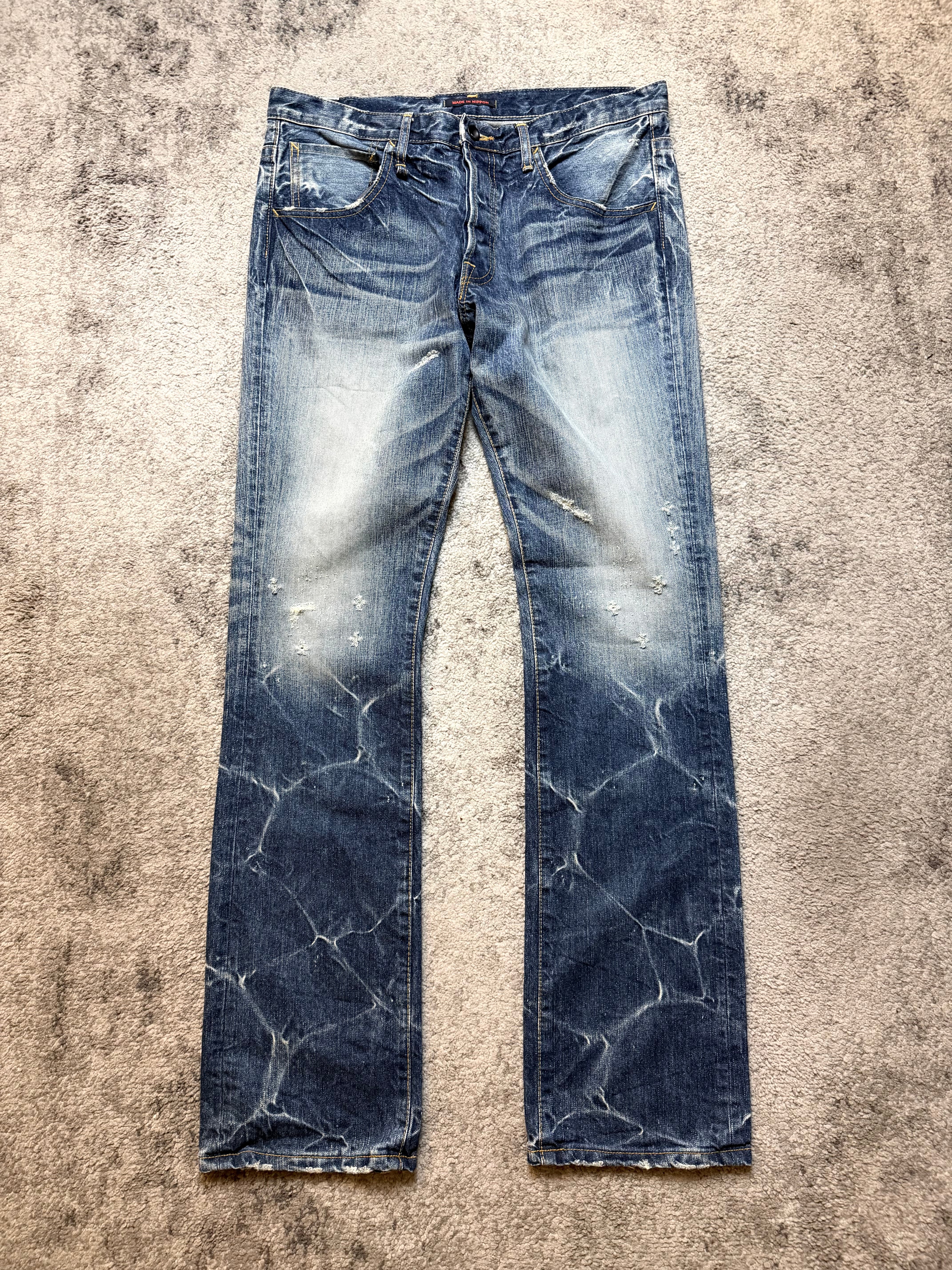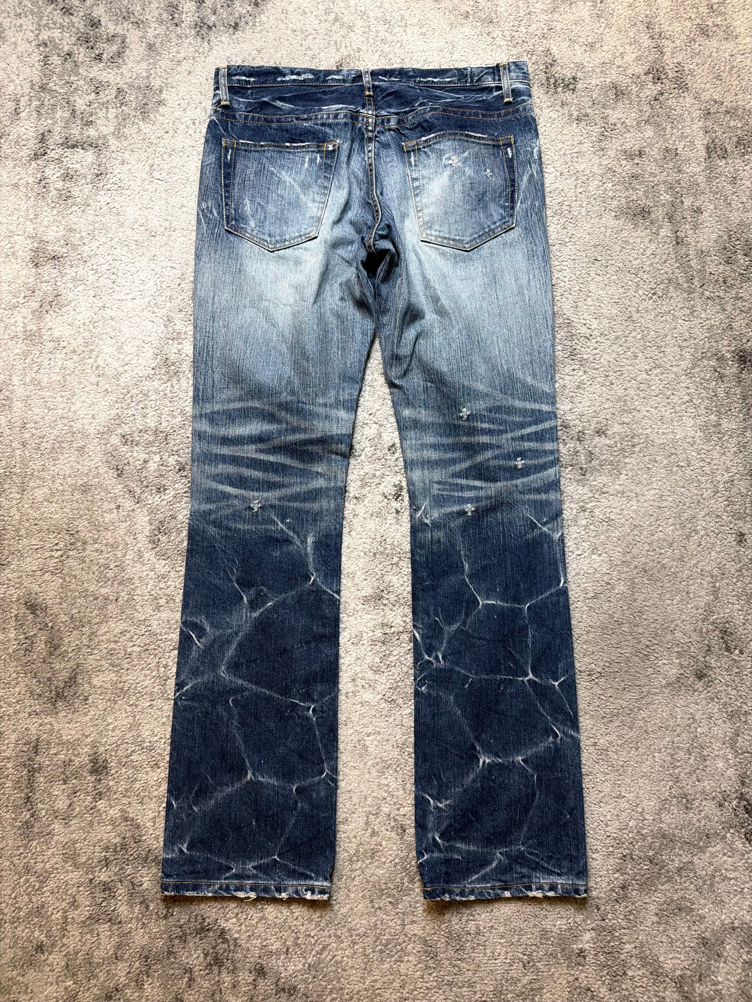 A wild, water-worn dream straight out of early-2000s Tokyo street archives. These BLUE WAY jeans hit that perfect balance between chaos and intention — a signature washed-blue canvas cracked with icy, ripple-like bleach patterns that look almost accidental, yet unmistakably designed.