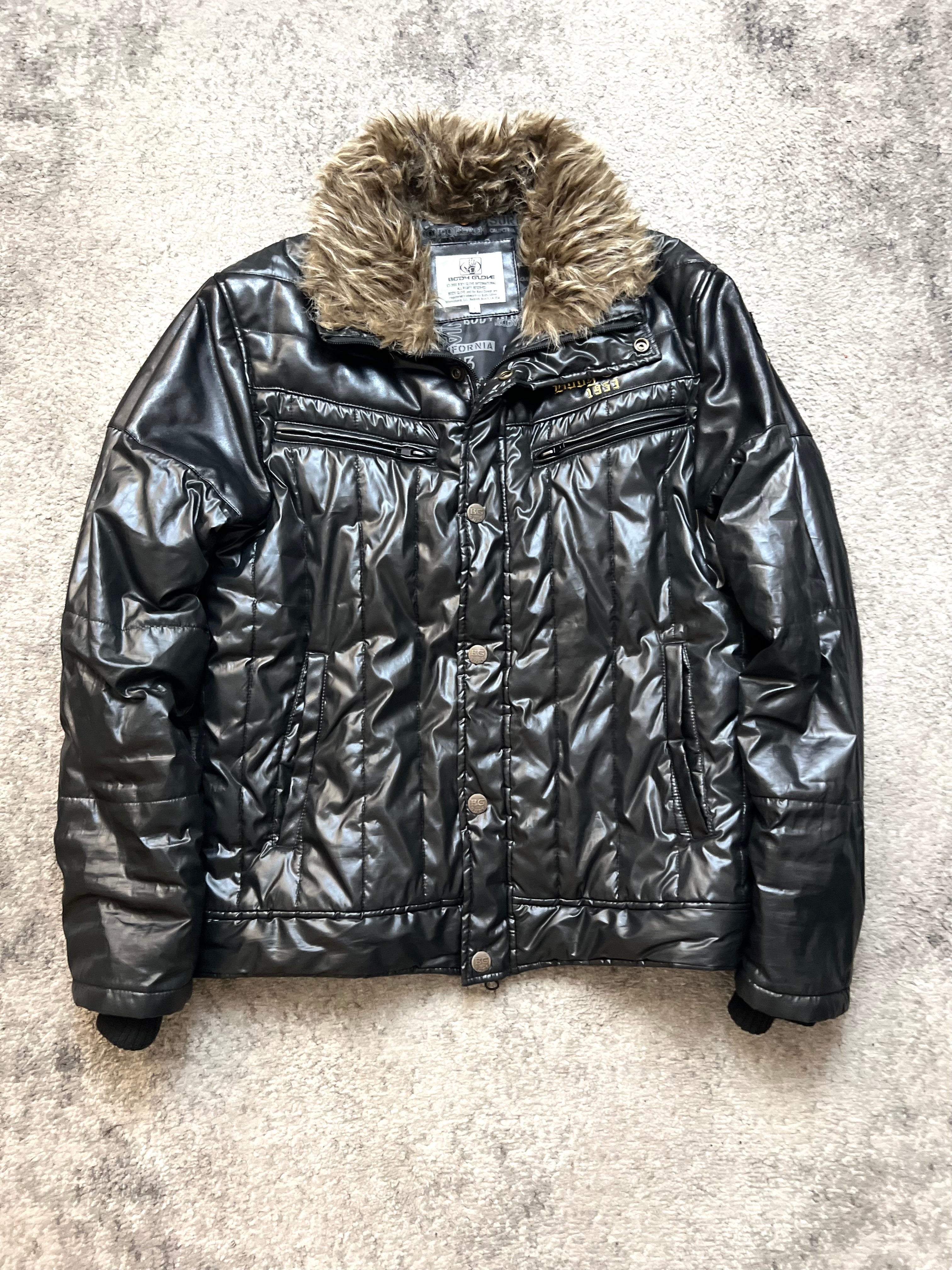 Crafted from high-sheen nylon with a soft inner fill, it features a faux-fur collar, quilted body with chevron back detailing, and zip pockets framed by angular stitching. The jacket carries that subtle balance of luxury and grit — functional yet designed to stand out.