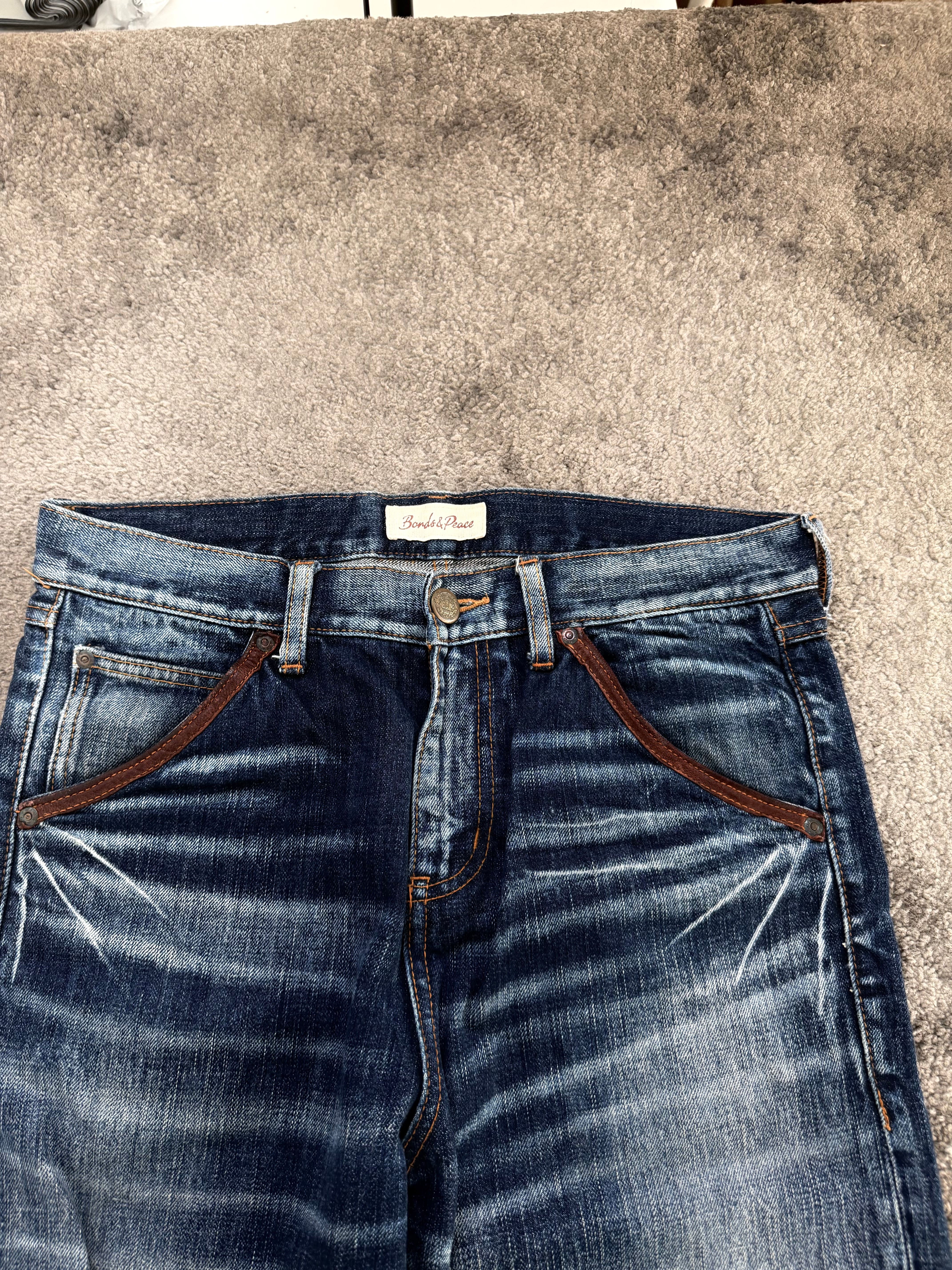 This BONDS & PEACE pair carries strong Number Nine / ifsixwasnine / Japanese archive style energy — sharp whiskering, bright thigh contrast, and a dark indigo drop toward the hem that creates a powerful silhouette.