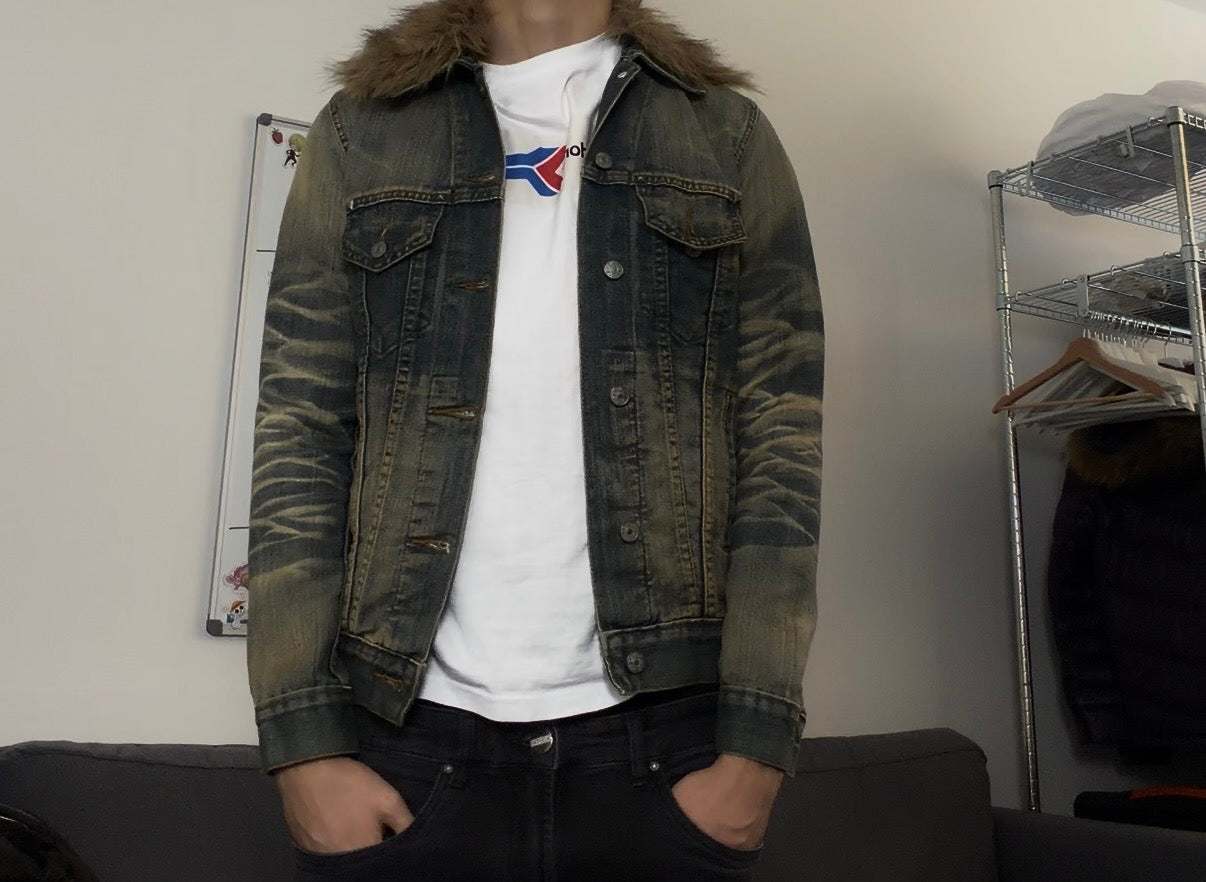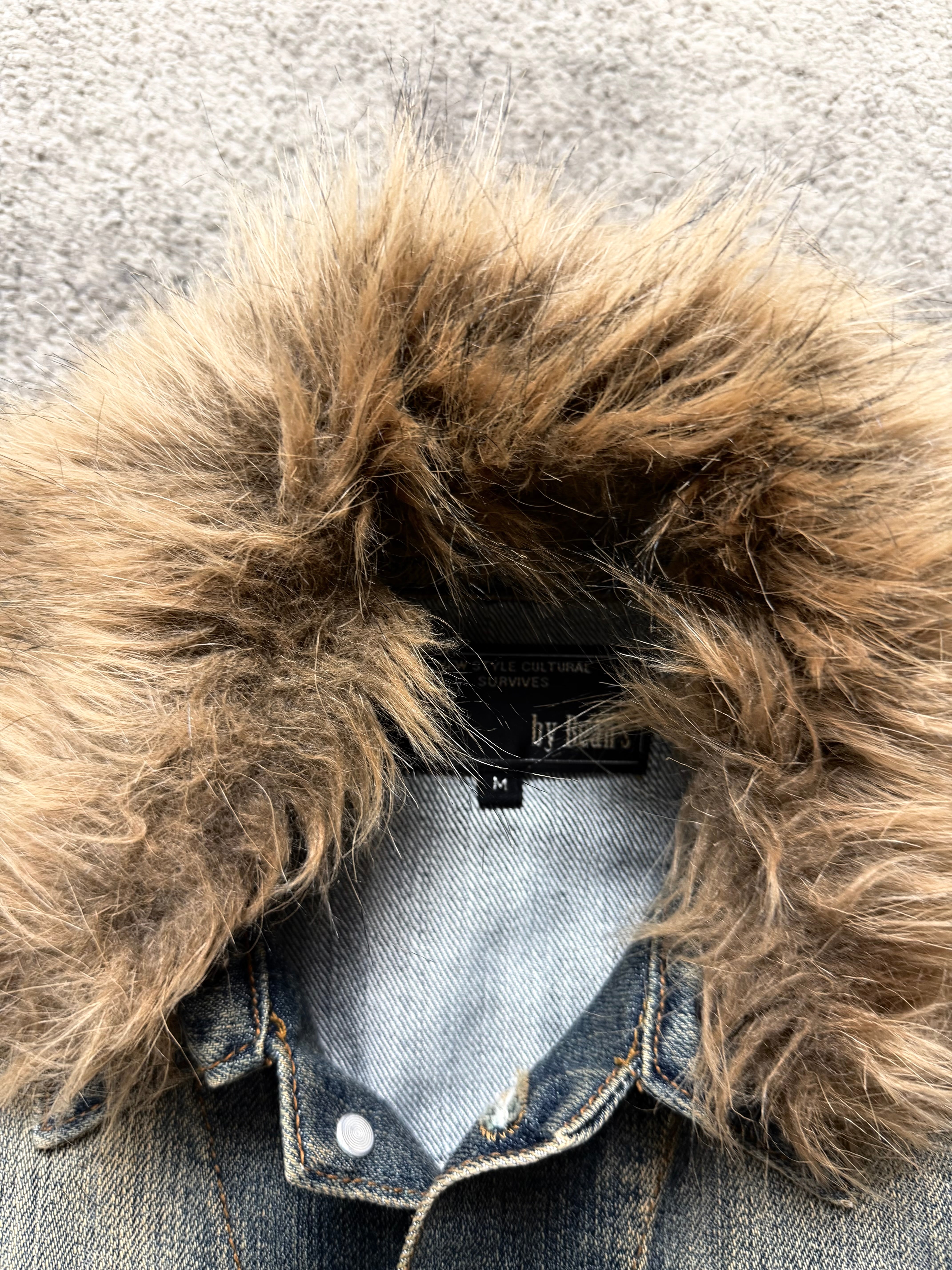 Mid-weight cotton denim with a soft, broken-in feel. Heavy contrast fade across body and sleeves. Plush faux-fur collar adds texture and warmth — removable statement energy.