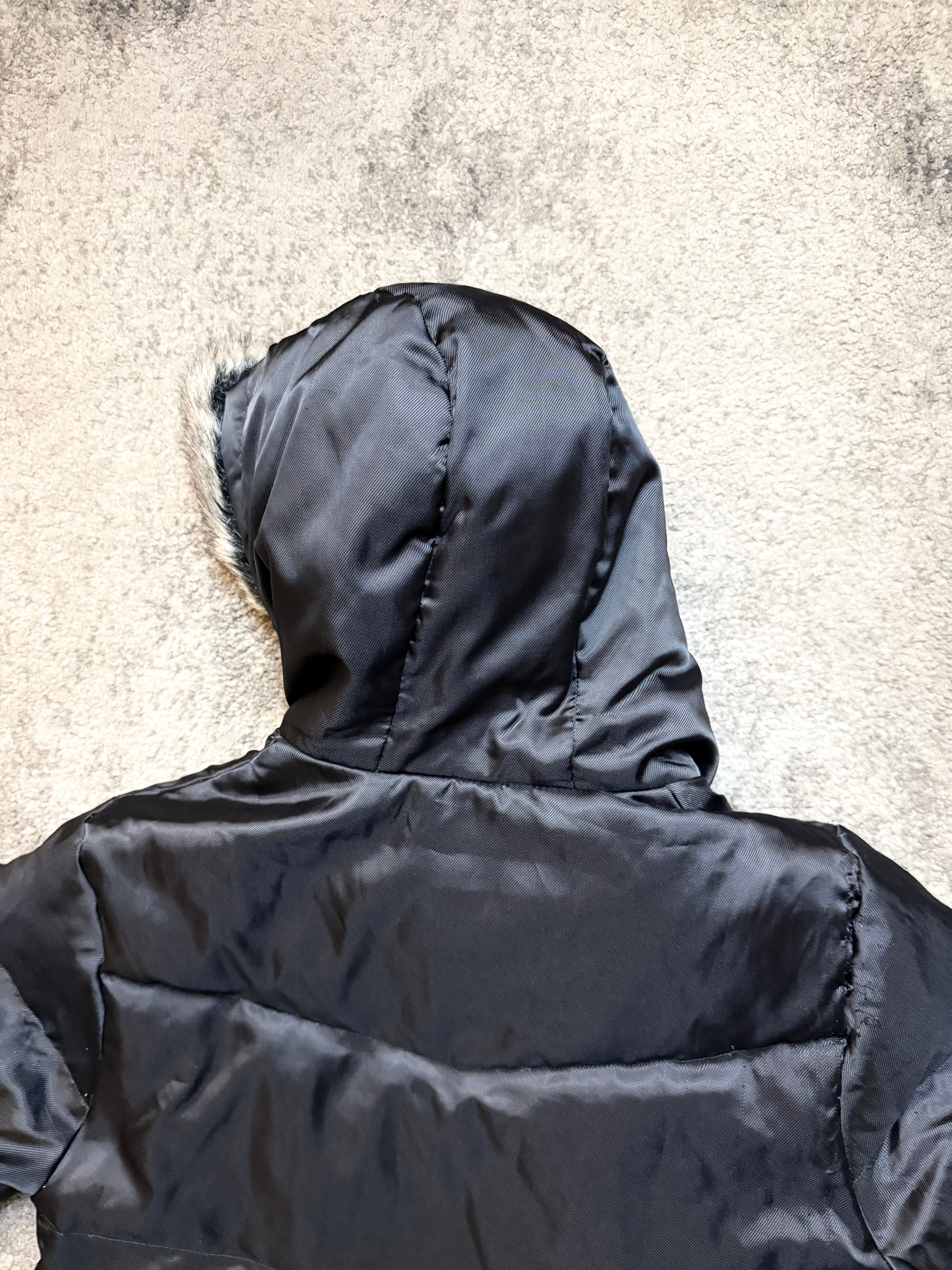 A warm, weighty down-filled shell with a matte black finish. Soft faux-fur trim on the hood for that early-2000s Harajuku touch. Insulating, wind-resistant, and genuinely cozy.