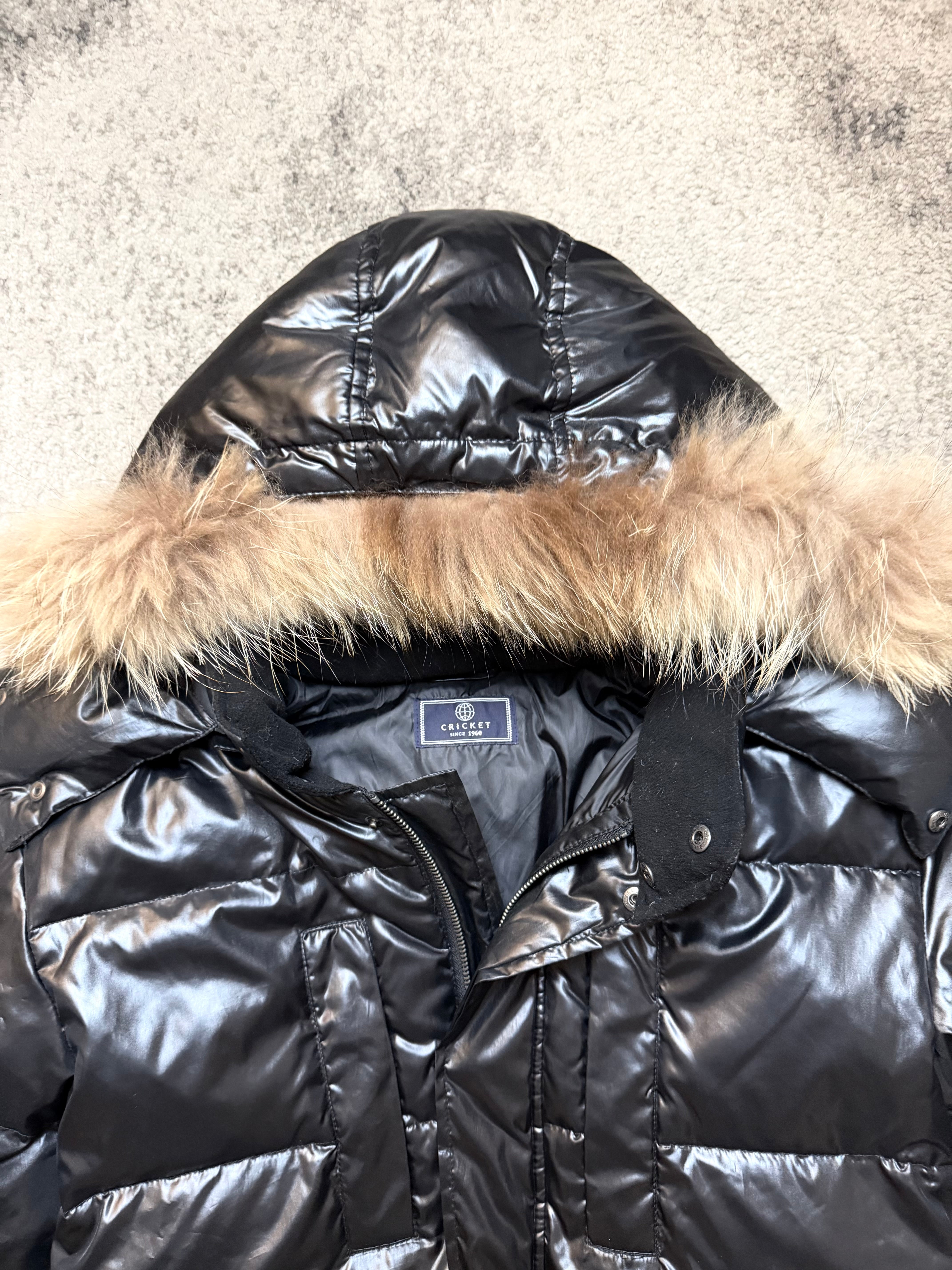 A bold, atmospheric winter piece straight out of that late-2000s Japanese street archive energy. This CRICKET down parka comes in a deep, inky black with a subtle metallic sheen — the kind of finish that catches light like wet asphalt at night.