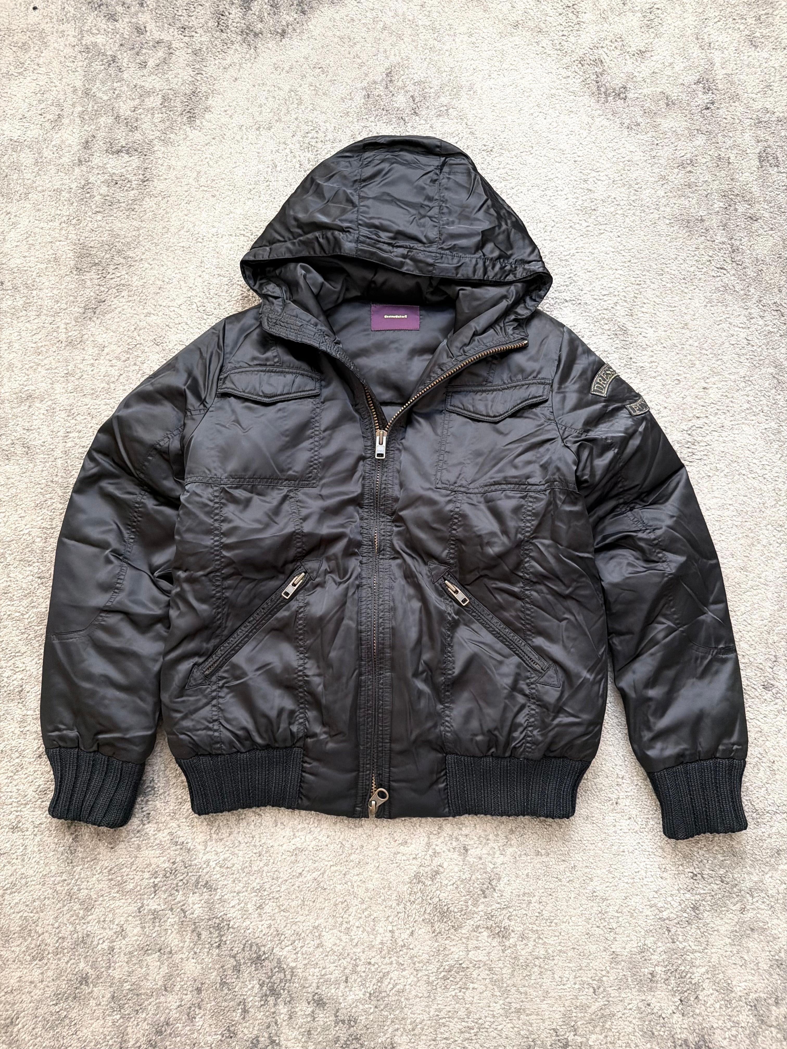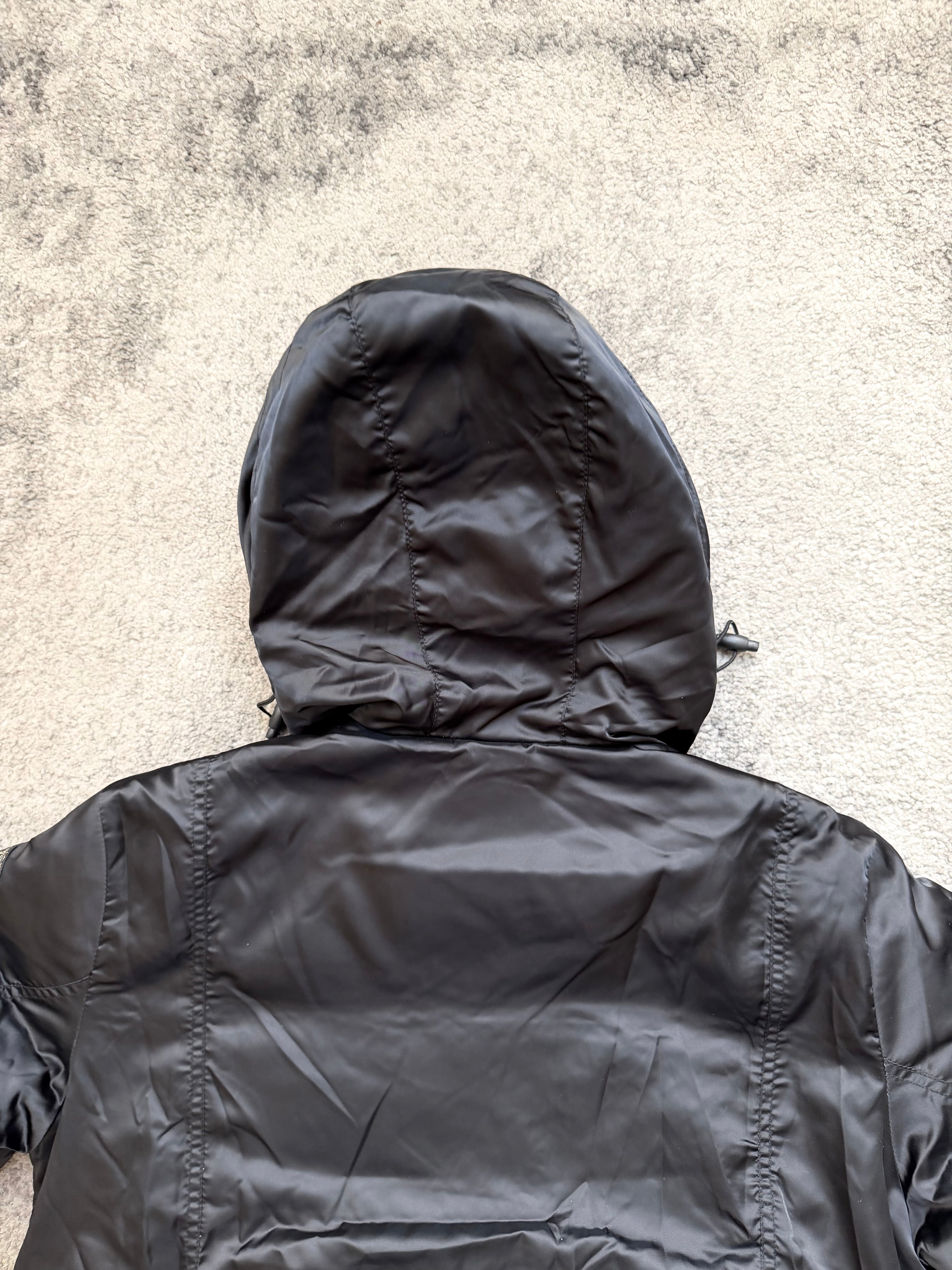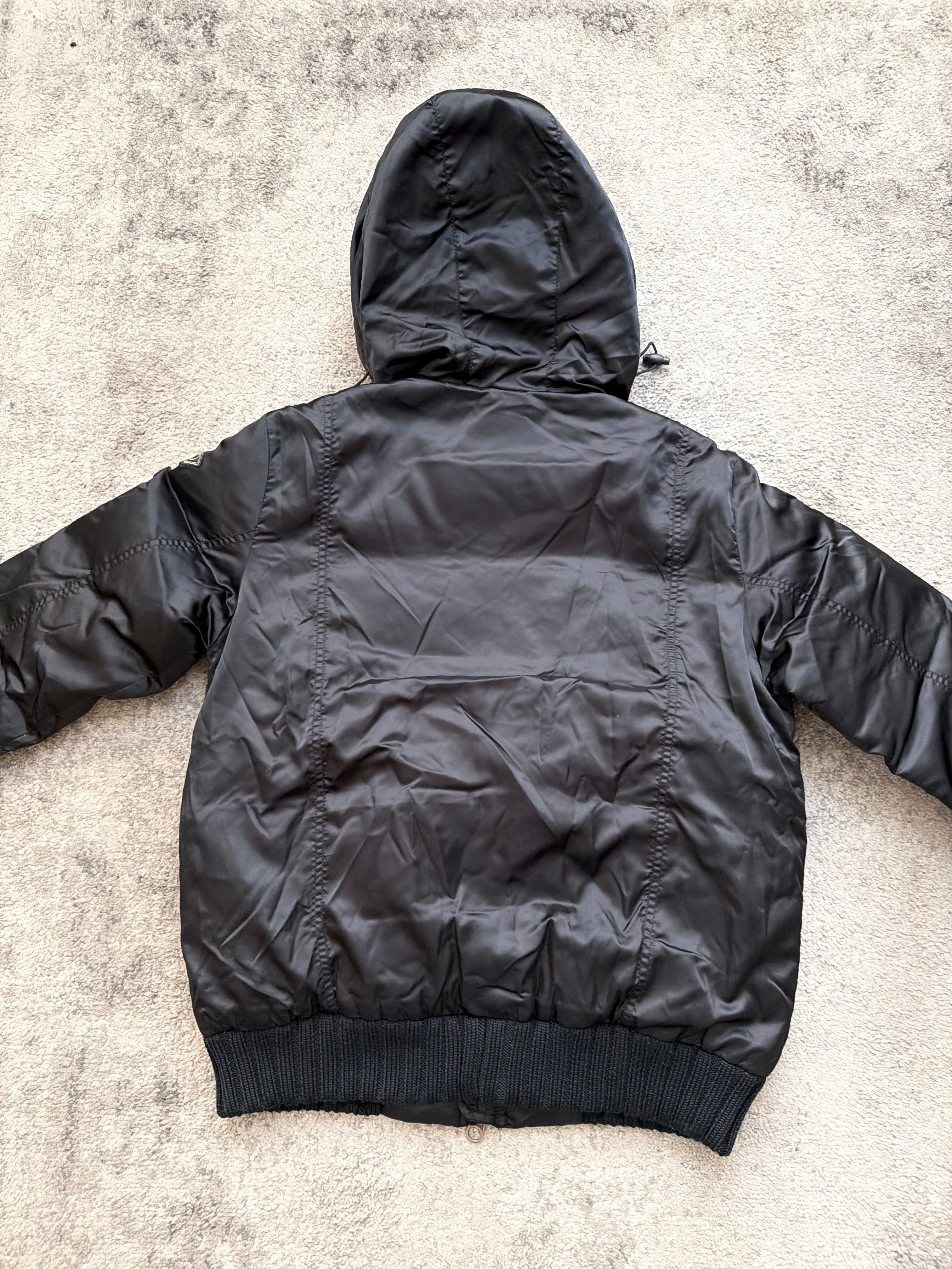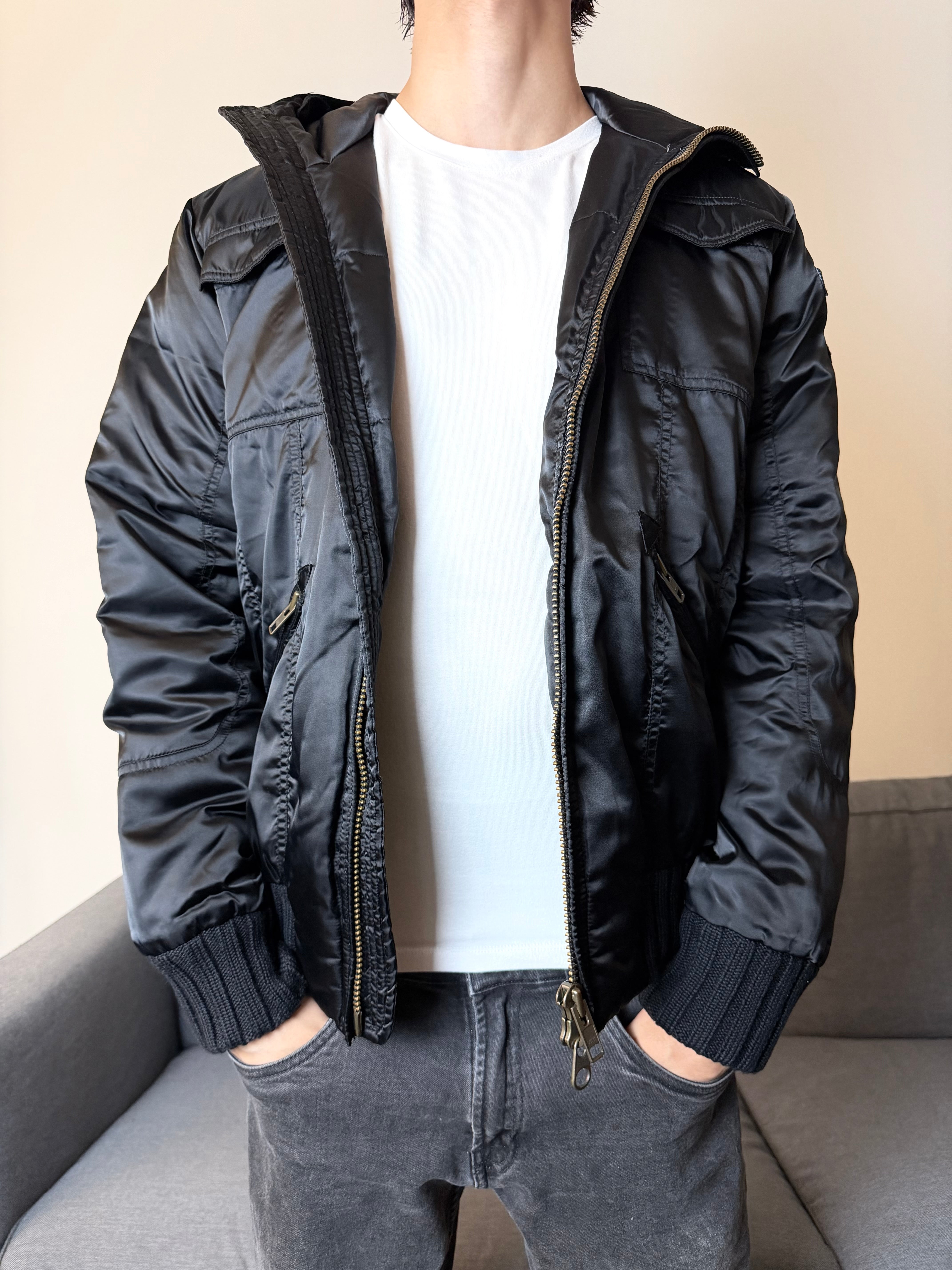The jacket comes in very good vintage condition with soft, naturally aged nylon that gives off a subtle sheen without feeling loud. Insulation is warm but lightweight, making it perfect for everyday winter wear. The ribbed cuffs and hem lock in heat, while the double-zip front, angled hand pockets, and chest detailing add practical texture. The hood balances the silhouette—slightly oversized, creating that effortless Japanese underground vibe.