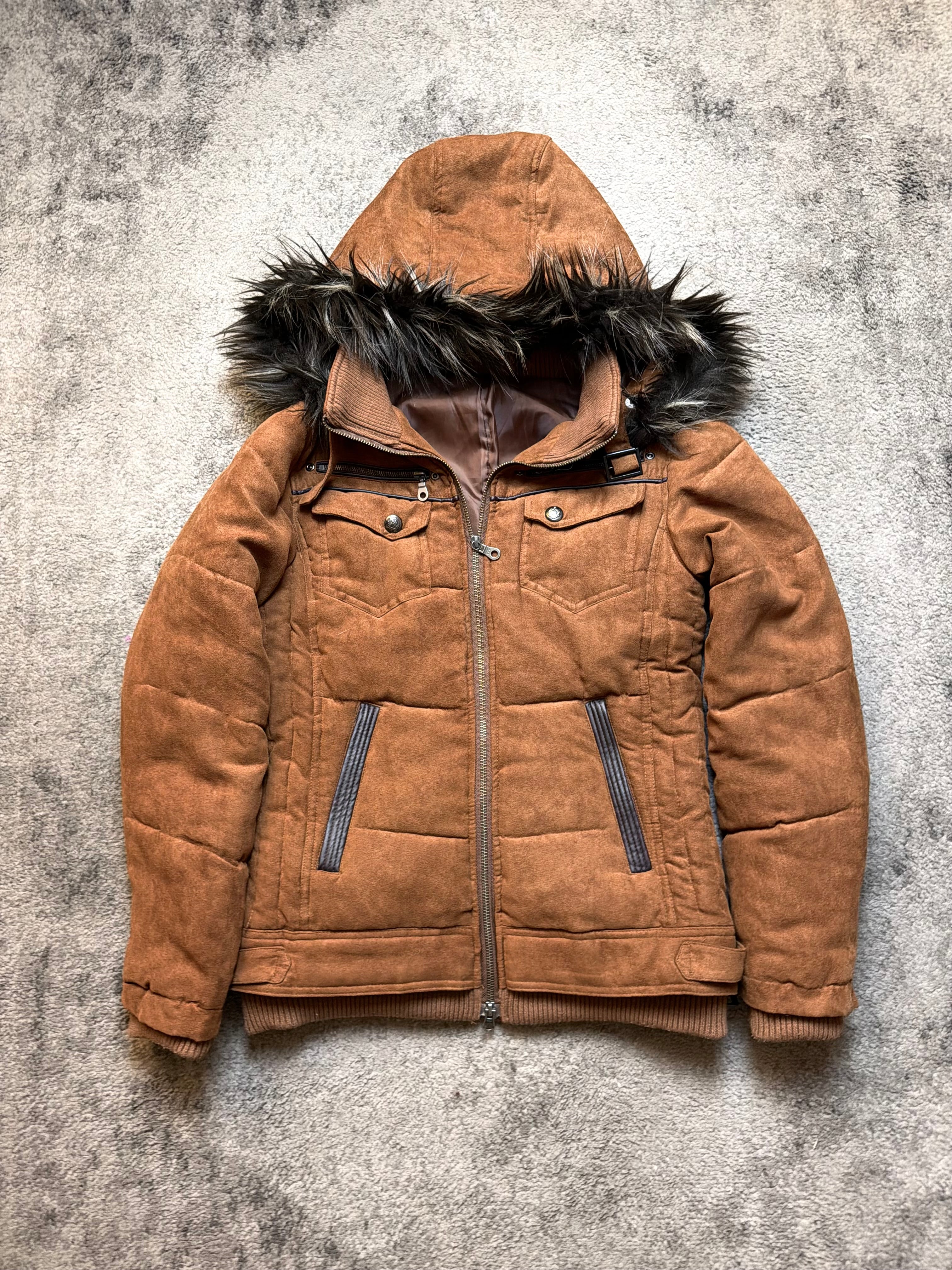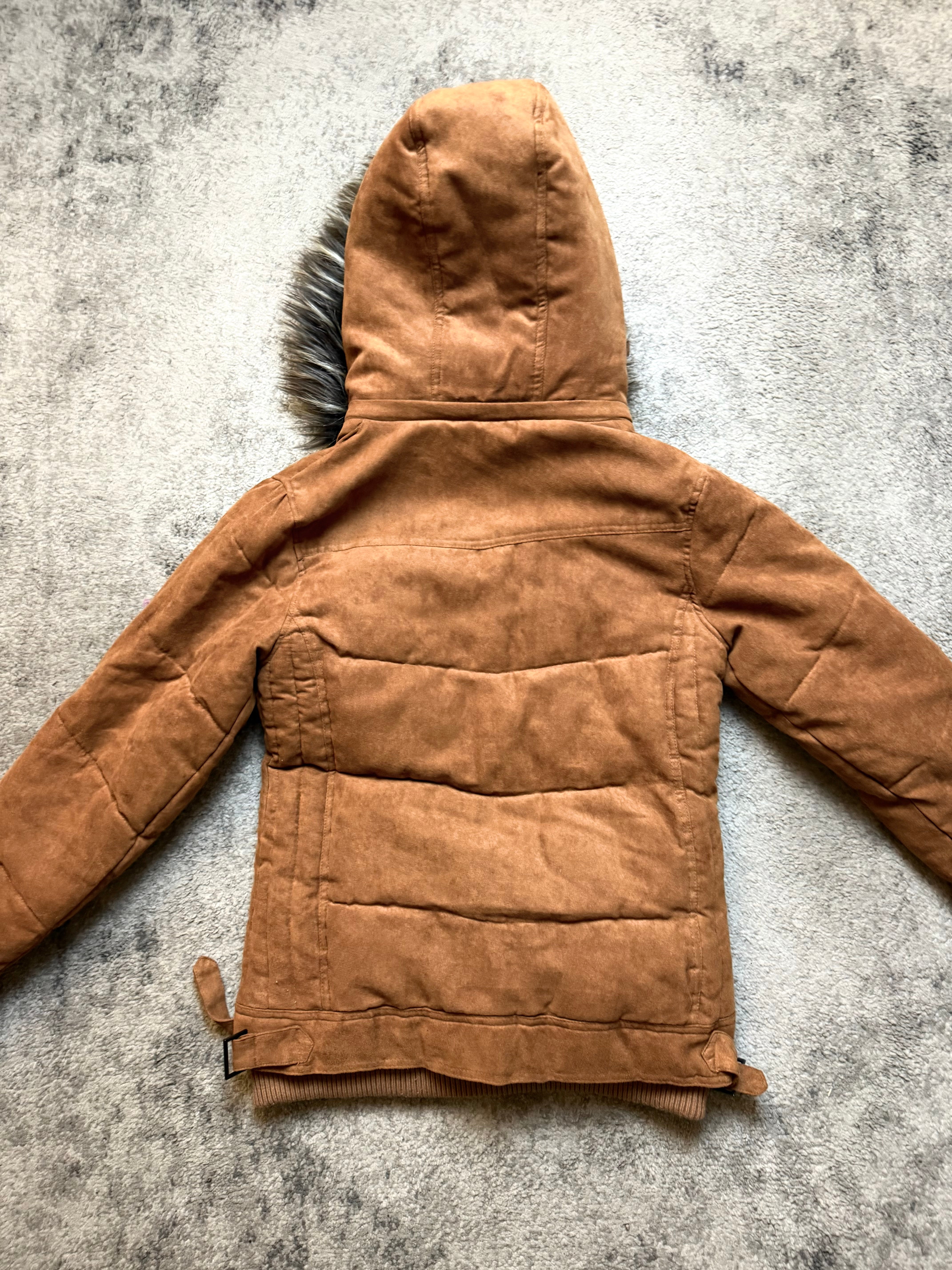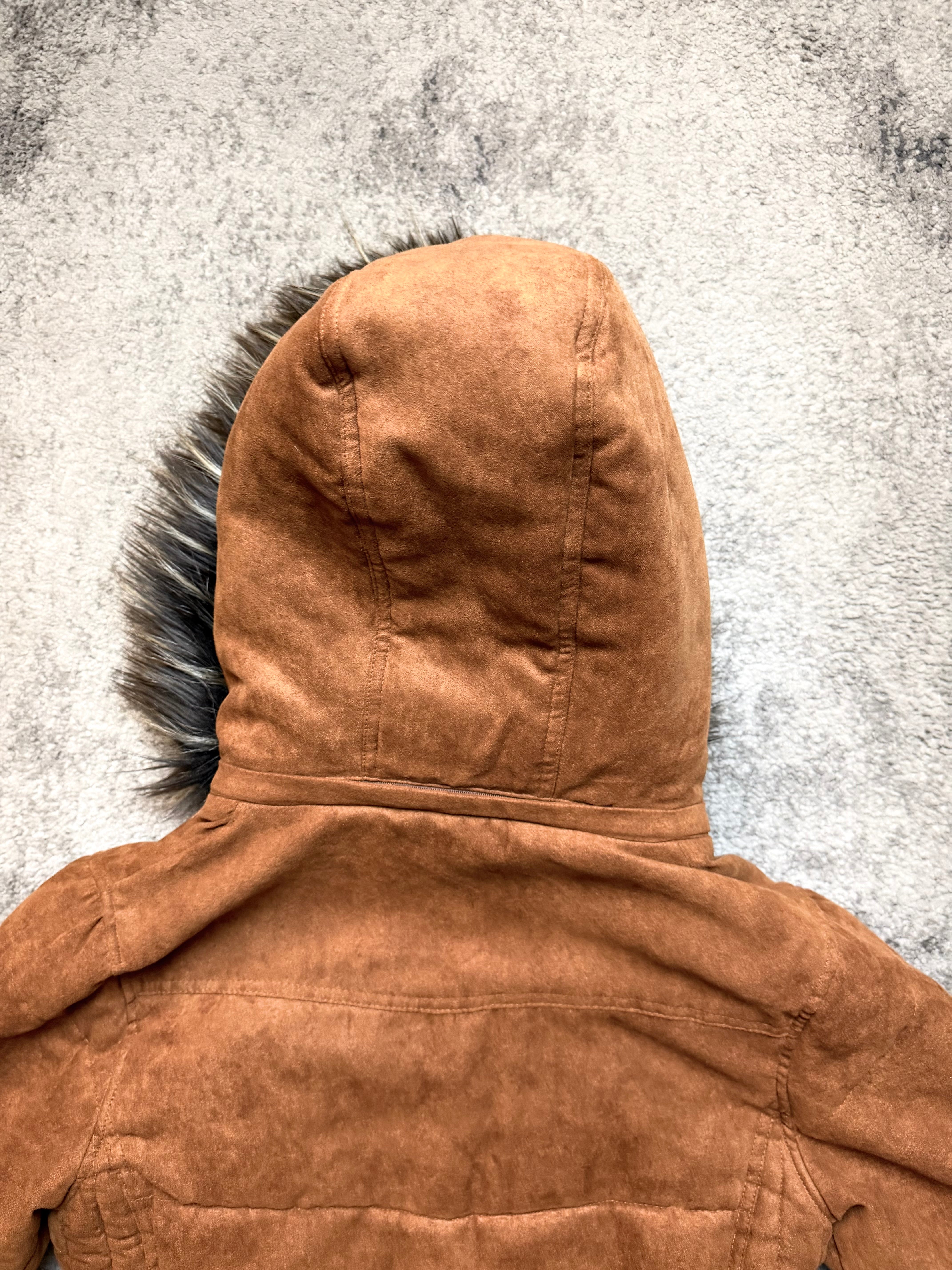 Faux-suede outer shell with padded insulation. Faux-fur hood trim for that dramatic, cold-weather silhouette, and ribbed cuffs for extra comfort.