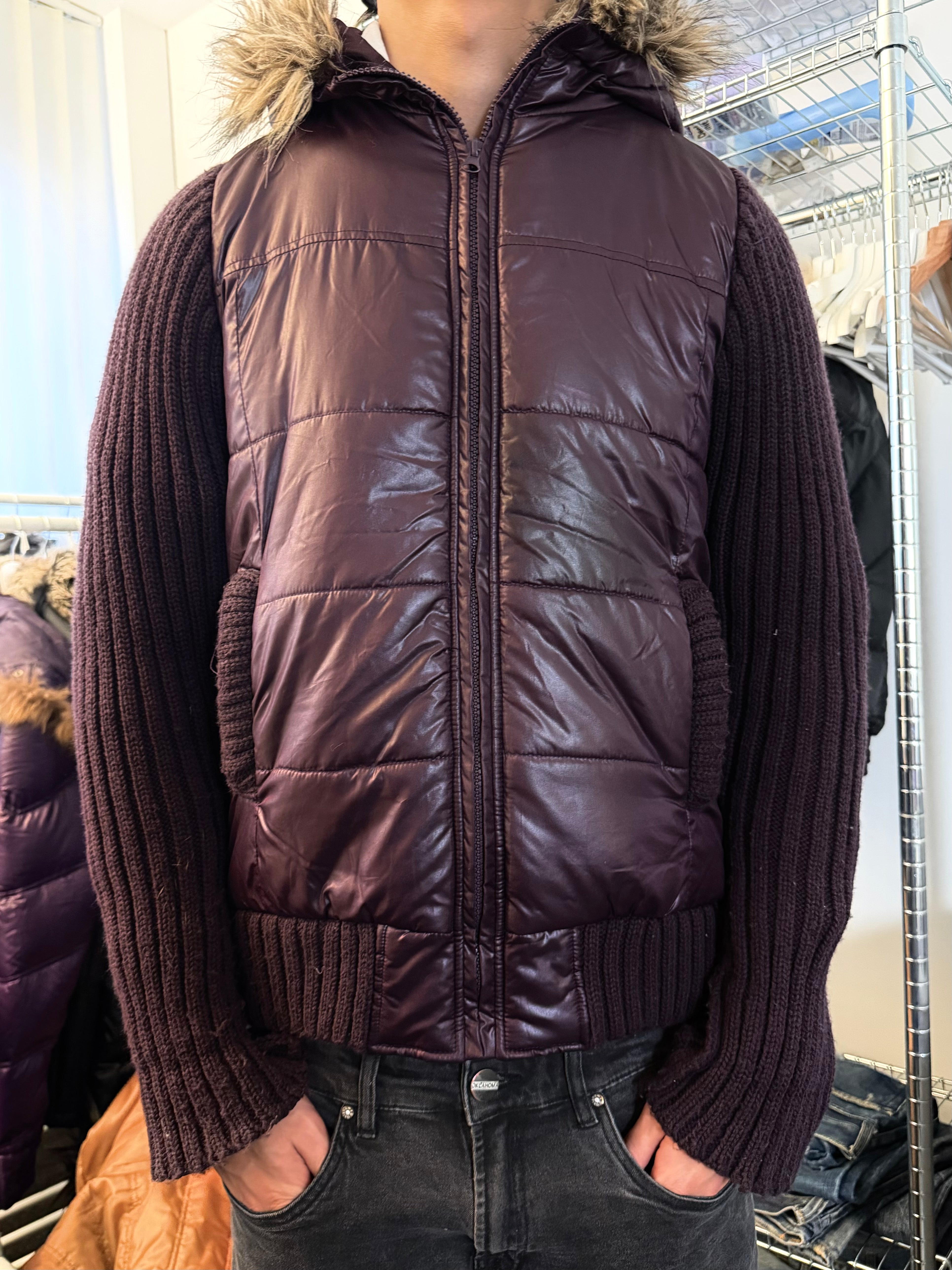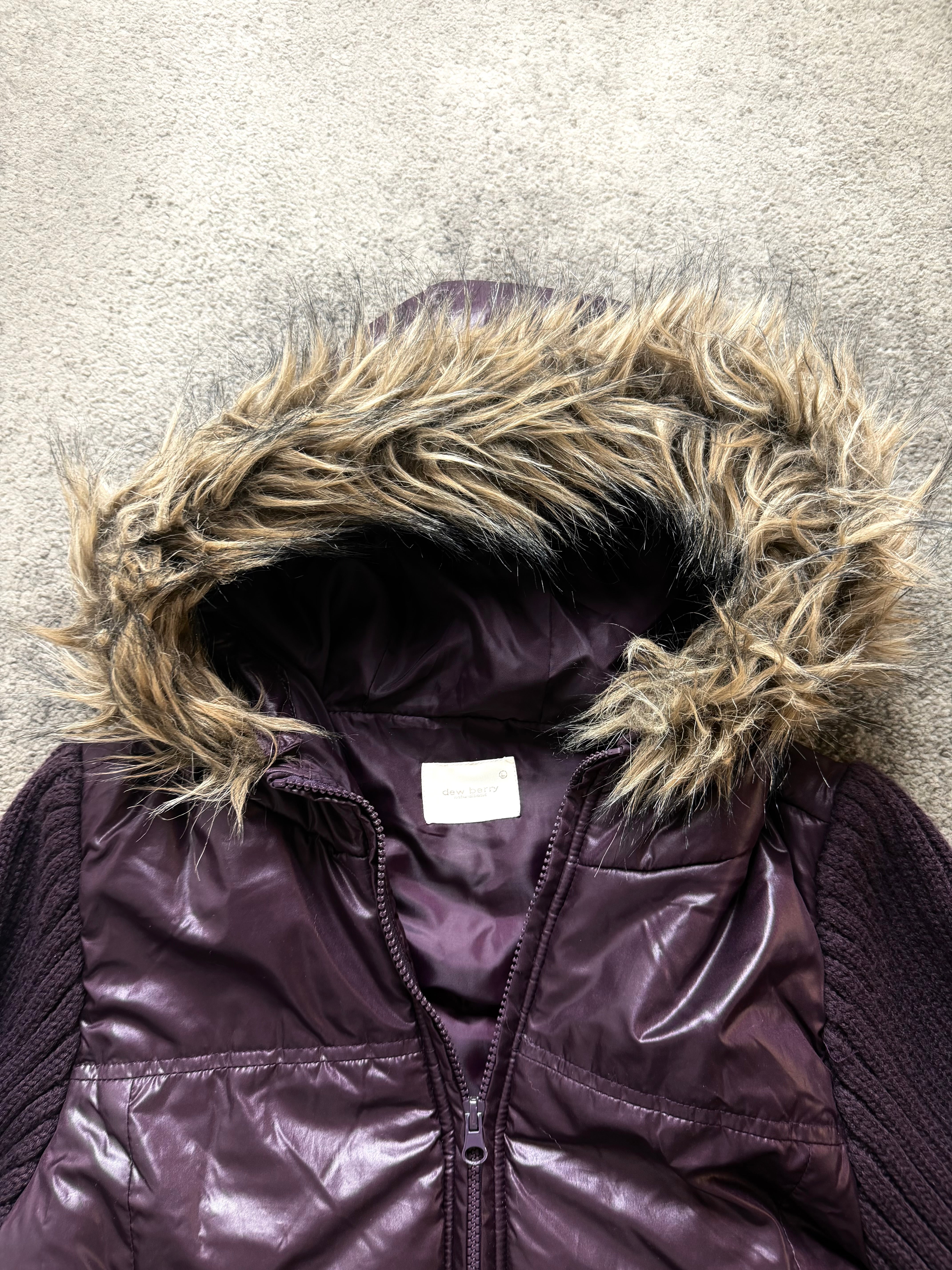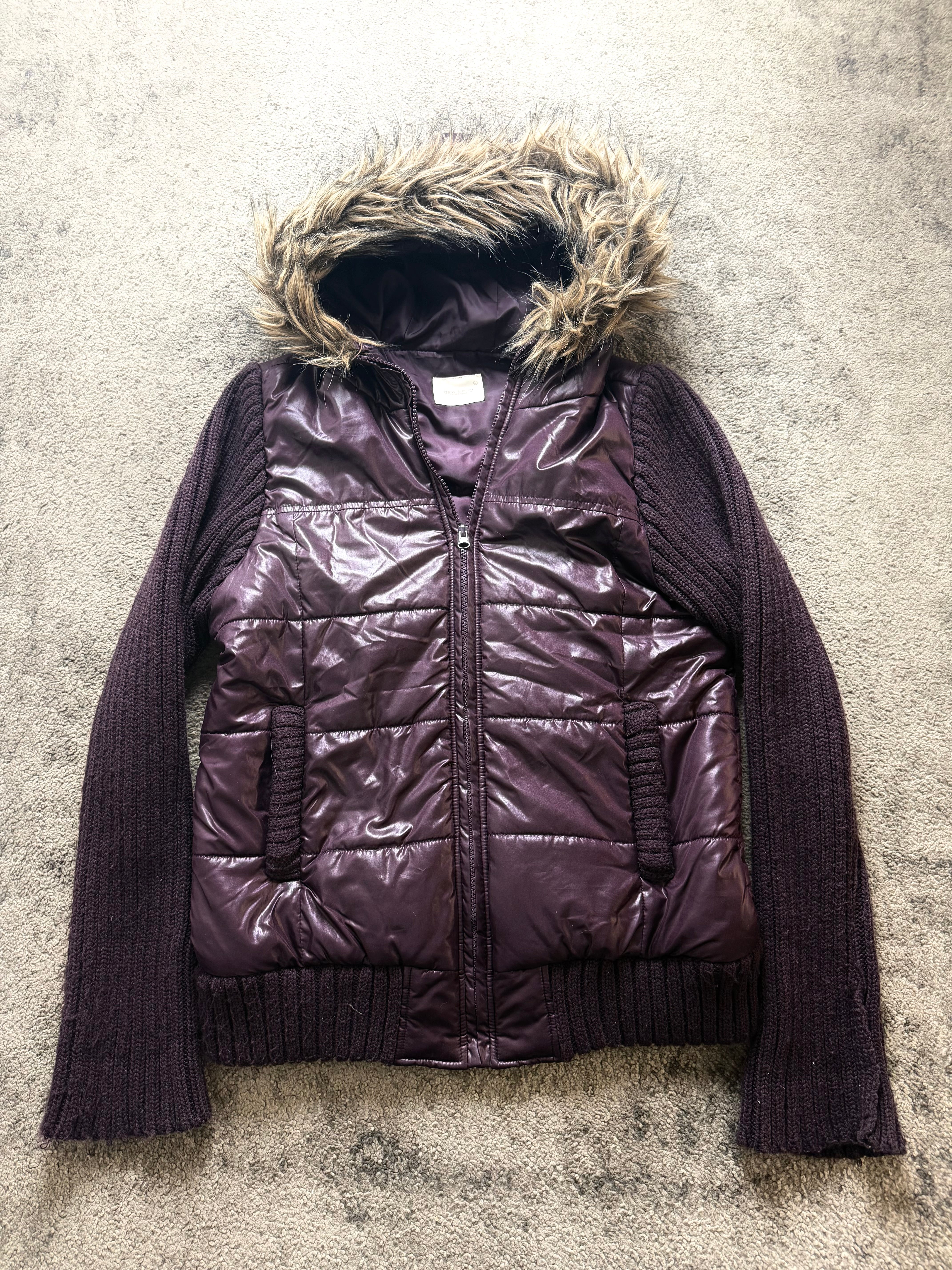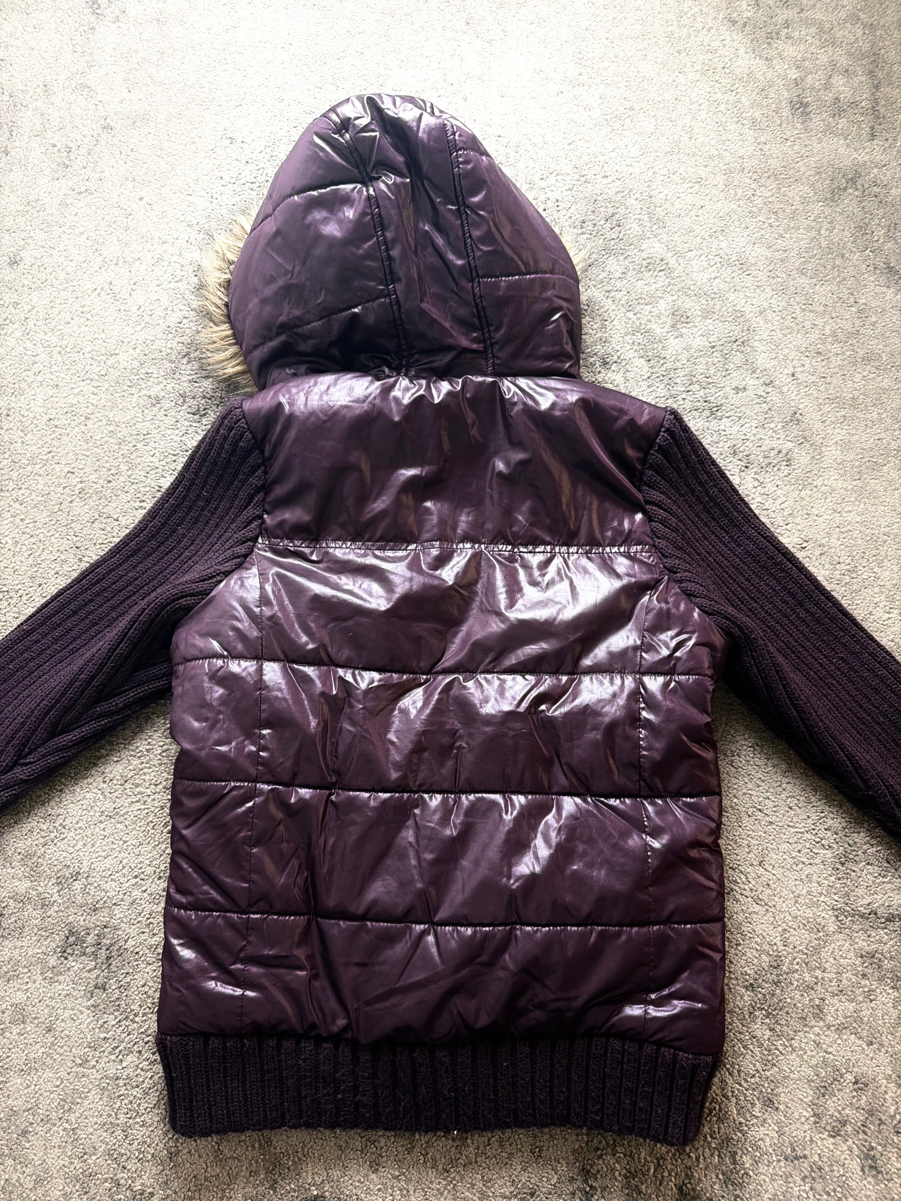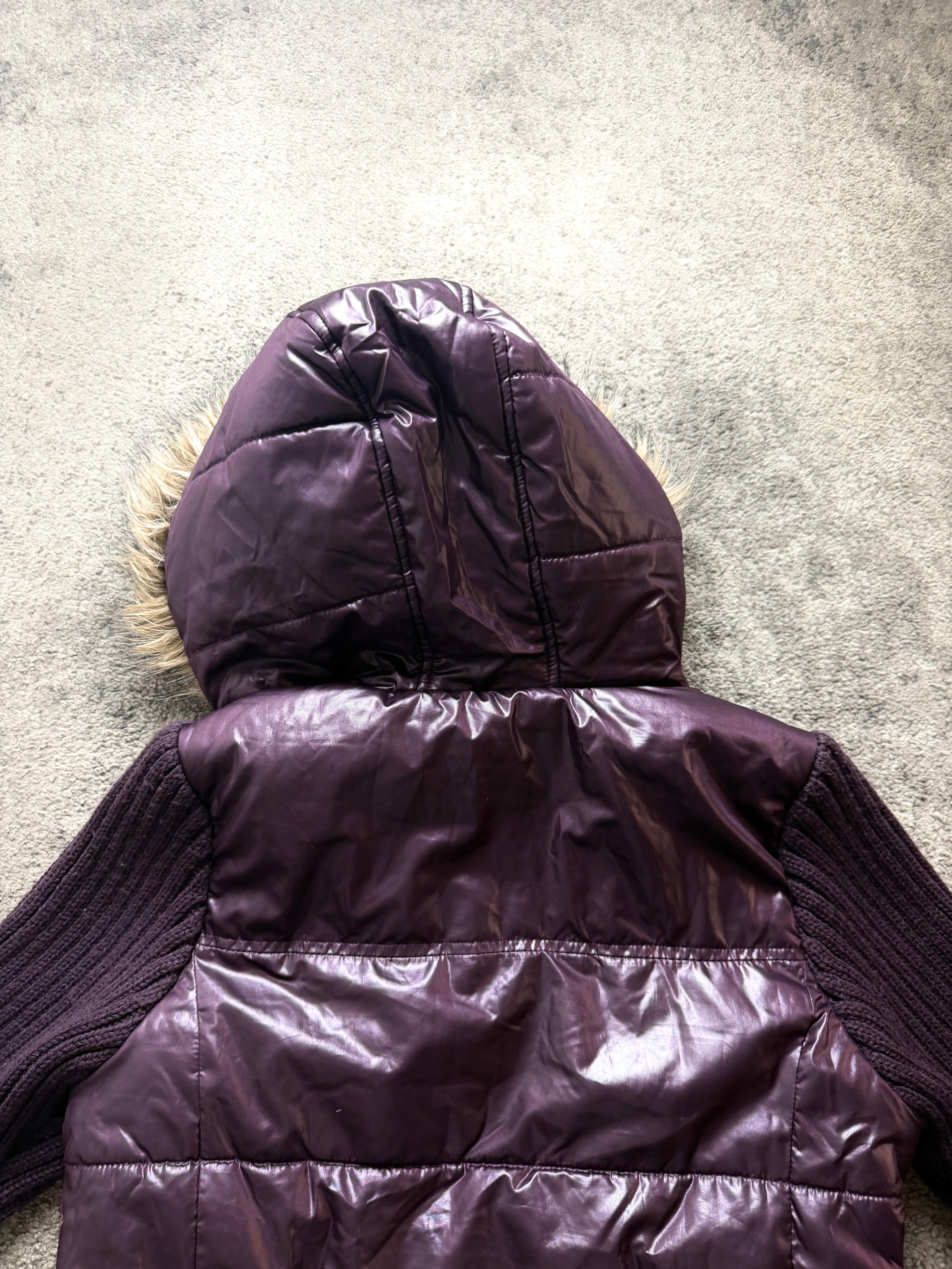 Glossy synthetic padded body for warmth, combined with thick knit sleeves and ribbed hem. Faux-fur hood trim adds depth and texture.