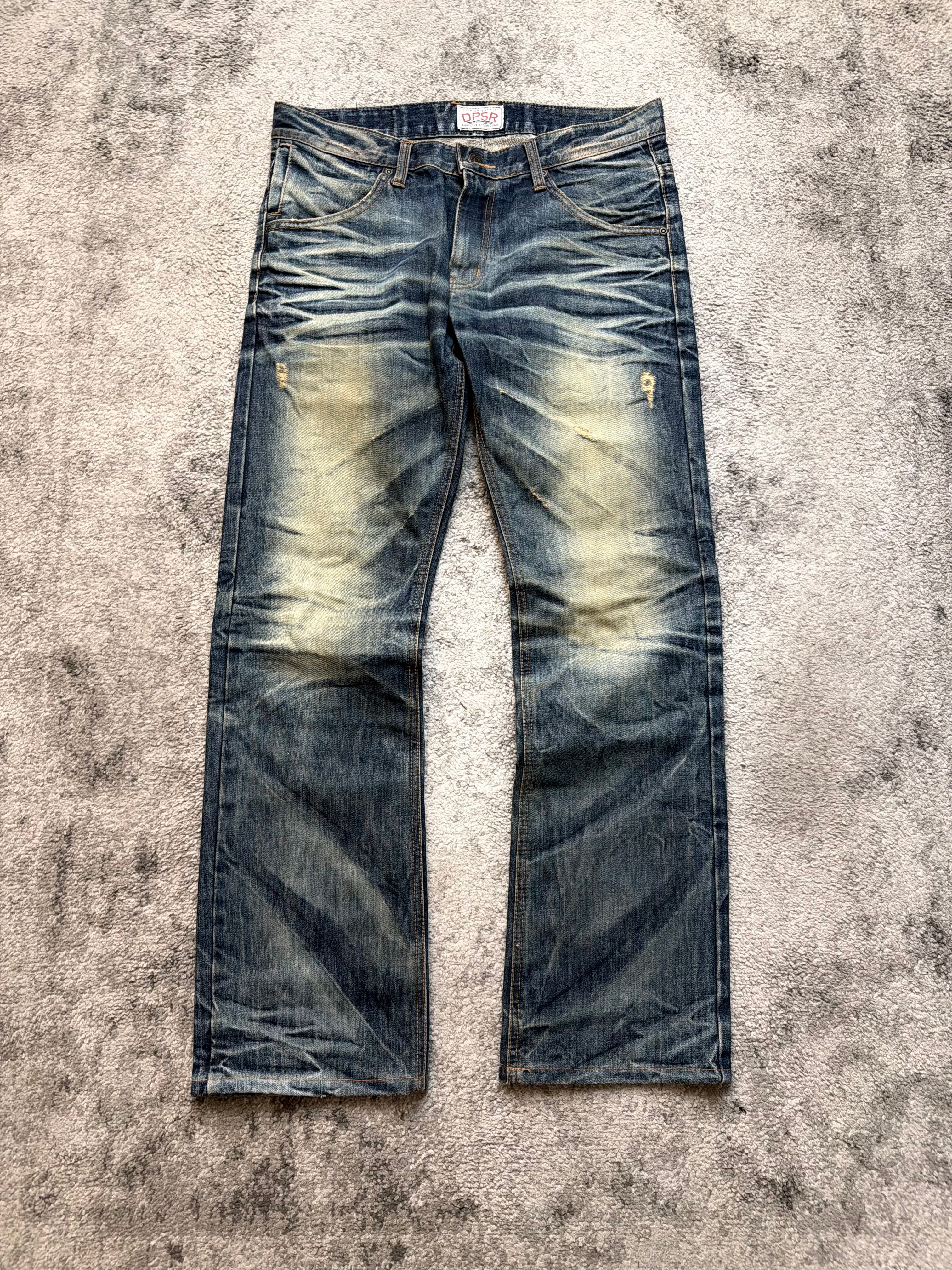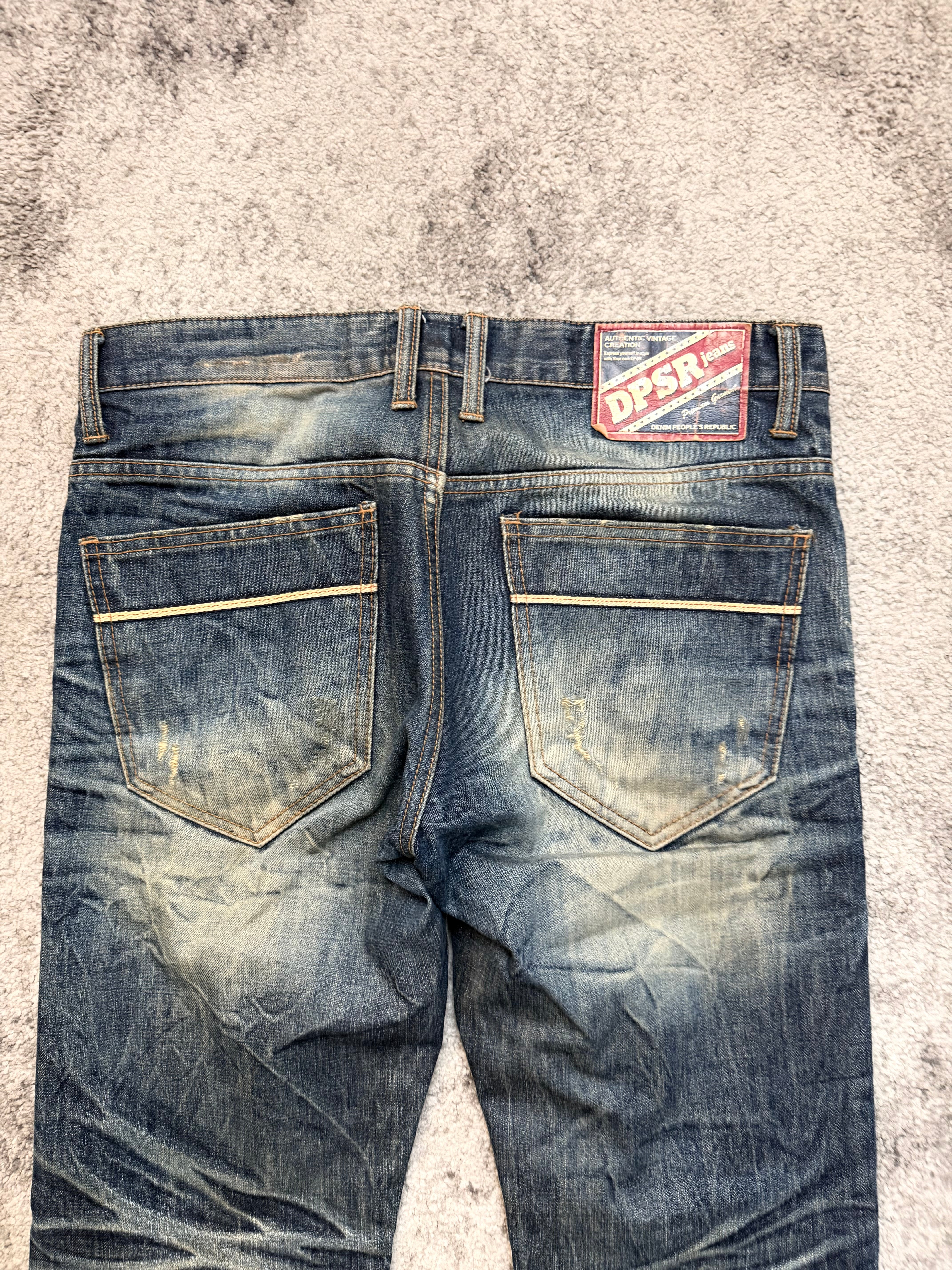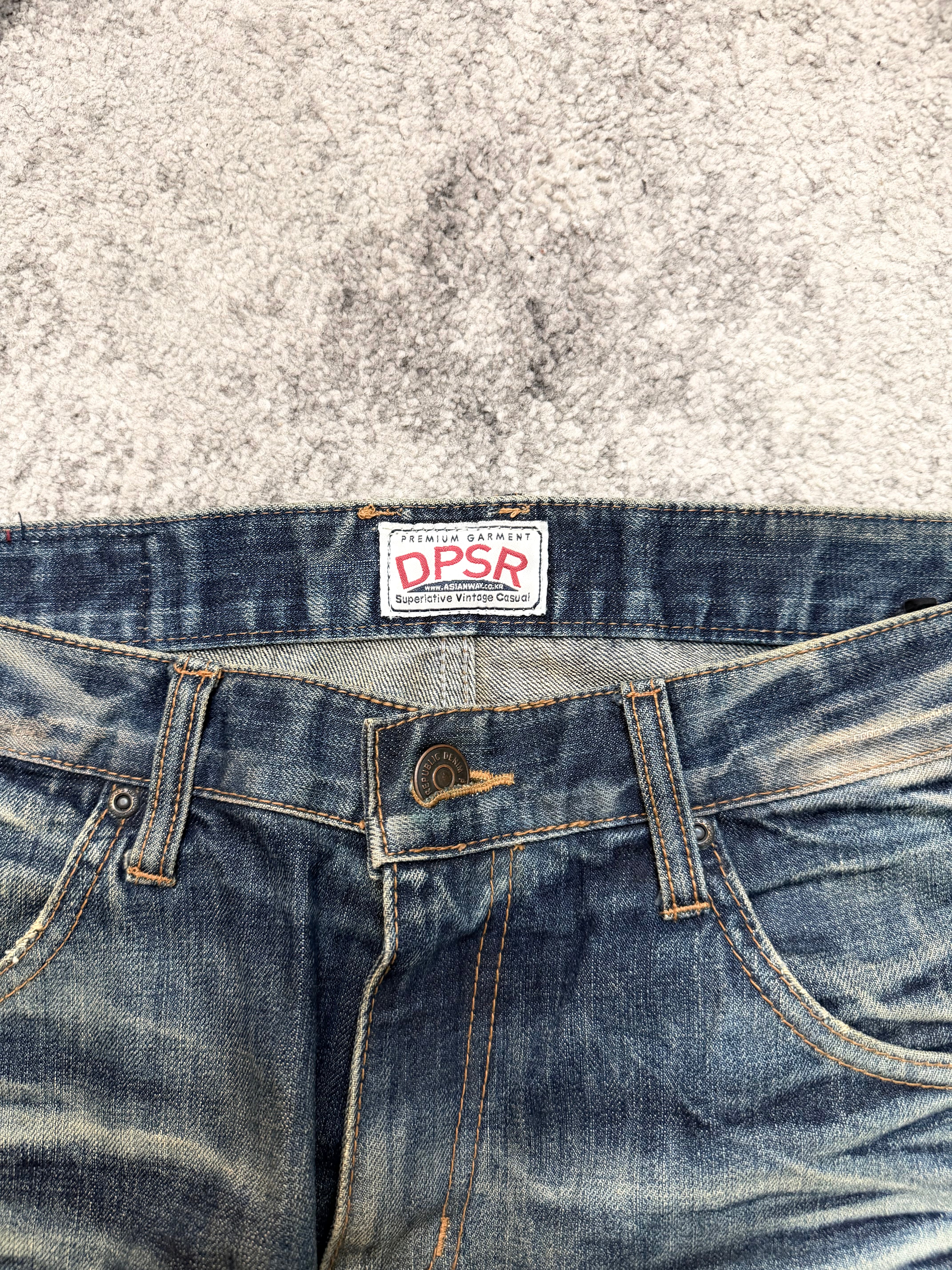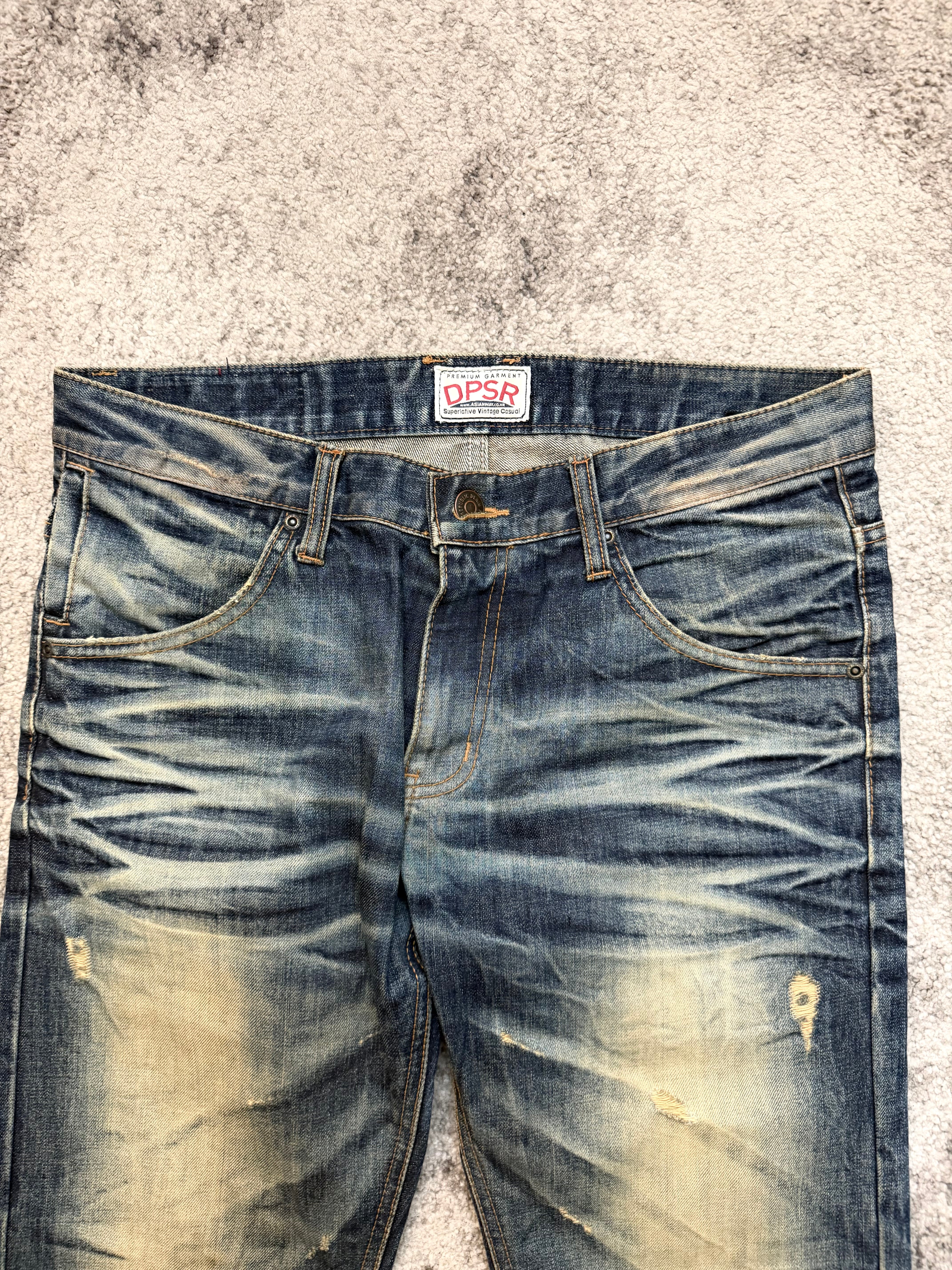 A pair that feels lifted straight from a smoky Shibuya backstreet — worn in, broken perfectly, and humming with that raw late-2000s Japanese archive attitude. These DPSR jeans hit that sweet spot between rebellion and nostalgia: heavy whiskering, deep honey fades, and that signature DPSR texture that looks like it’s been lived in on night trains and studio floors.