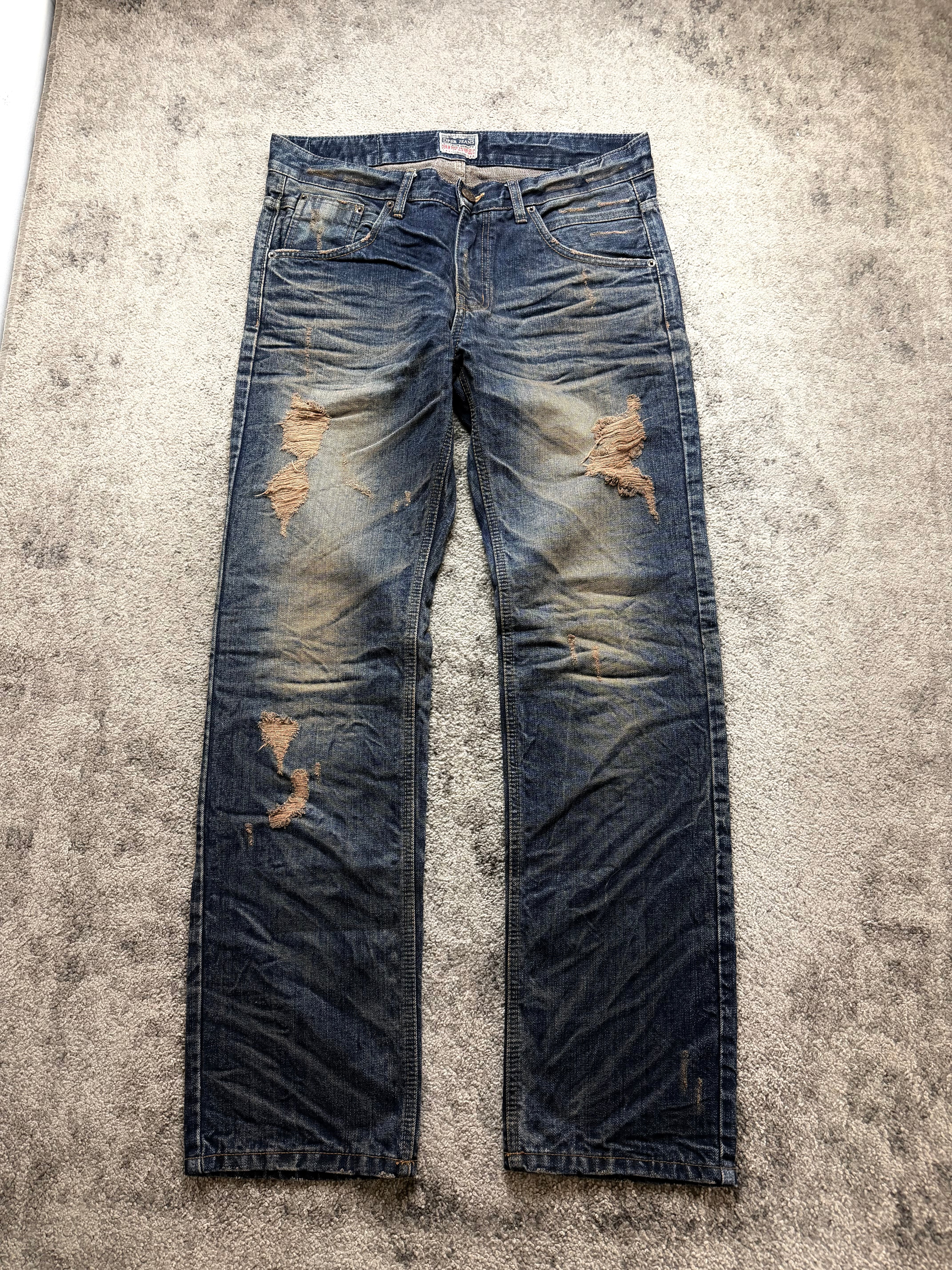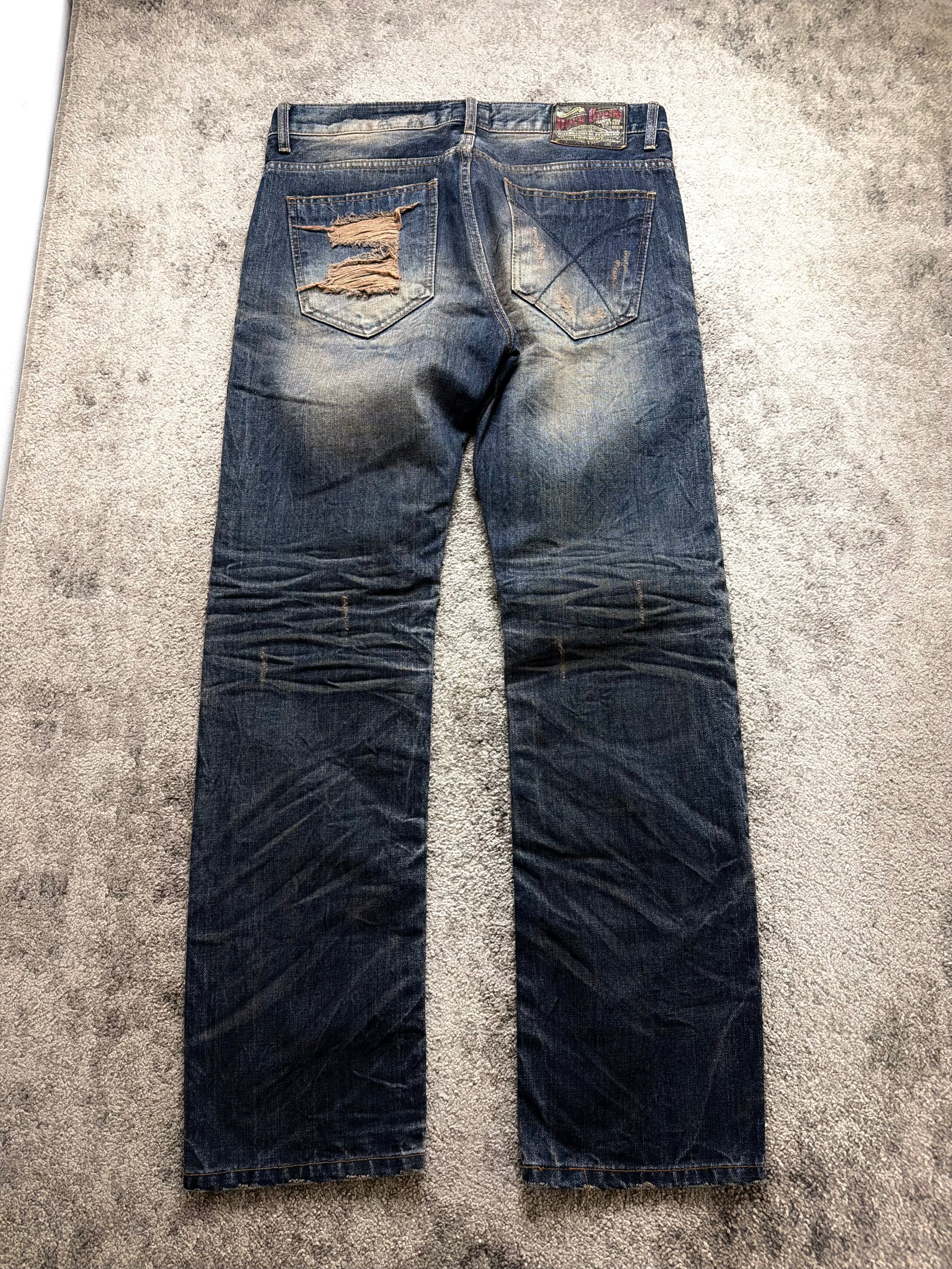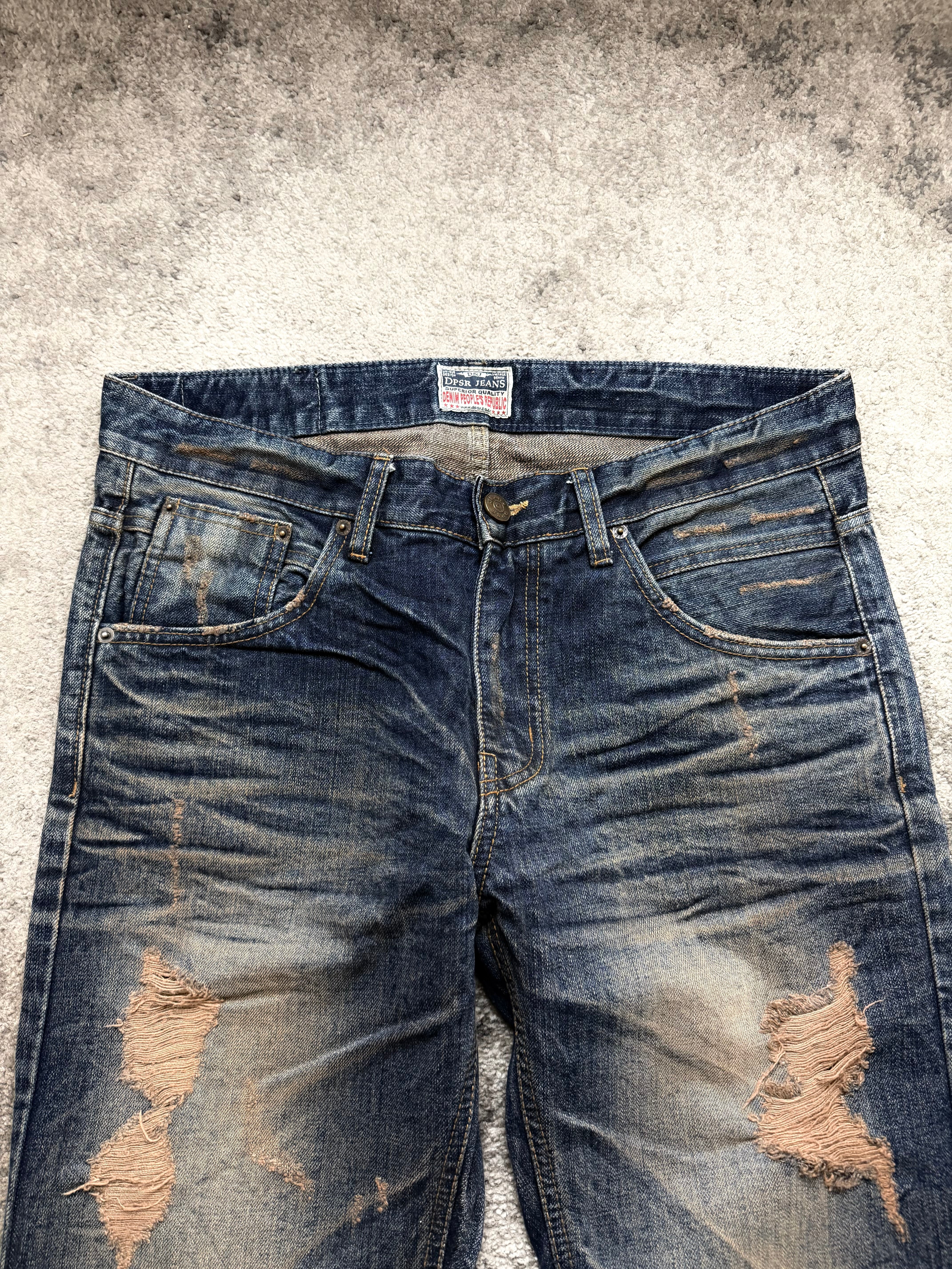 Condition: Pre-loved with strong all-over fading and intentional distressing at the thighs and knees. Frayed rip details are part of the design. No structural damage – solid and fully wearable. Worn hard, in the best way.