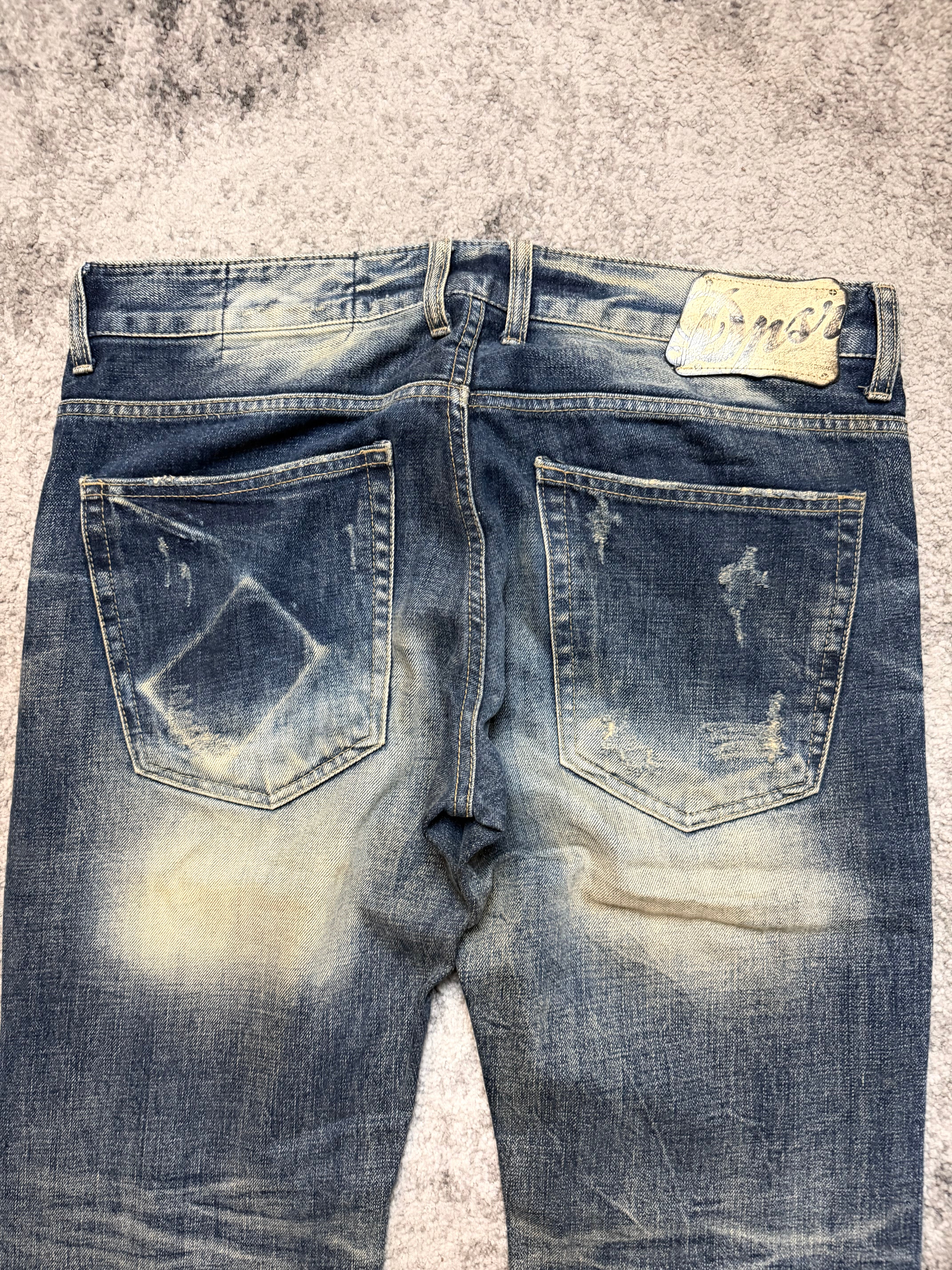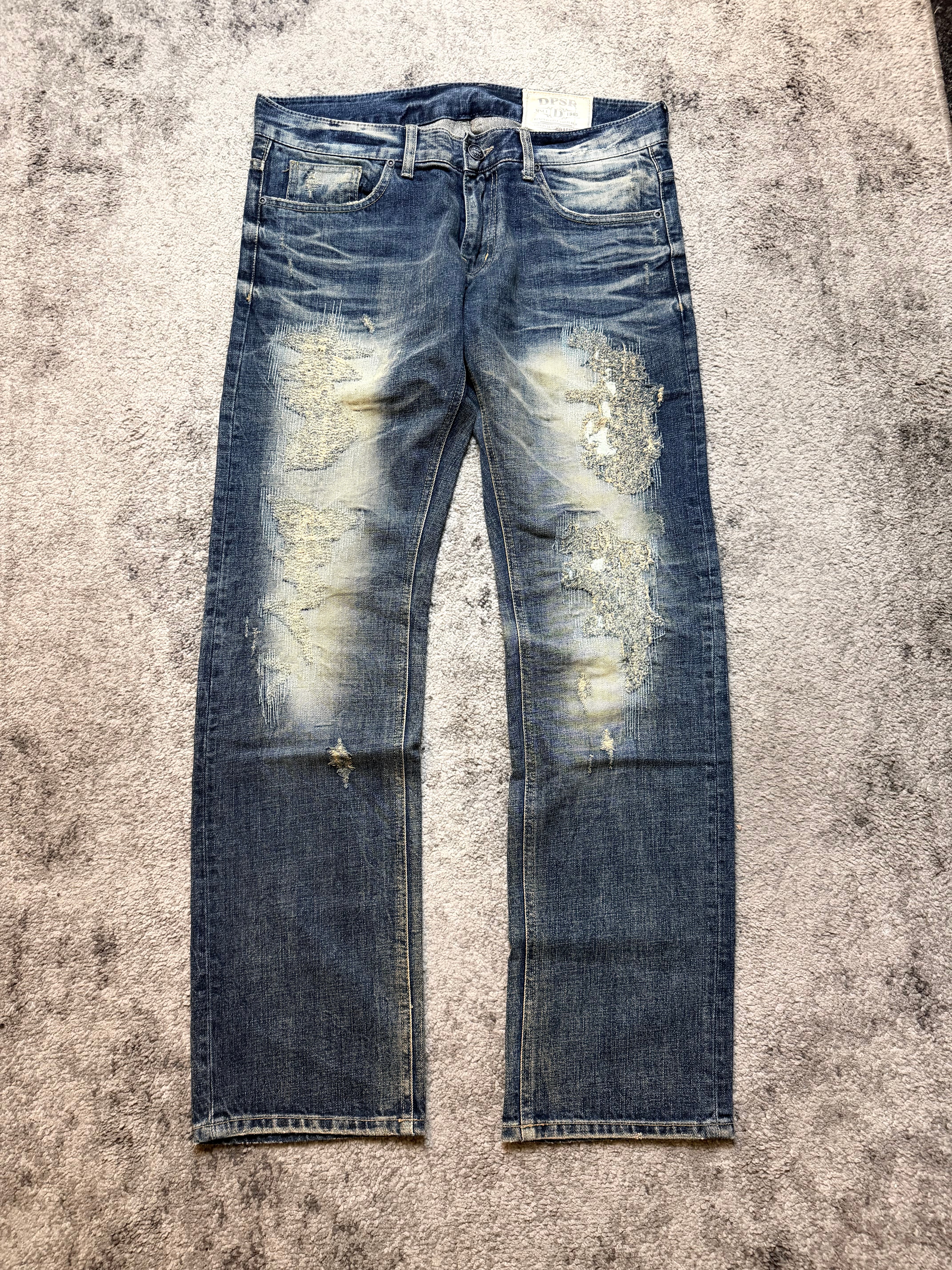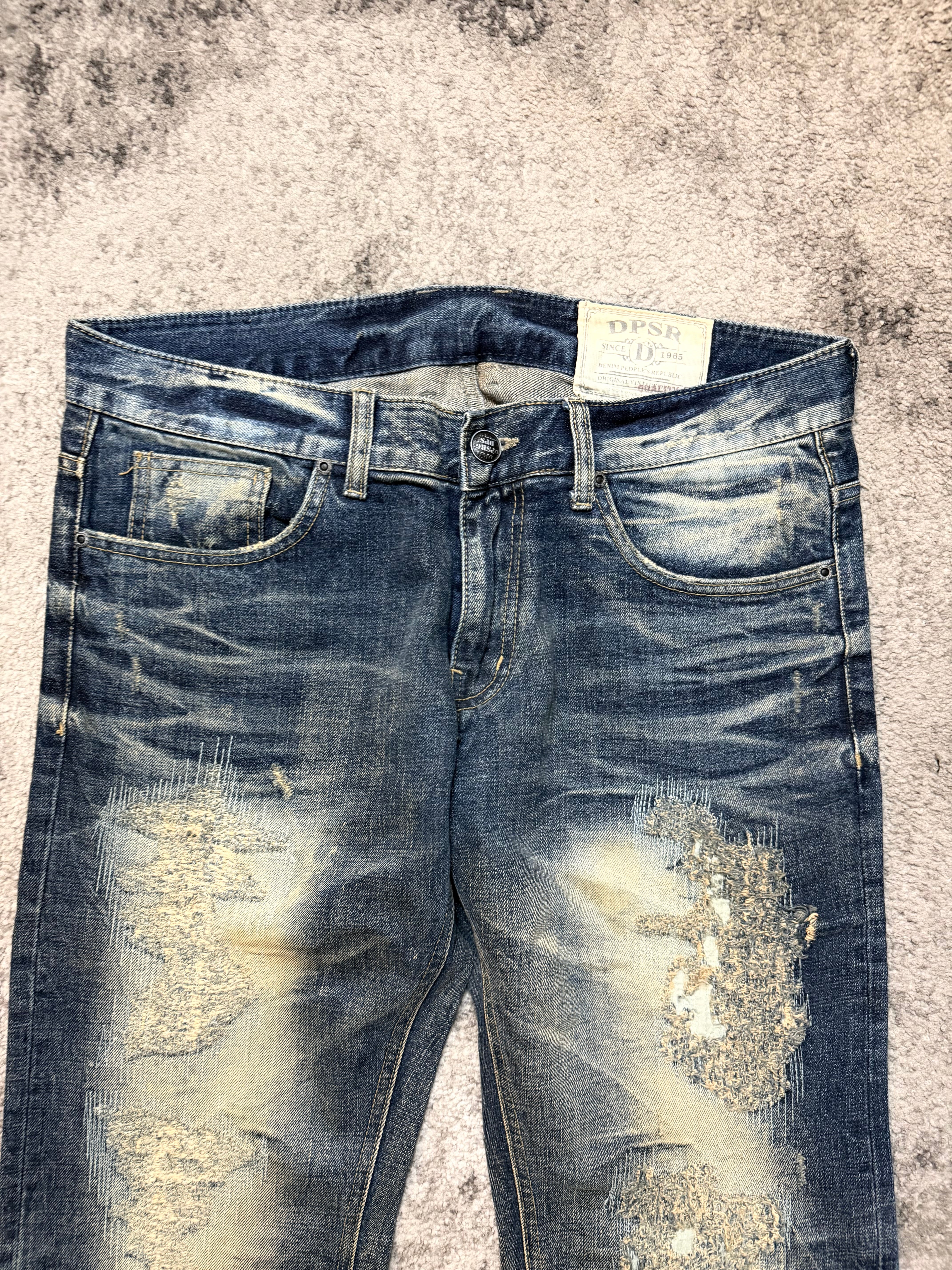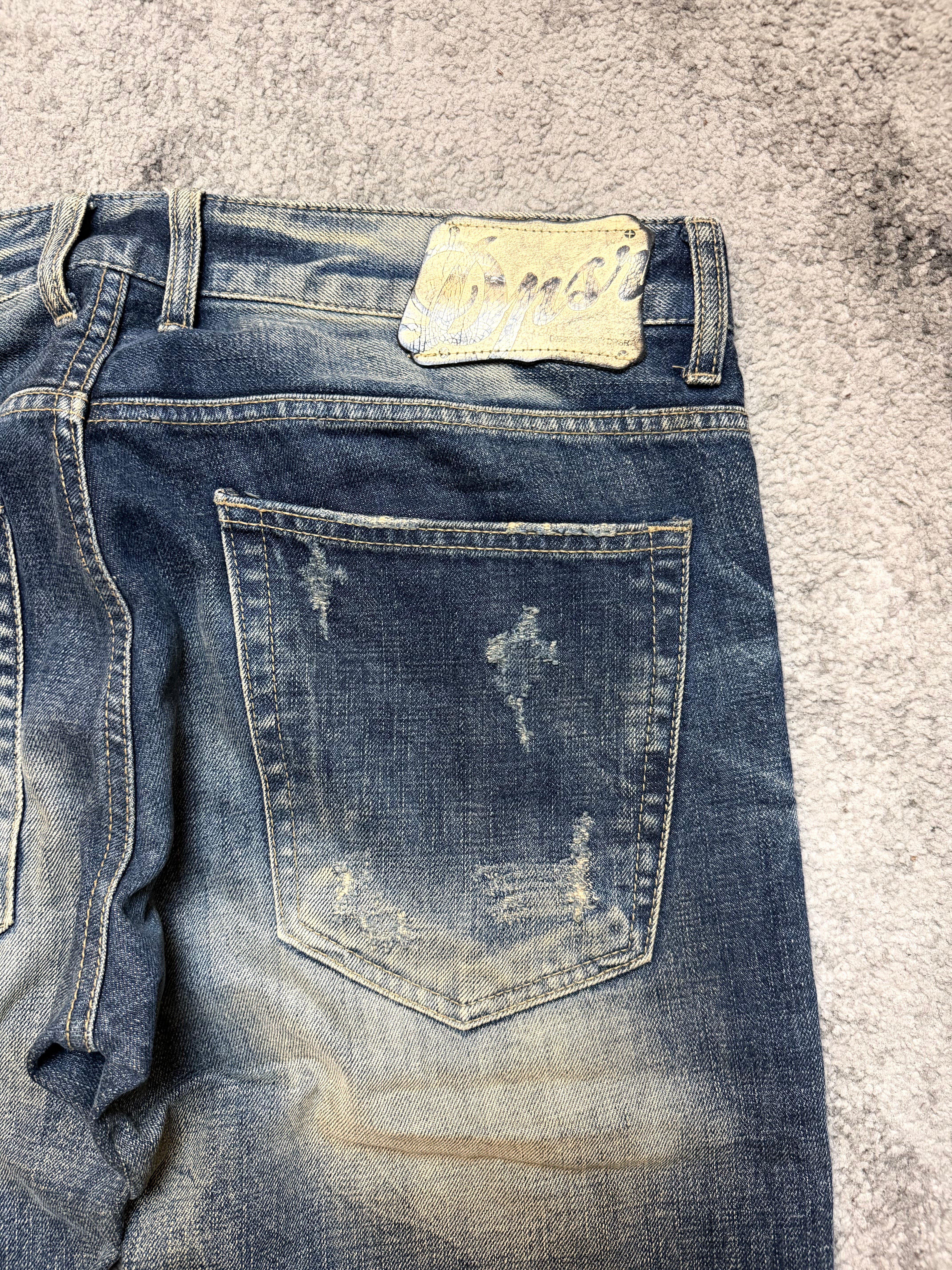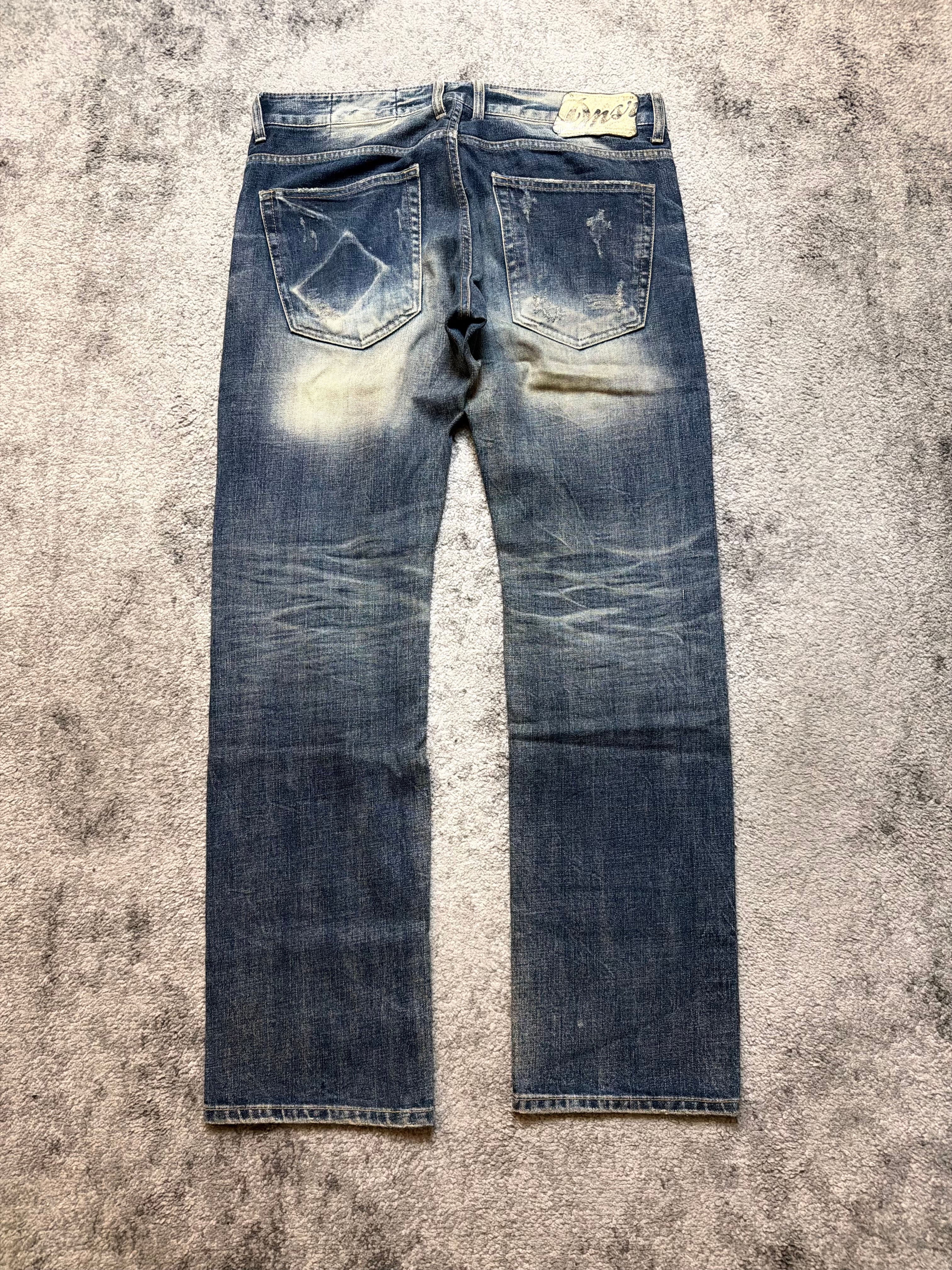 A raw, emotional piece straight out of the Japanese archive scene — this DPSR denim feels like something lifted from early Number (N)ine or ifsixwasnine closets. The wash hits that perfect sun-bleached blue, with heavy distressing and hand-torn textures that make the jeans feel lived-in in the best possible way.
