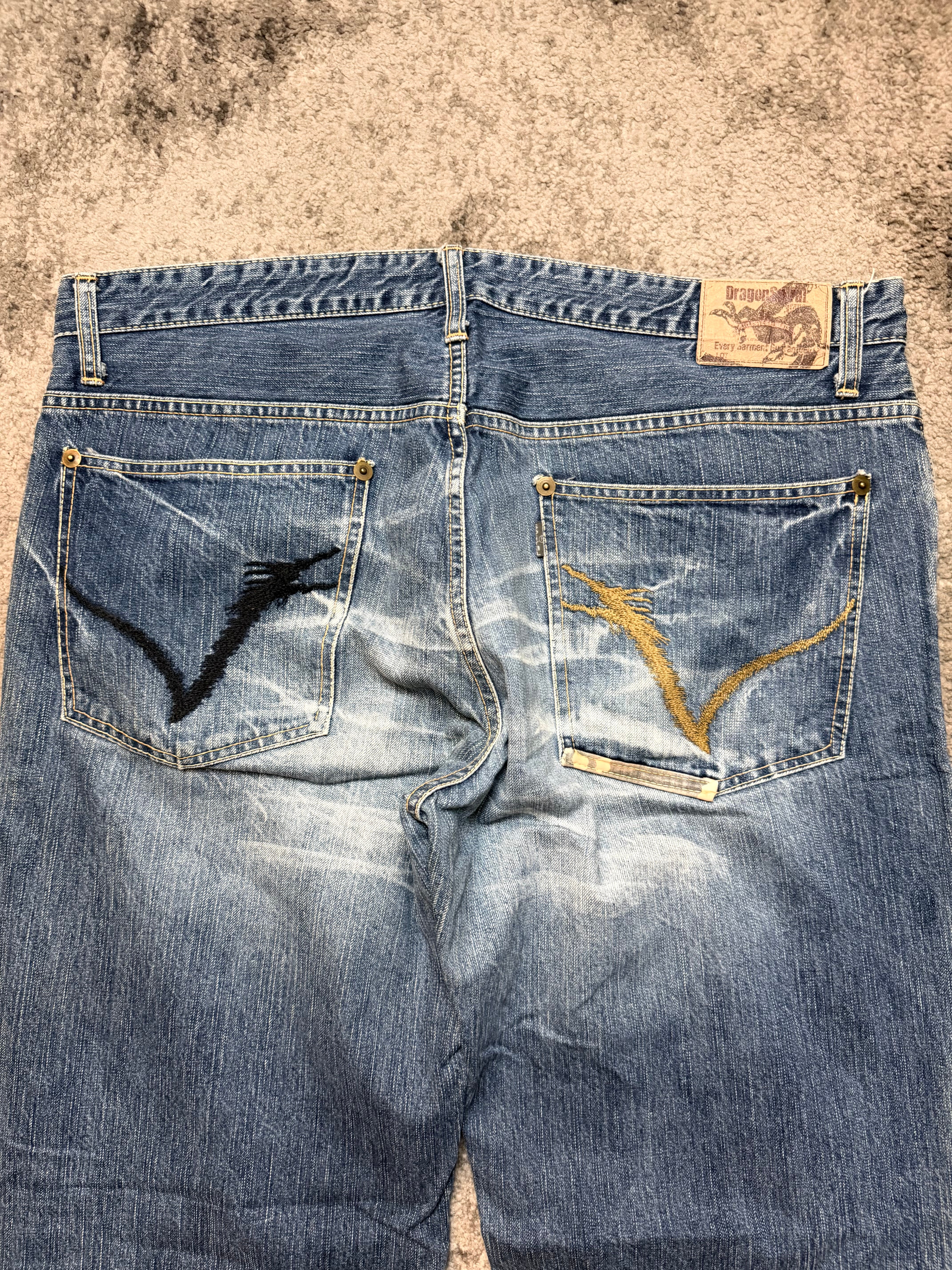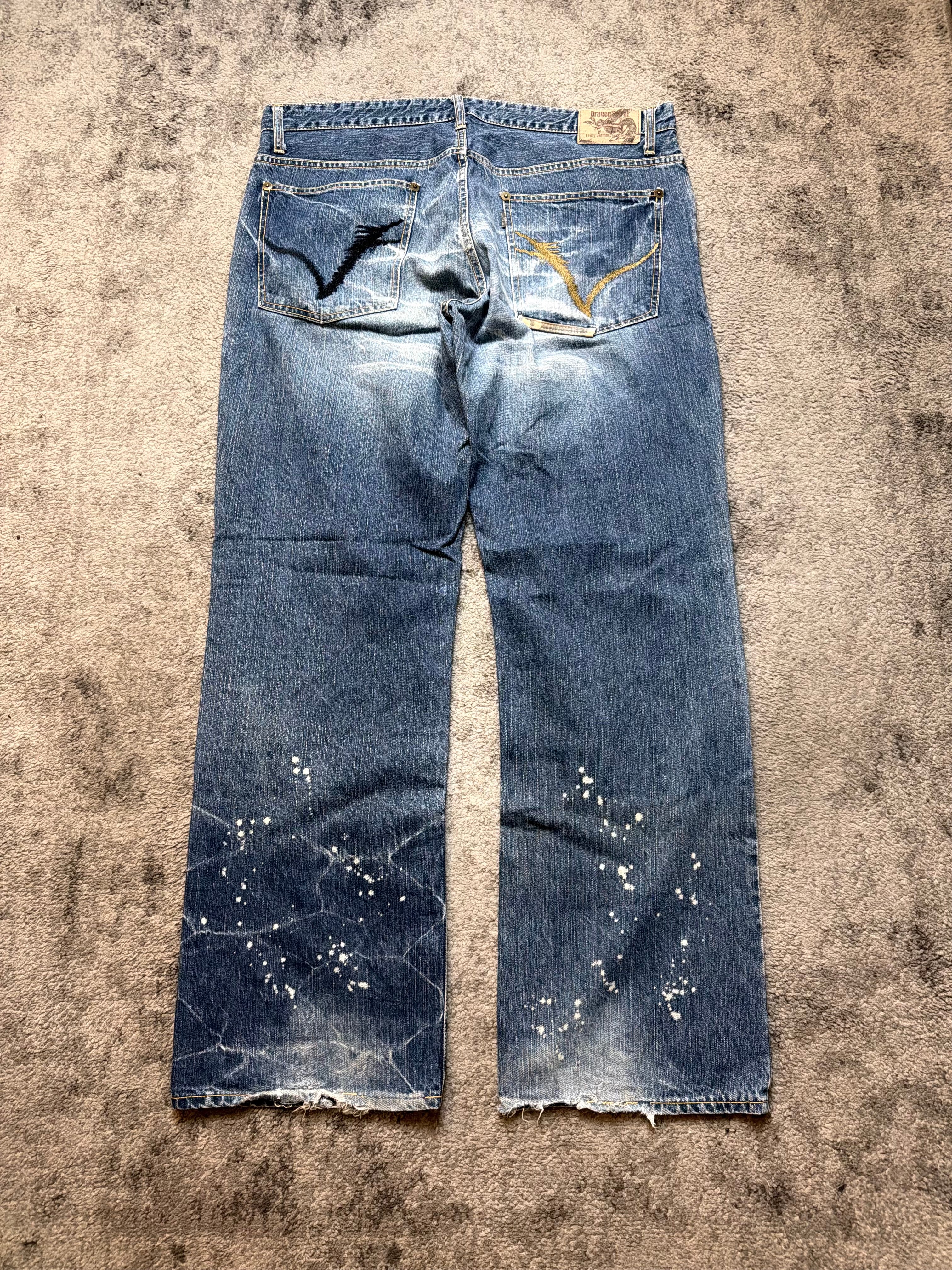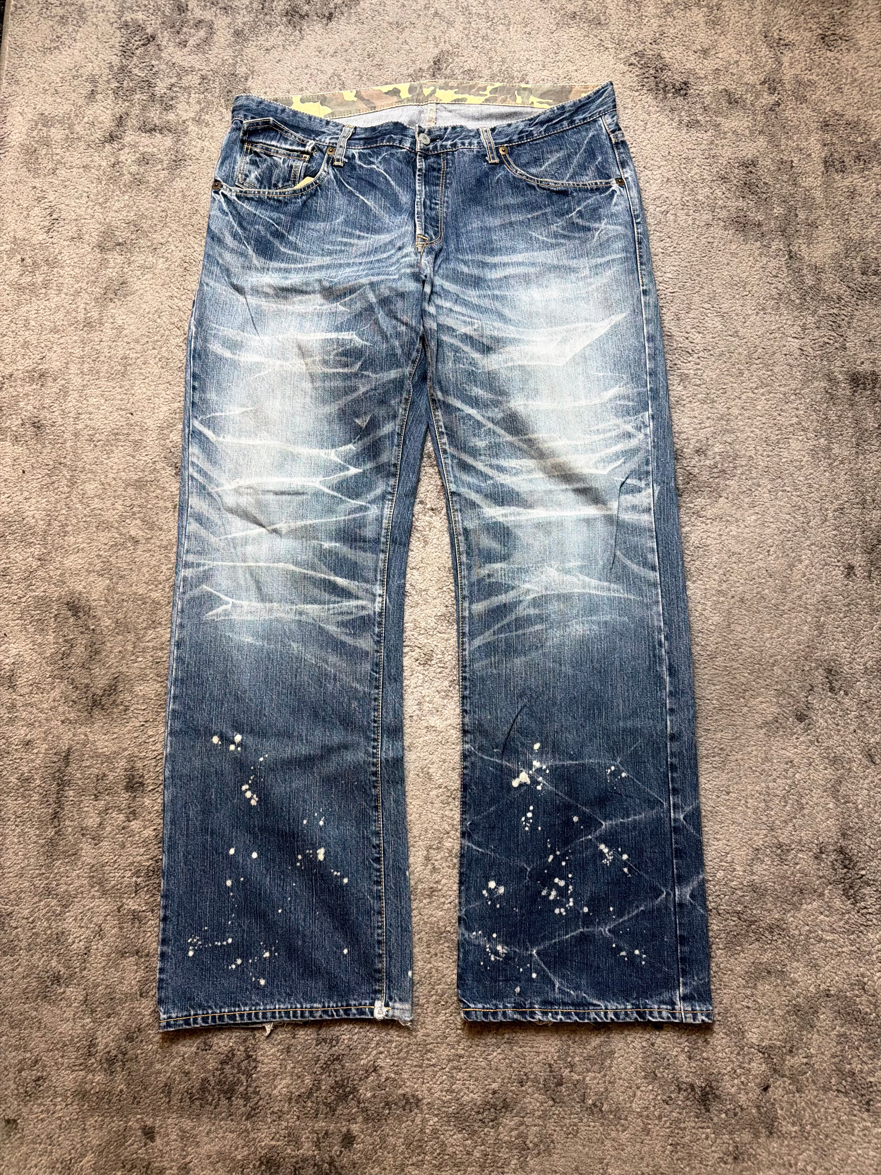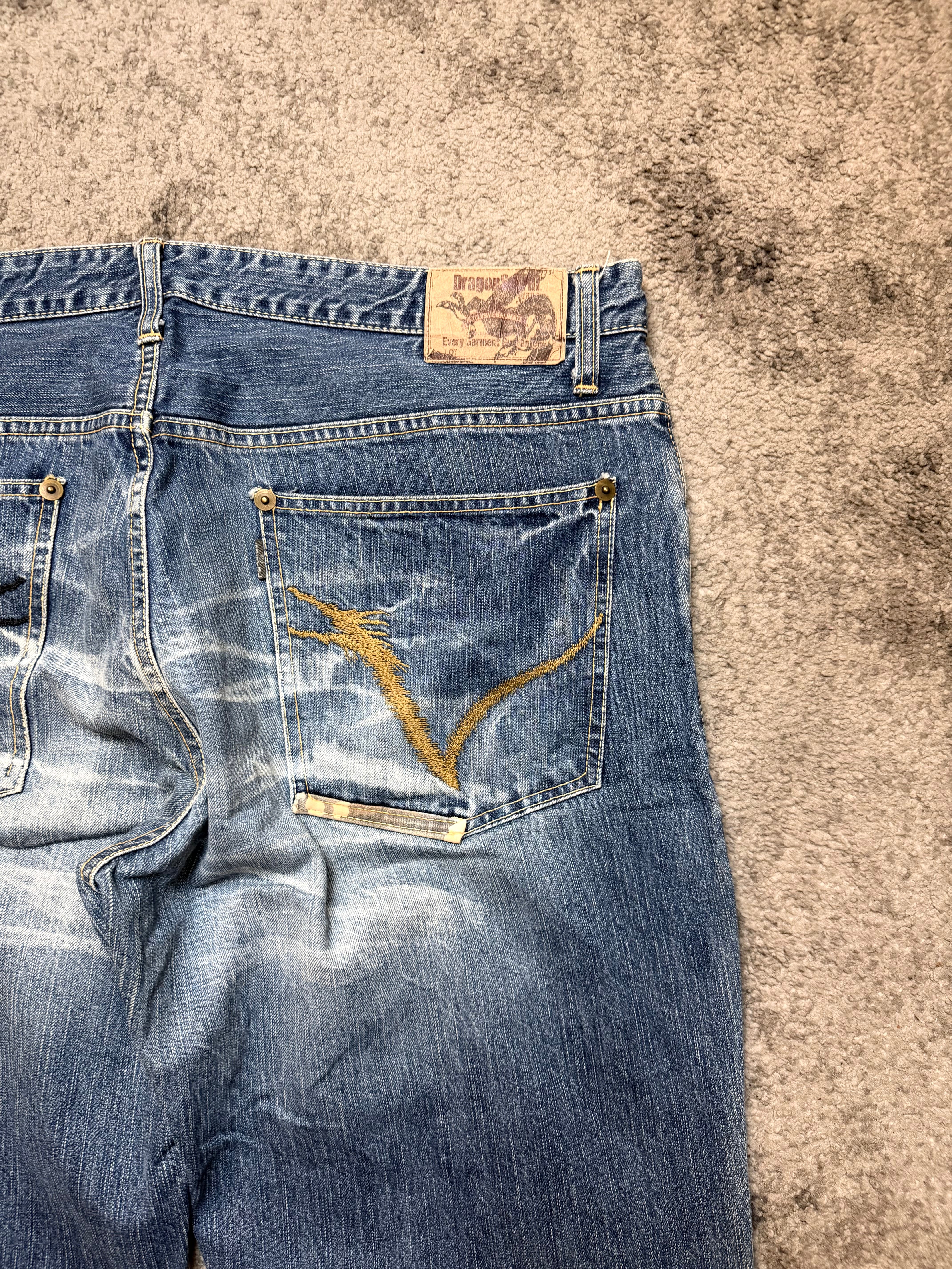 A perfect embodiment of Japan’s experimental denim movement — these DRAGONSPIRAL jeans fuse craftsmanship with chaos. The heavy fading, paint splatters, and wide silhouette bring back the raw attitude of 2000s Harajuku streetwear — somewhere between rebellion and art.