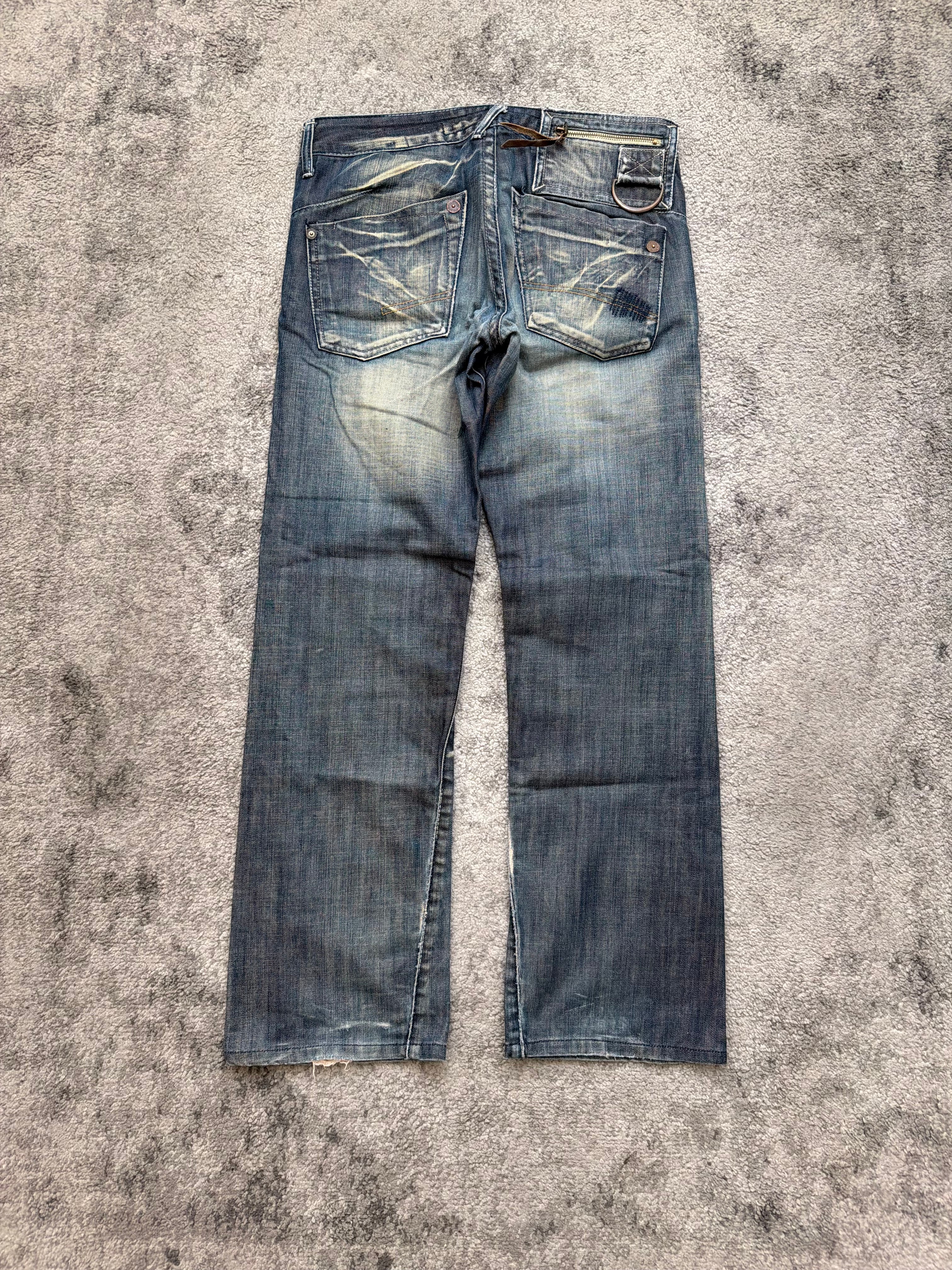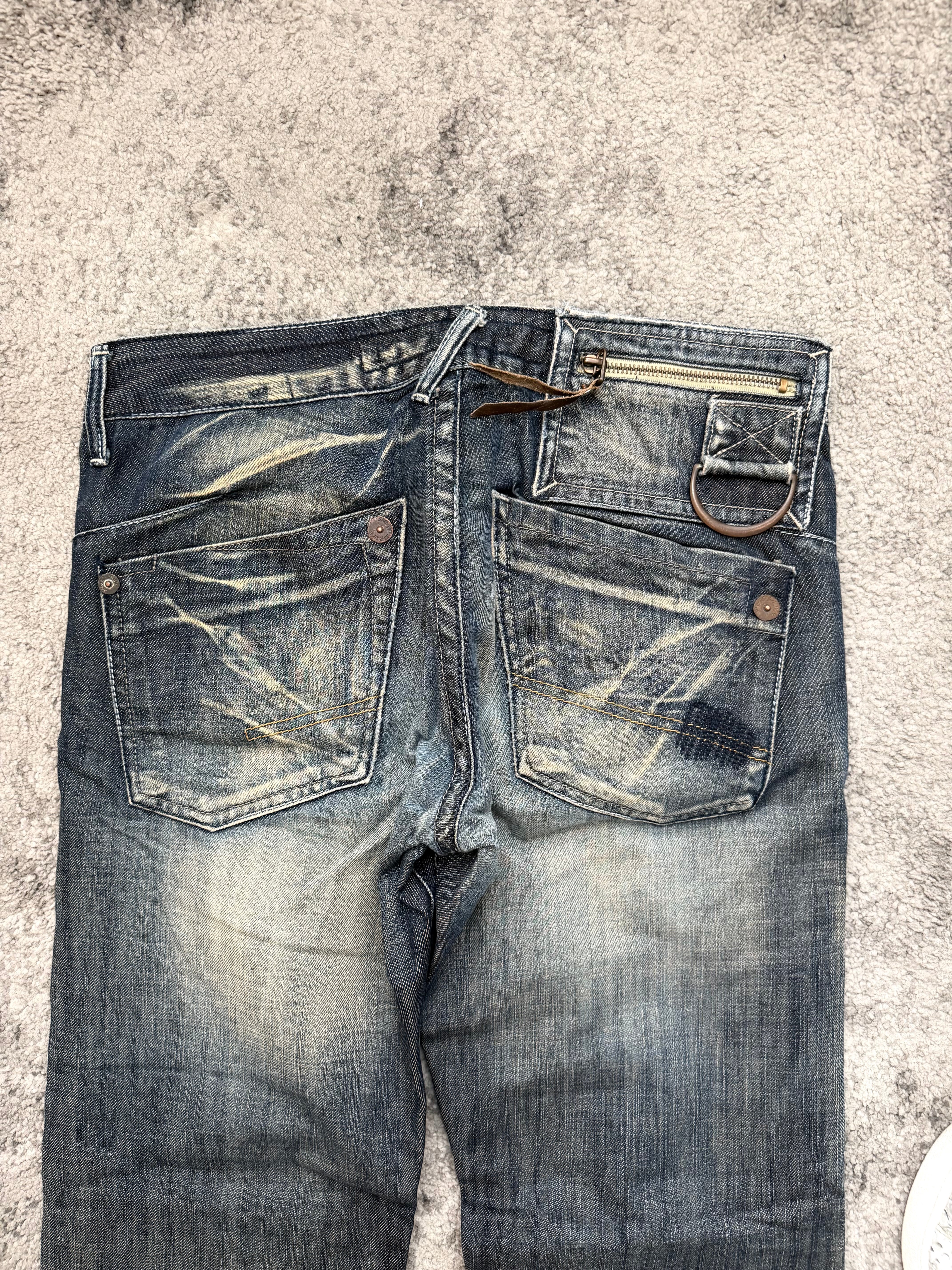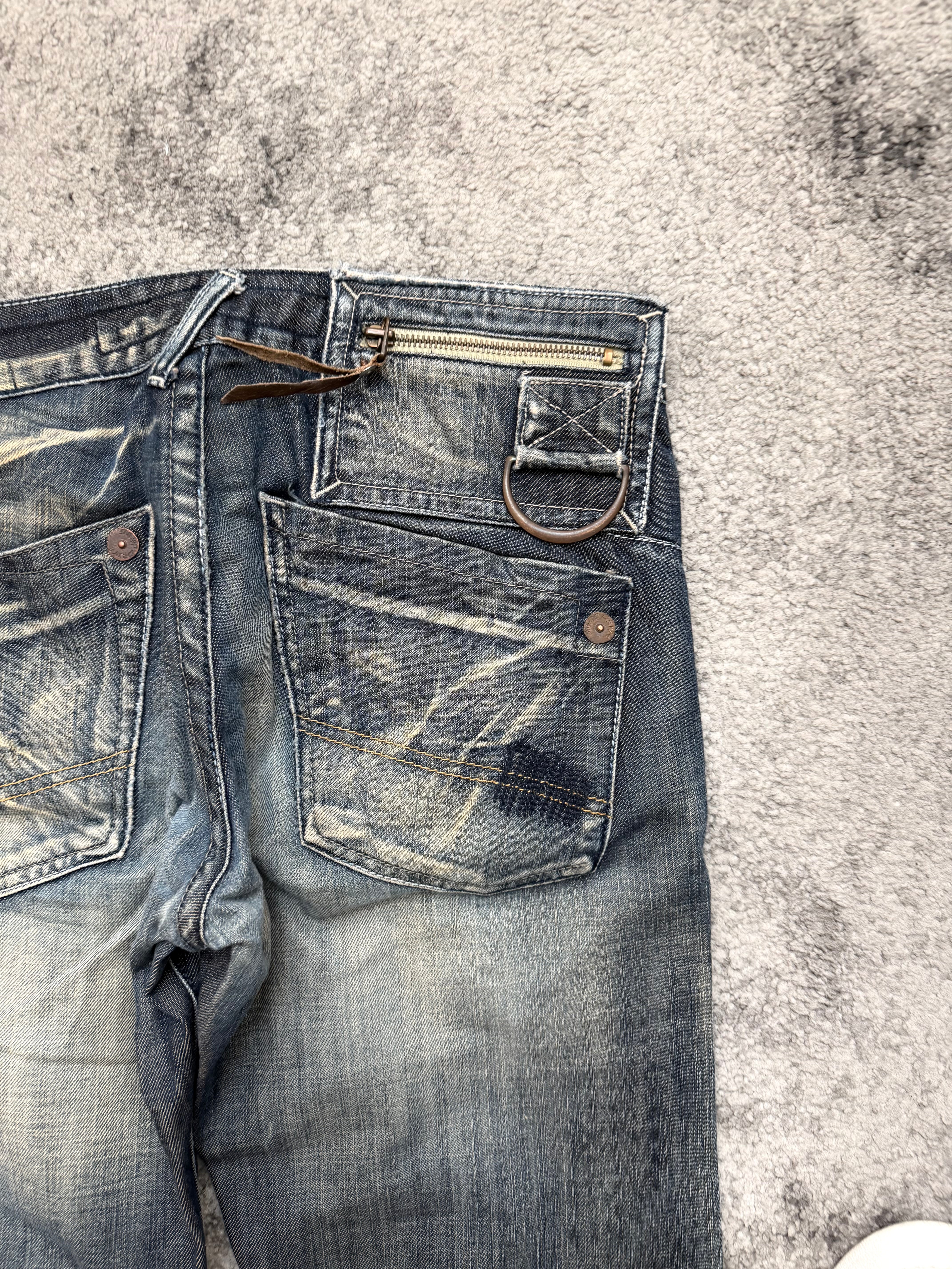 Crafted from heavyweight Japanese denim with intense fading and abrasion across the thighs and knees, giving it that lived-in authenticity. Angular front pockets, distressed whiskering, and a signature metal D-ring detail at the back reinforce its utilitarian, industrial edge.