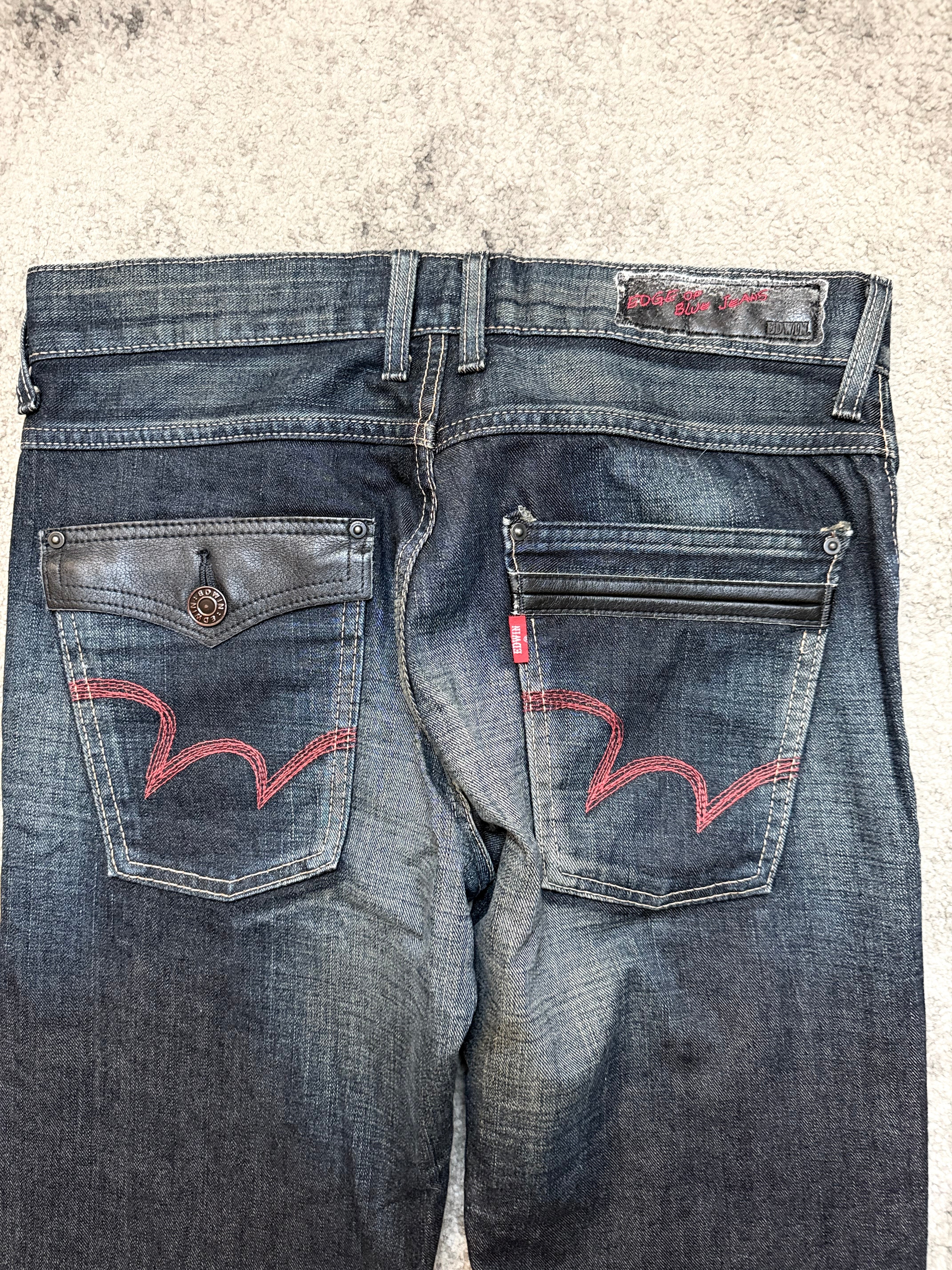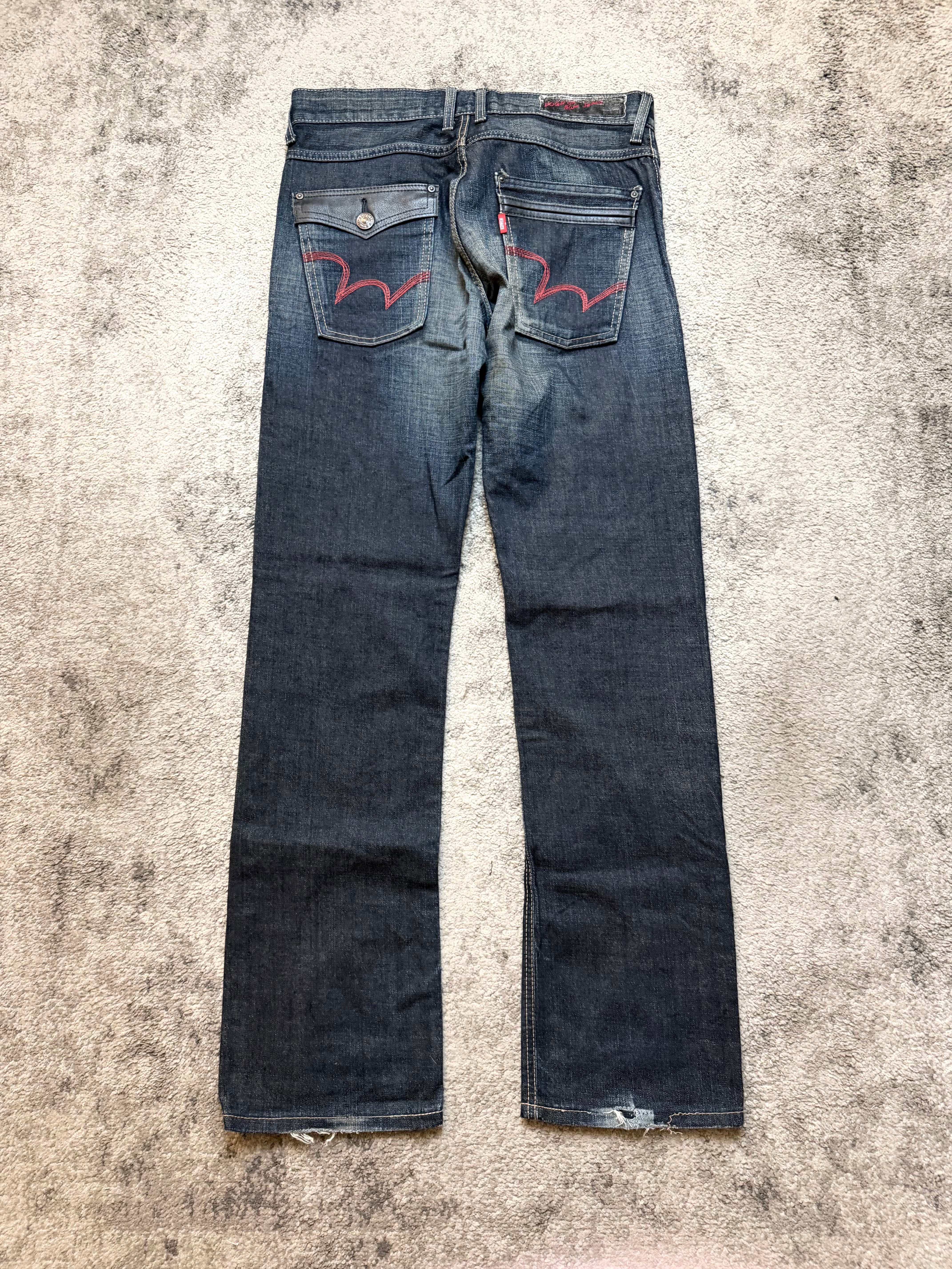 Straight-lean silhouette with classic five-pocket structure. Front is clean and understated, the back hits harder with bold red “wing-curve” stitching — a soft echo of early 2000s Harajuku flair. Perfect for host-core fits, Y2K street layering, or anyone chasing that underground rock poet vibe.