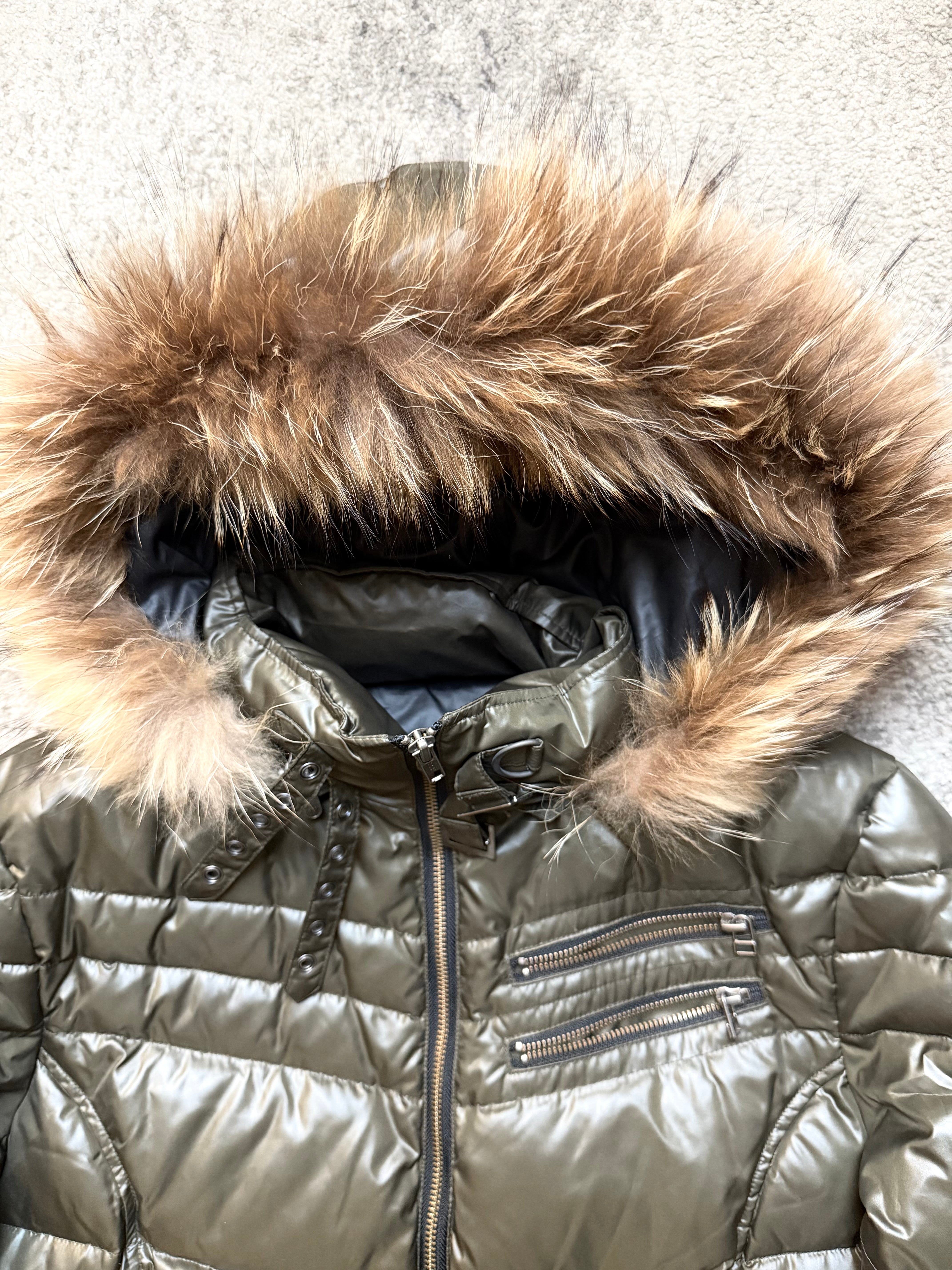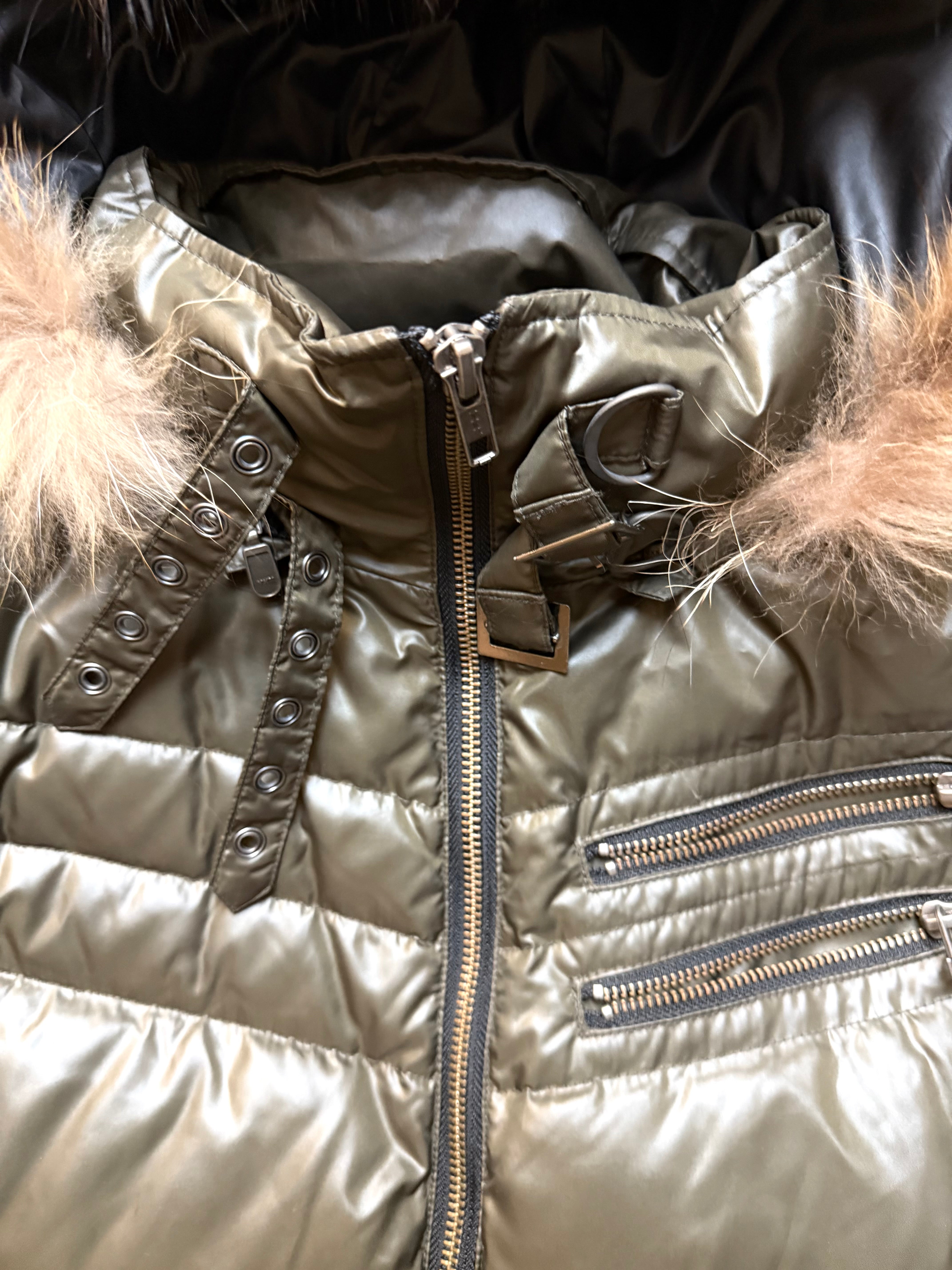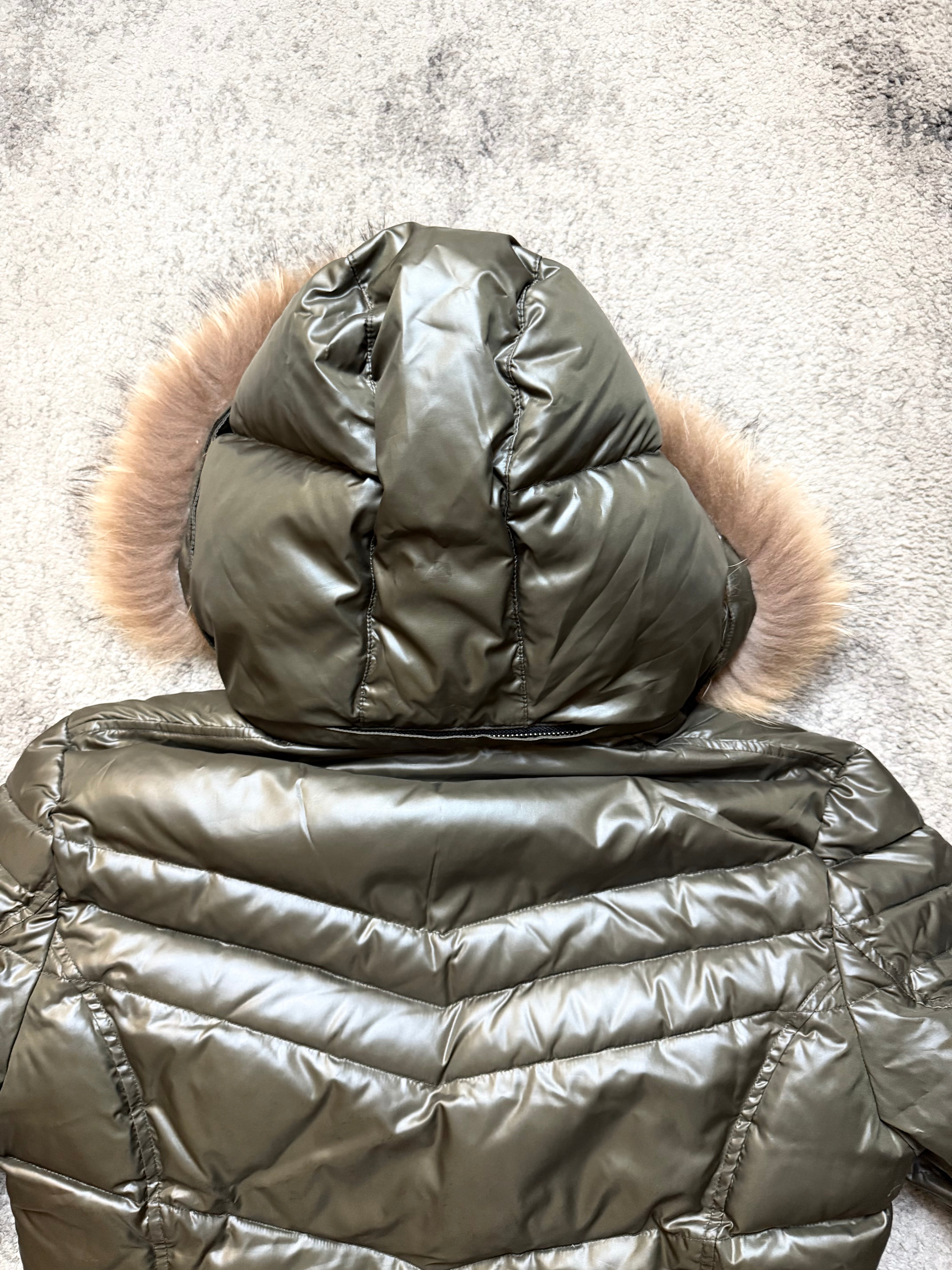 Excellent — minimal wear, pristine down loft, and fully intact hardware. The sheen of the fabric remains rich and even.