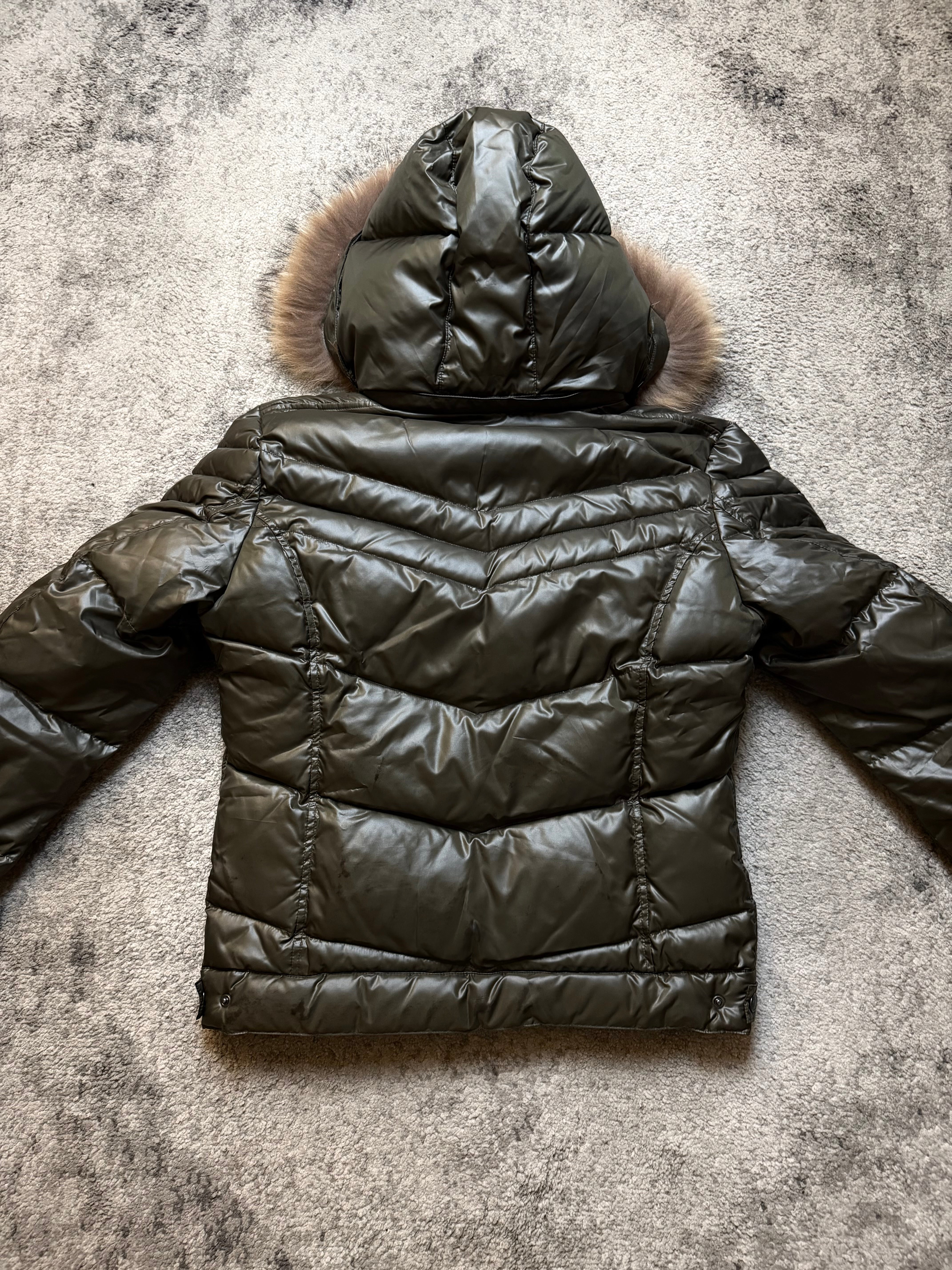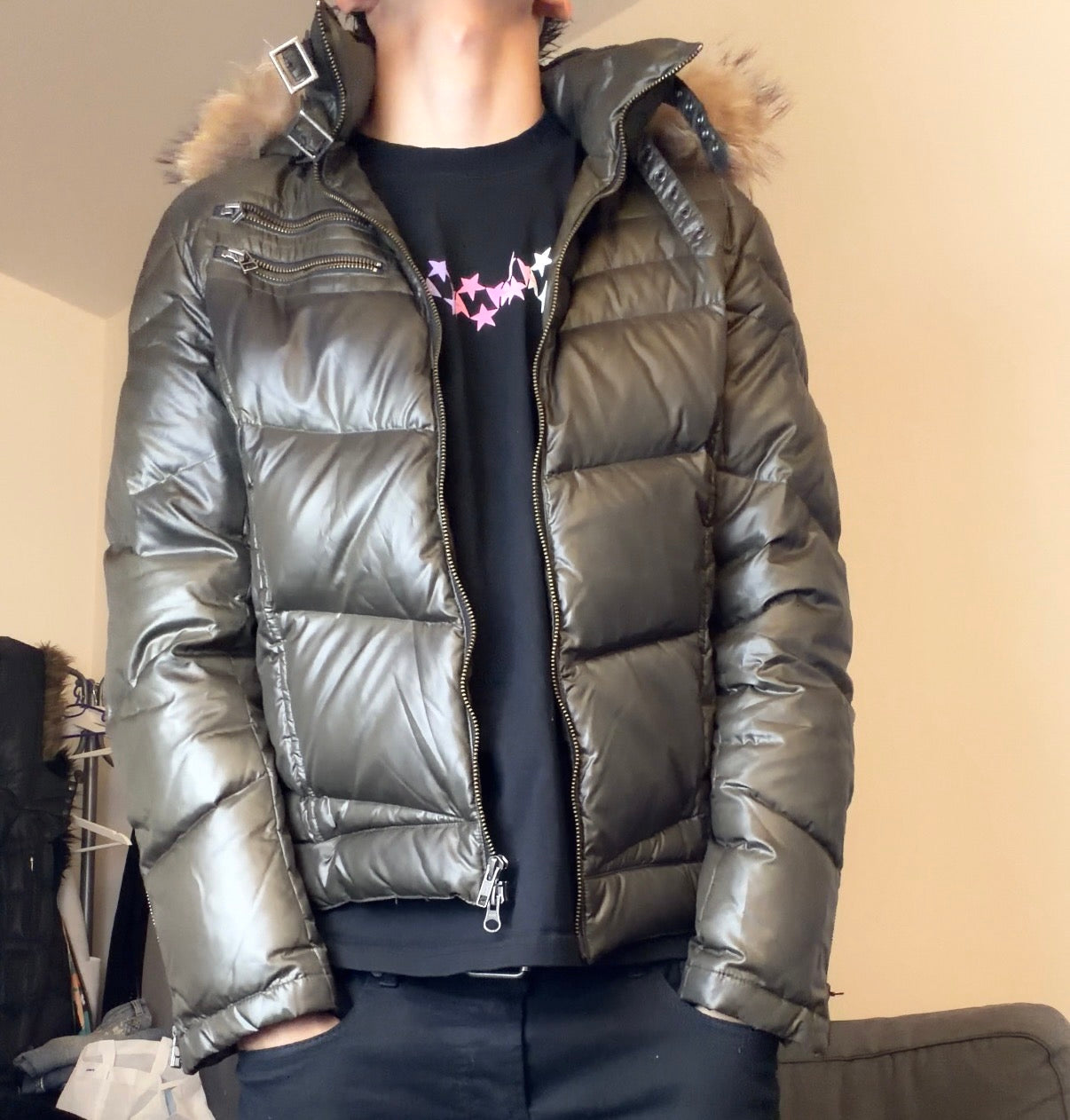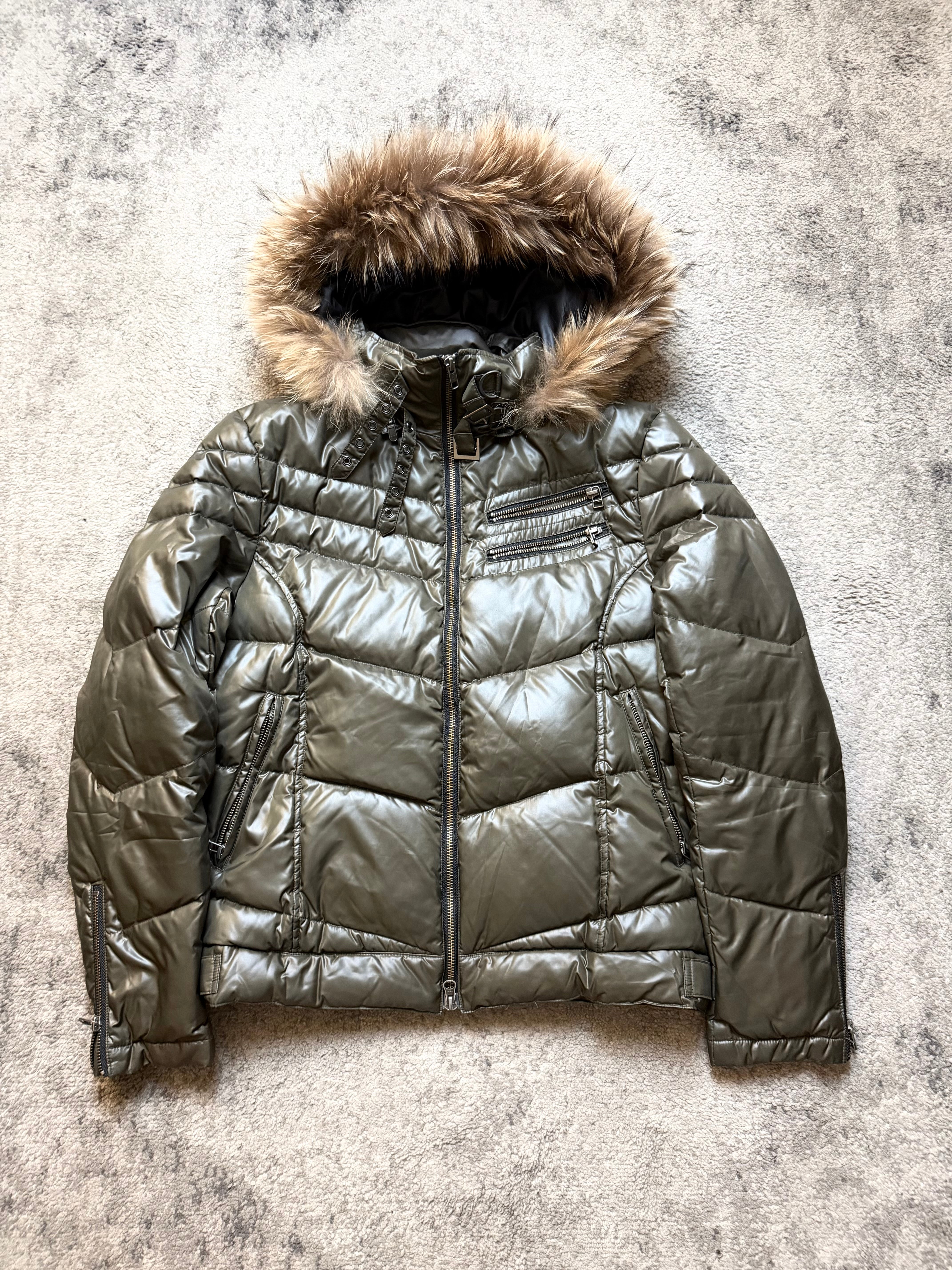 Made from a gloss-finished nylon shell, it features a structured down fill for volume and warmth. The detachable faux-fur hood adds a rugged edge, while the asymmetrical chest zip and biker-style collar buckle channel unmistakable Japanese archive attitude.