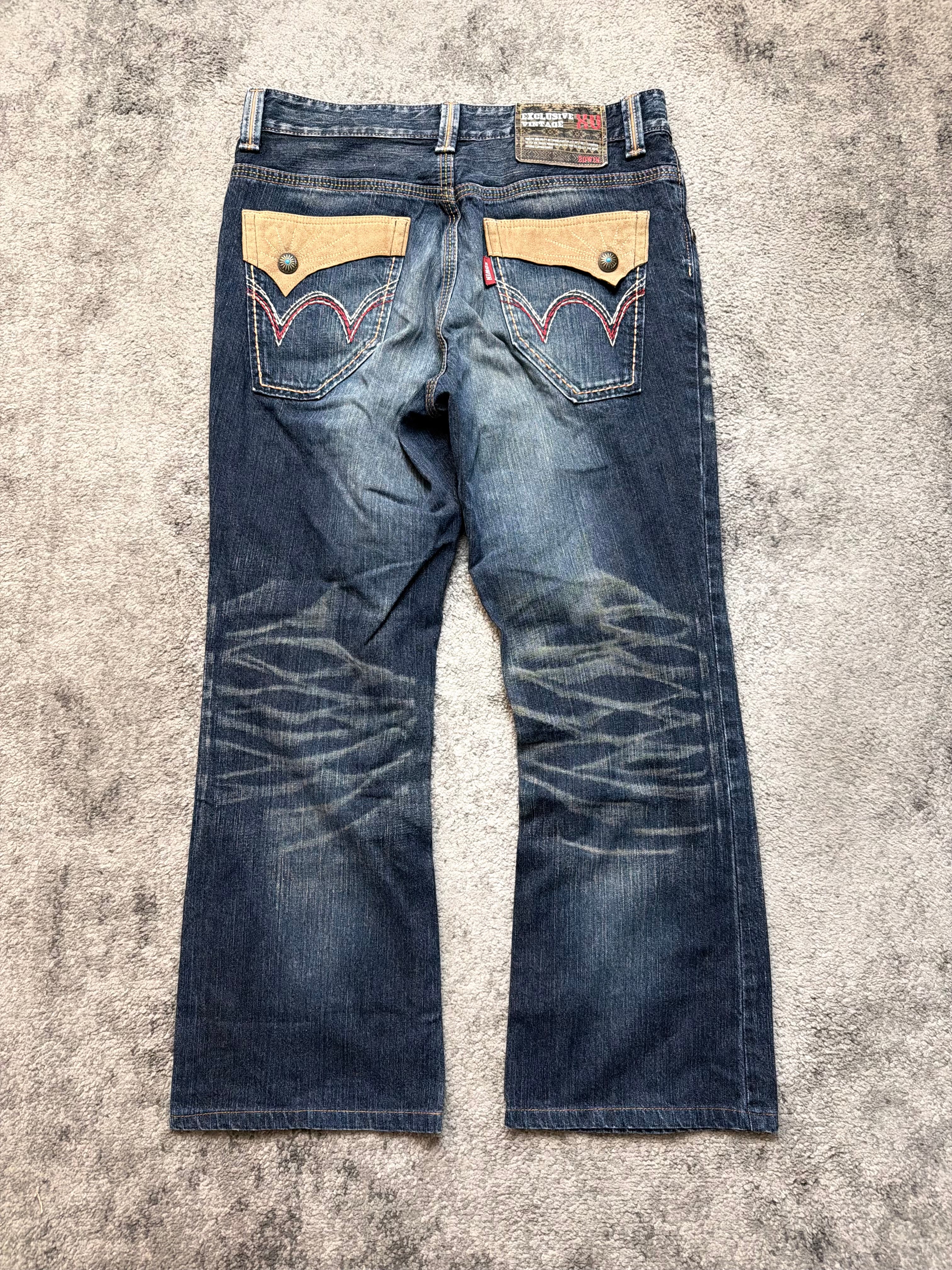Crafted from mid-weight Japanese cotton denim, this pair shows beautifully aged whiskering and a natural moon-shaped fade on the thighs — the kind of patina you only get from true wear, not factory shortcuts. The rear pockets feature EDWIN’s iconic contrast paneling with bold red stitching, giving it that rebellious, handcrafted feel typical of late-90s/early-2000s Japanese street couture.