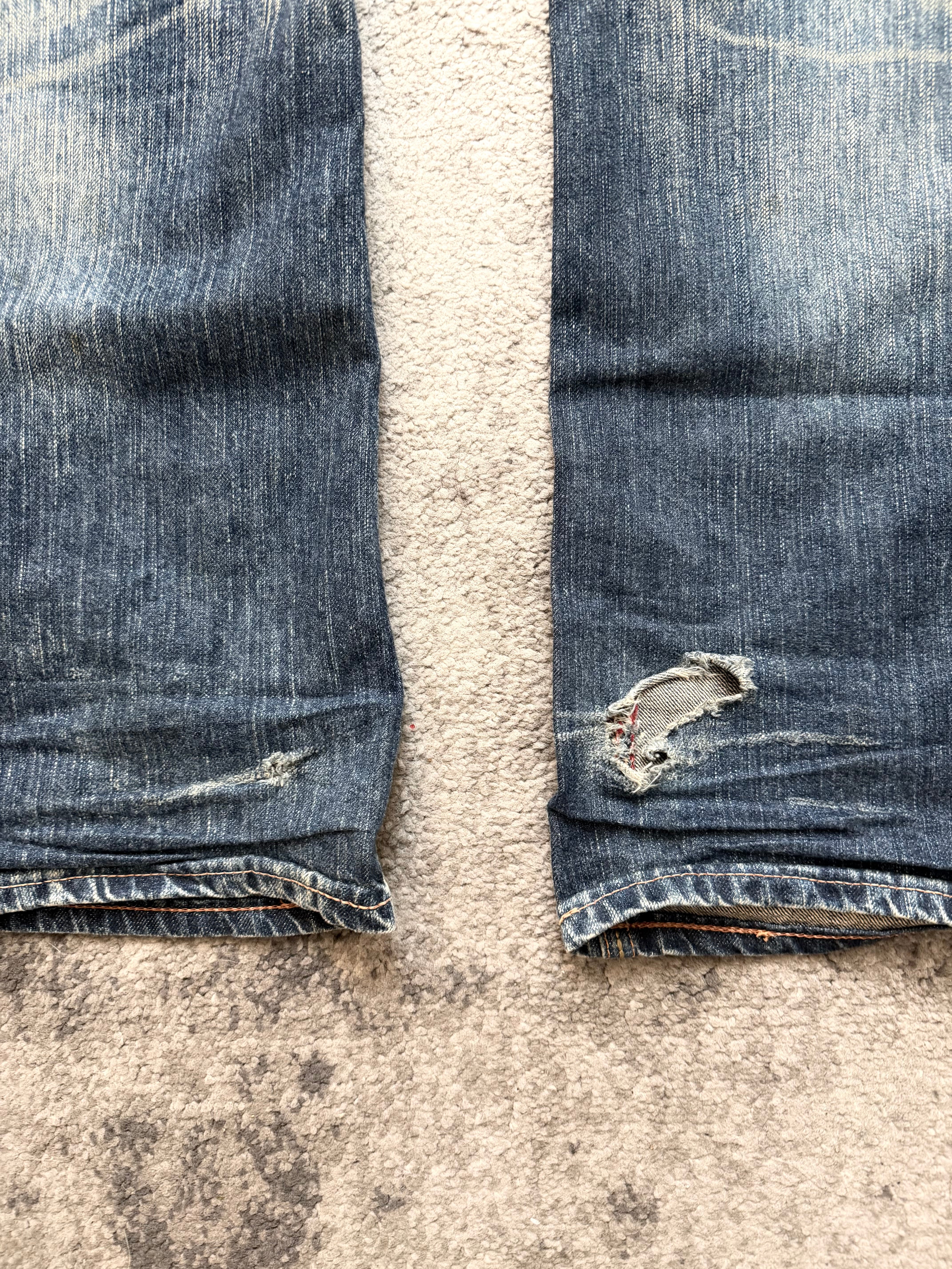 A pair of true Japanese archive denim—faded, worn-in, and carrying that raw, emotional edge only old-school EDWIN can deliver. This M-size model comes in a beautifully aged indigo with strong whiskering, deep knee fades, and rear honeycombs that feel straight out of early 2000s Harajuku street archives.