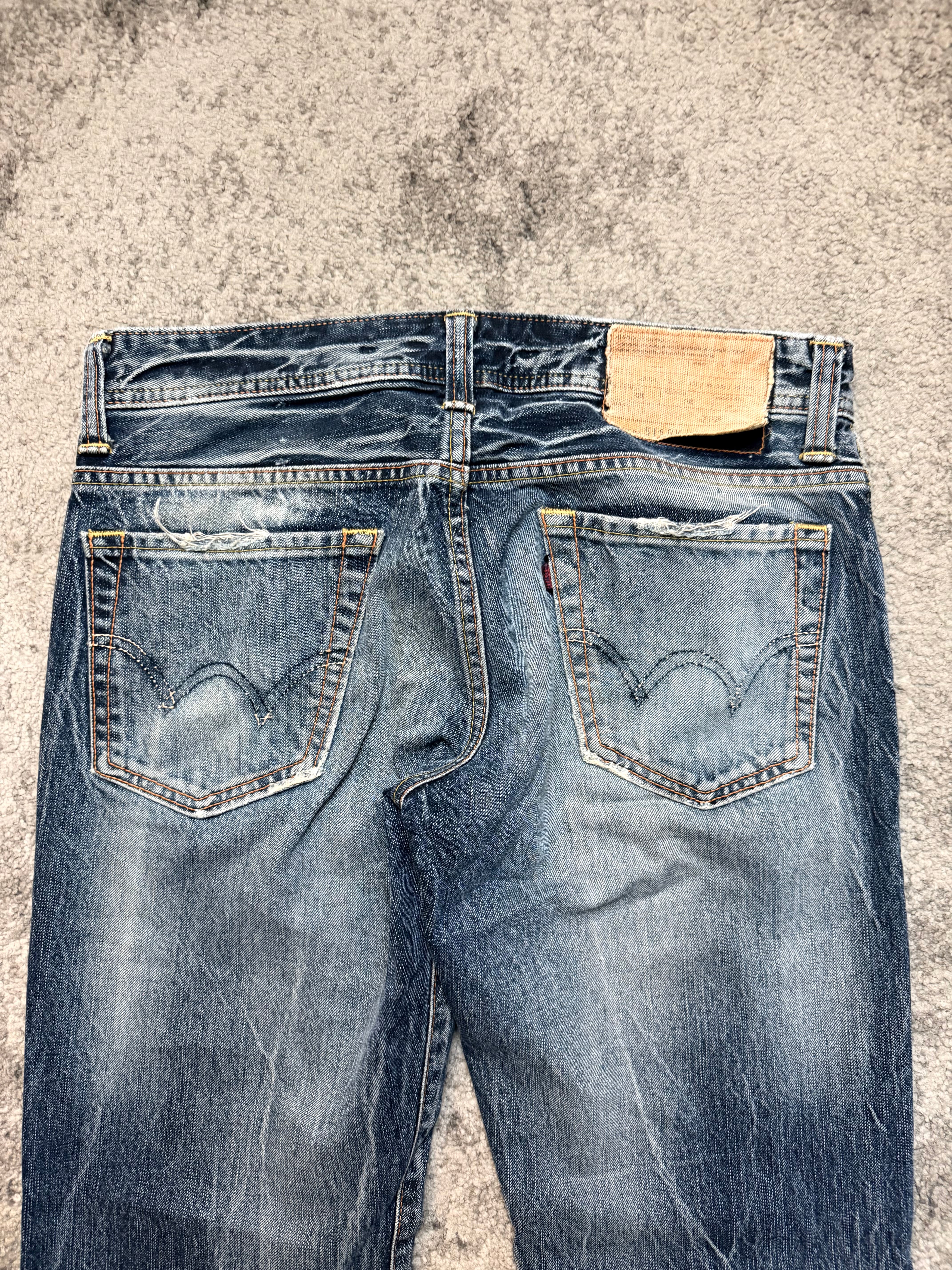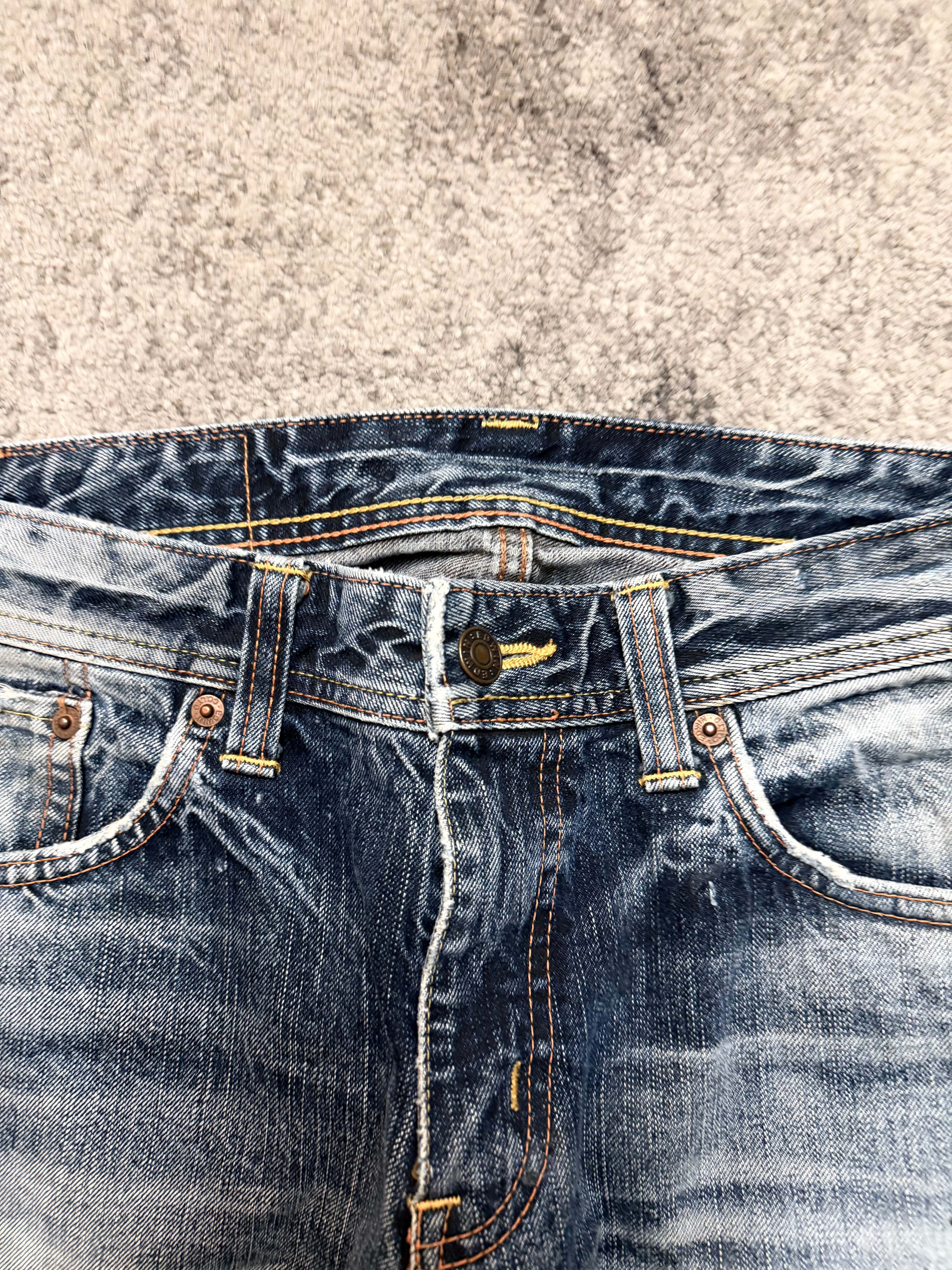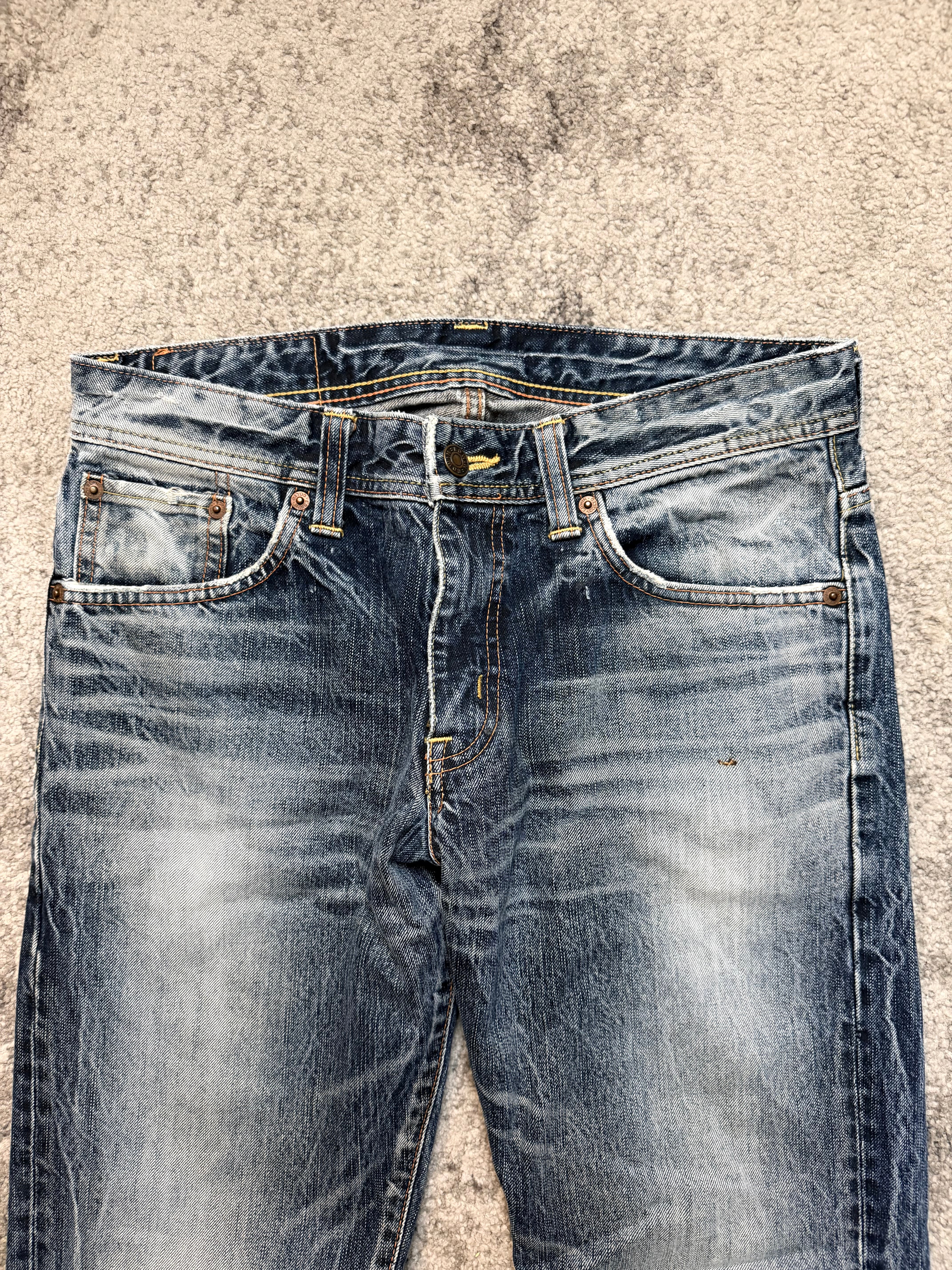 Pre-loved with heavy fading and natural whiskering. Subtle fraying at hems and authentic wear throughout – the kind of aging you can’t fake.
