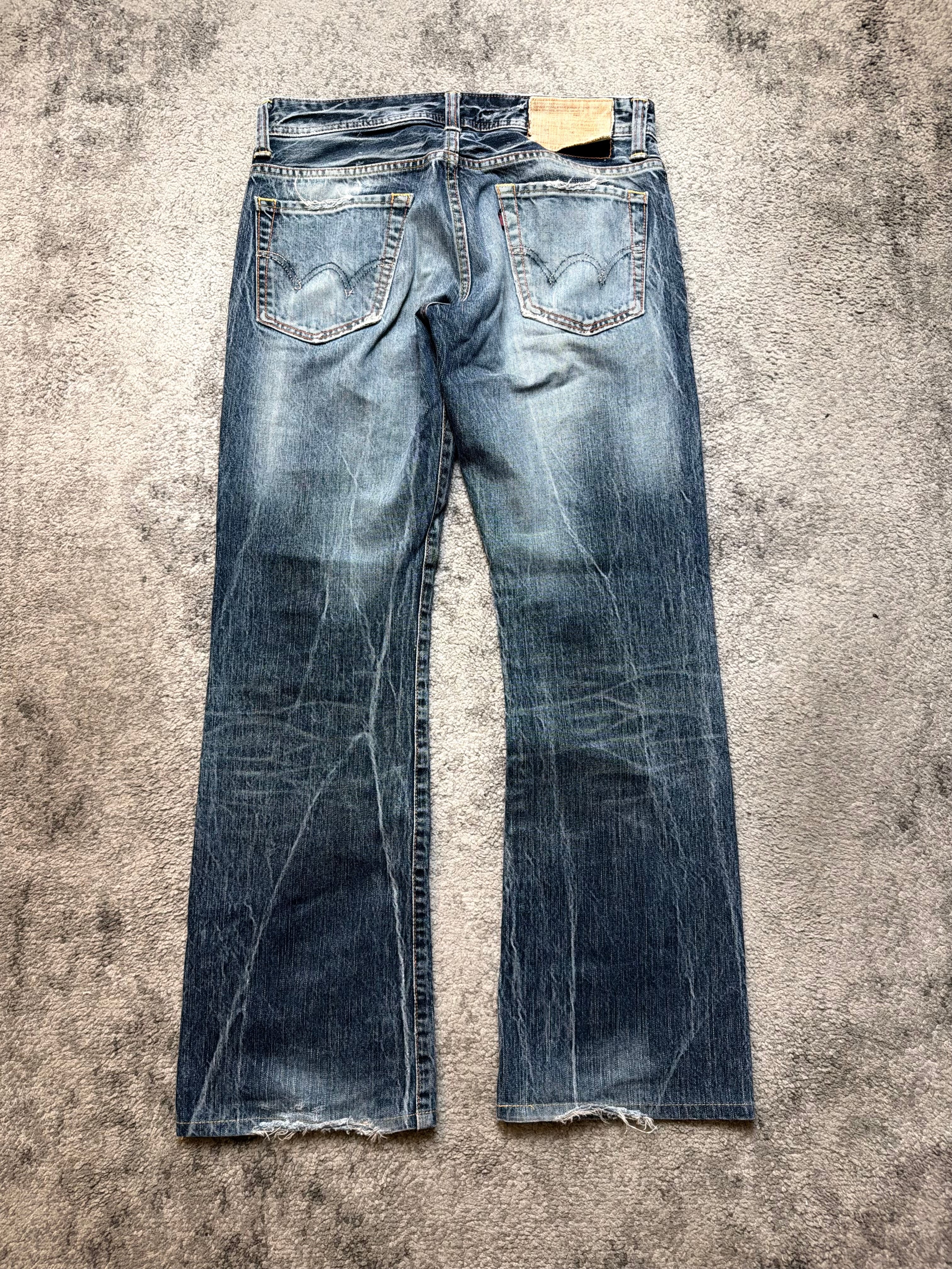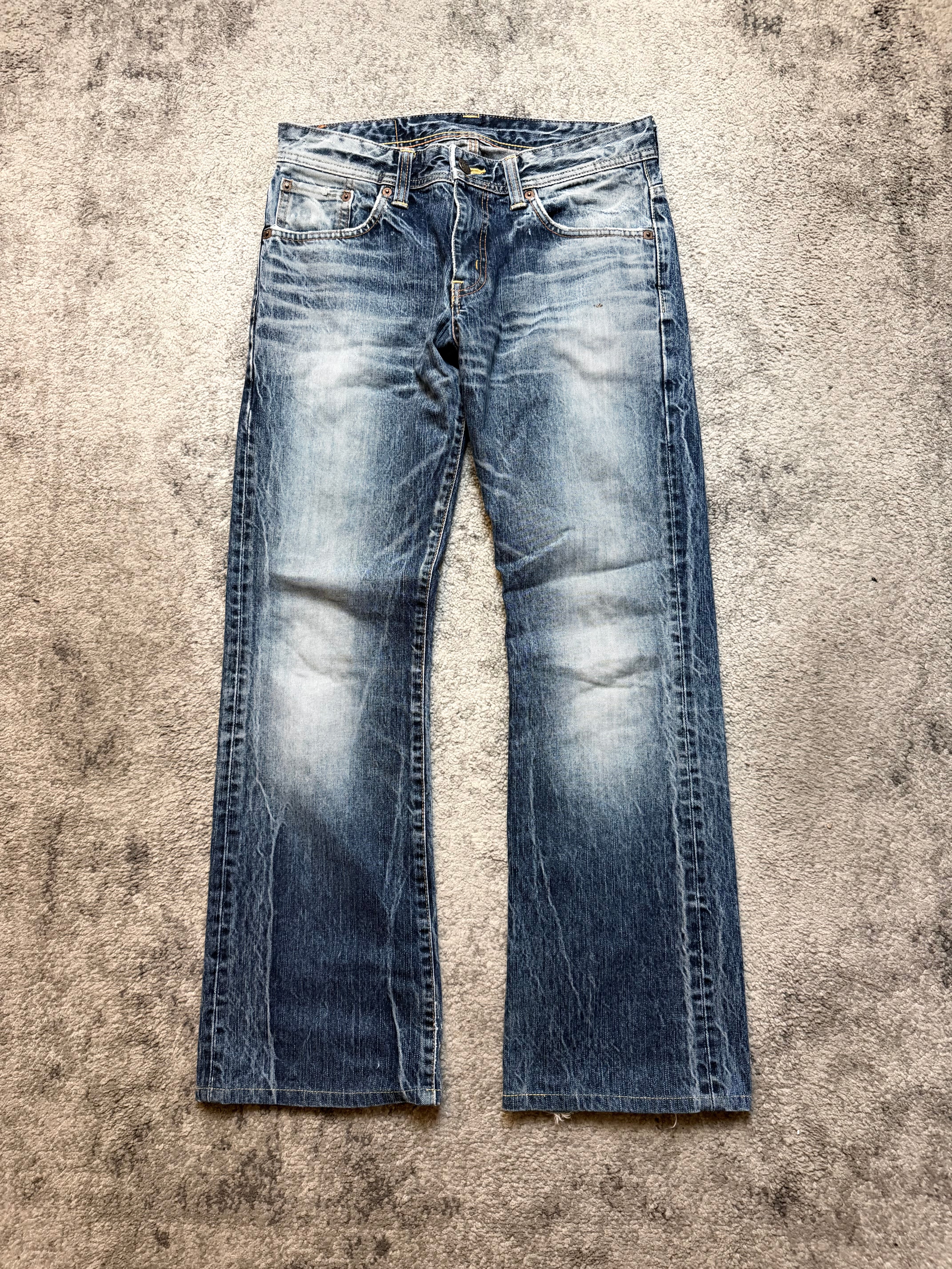 Straight silhouette with a slight flare attitude – the classic Tokyo street cut. Ice-blue vintage fade with deep contrasts makes them feel lifted straight from an early-2000s Shibuya backstage photo. Moves effortlessly between host-core glam and archive minimal chaos.