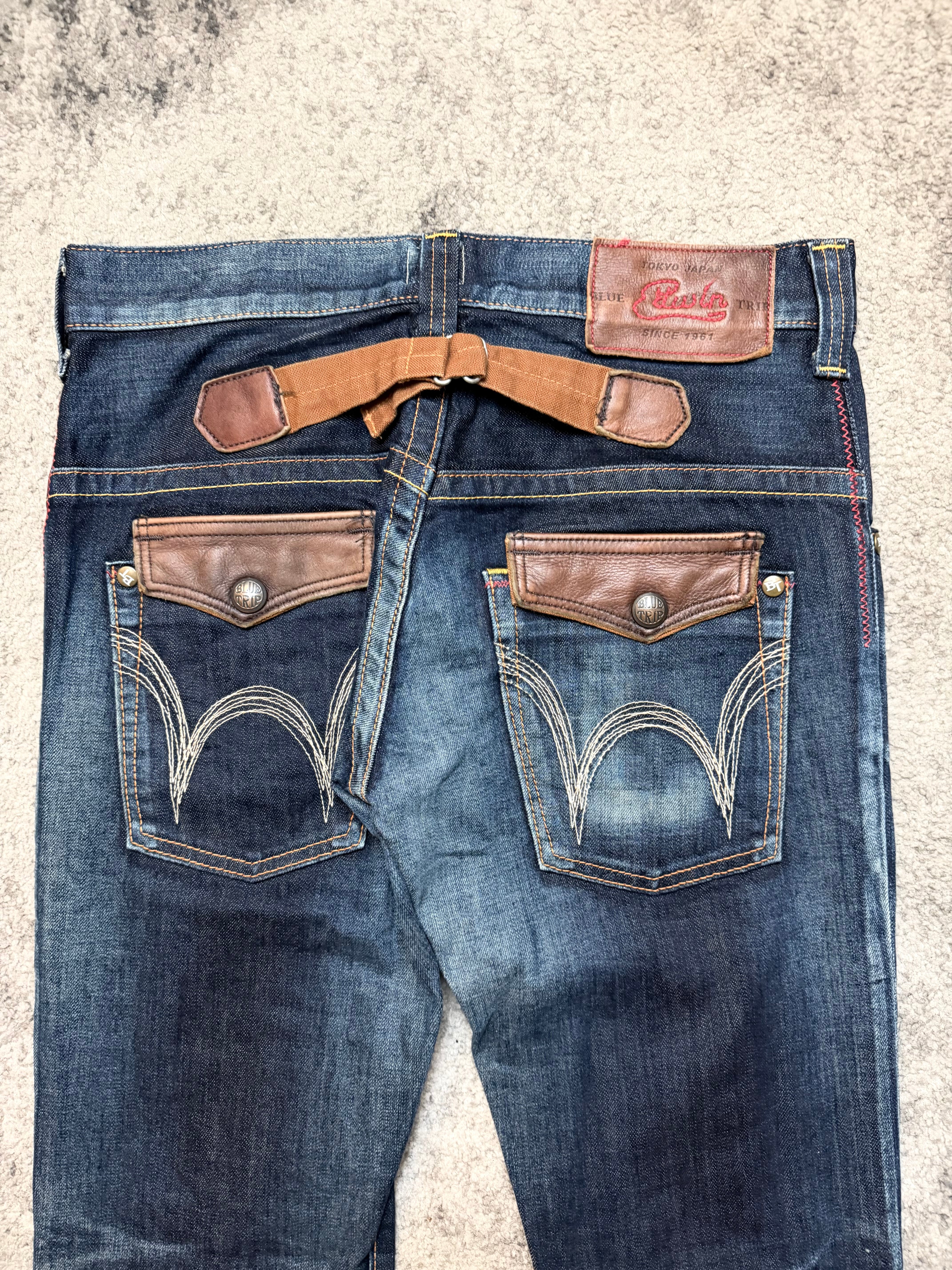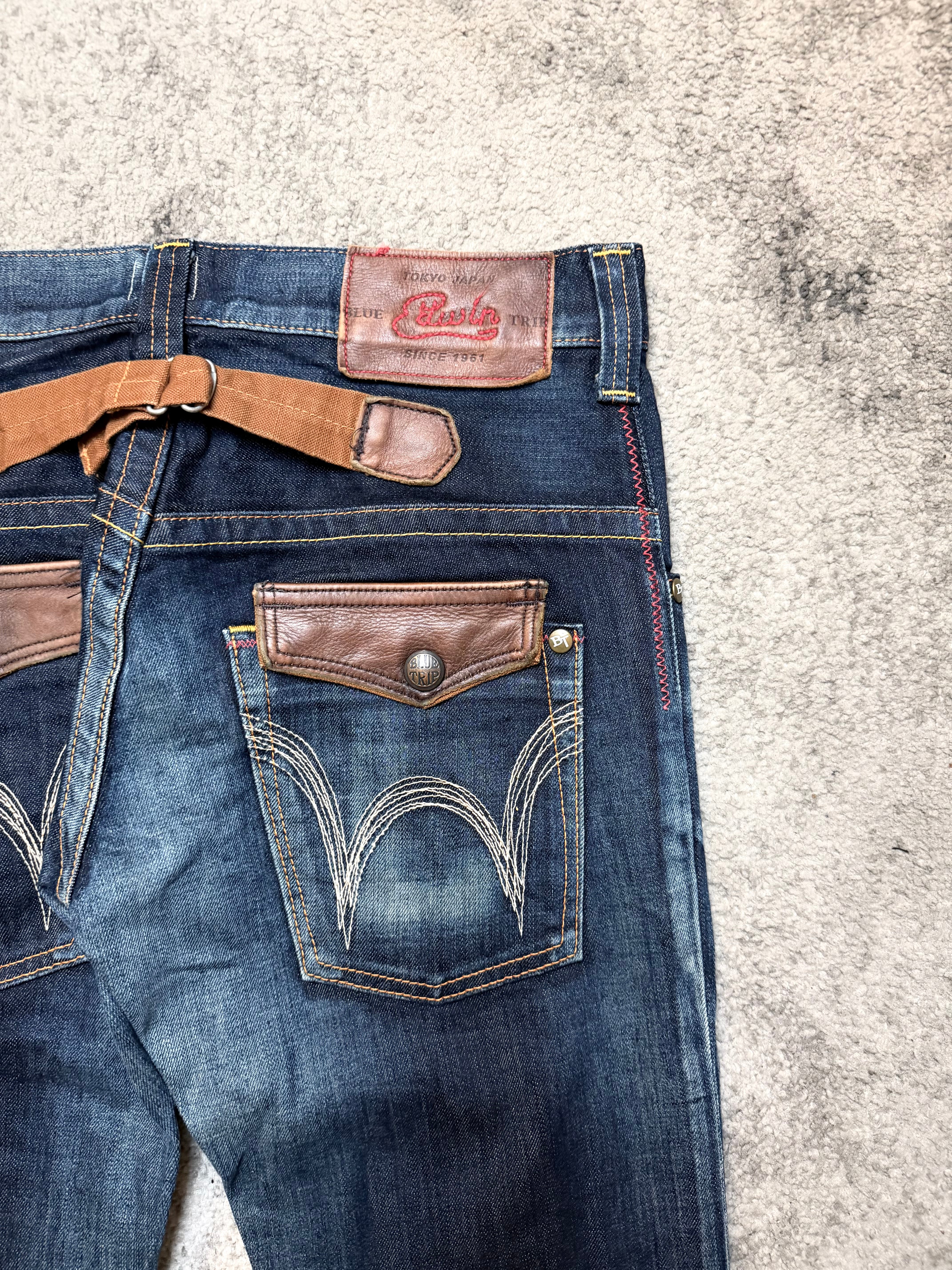 Signature BLUETRIP leather tab-belt detail on the back—rare and boldly Japanese