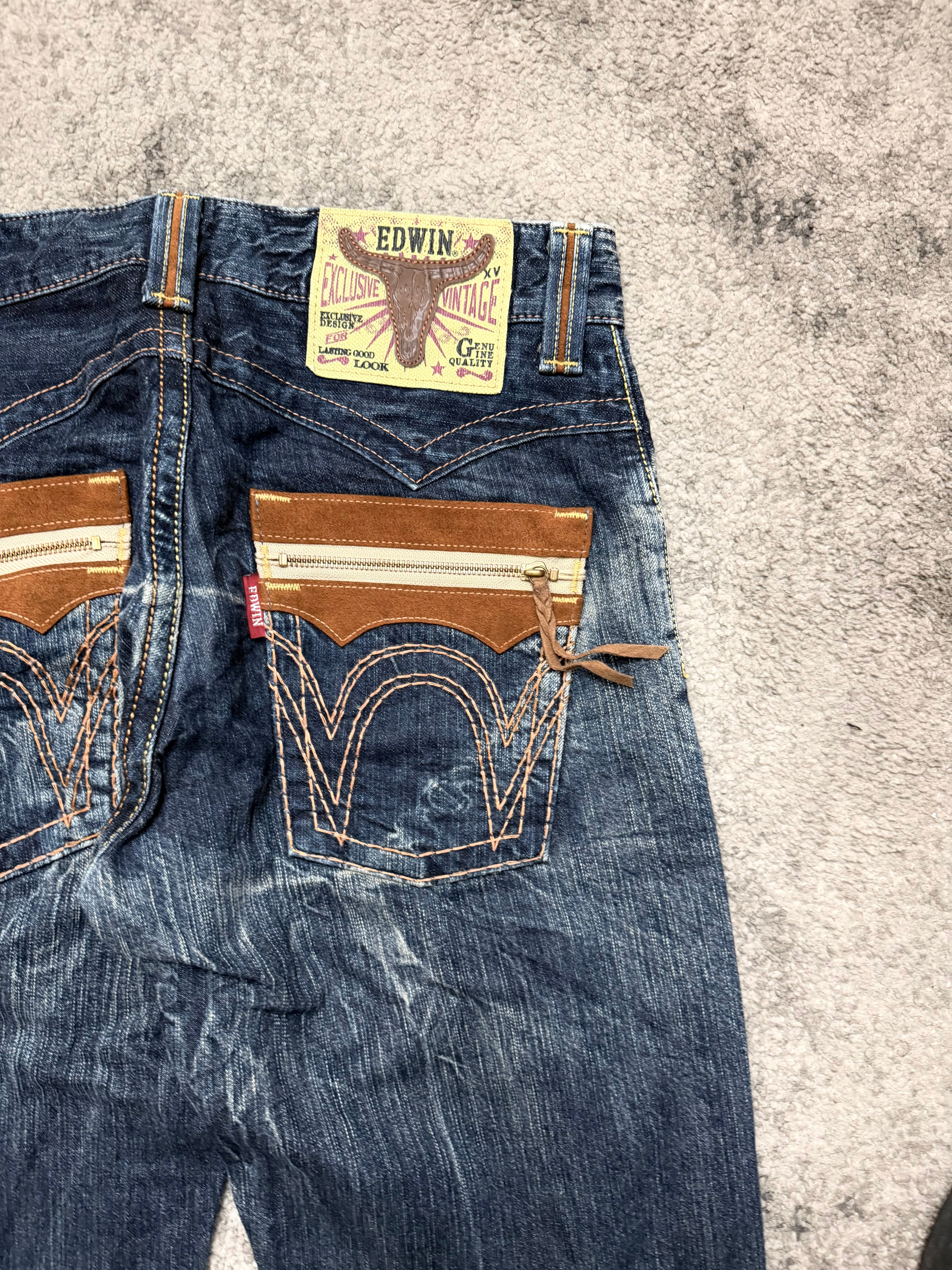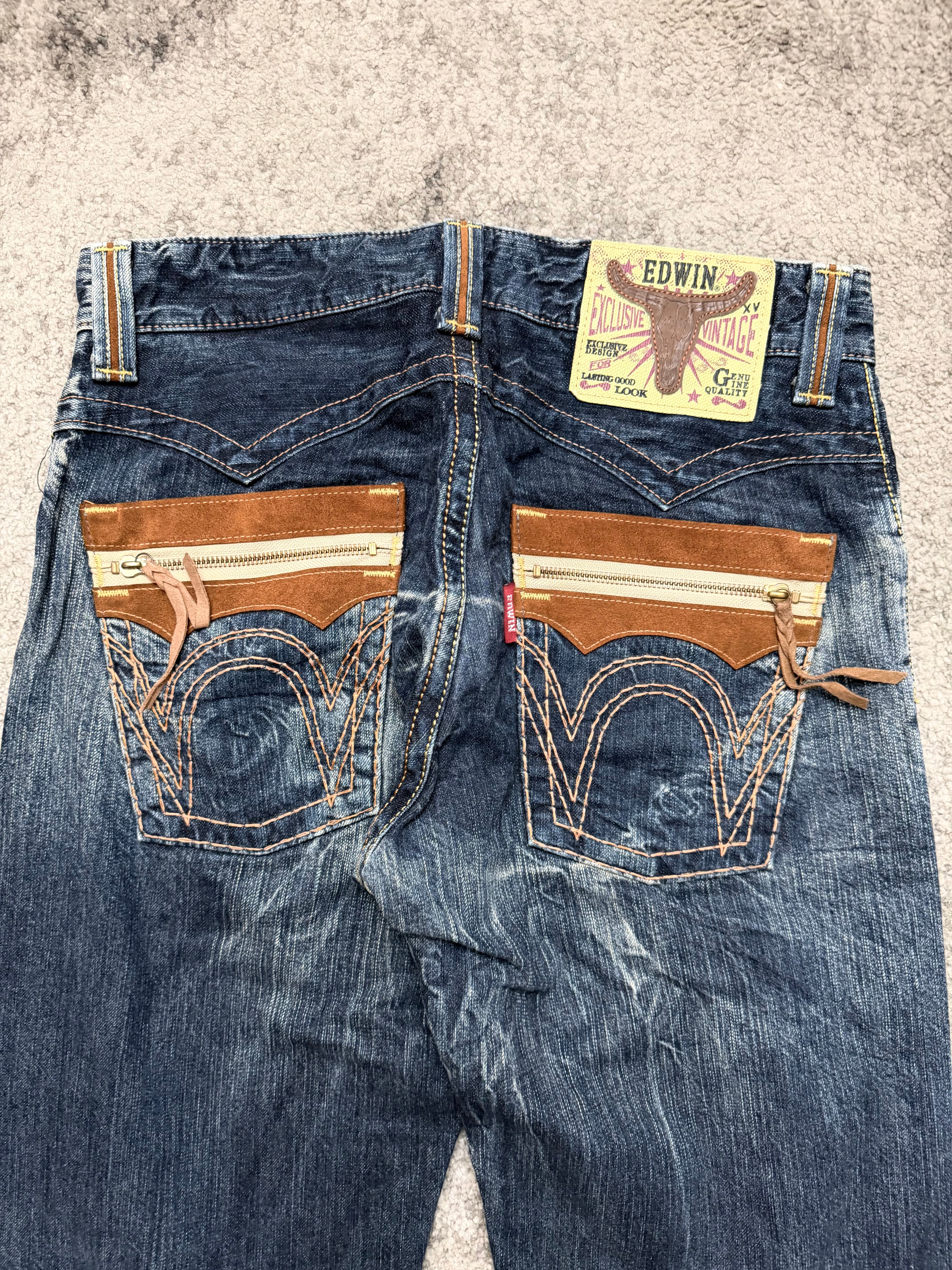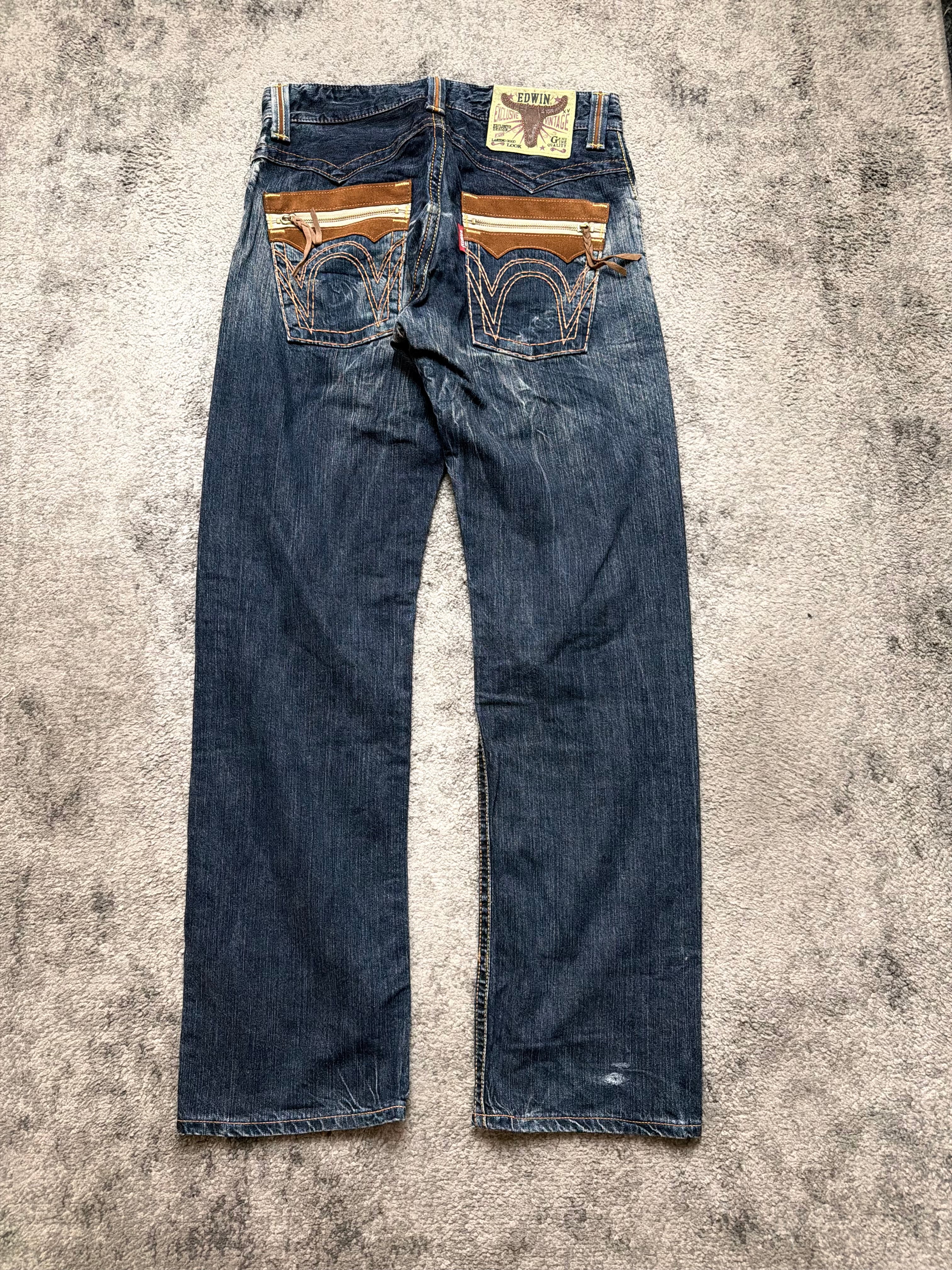 Straight-leg silhouette with vintage EDWIN energy. Warm brown suede pocket details on the front and those signature curved back pockets – a quiet flex for anyone who studies old Tokyo street snaps. The kind of denim that works with beat-up boots, layered knits, or a distressed leather jacket.