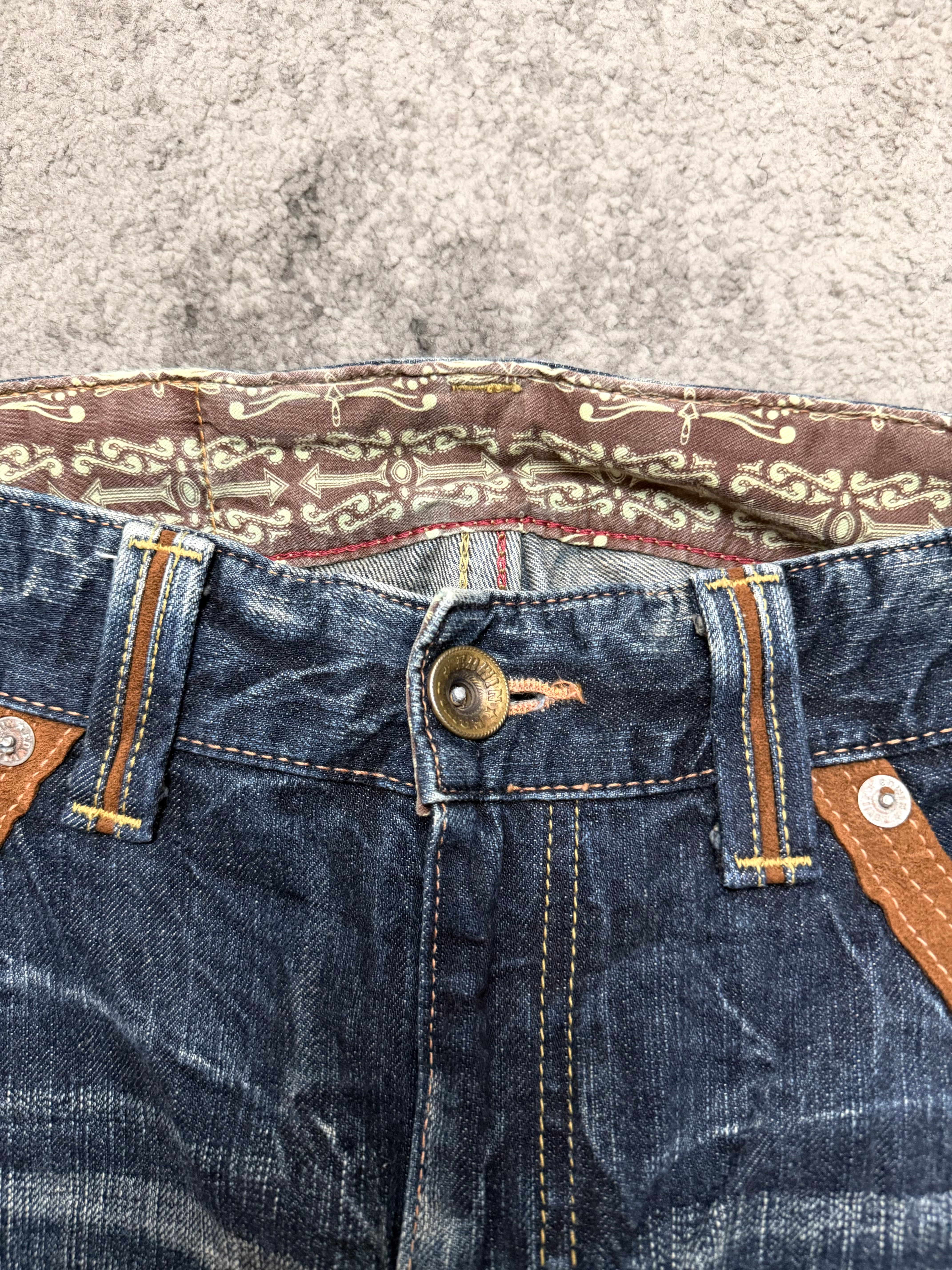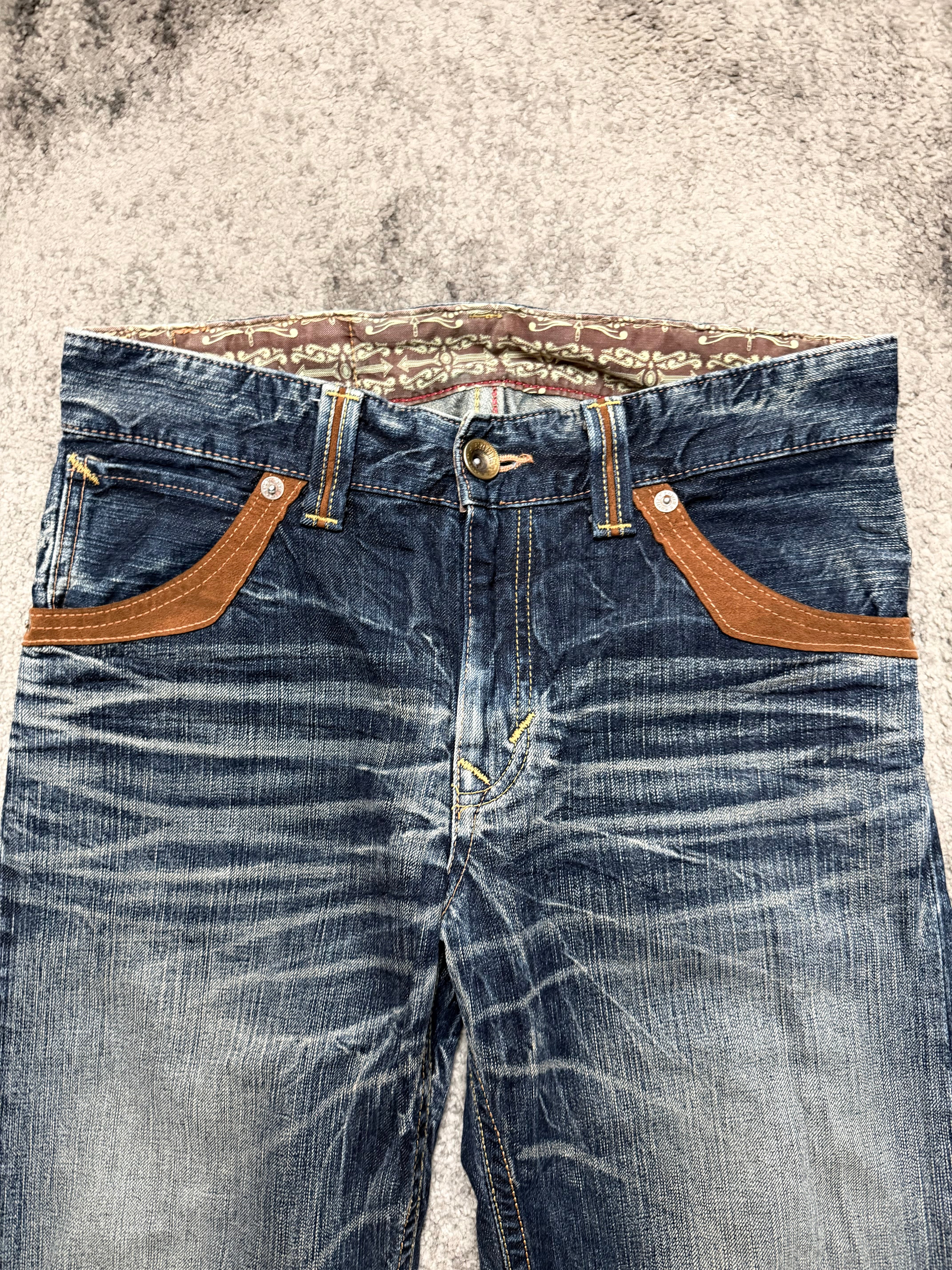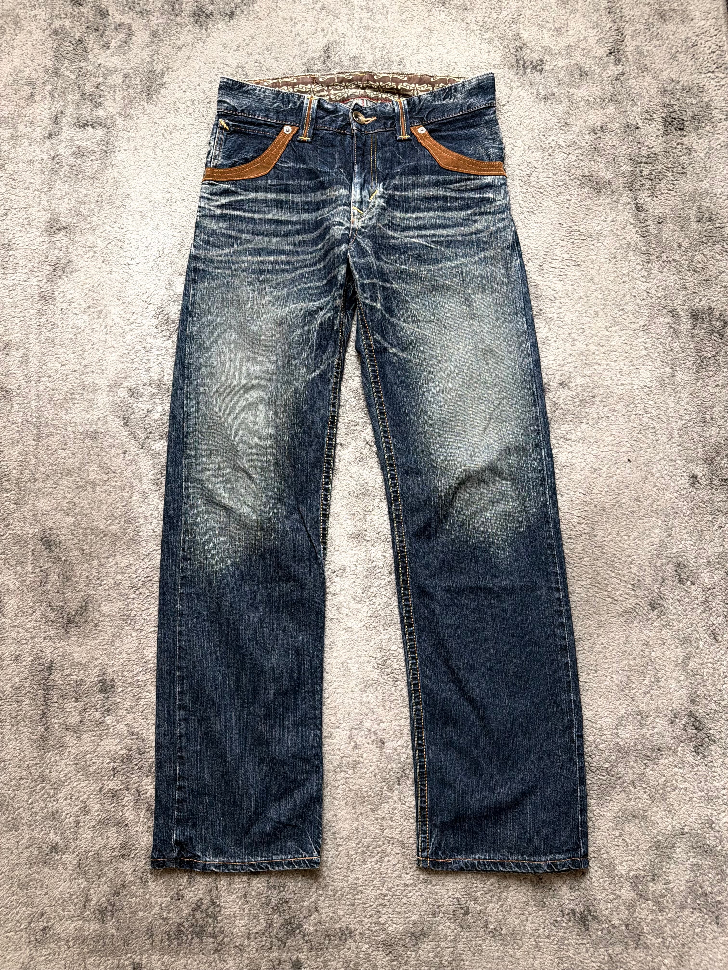 Straight-leg silhouette with vintage EDWIN energy. Warm brown suede pocket details on the front and those signature curved back pockets – a quiet flex for anyone who studies old Tokyo street snaps. The kind of denim that works with beat-up boots, layered knits, or a distressed leather jacket.