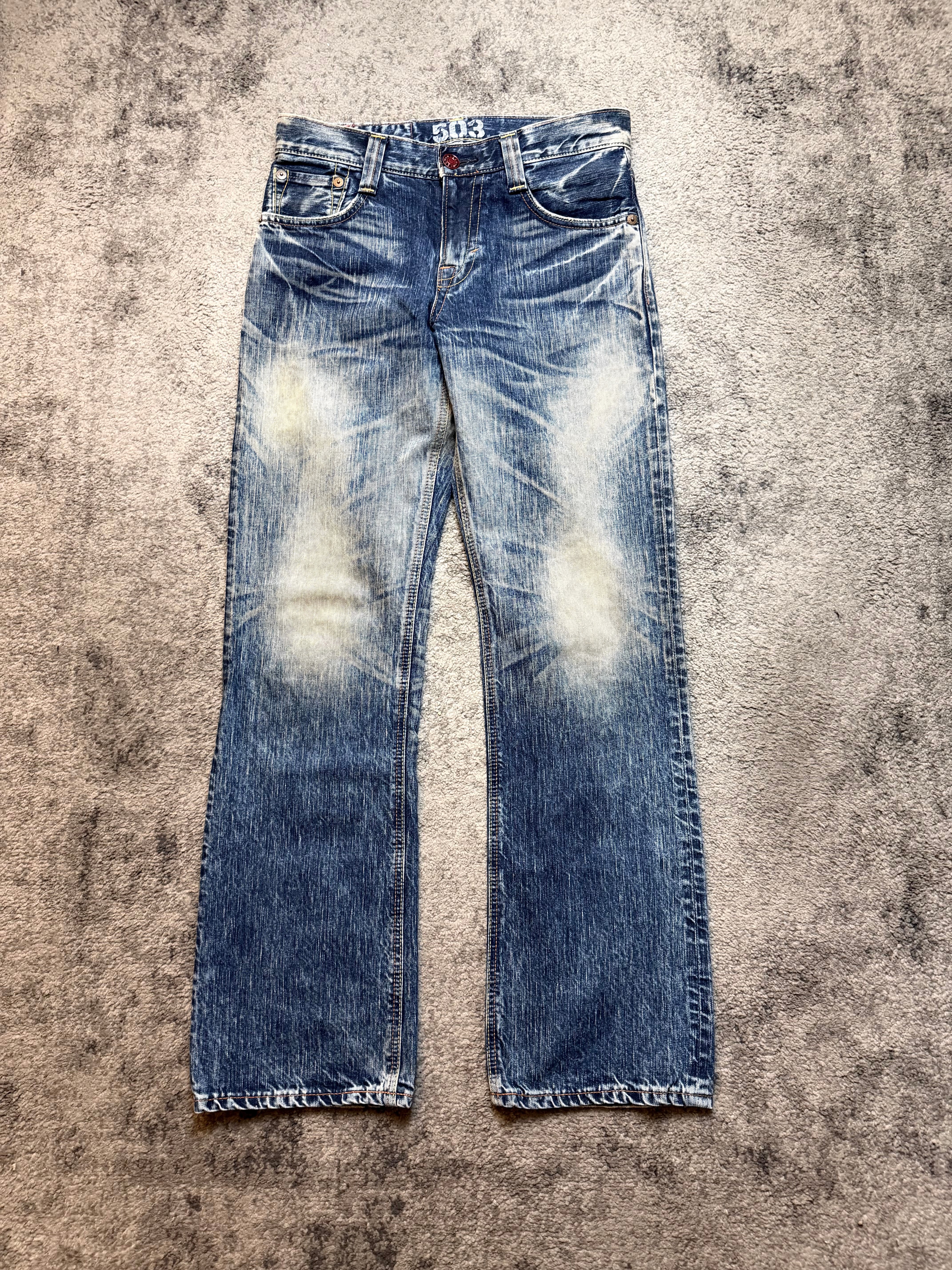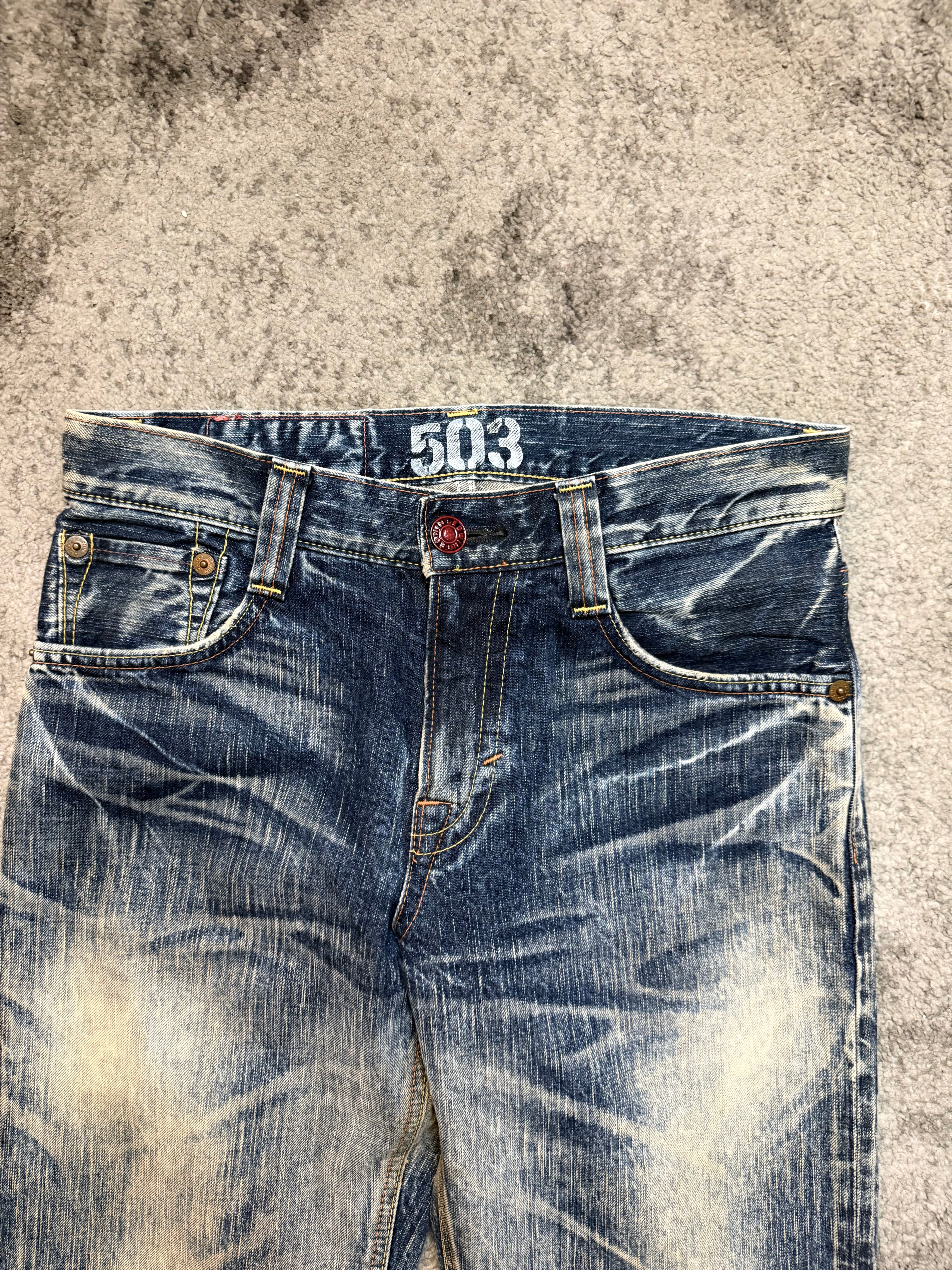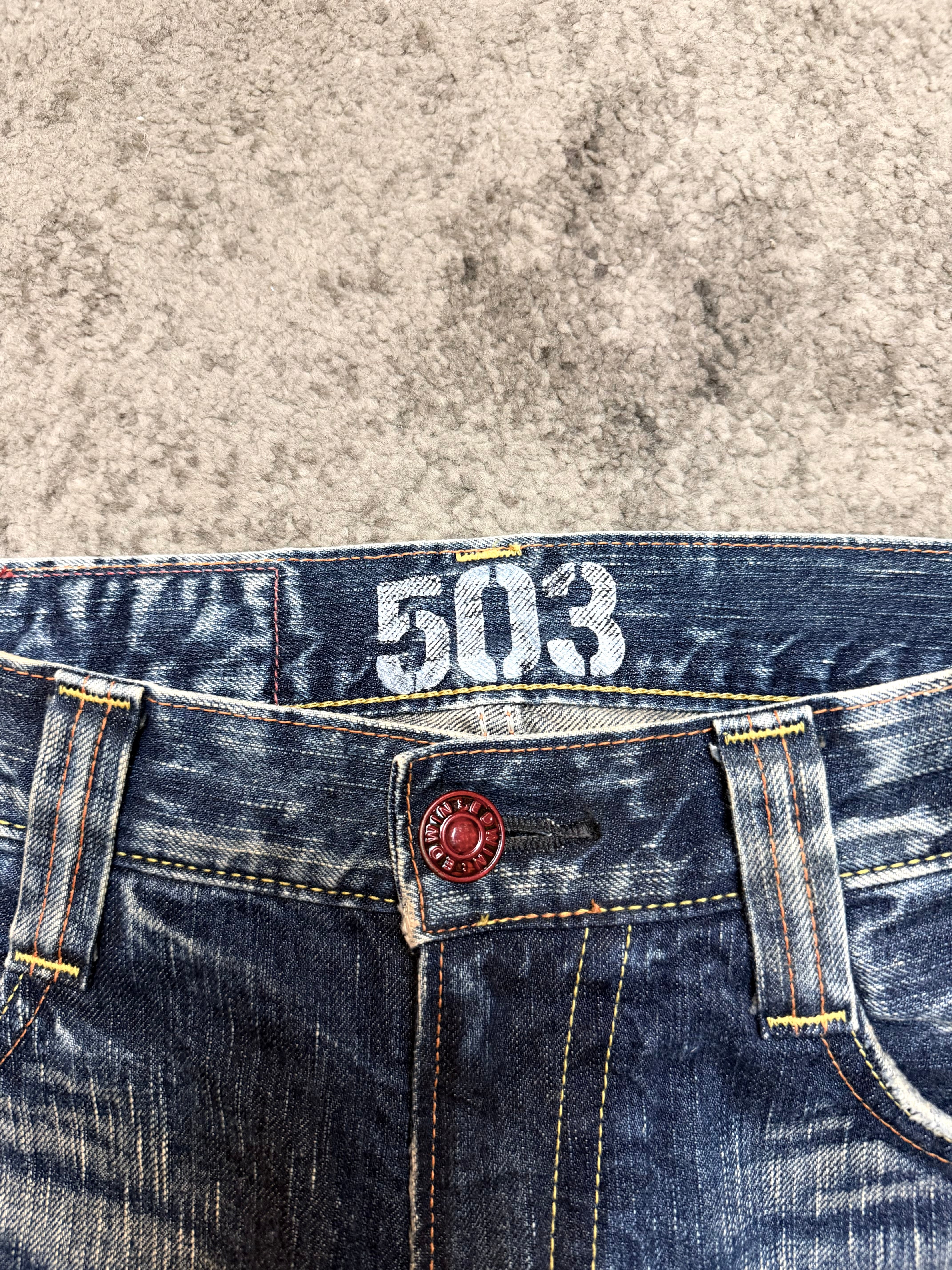 A pair carved straight out of early-2000s Shibuya grit – loud fades, road-rash texture, and that unmistakable Japanese archive swagger. These jeans don’t just look lived-in; they feel like a story already mid-chapter.