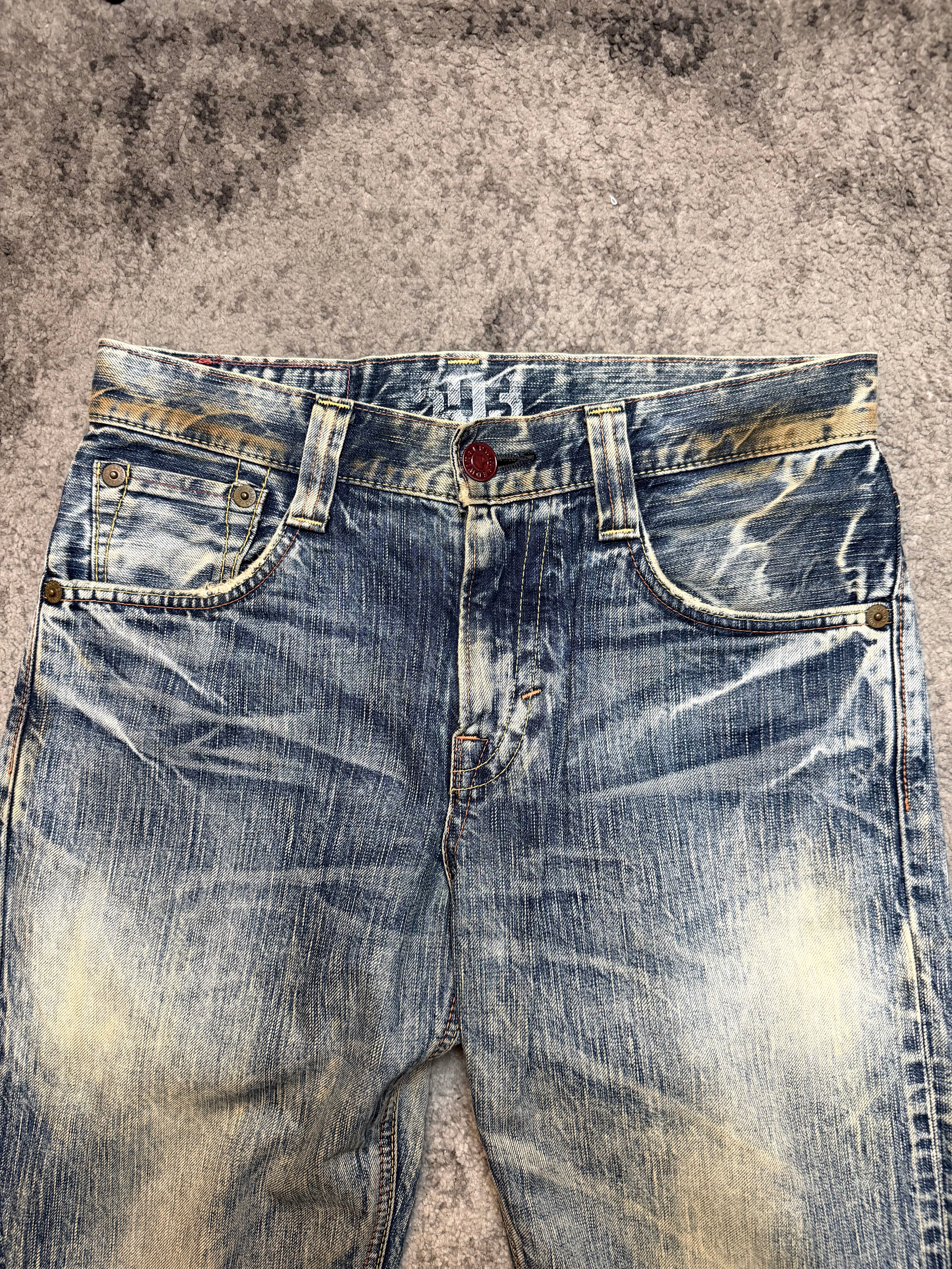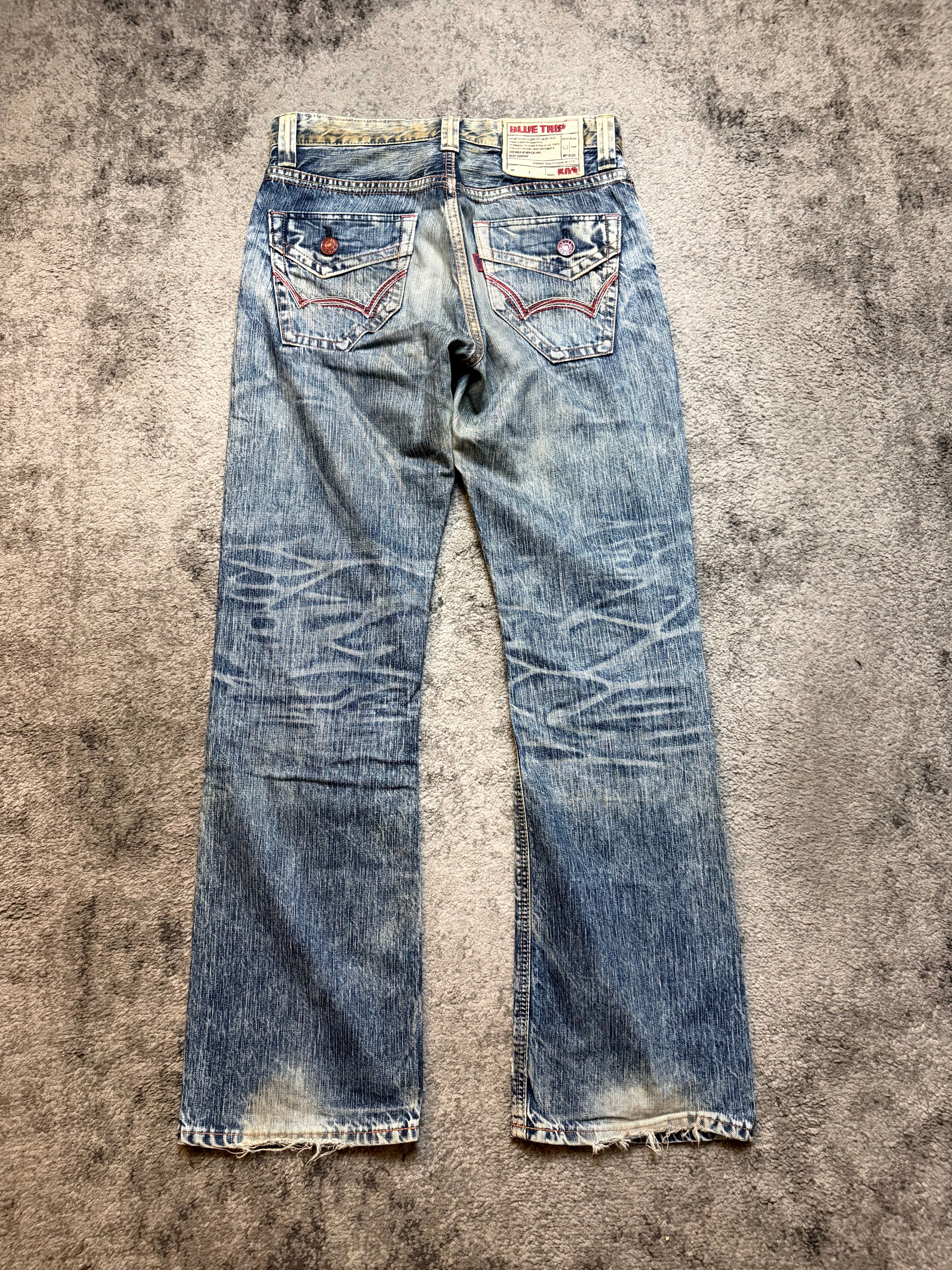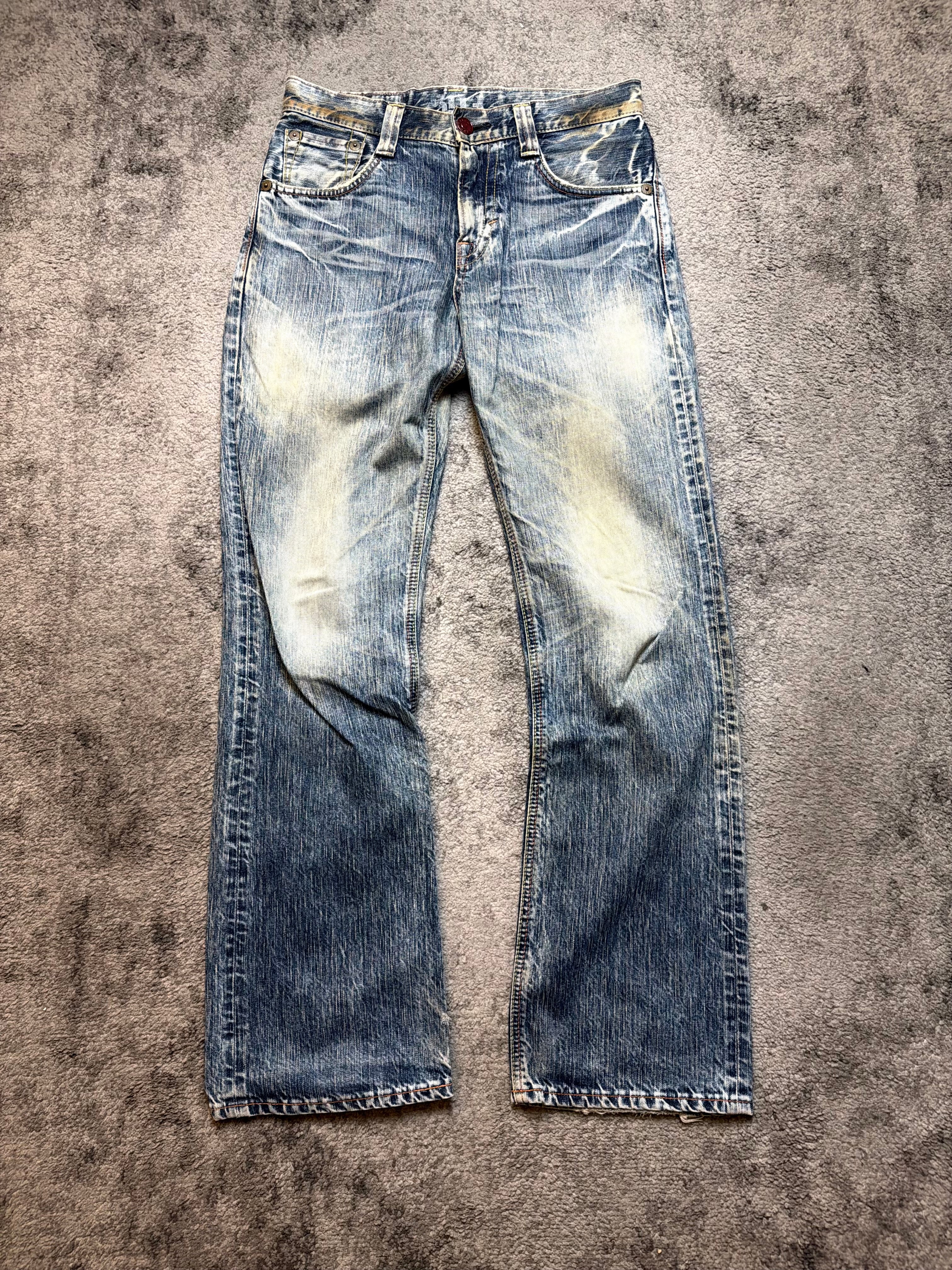 A pair straight out of a lost early-2000s Japanese archive—loud whiskers, gritty fades, raw hems, and that unmistakable back-pocket drama. Denim built for nights that run too long and mornings that come too fast.