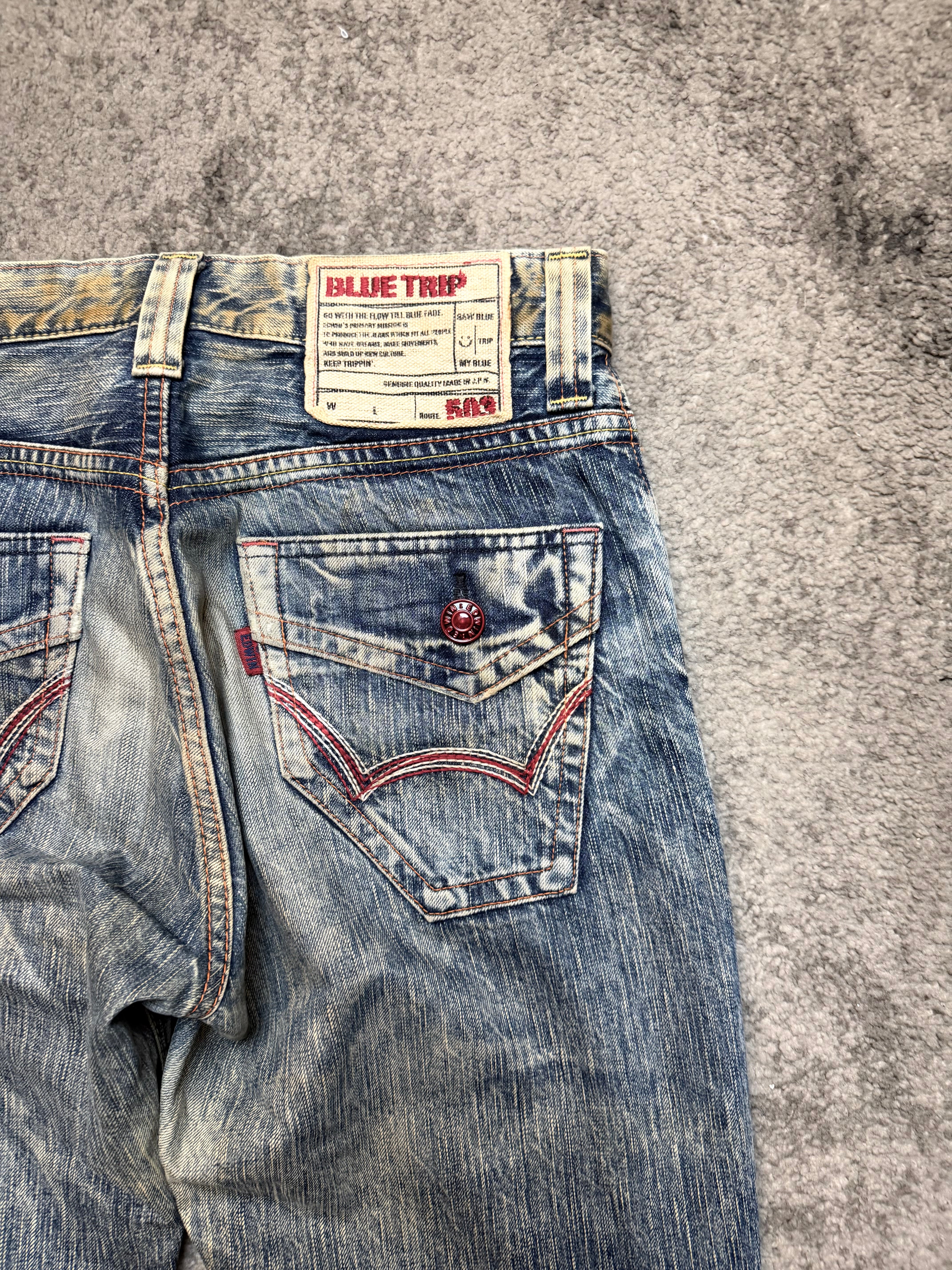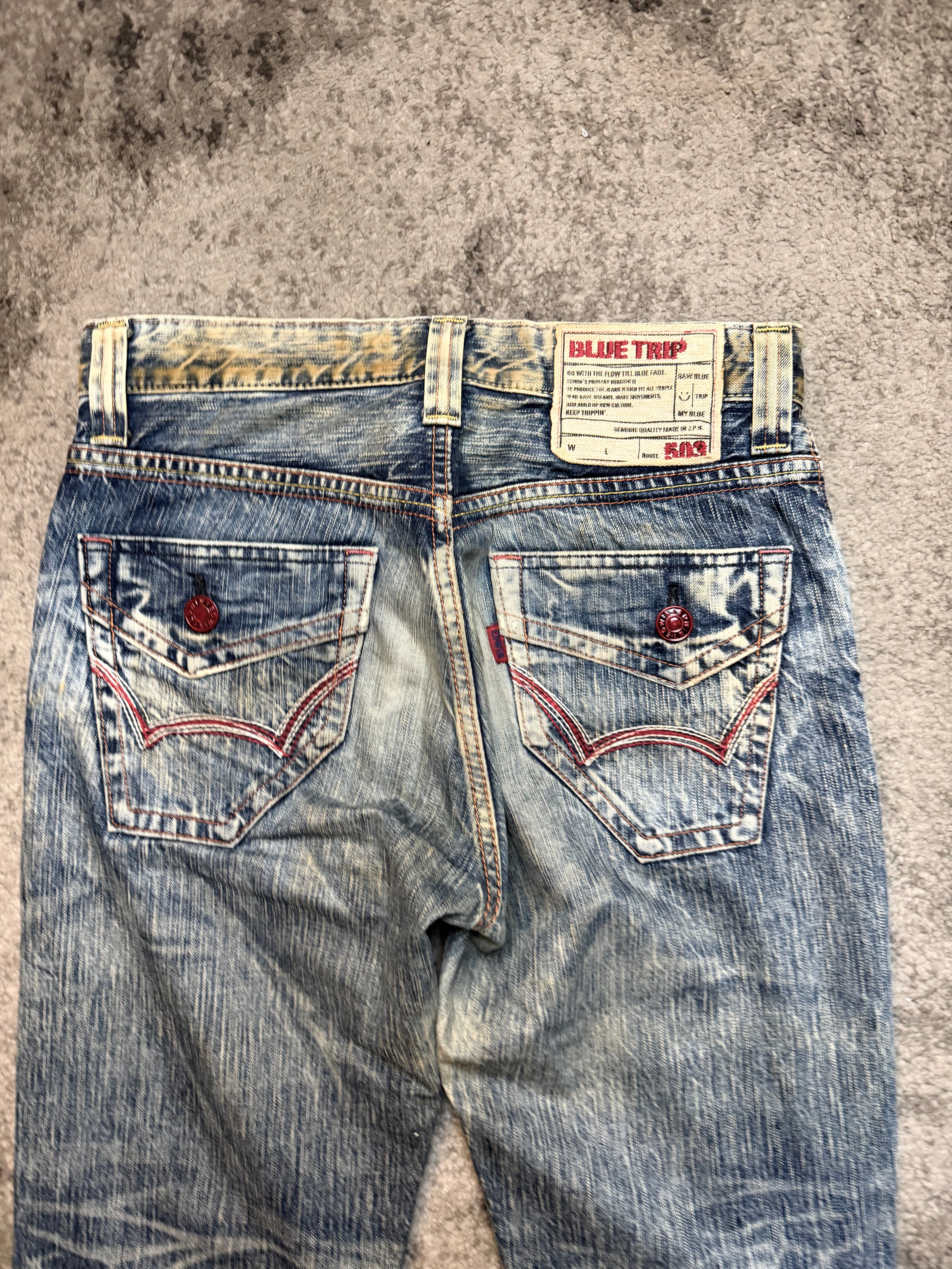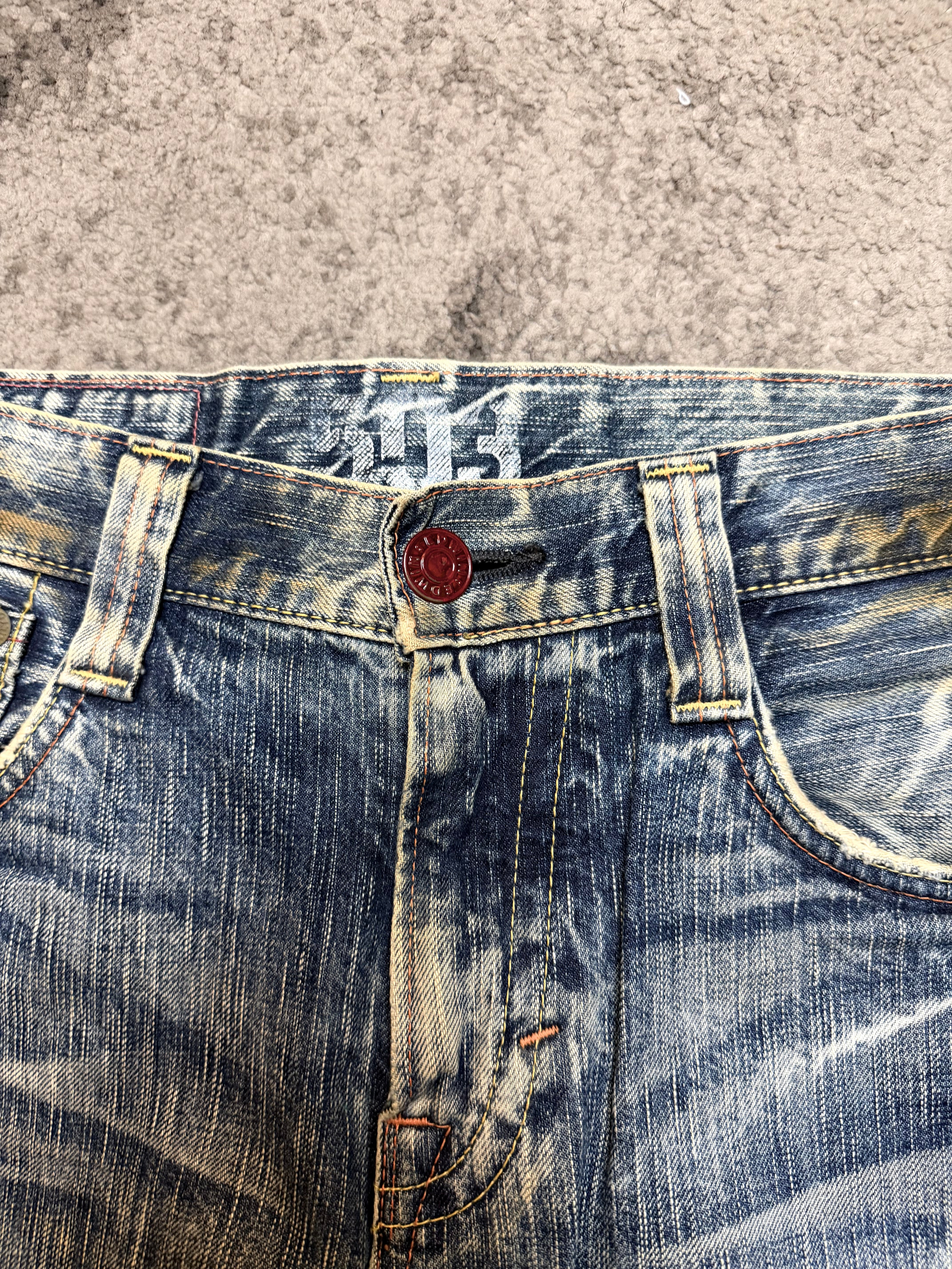 A pair straight out of a lost early-2000s Japanese archive—loud whiskers, gritty fades, raw hems, and that unmistakable back-pocket drama. Denim built for nights that run too long and mornings that come too fast.