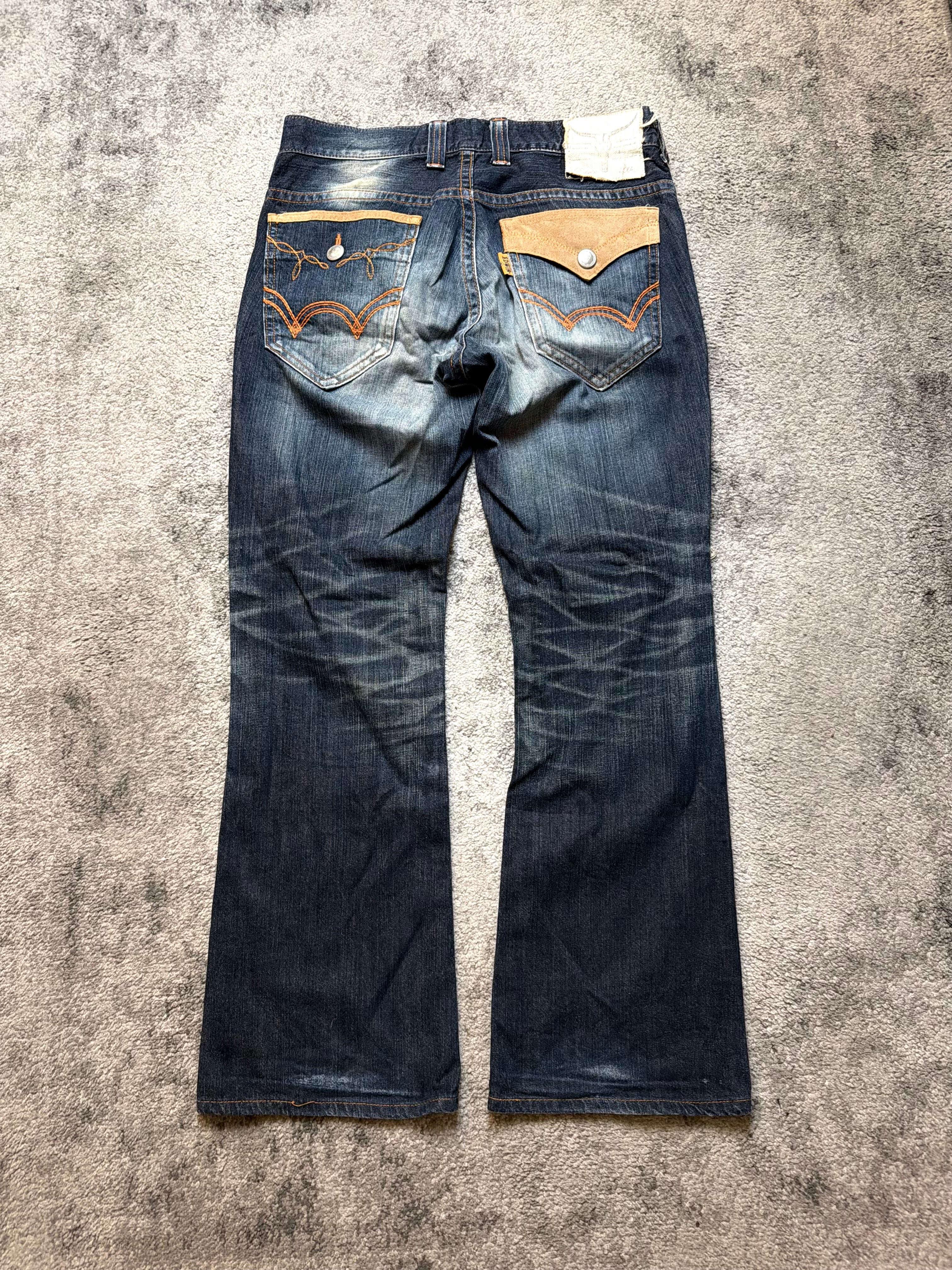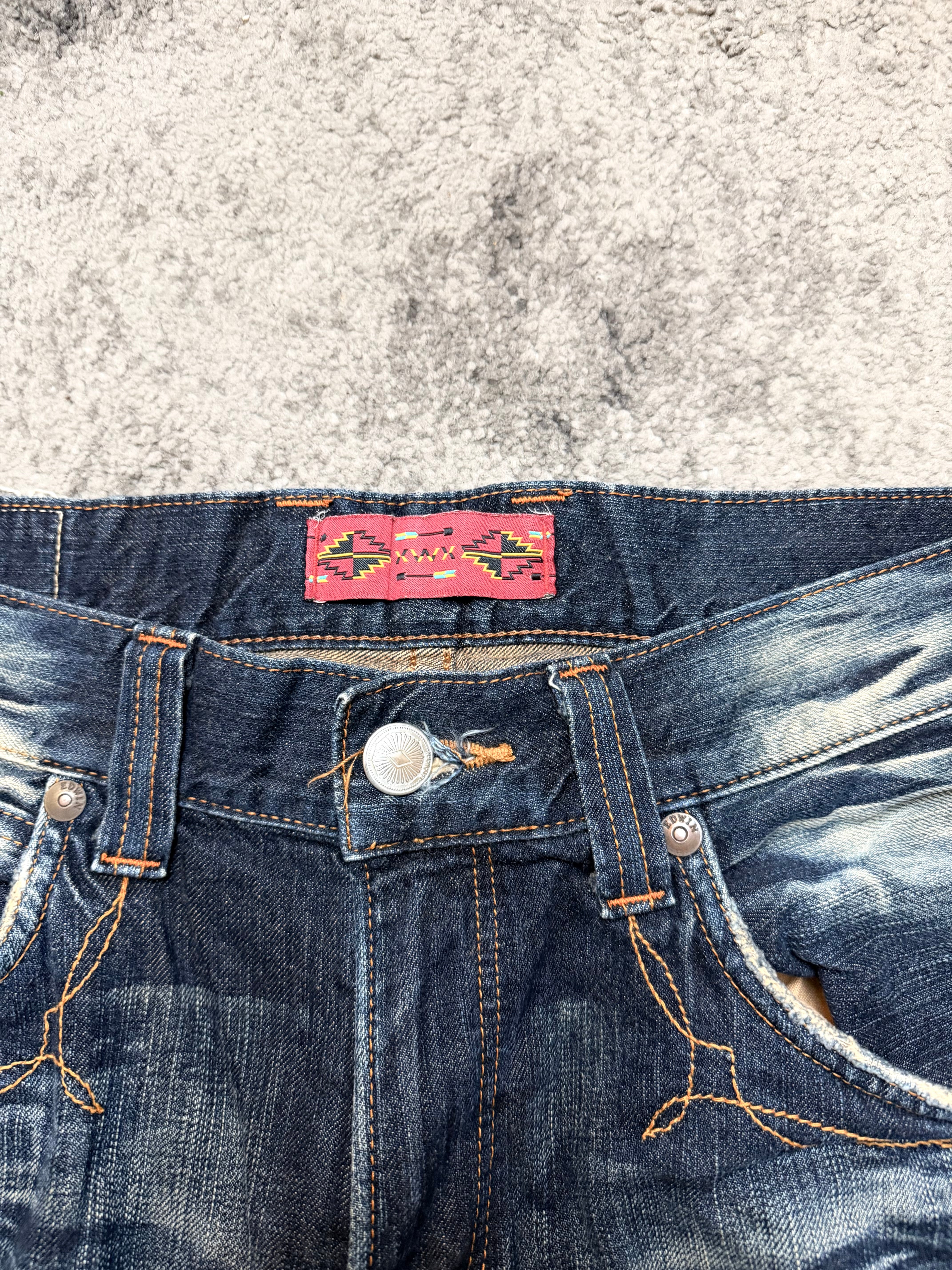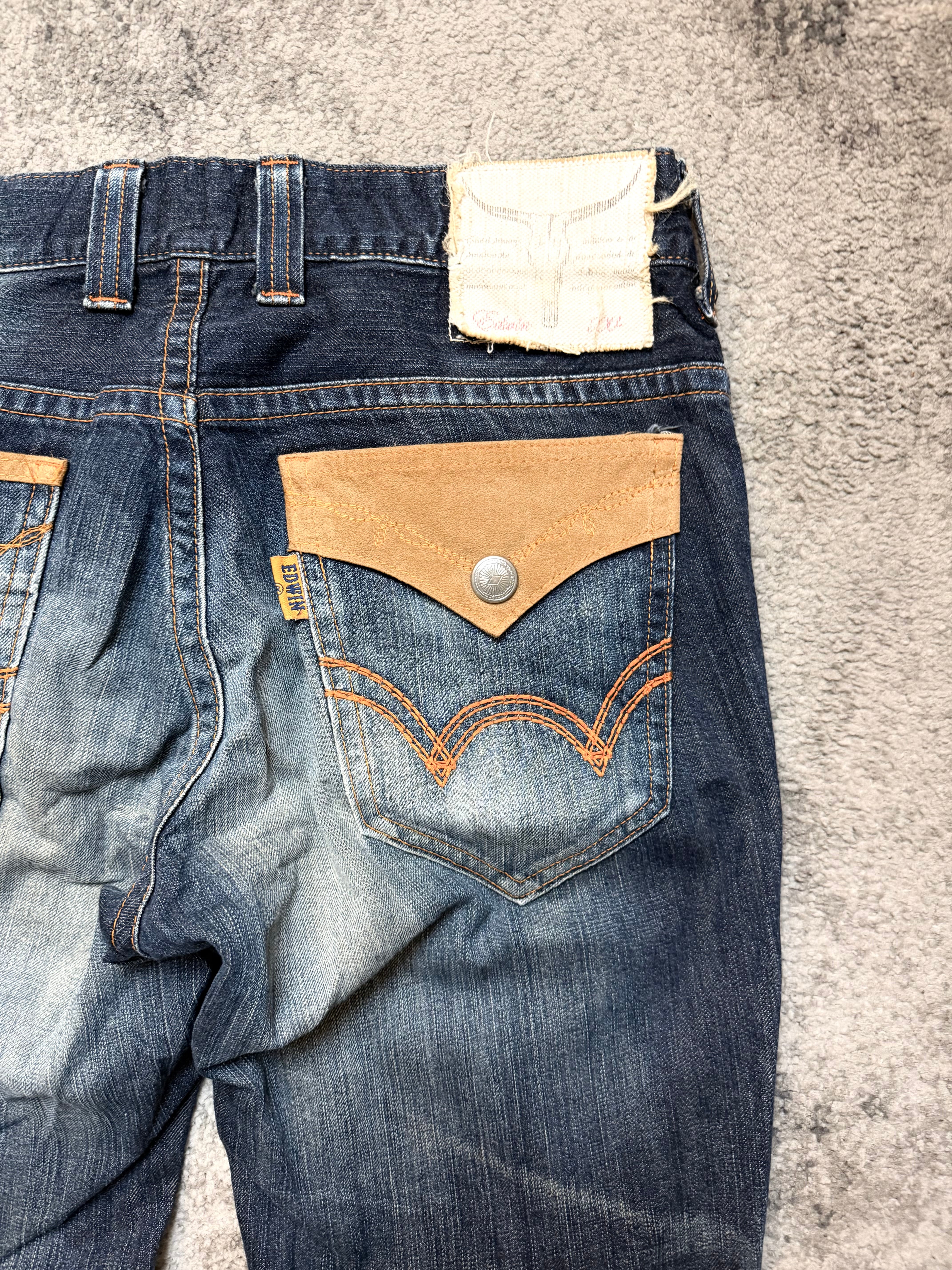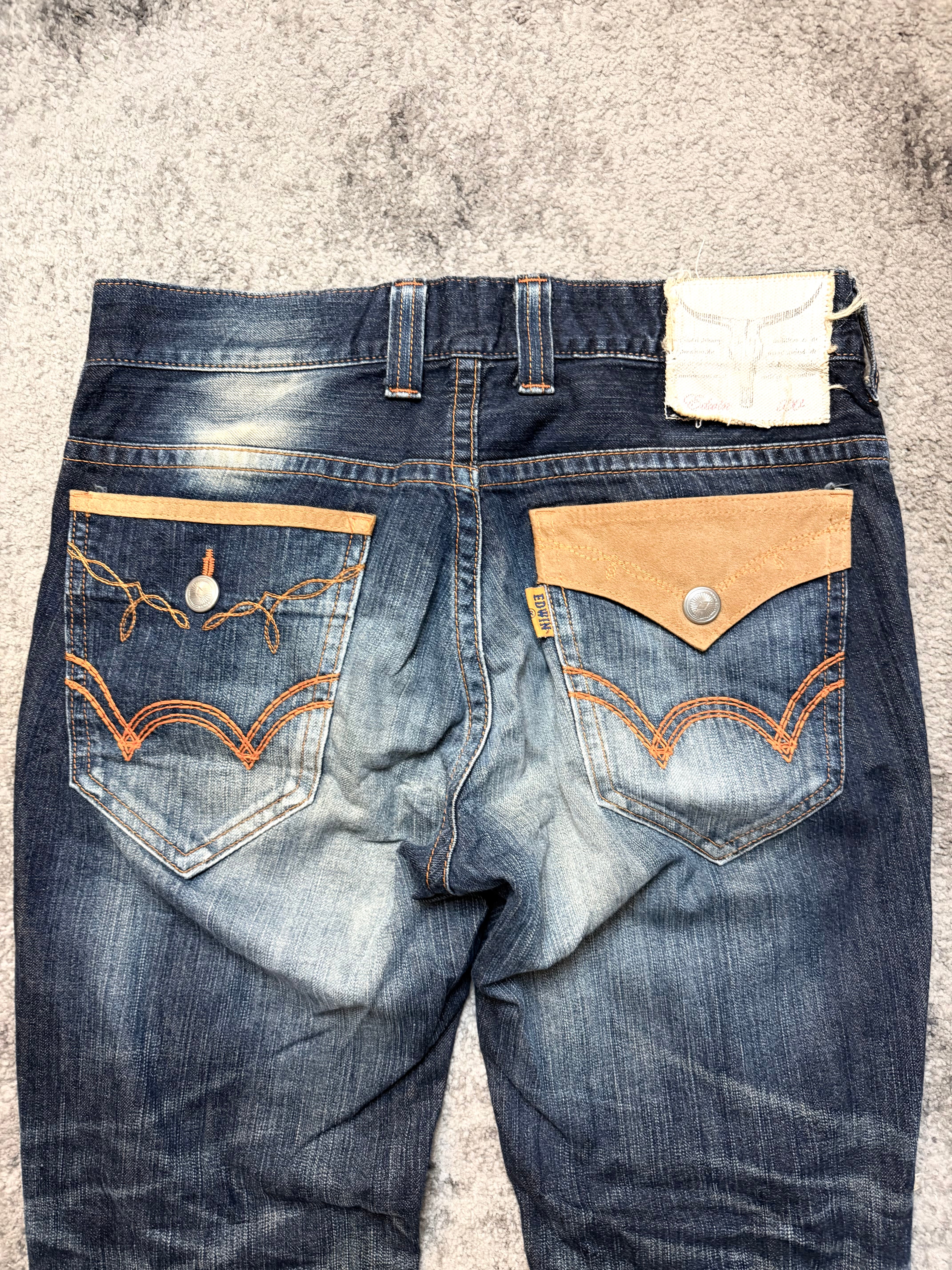 Crafted from sturdy Japanese cotton denim, the fabric has softened beautifully with time, creating a naturally worn-in drape and an organic hand-feel. The front showcases authentic distressing, small abrasions, and sun-bleached halos, giving it a raw, lived-in character. In the back, the signature EDWIN wave pockets in contrasting brown panels add a subtle Western-meets-Tokyo edge.