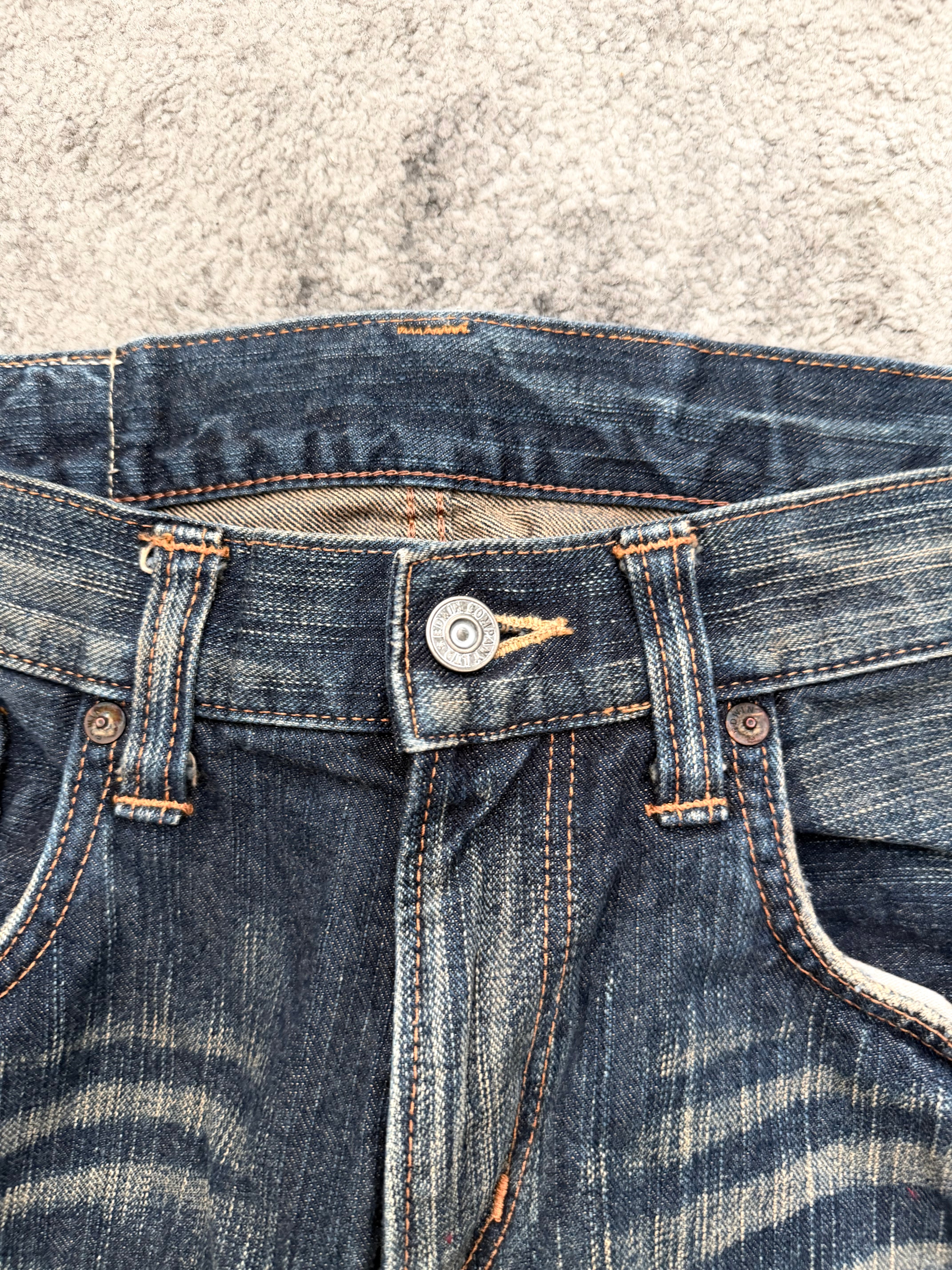 A true reflection of Japanese denim craftsmanship, this EDWIN XV piece captures that perfect balance between structure and wear. The deep indigo wash has naturally aged into a beautiful gradient of blues and greys, with distinct whiskering and thigh fading that speak to authentic vintage character.