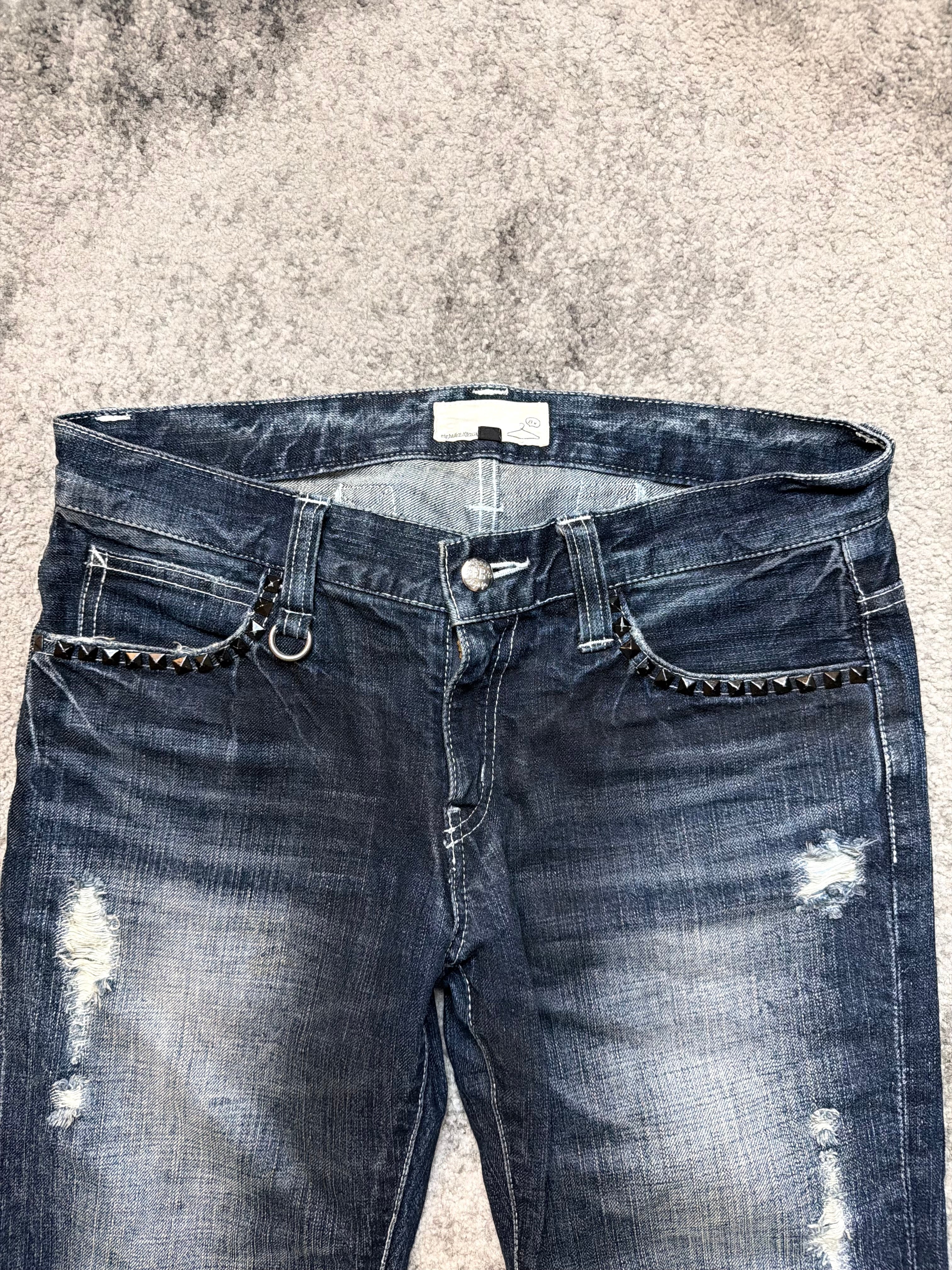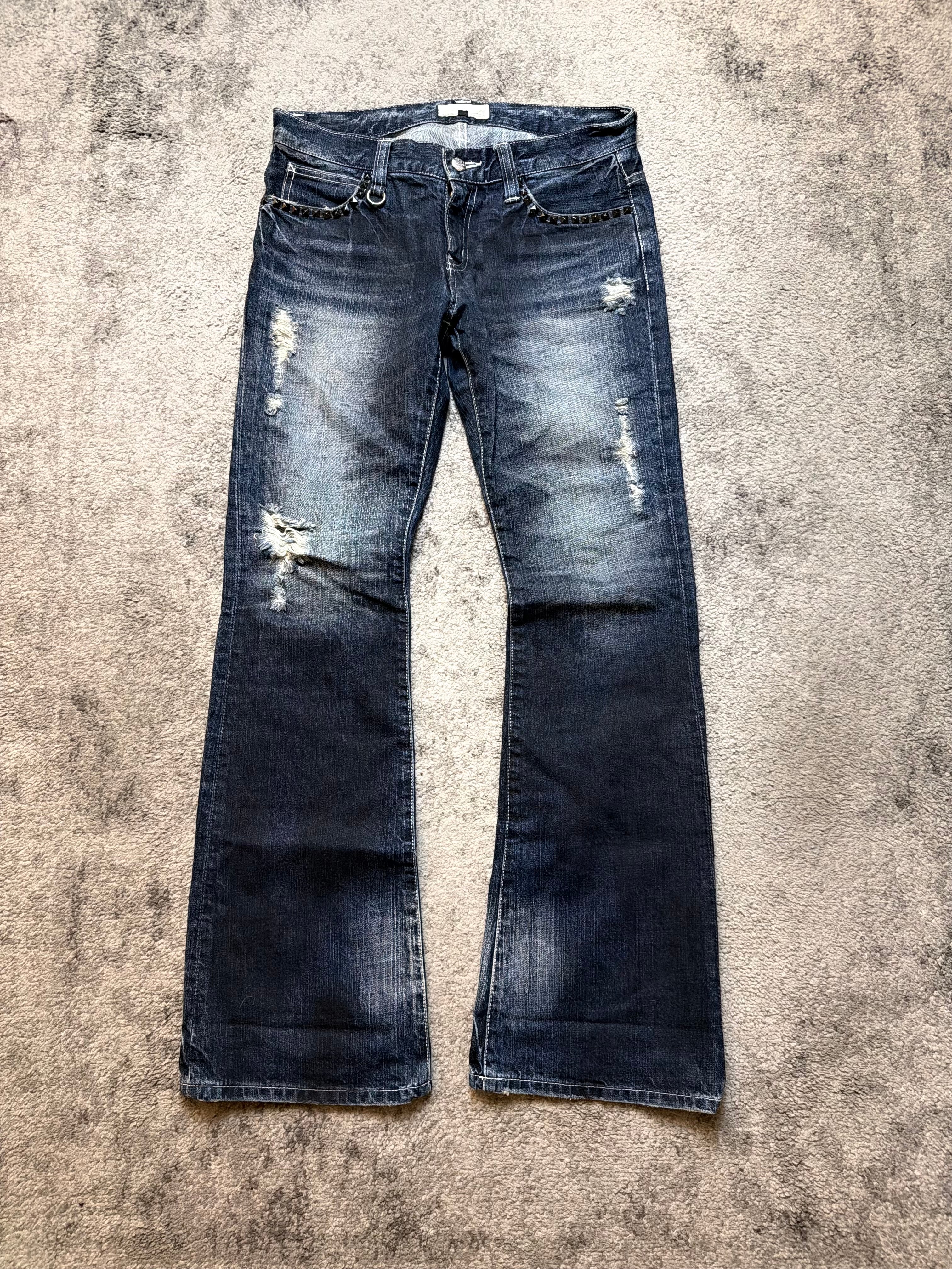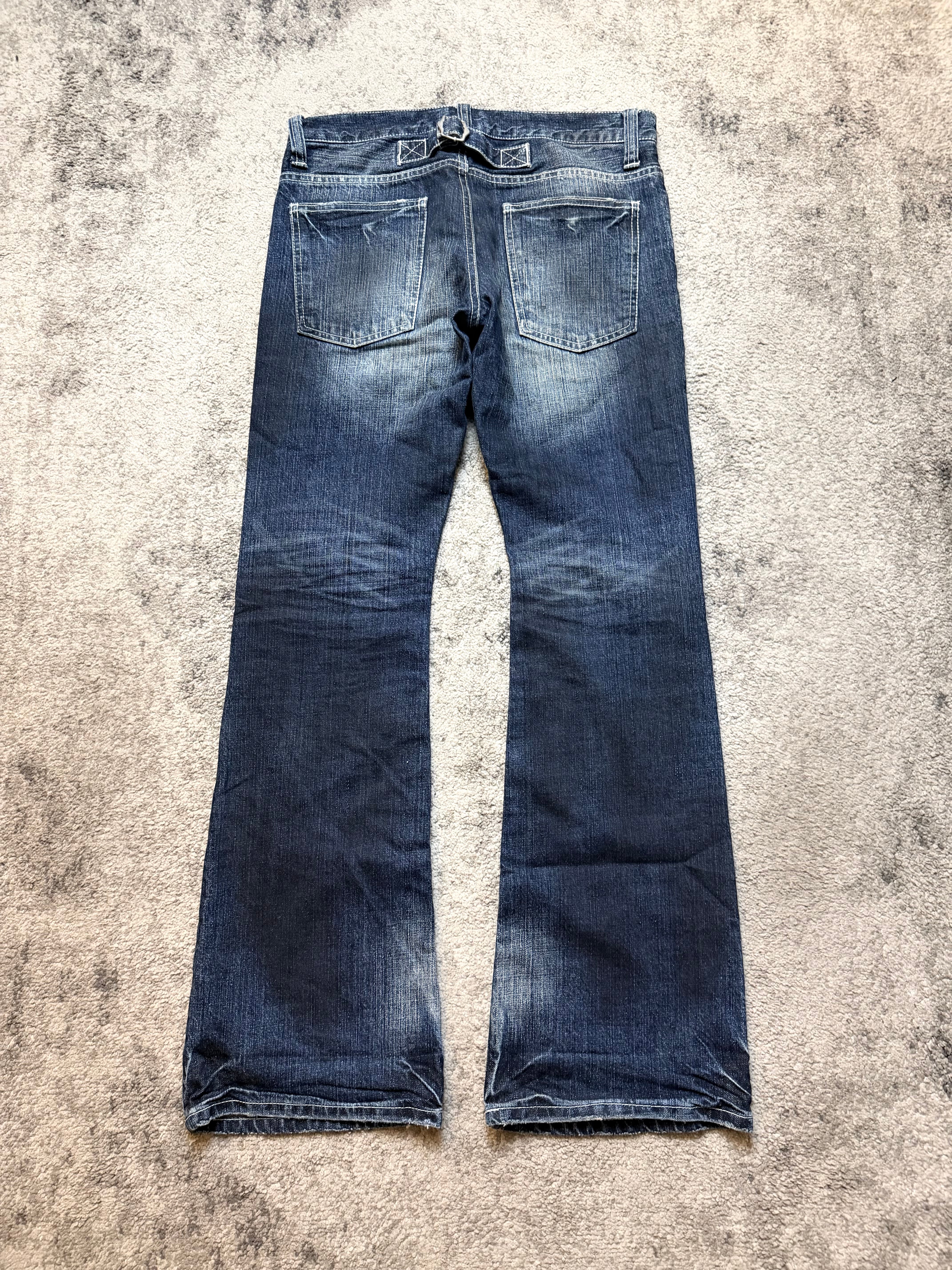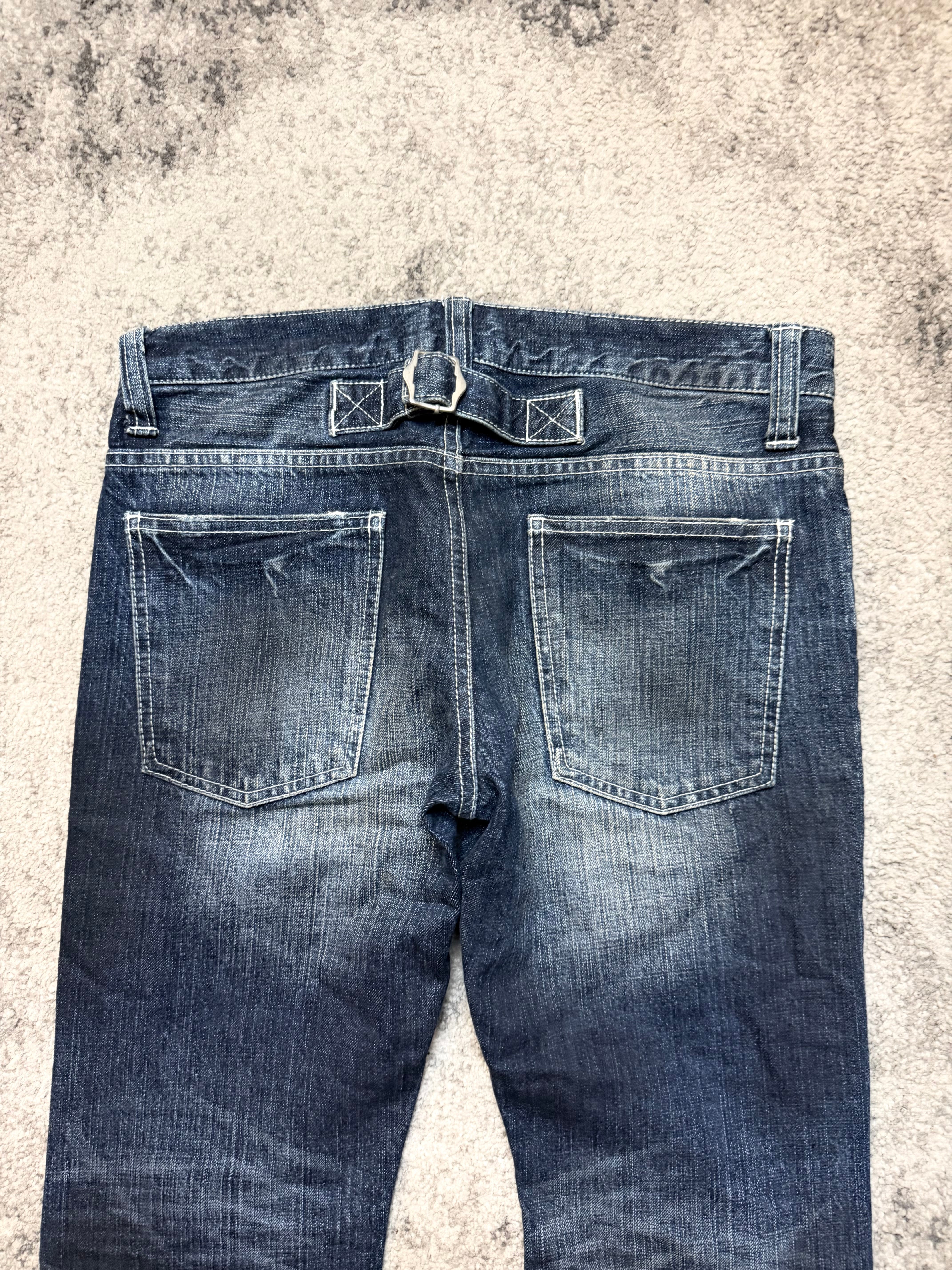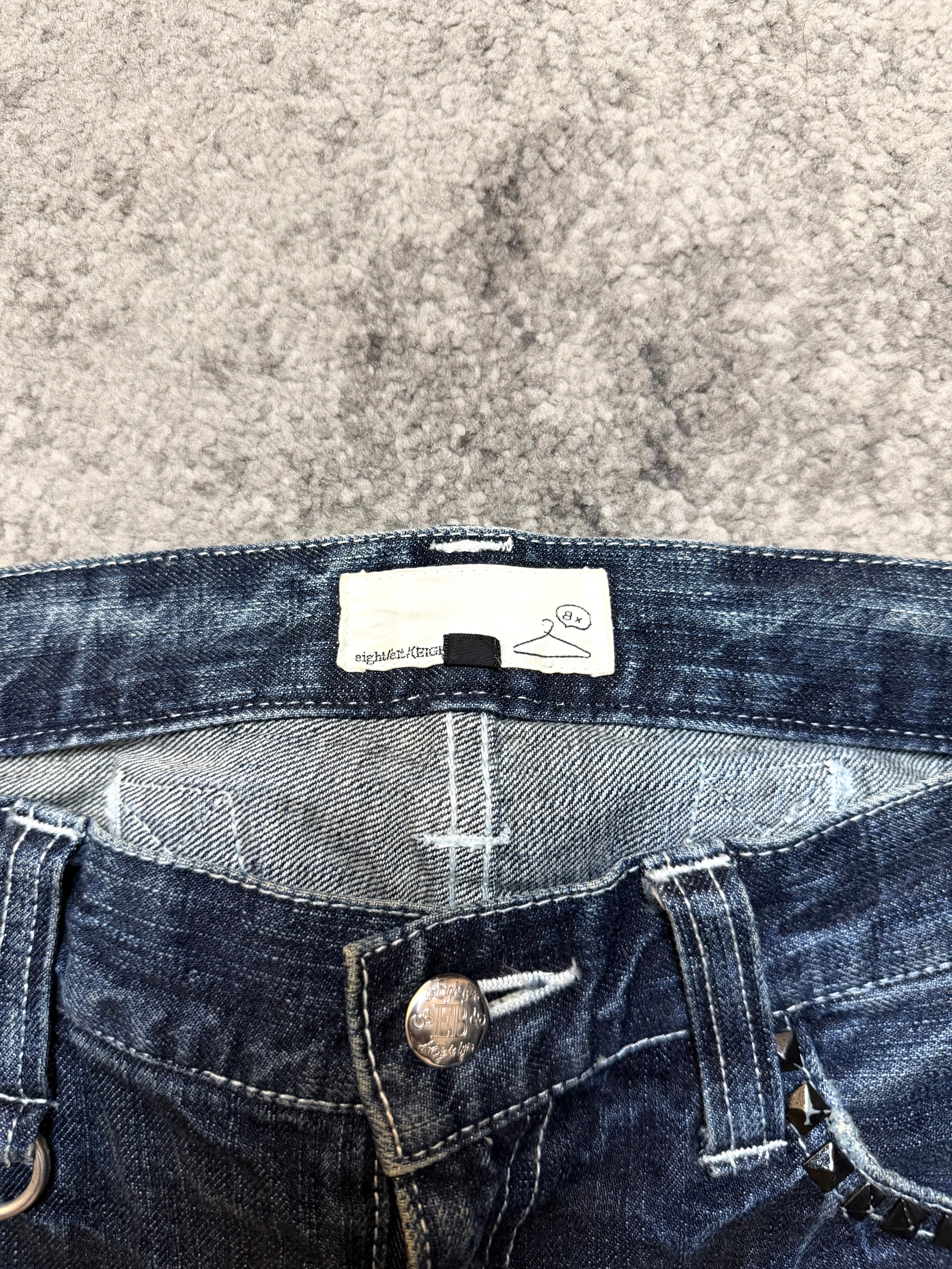 A pair of Japanese archive denim that feels alive — worn-in, road-tested, and carrying that raw, Number (N)ine-coded romance. These EIGHT jeans come in a soft, vintage blue wash, shaped by natural fading and heavy distressing on the front, giving them that effortless underground energy. The subtle chain detail at the front belt loops adds a quiet rebellious touch, almost like a built-in accessory.