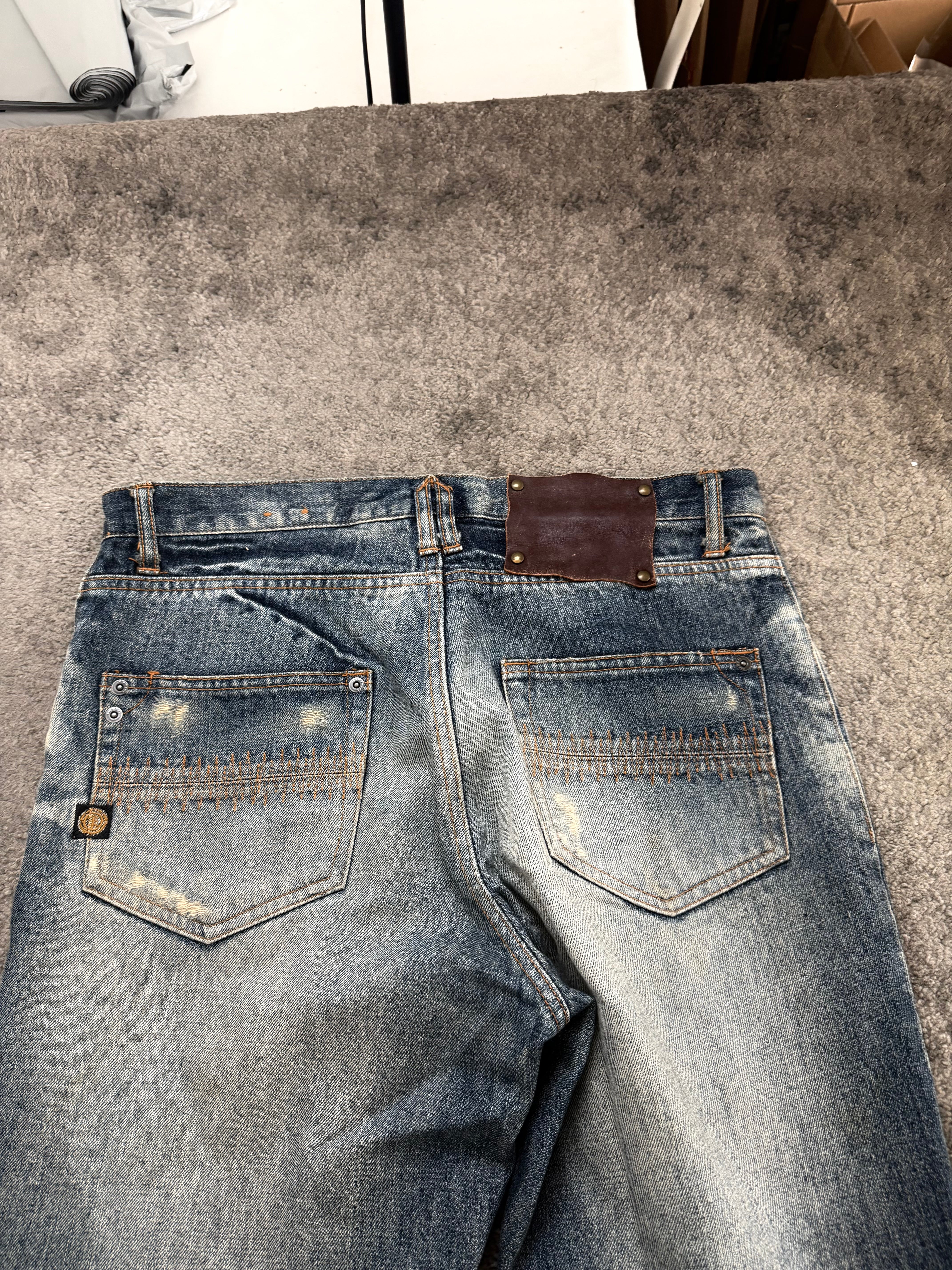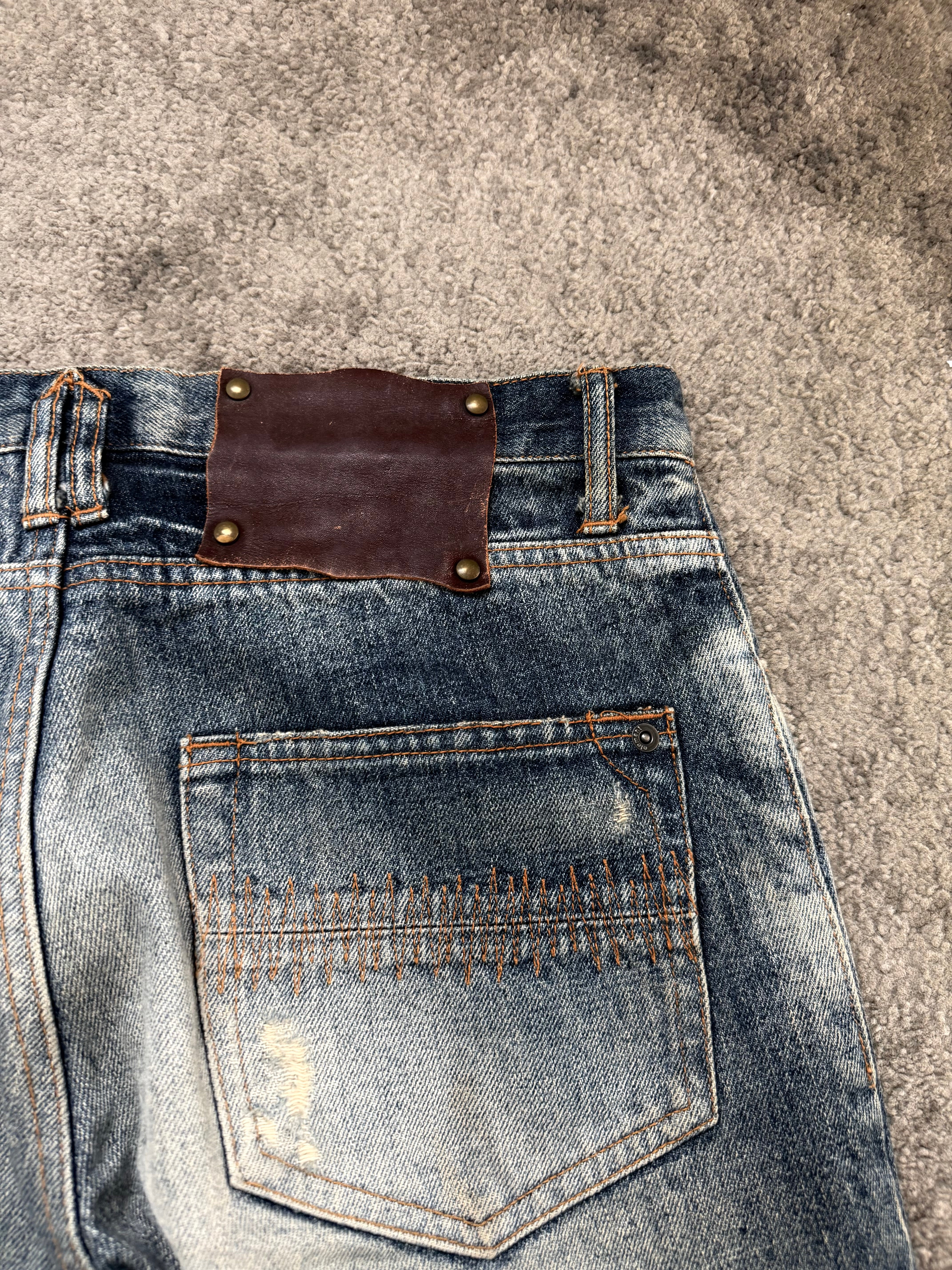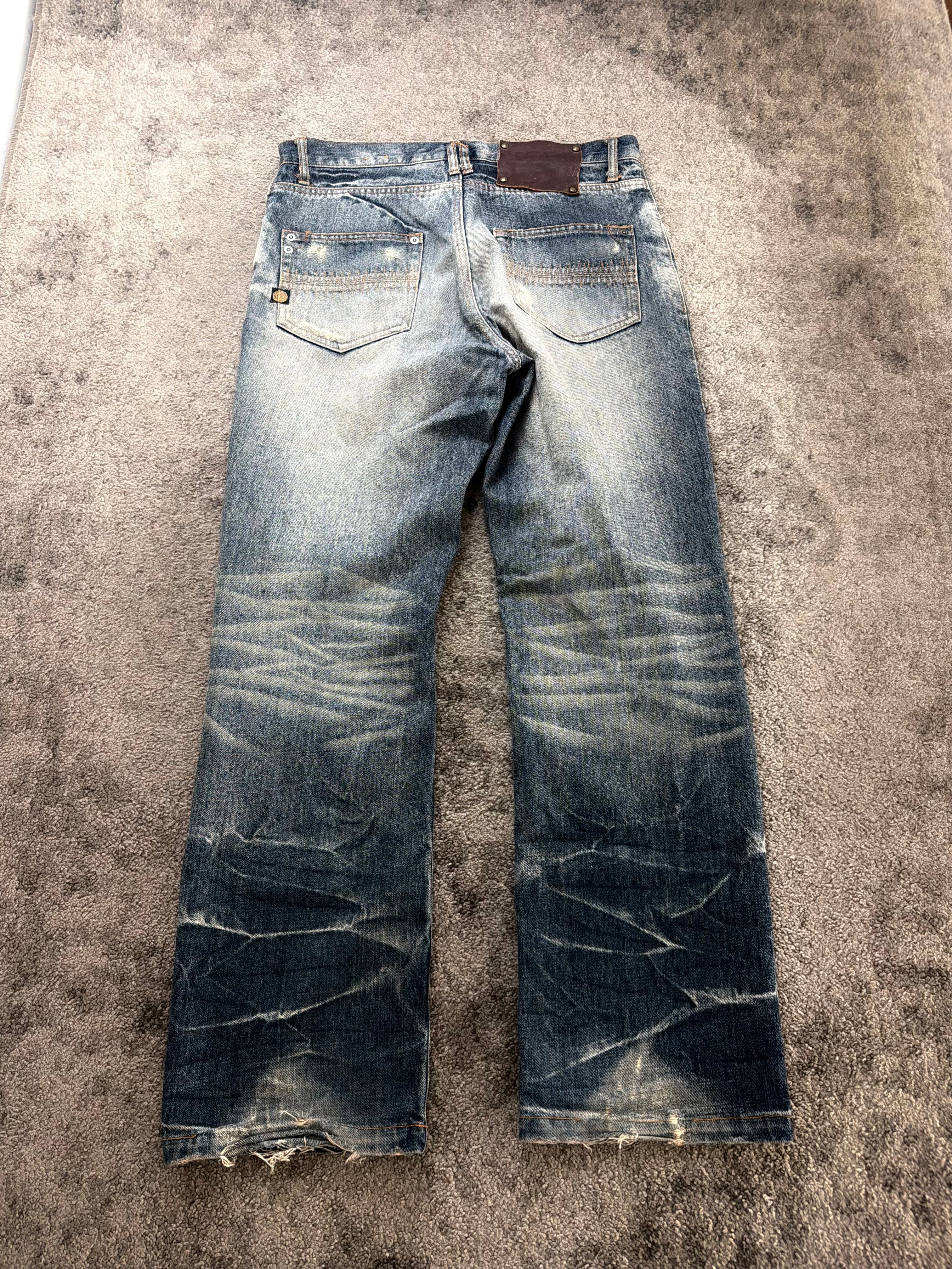 This ELEMENT pair channels that authentic Number Nine / ifsixwasnine / Japanese archive style mood — heavy whiskering, sun-faded thighs, and a perfectly placed knee distress that feels earned, not forced.