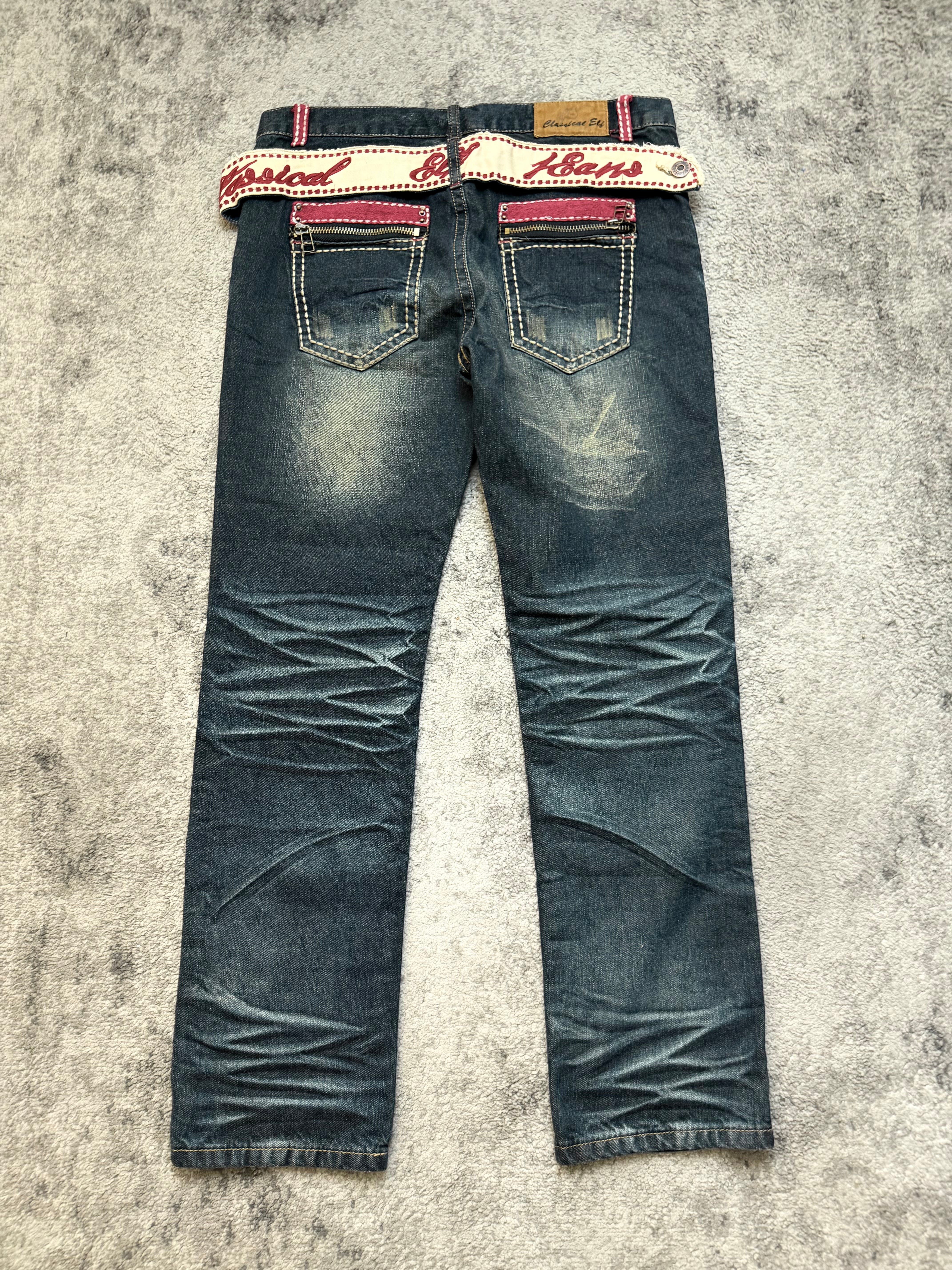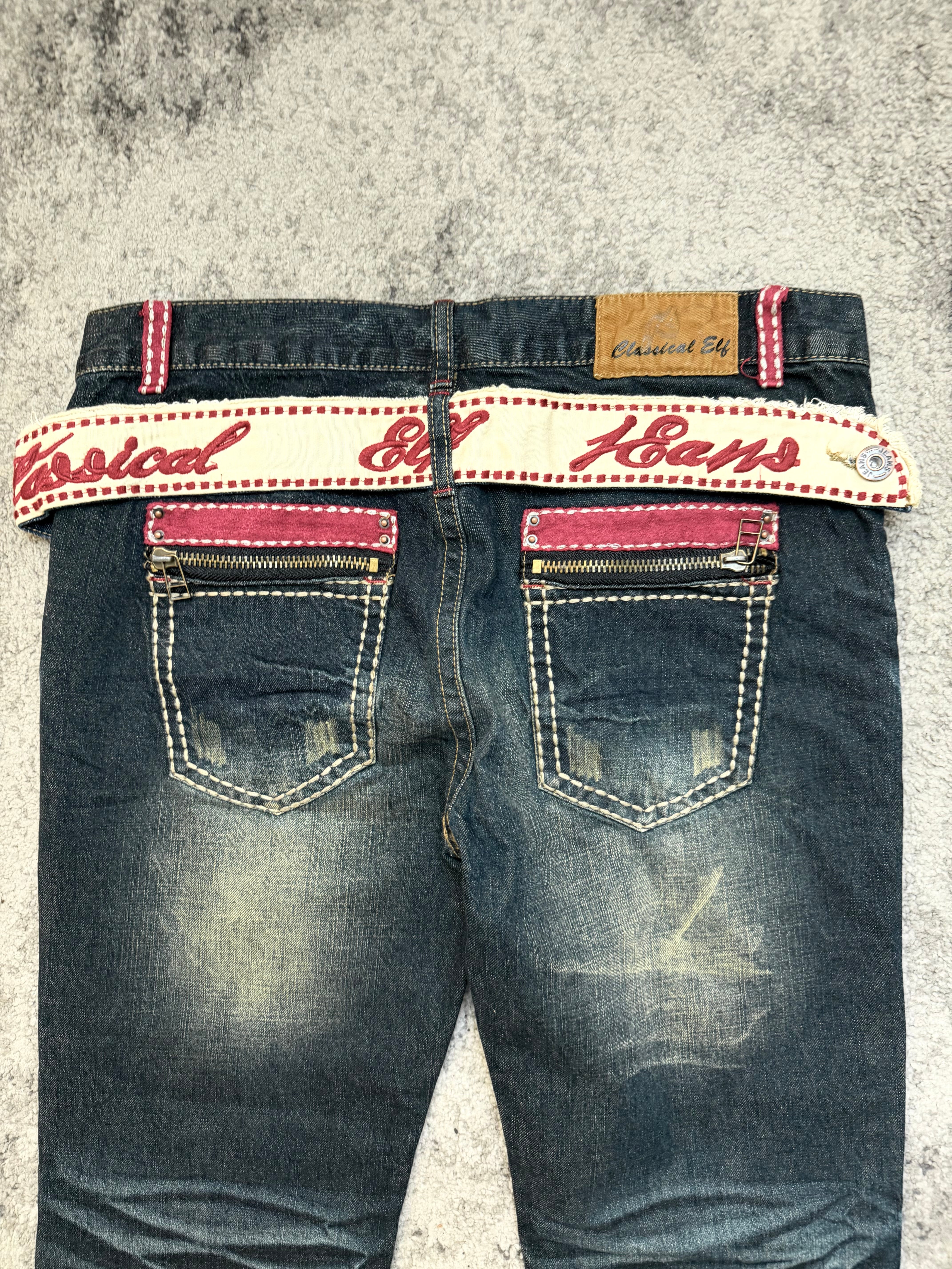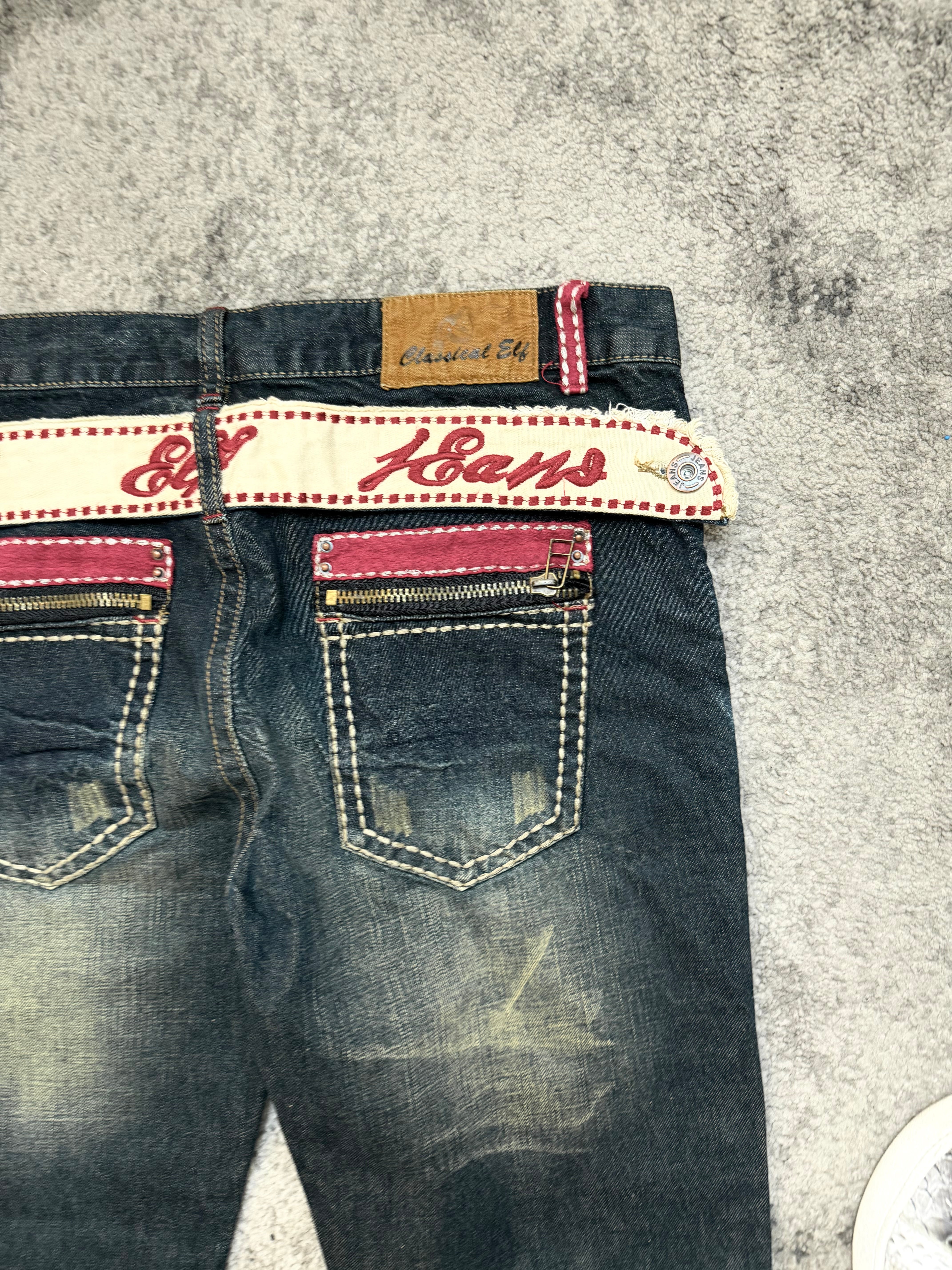 Born from Japan’s ELF heritage, these jeans channel pure rider energy — rugged, fast, and effortlessly stylish. Washed indigo meets deep creases and a bold logo belt, a tribute to garage culture and host-era rebellion.