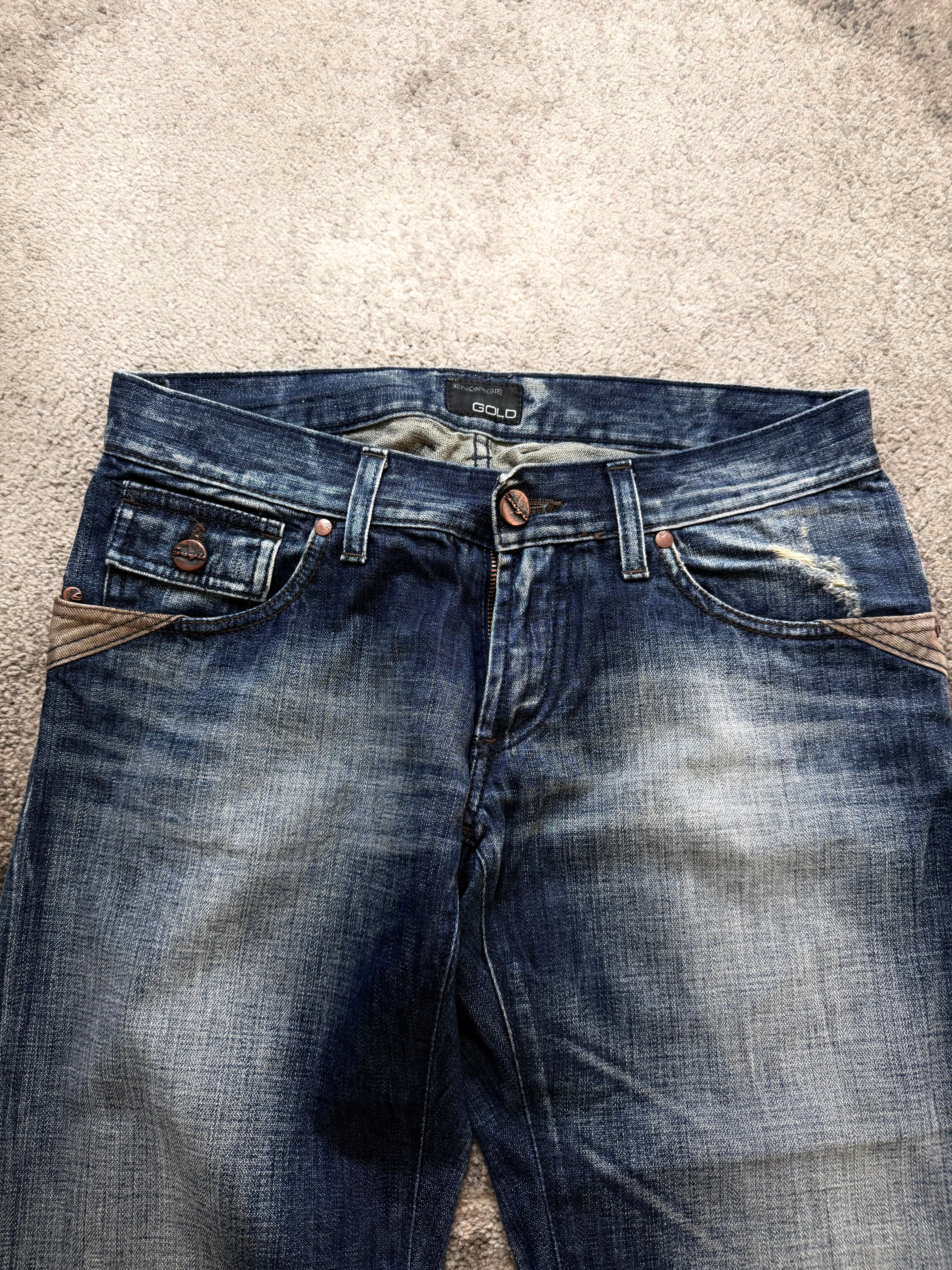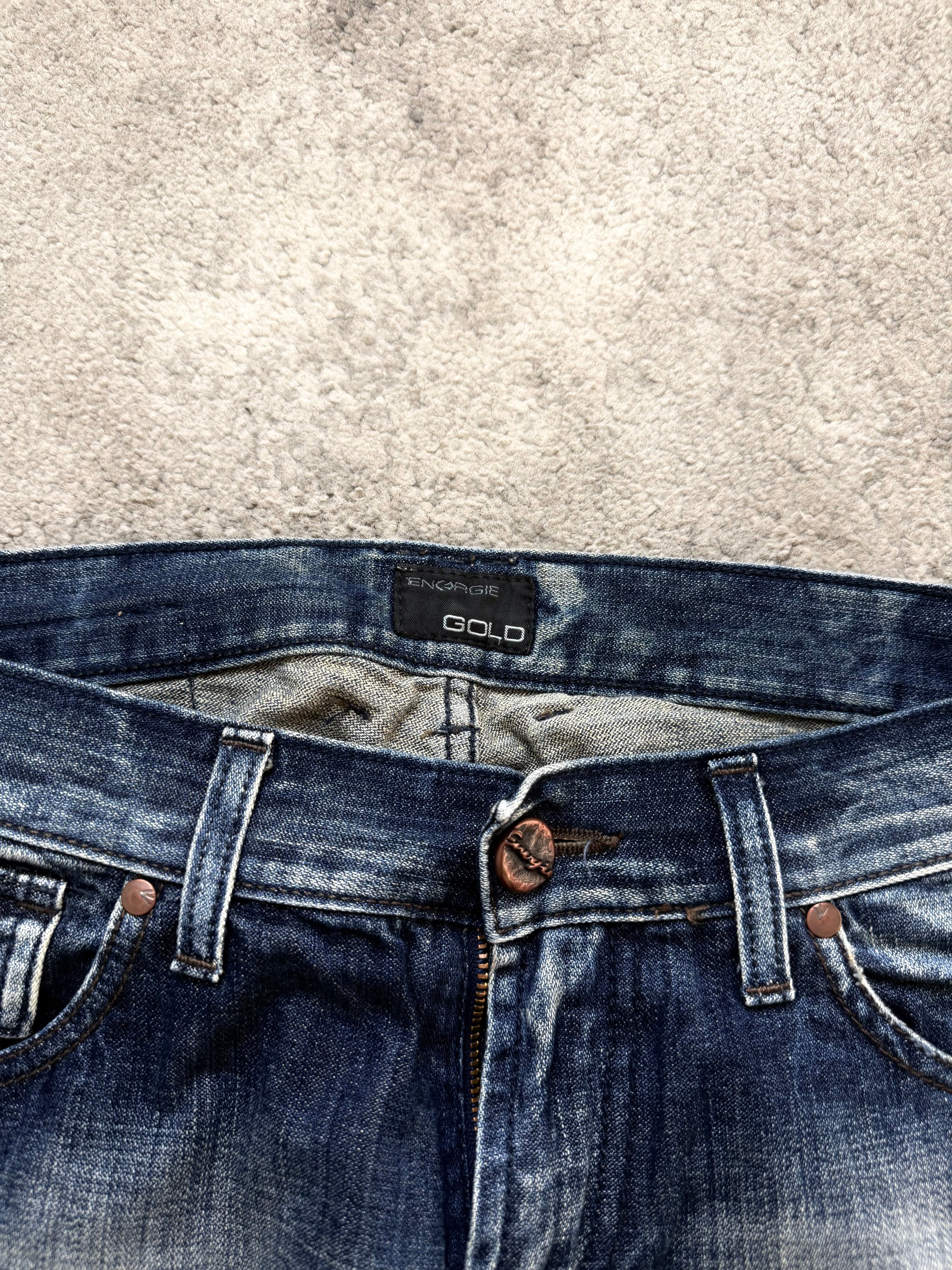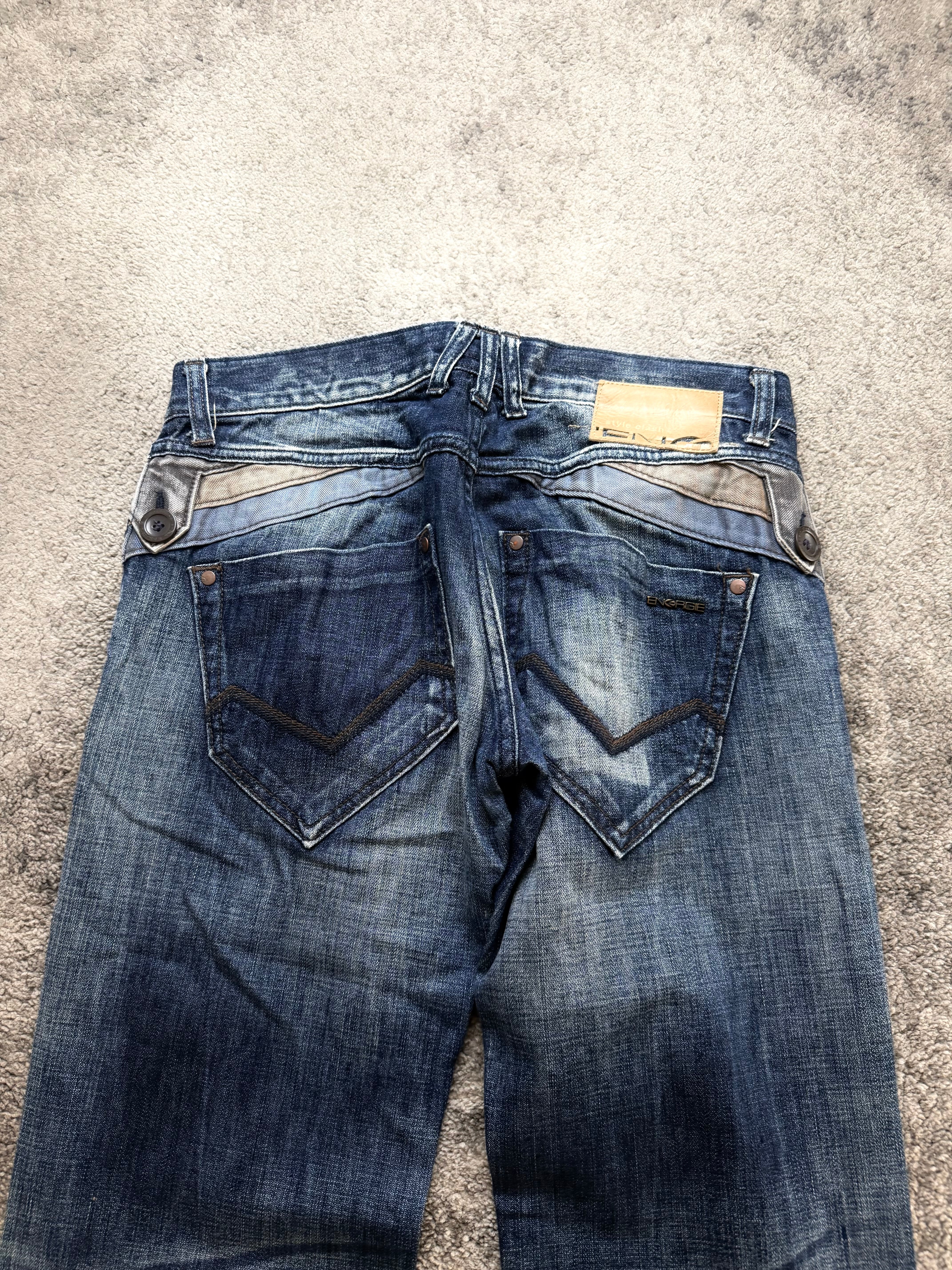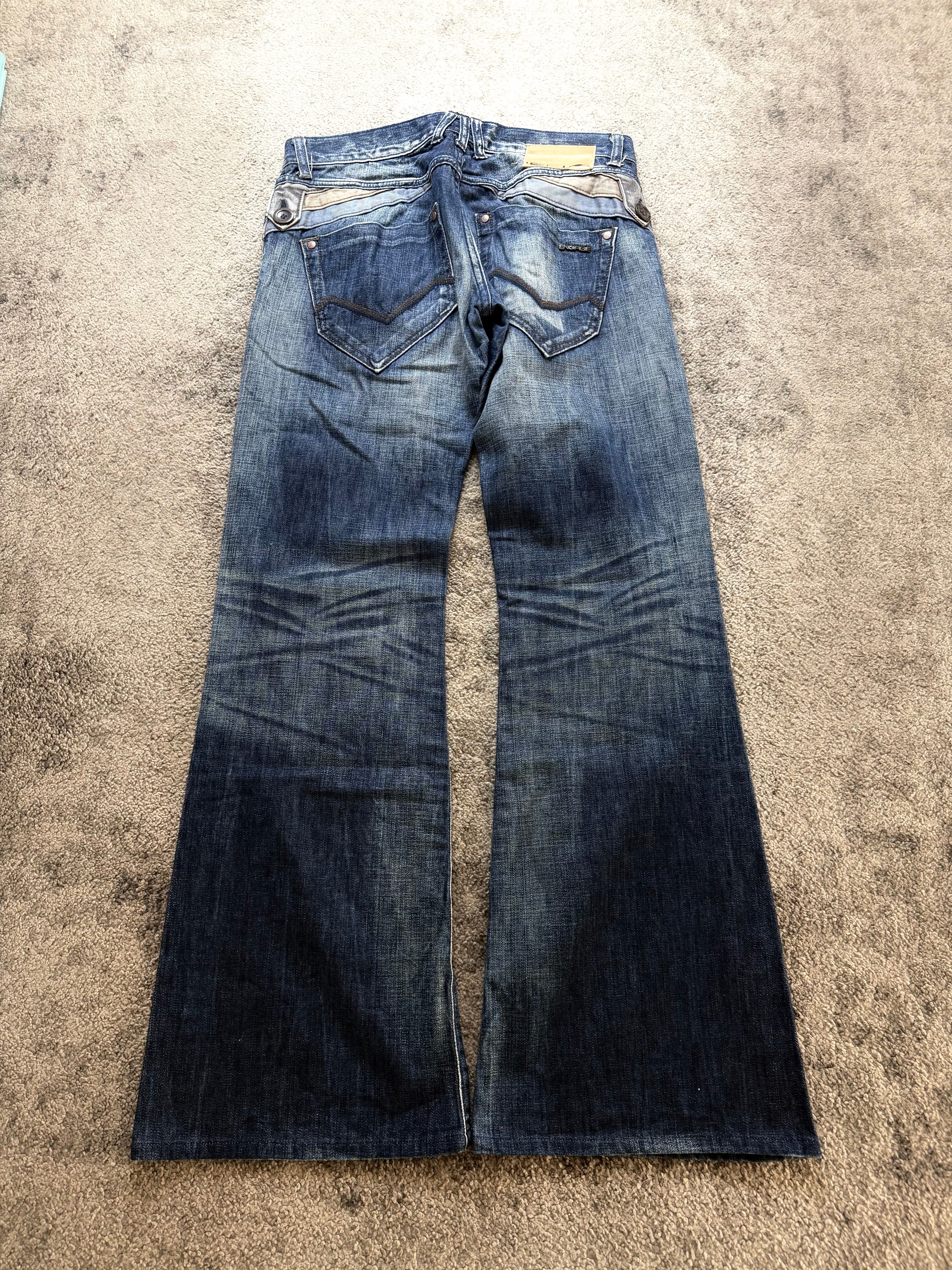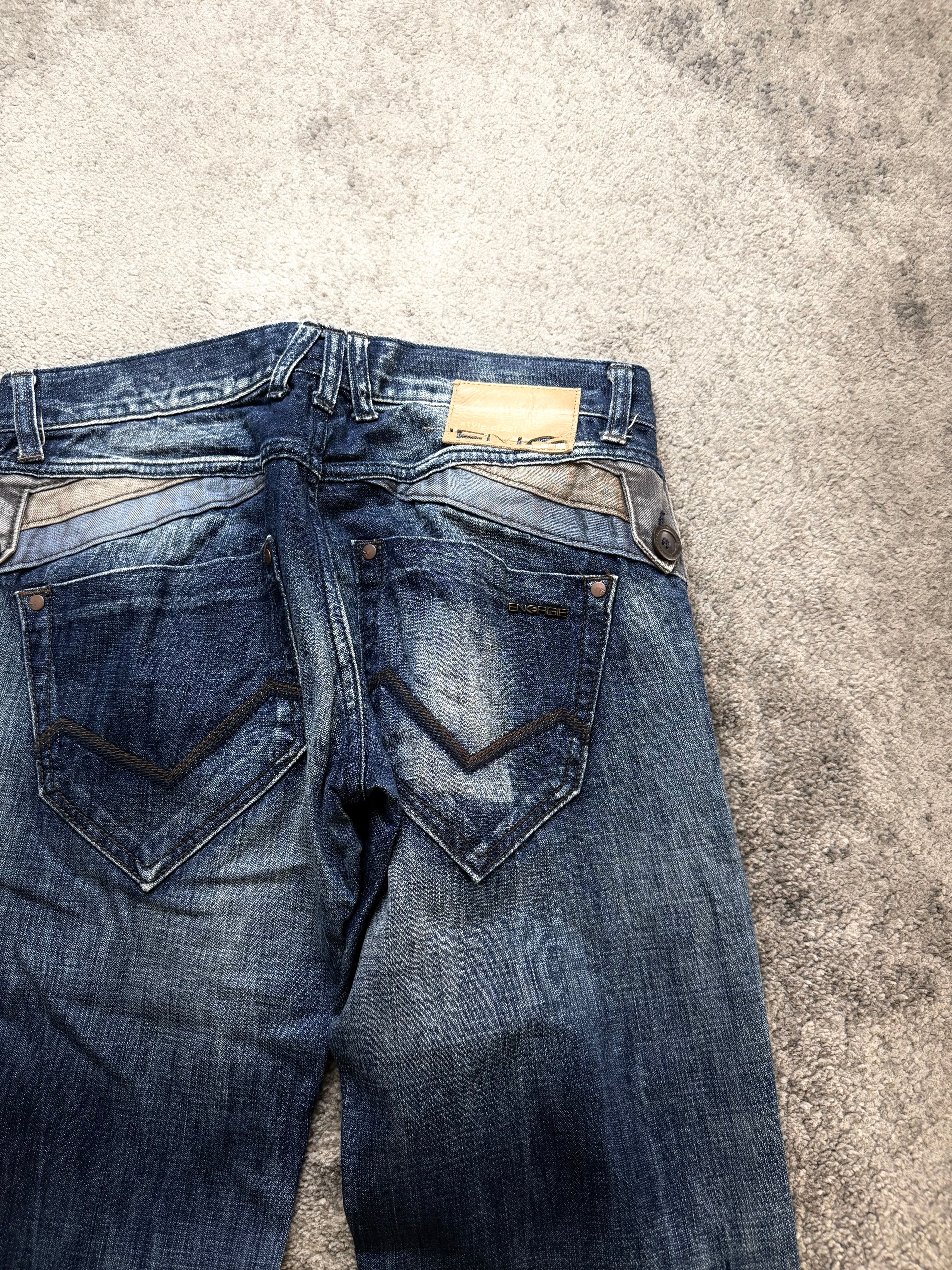 A strong archive-era pair from ENERGIE, heavily inspired by the dark romanticism of Number (N)ine and the underground attitude of ifsixwasnine. Deep indigo tones melt into dramatic thigh fading, giving this denim a worn-in, lived story that feels intentional and rebellious.