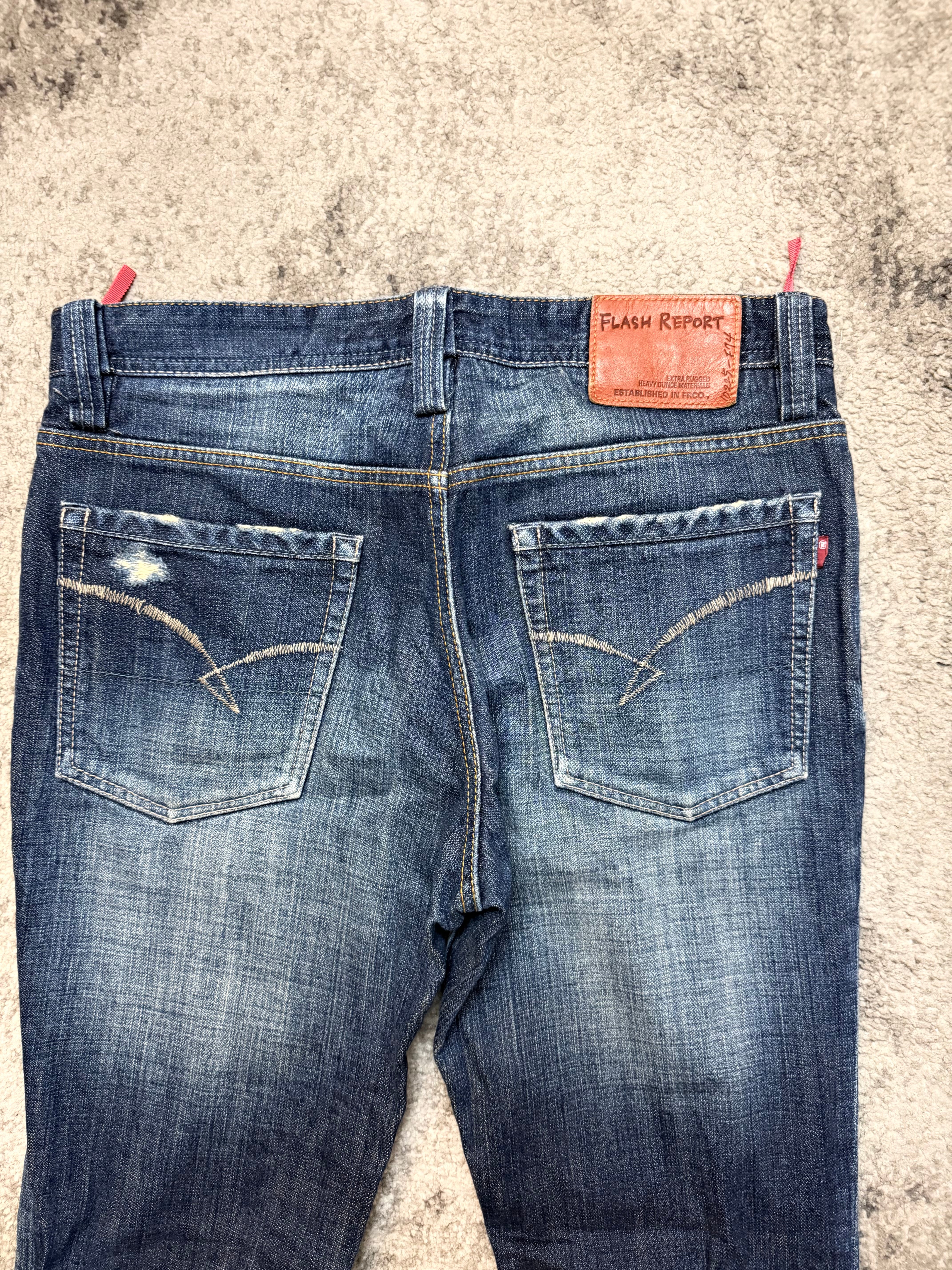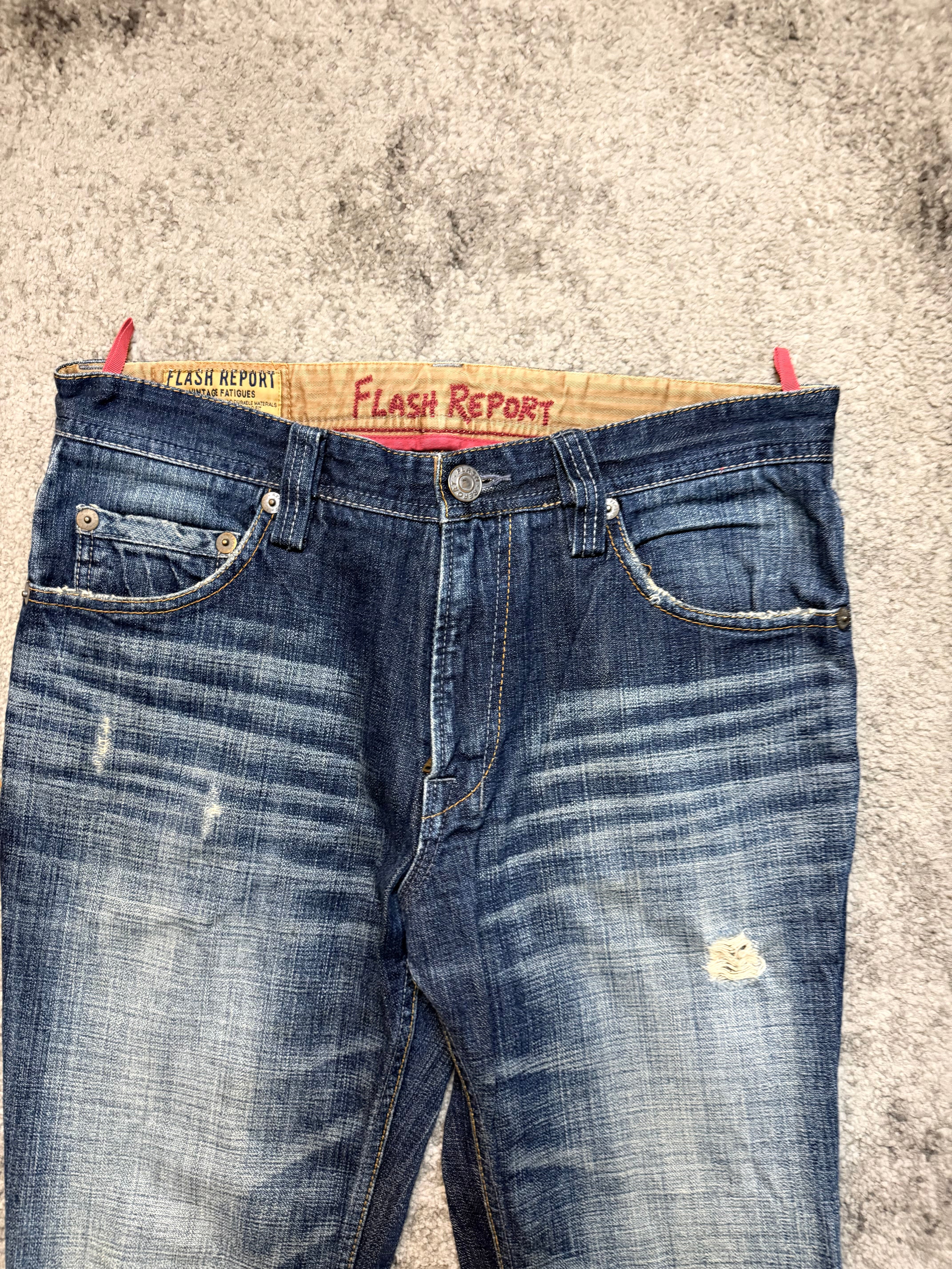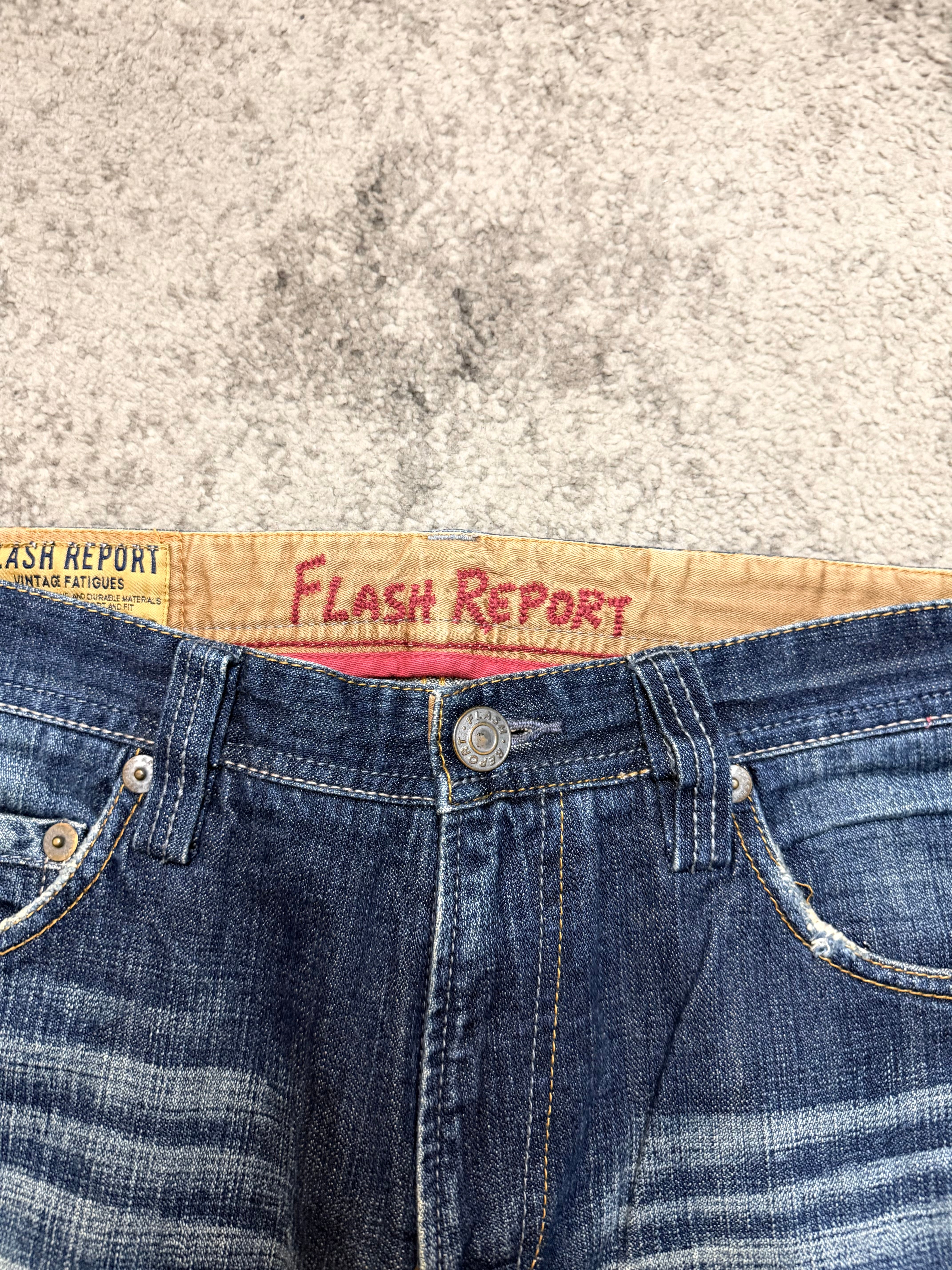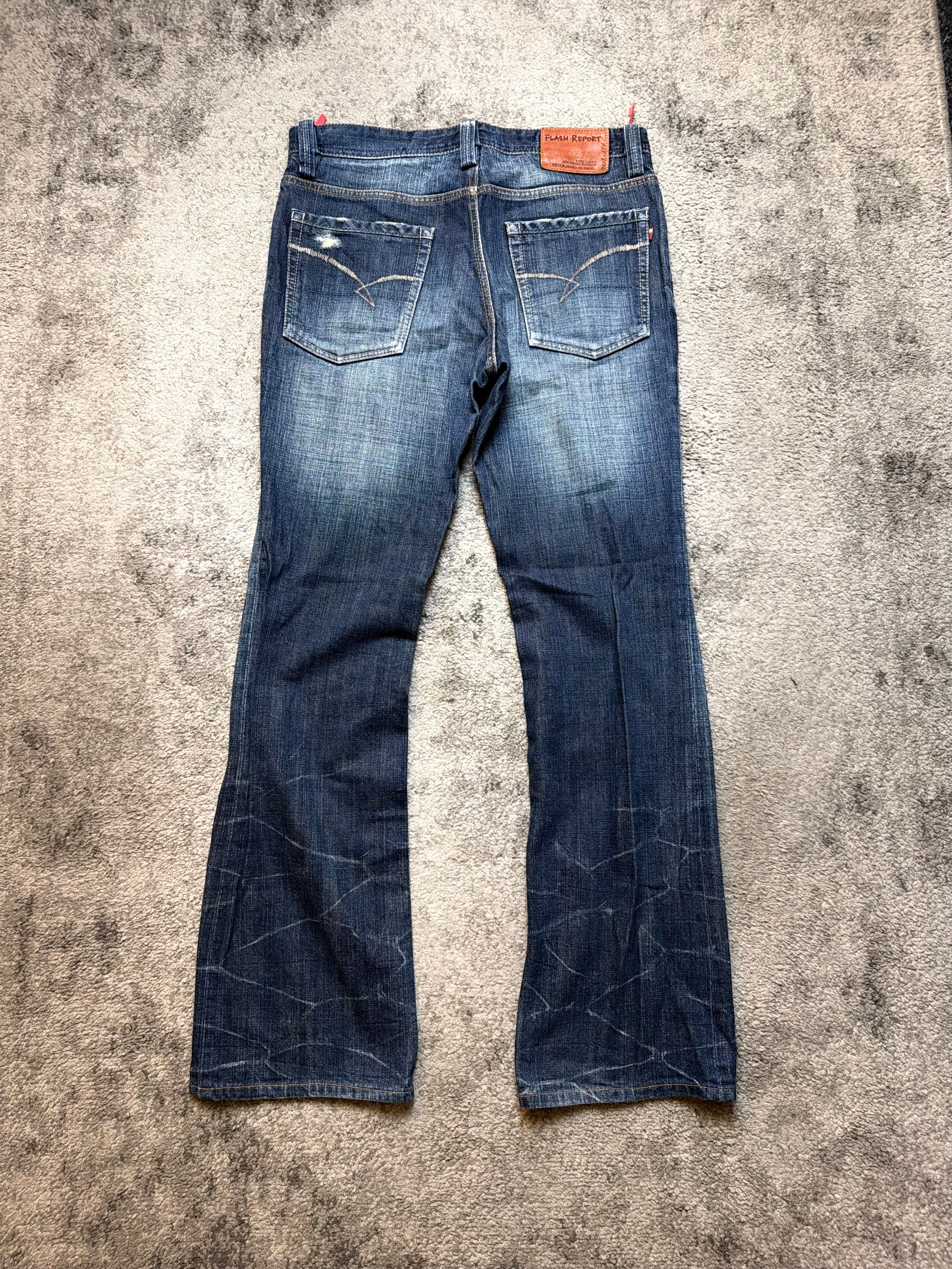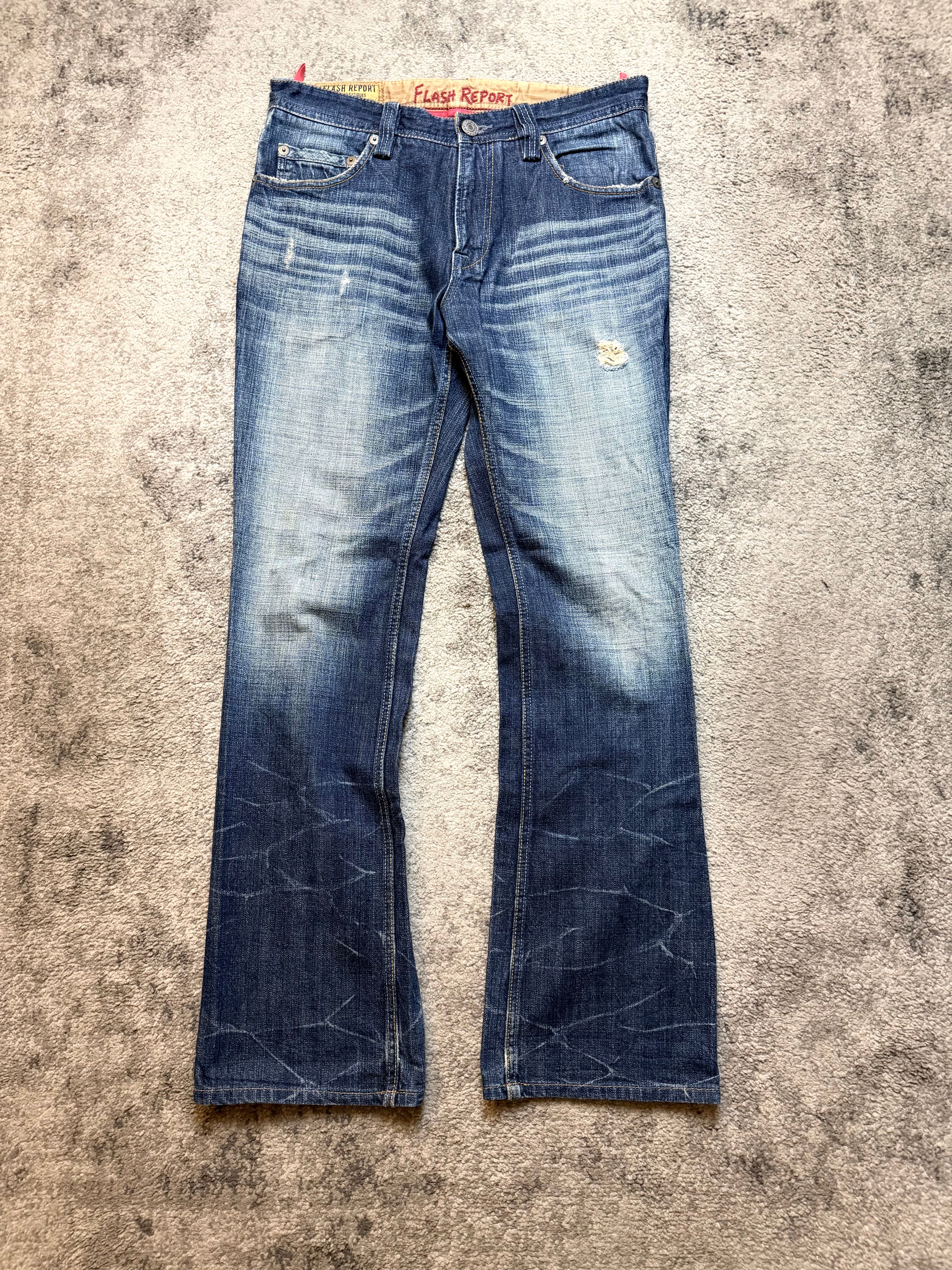 Perfect for Number (N)ine-style silhouettes, host-core nightlife fits, or anyone who wants denim that already looks like it’s survived a few wild chapters. The front carries strong horizontal whiskers, while the lower legs feature subtle shattered-line fades—quiet but hypnotic. Clean back with a classic FLASH REPORT patch to finish the vibe.