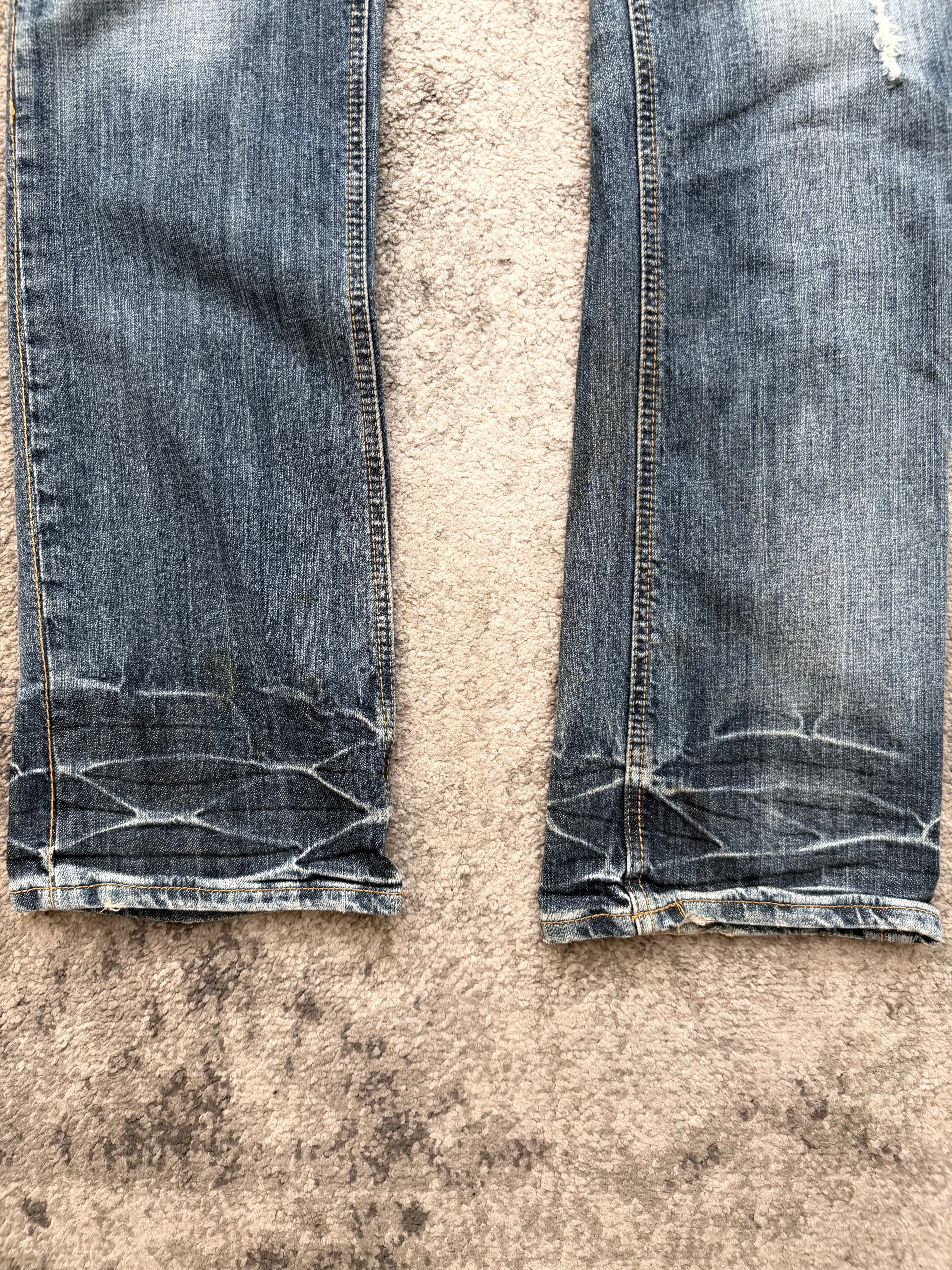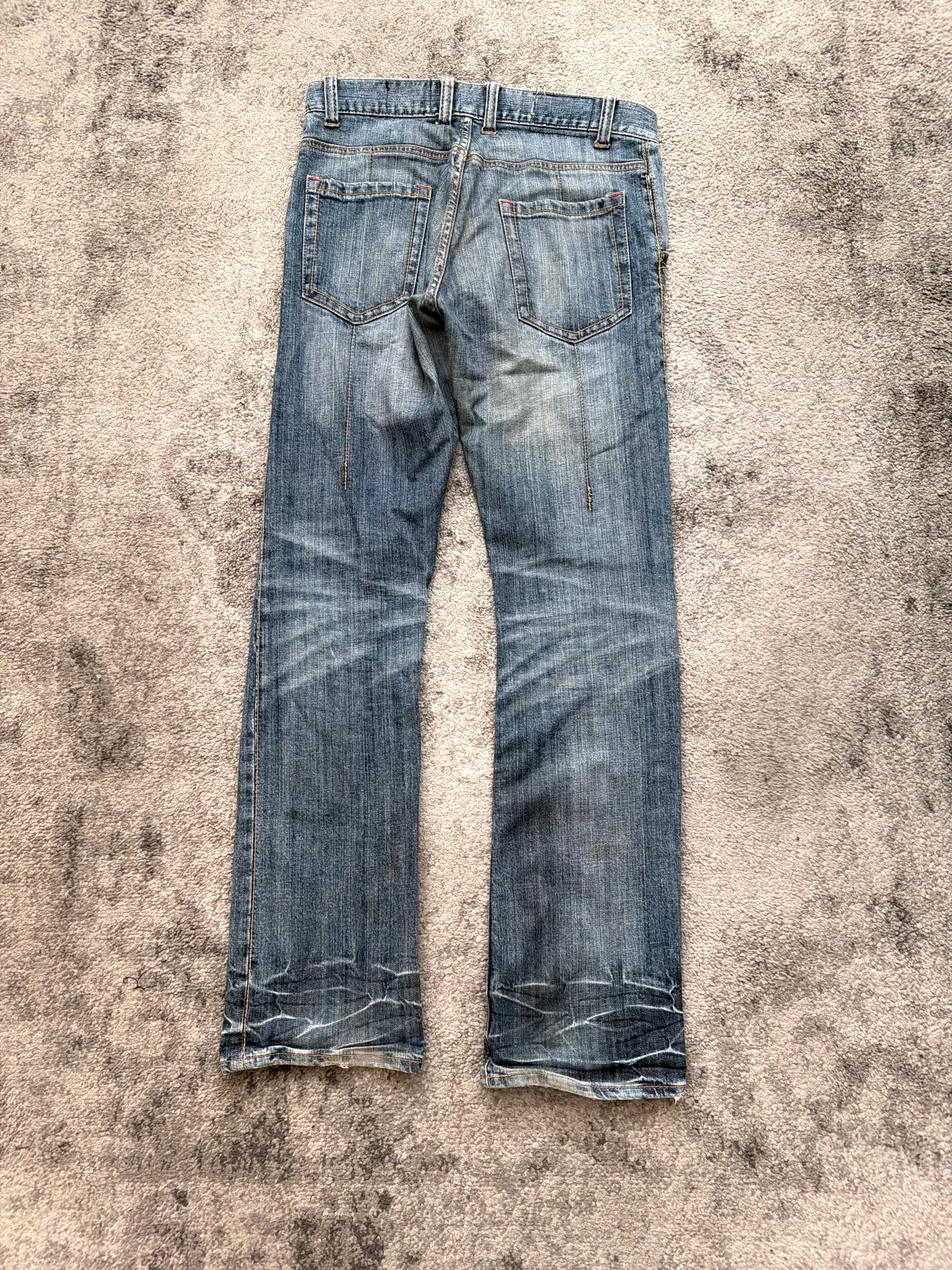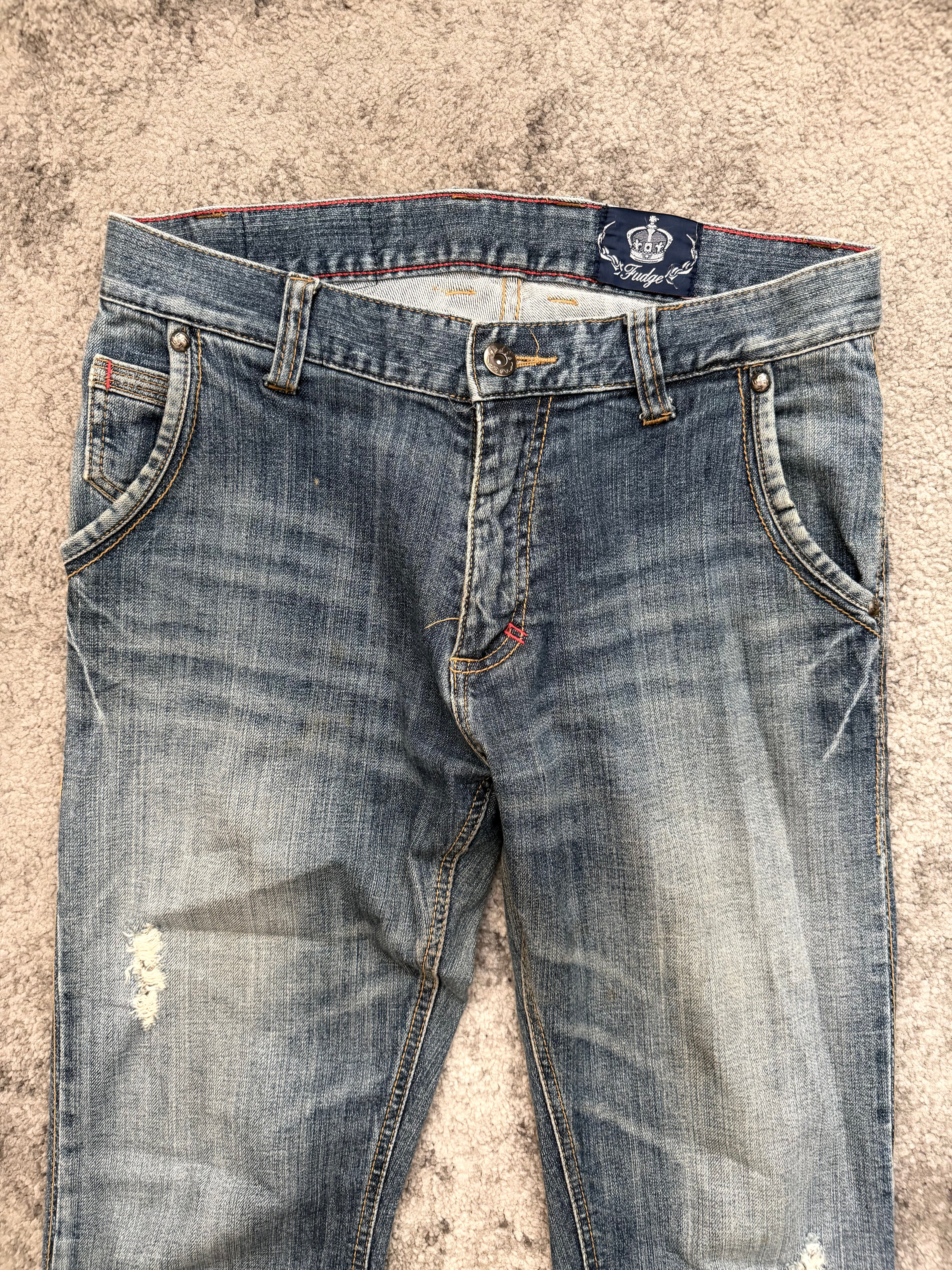 A beautifully worn FUDGE Japan denim — the kind that feels like it’s lived through Tokyo nights and slow mornings. The mid-wash indigo fades softly into distressed highlights, with hand-finished abrasions and deep stacking at the hem that give it a true archive character.