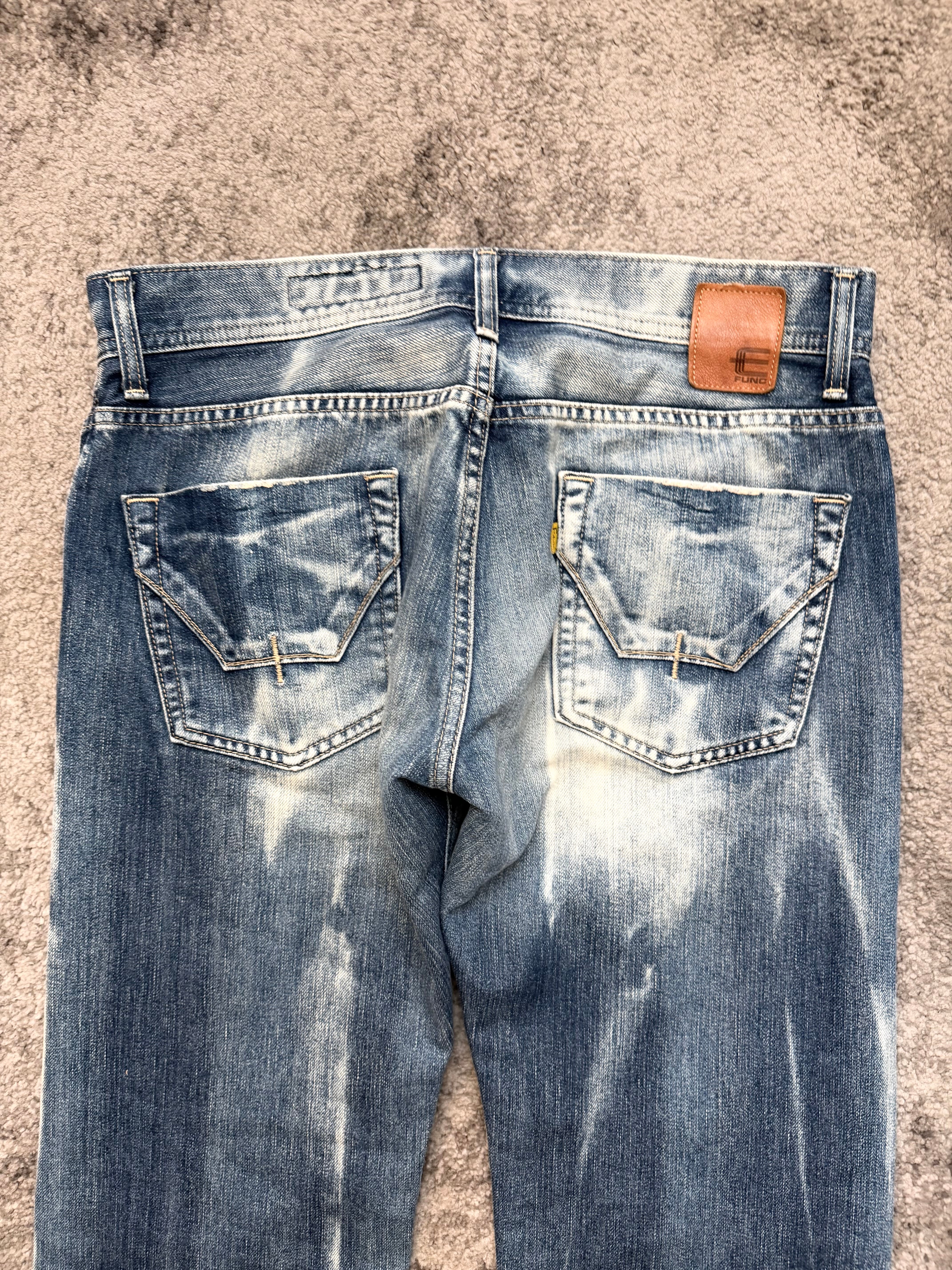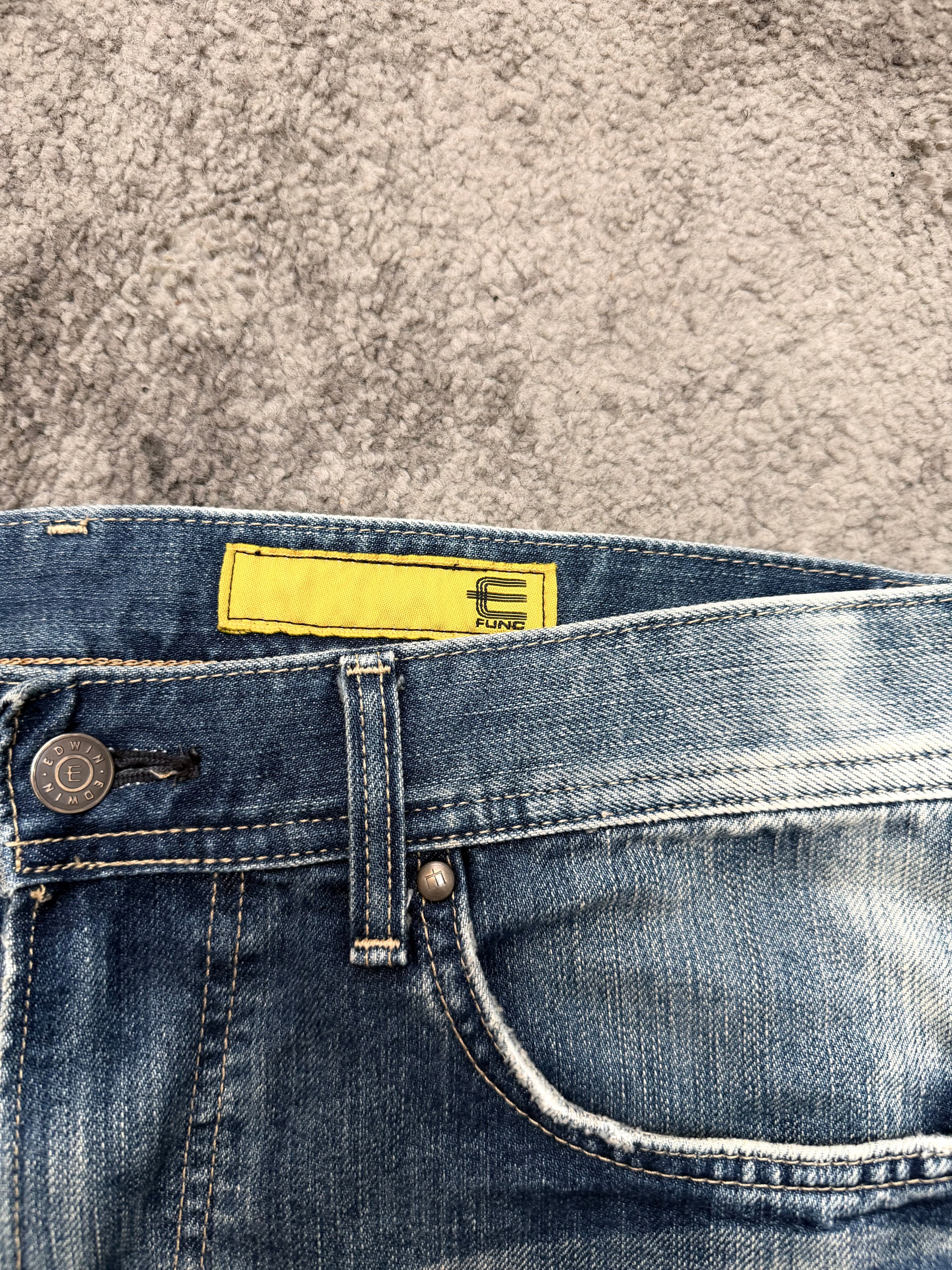 A washed-out dream straight from the heart of Japan’s underground fashion wave. These FUNC archive jeans carry that lived-in mystique — the kind of fade only time, movement, and attitude can create. Think Number (N)ine grit meets early-2000s Harajuku rebellion — denim shaped by youth, concrete, and late-night guitar feedback.