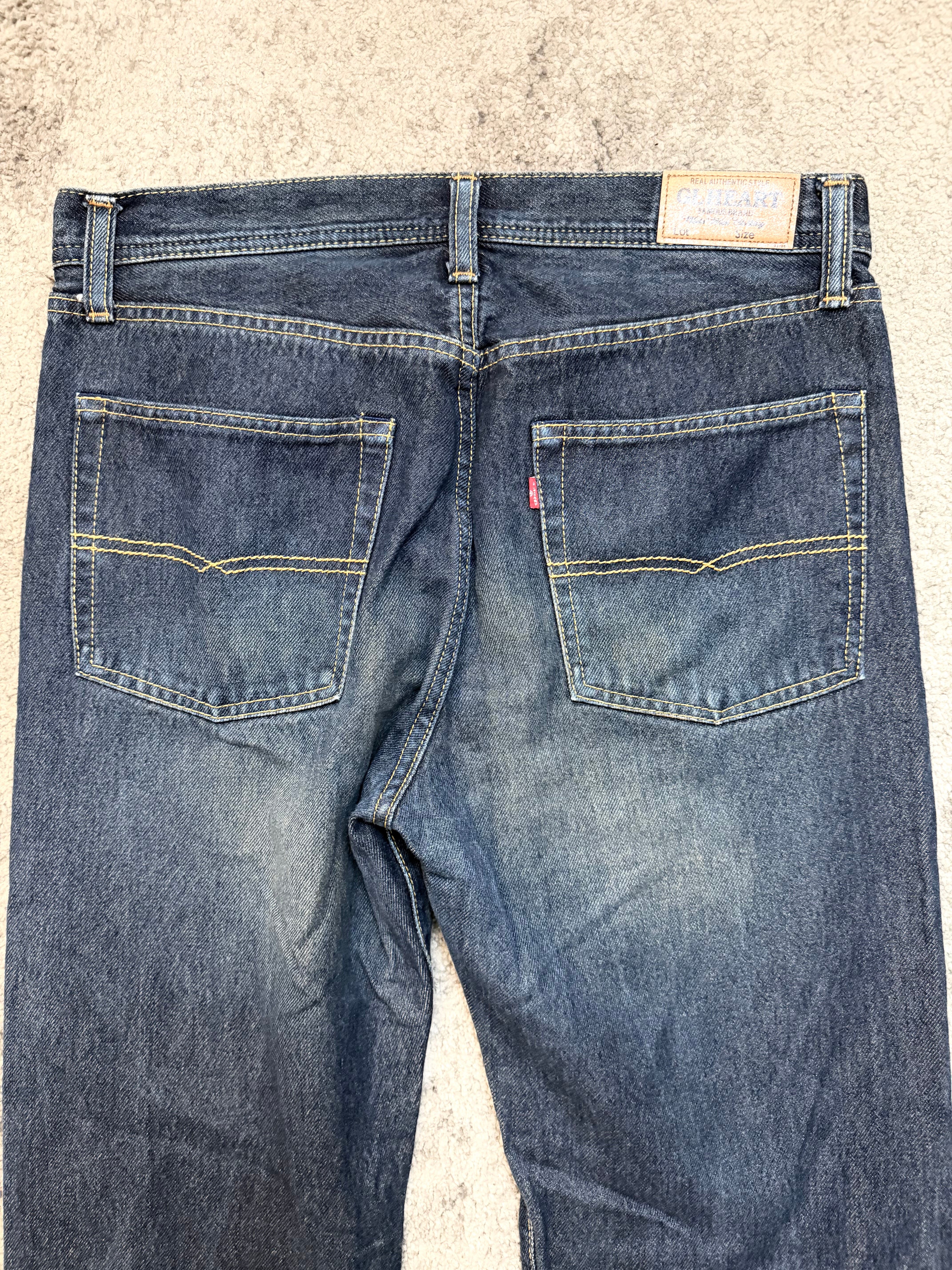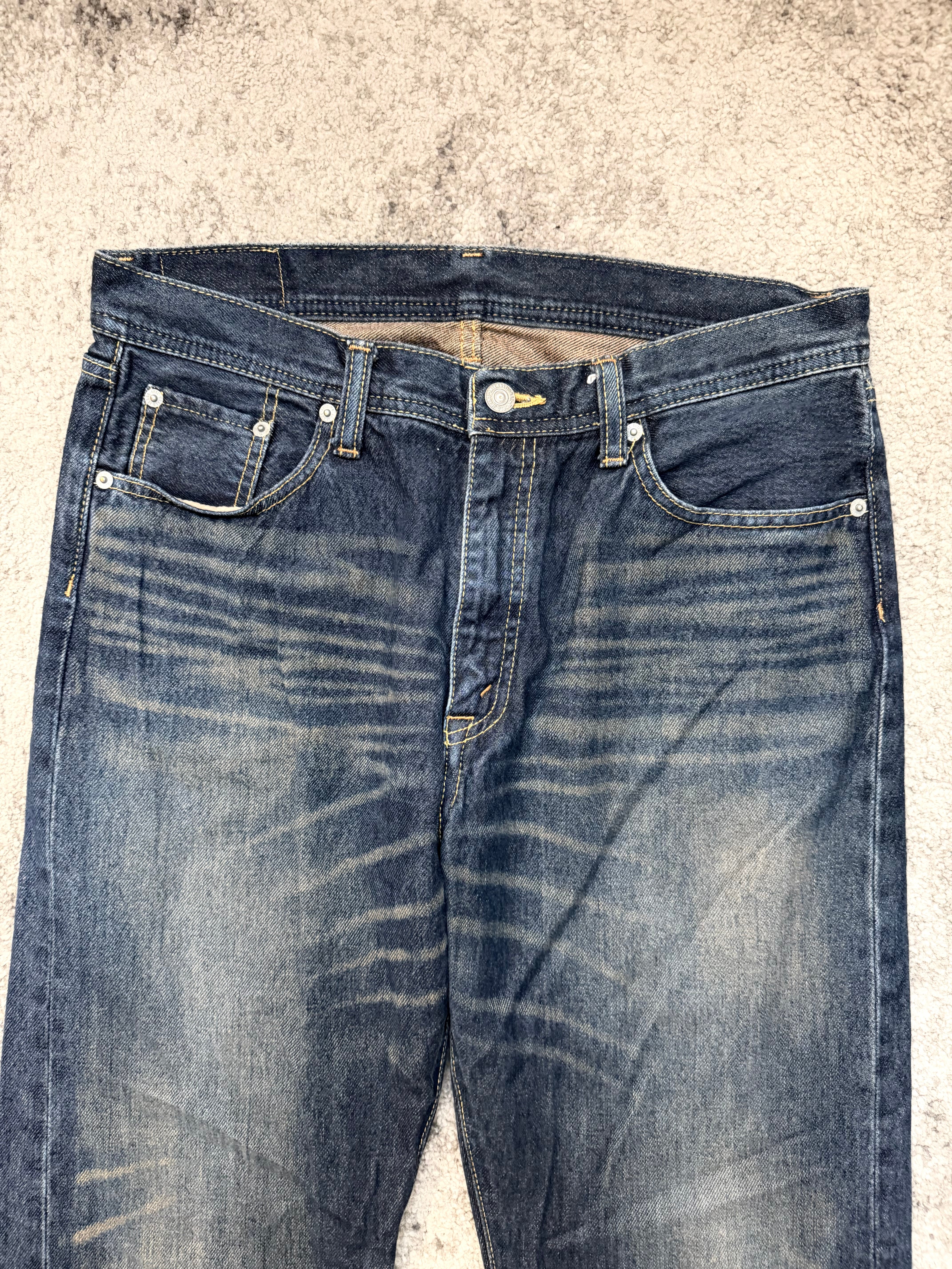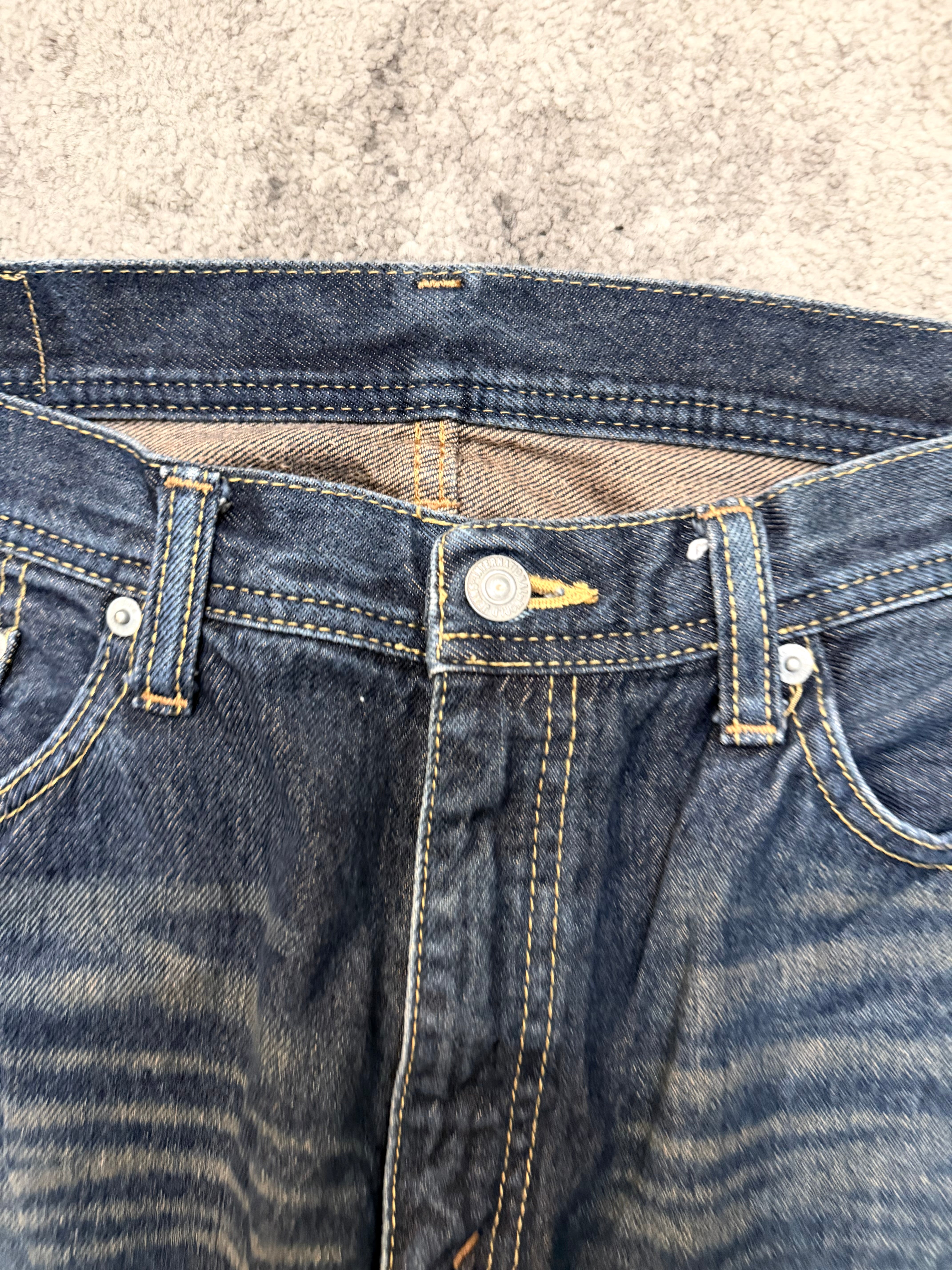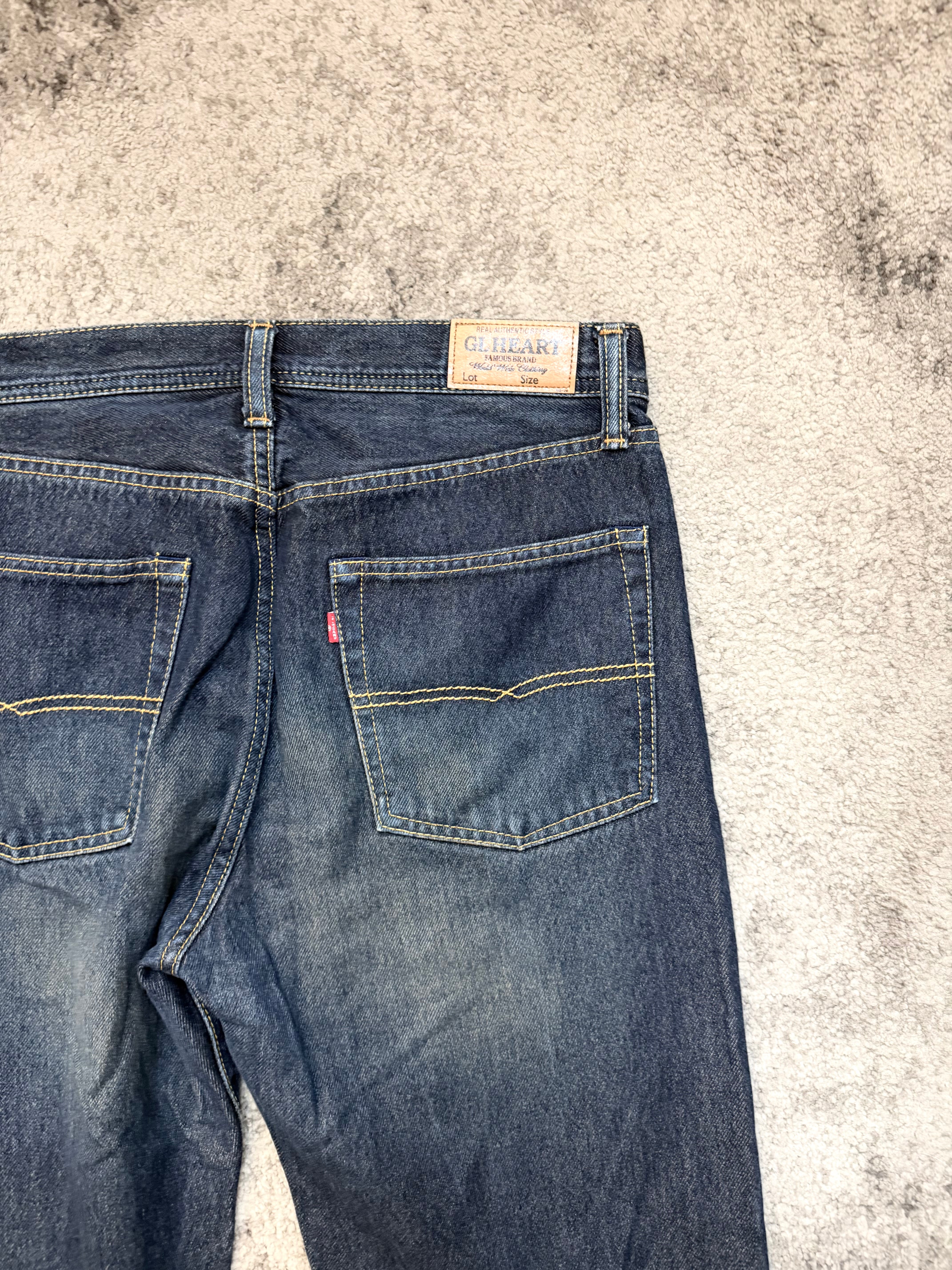 This pair from GLHEART captures the quiet strength of early Japanese denim — minimal, durable, and deeply considered. The dark indigo wash has aged beautifully, showing gentle fading and natural creasing through the thighs and knees. It’s the kind of denim that feels honest — built to be worn, not displayed.