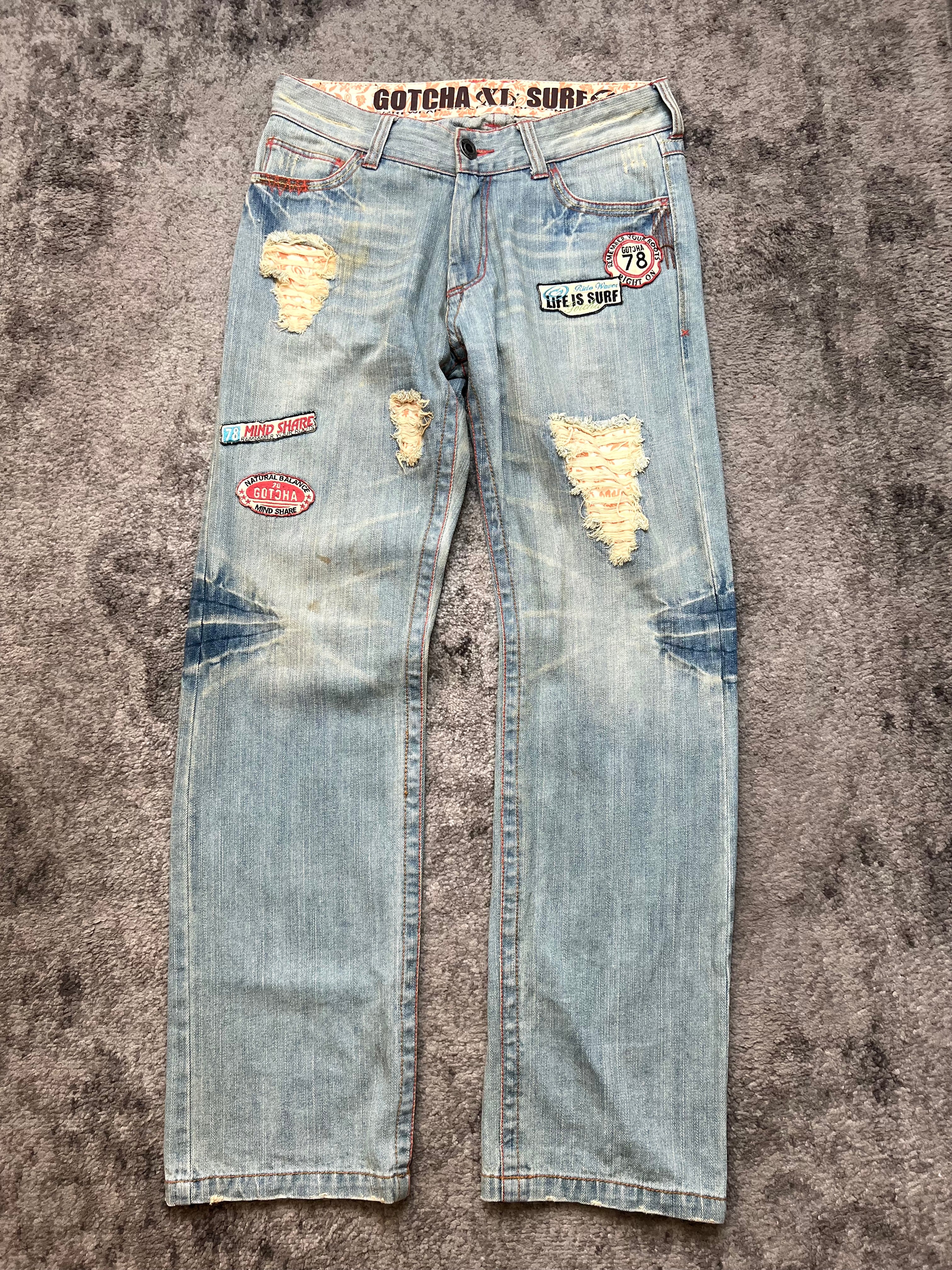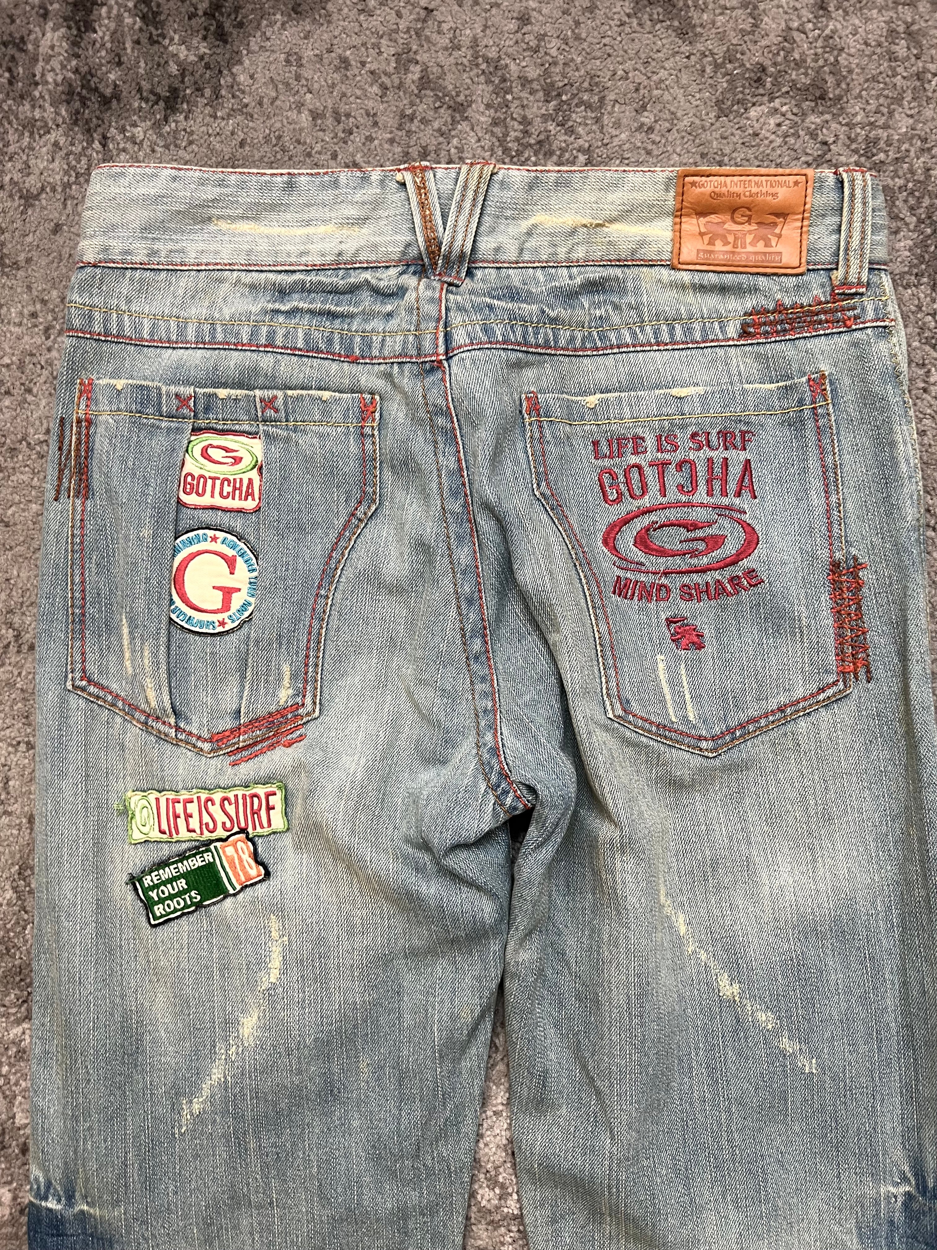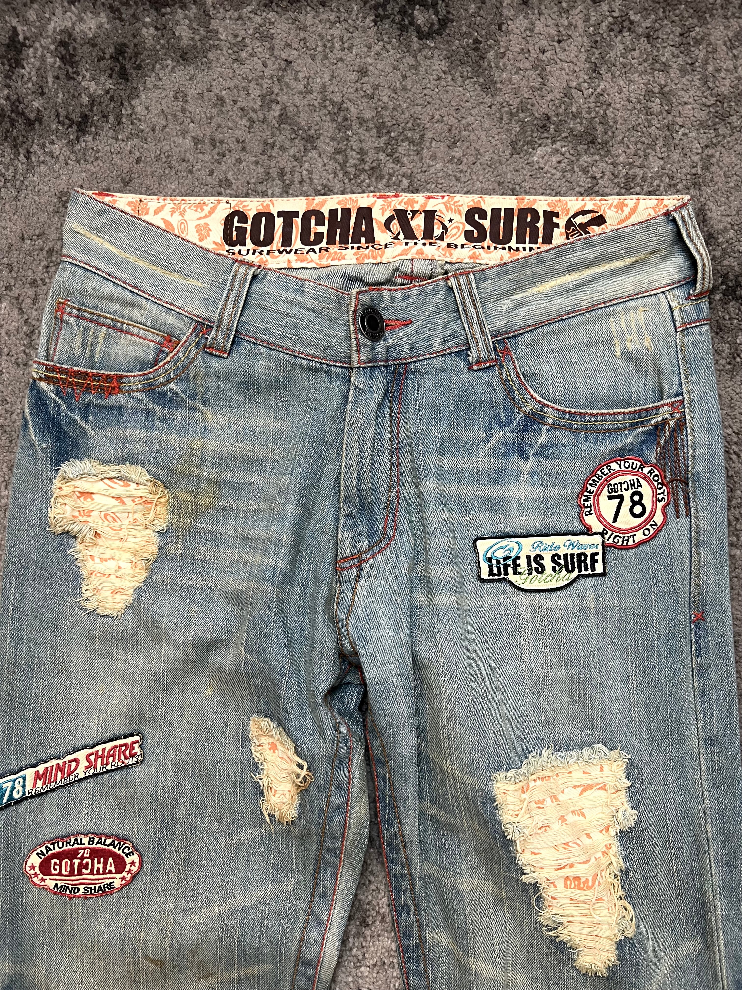 A rare expression of GOTCHA’s early 2000s surf-inspired aesthetic — light-wash Japanese denim, heavily distressed and patched with signature embroidery and printed surf badges. Every tear, fade, and stitch adds to its authentic vintage charm, carrying that unmistakable sun-faded, coastal vibe.