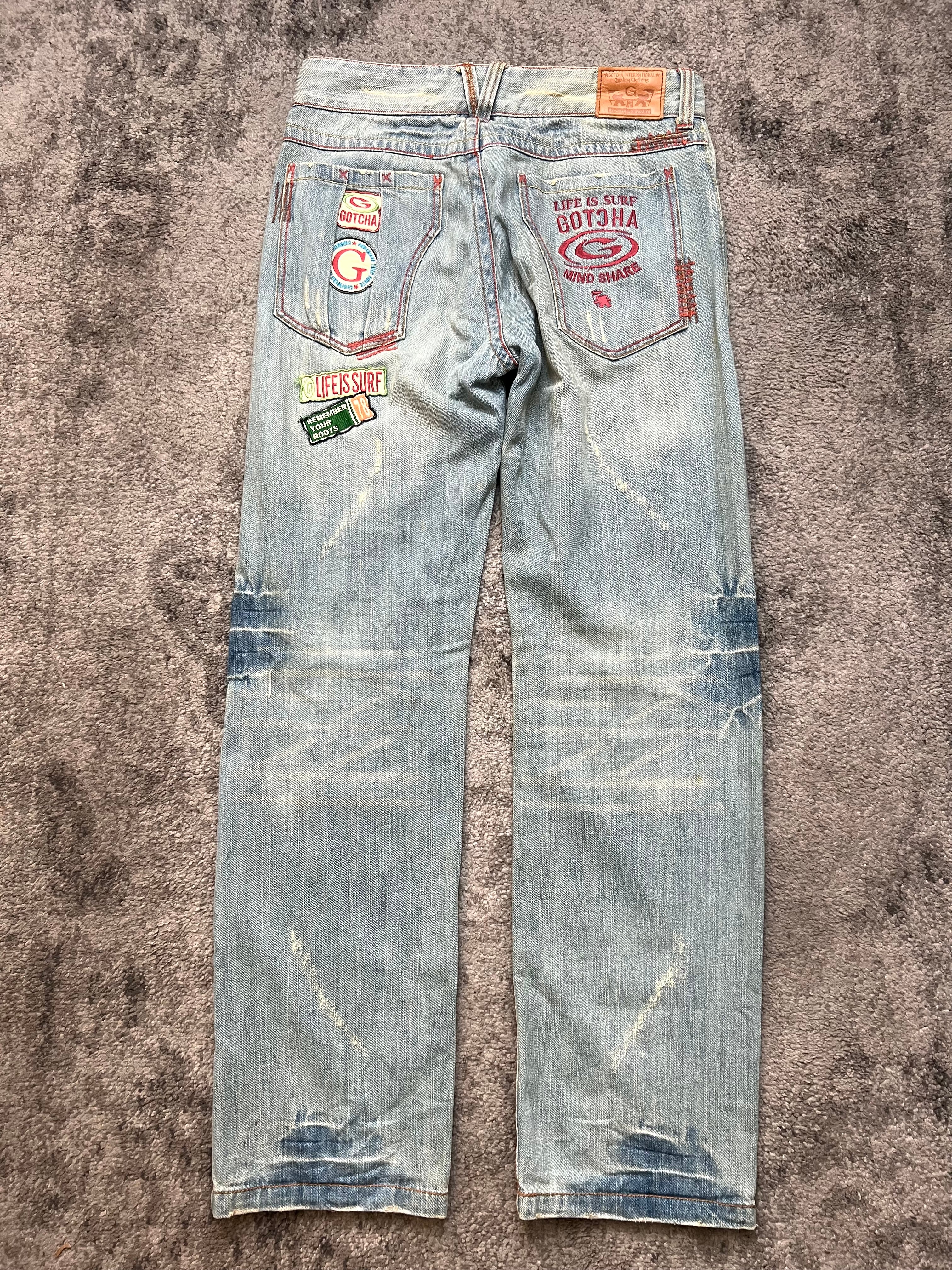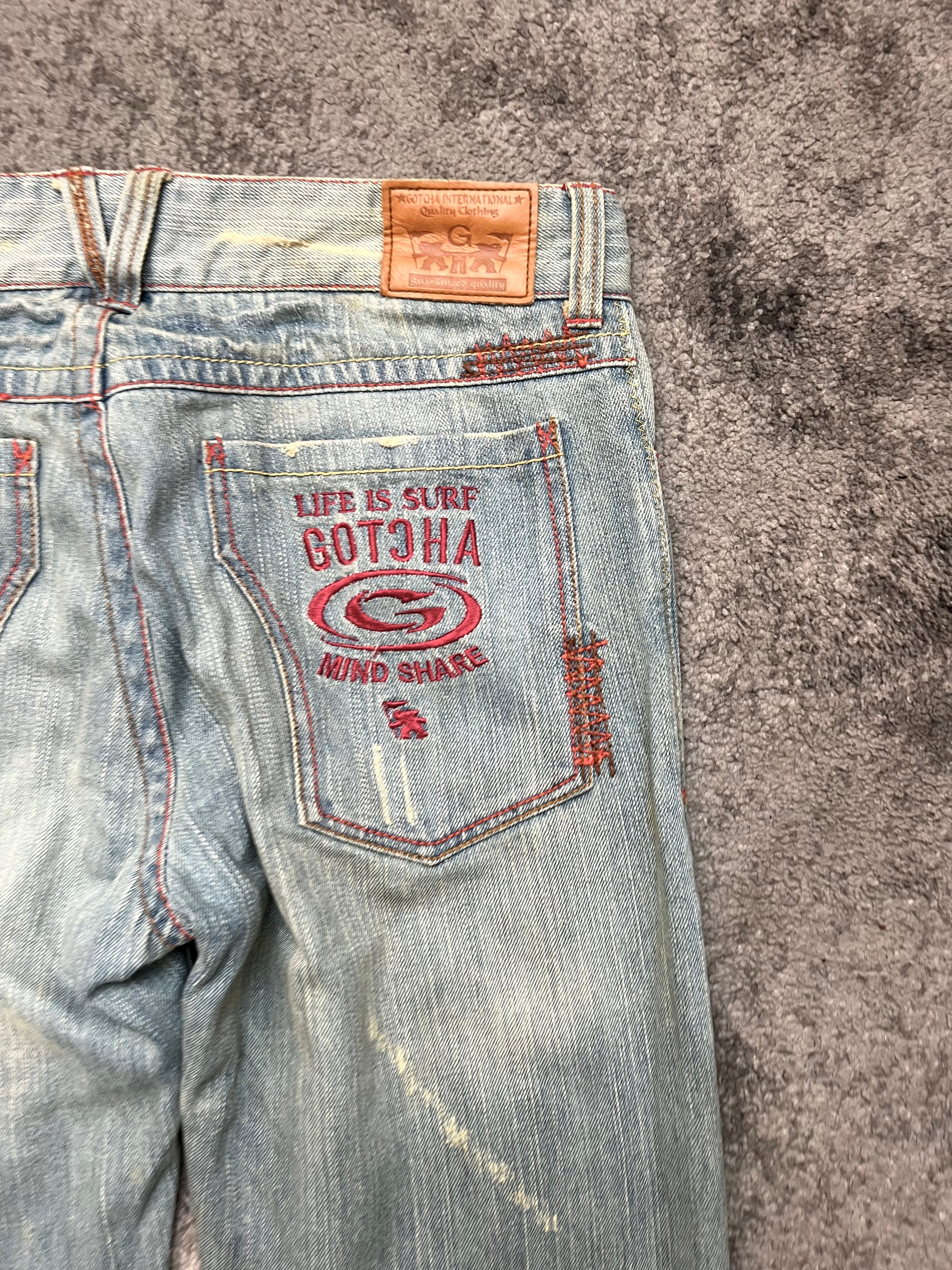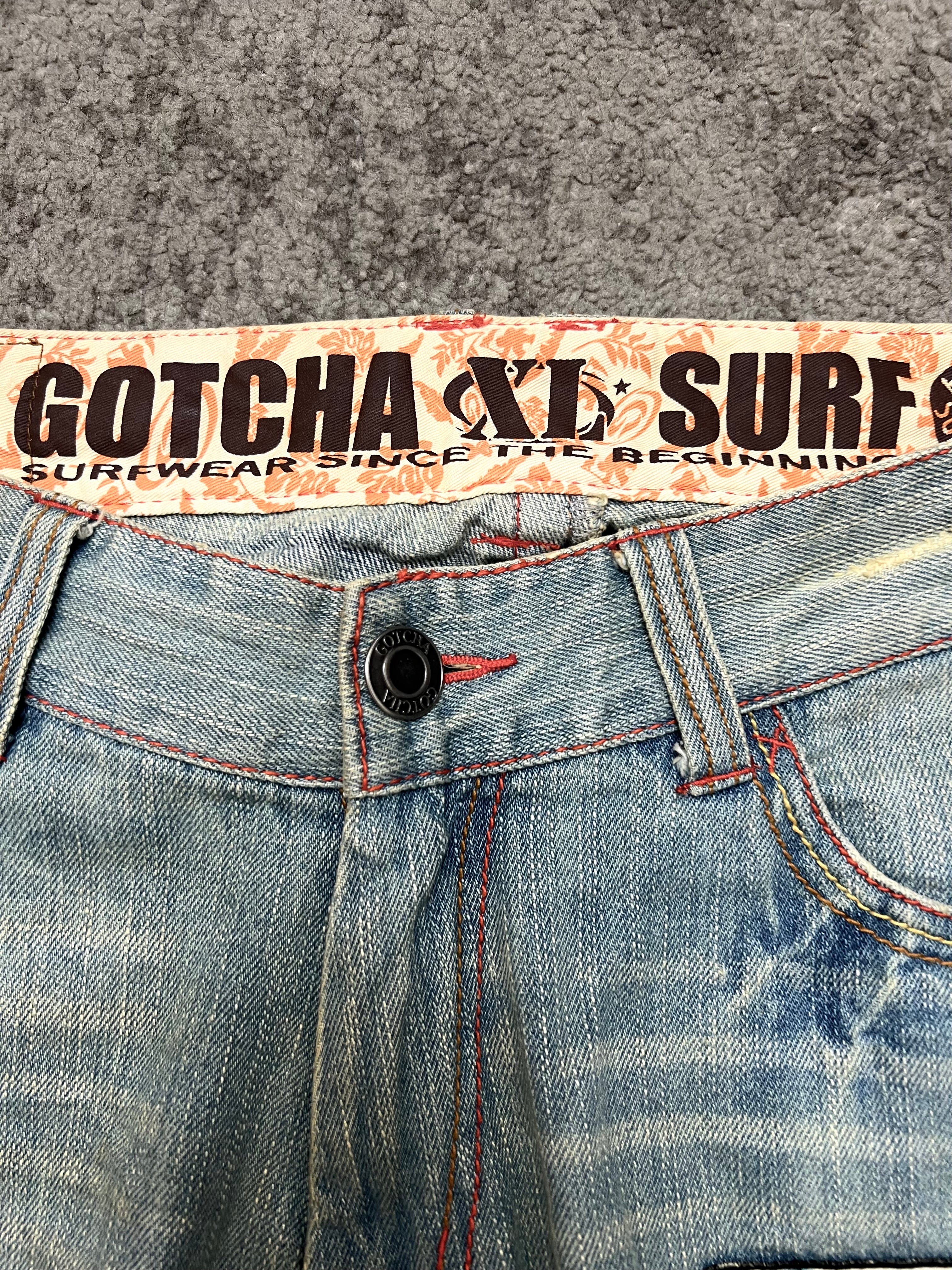 A rare expression of GOTCHA’s early 2000s surf-inspired aesthetic — light-wash Japanese denim, heavily distressed and patched with signature embroidery and printed surf badges. Every tear, fade, and stitch adds to its authentic vintage charm, carrying that unmistakable sun-faded, coastal vibe.