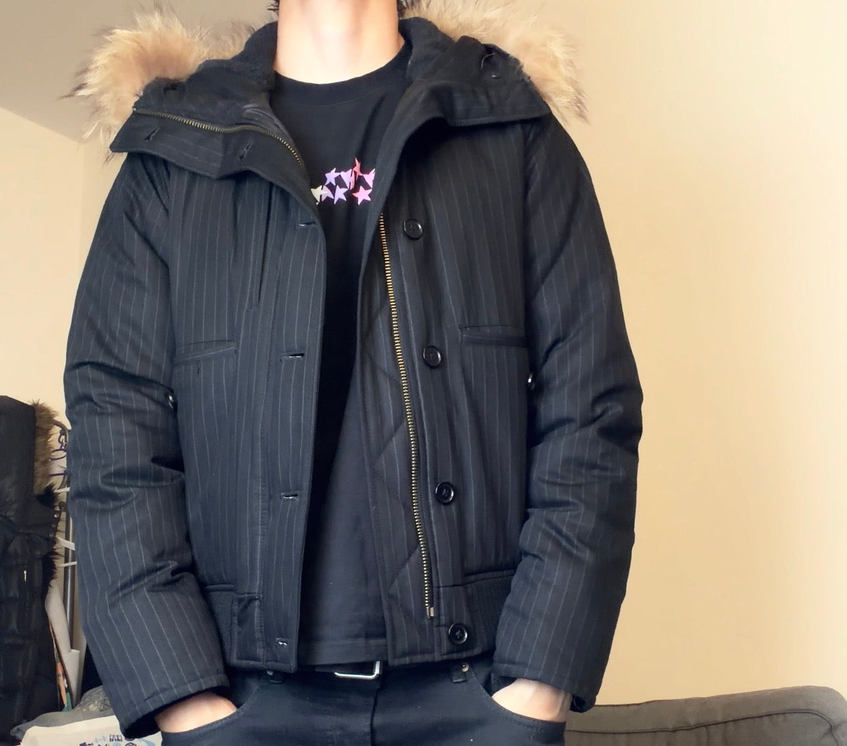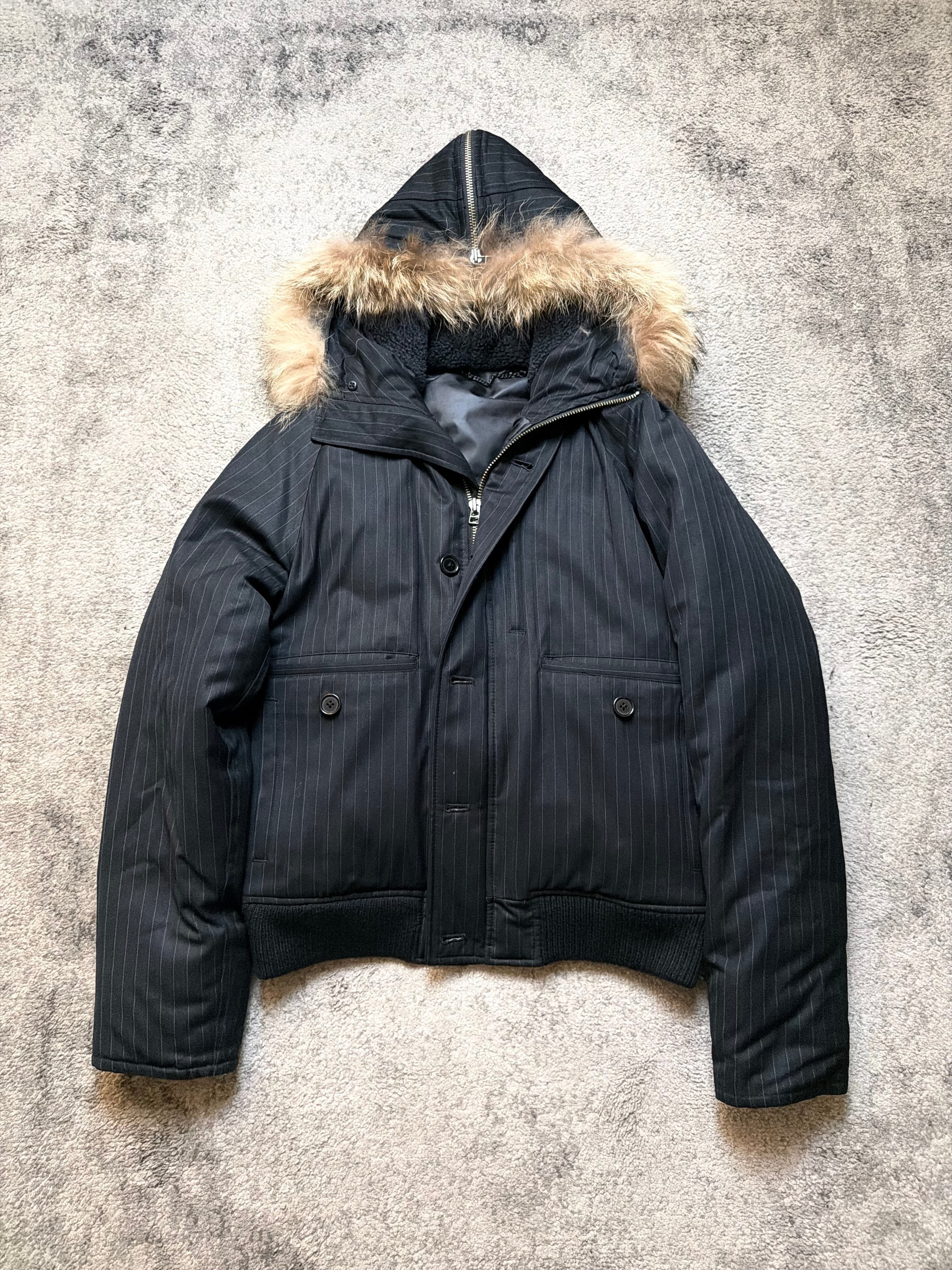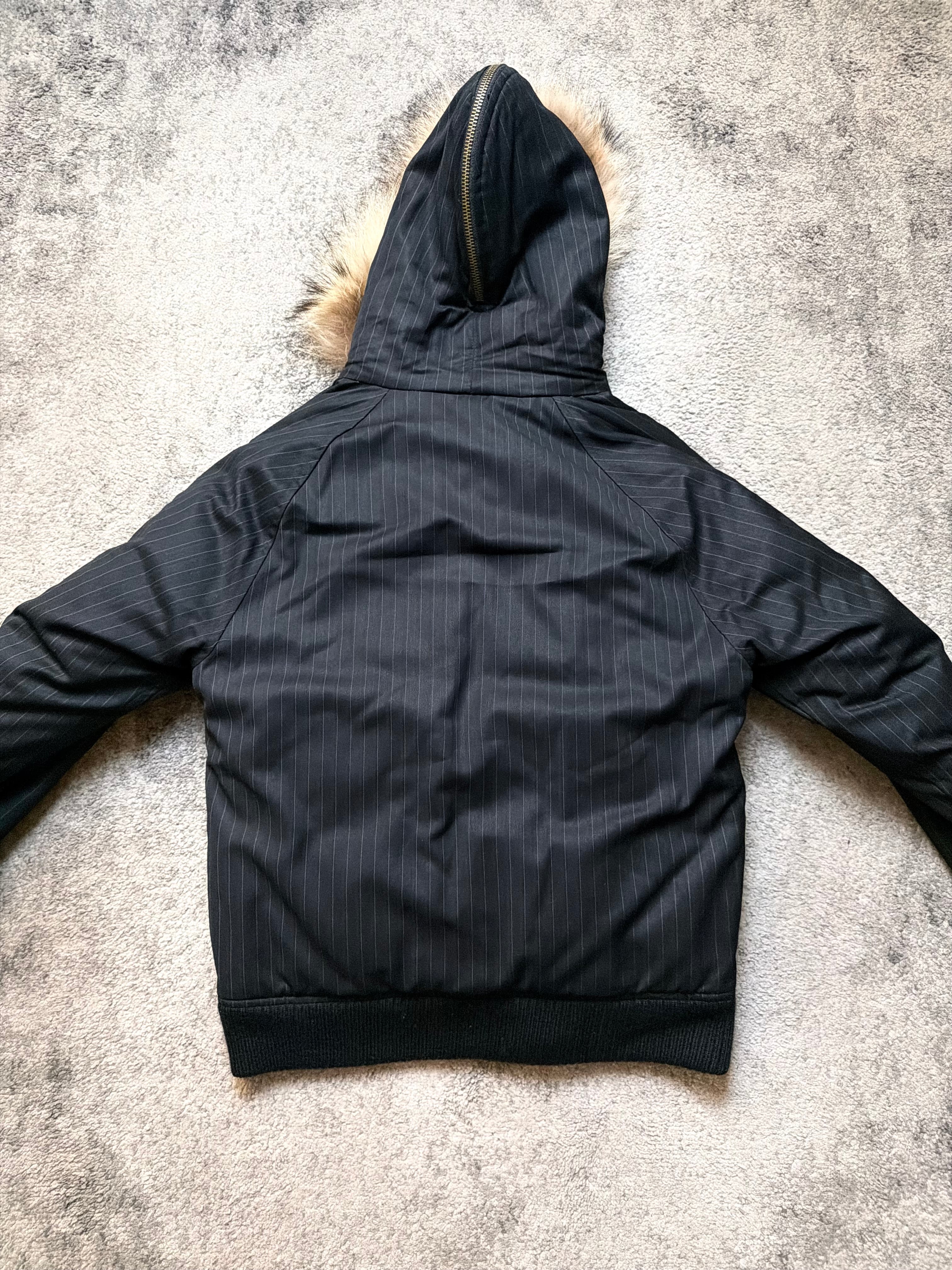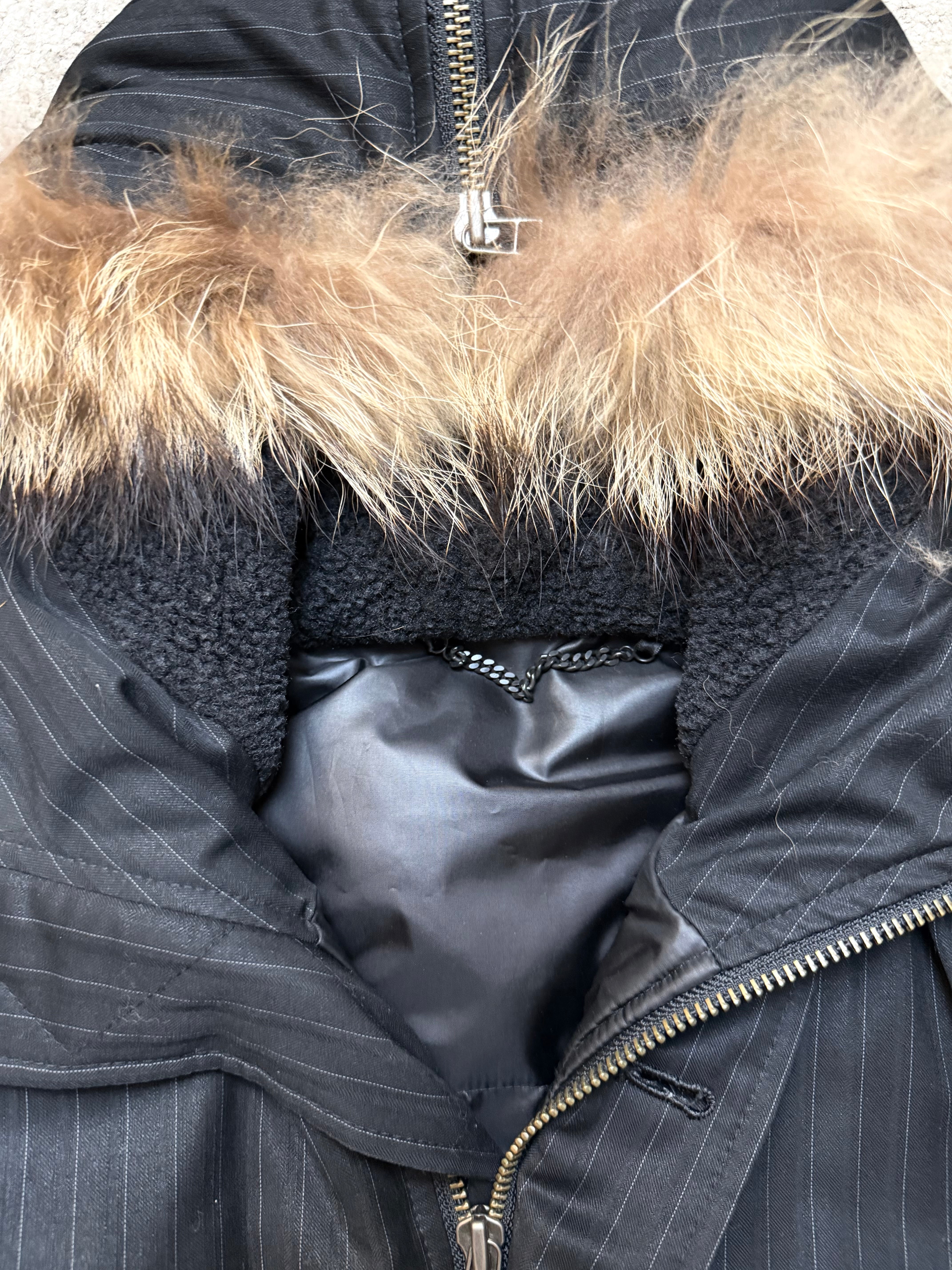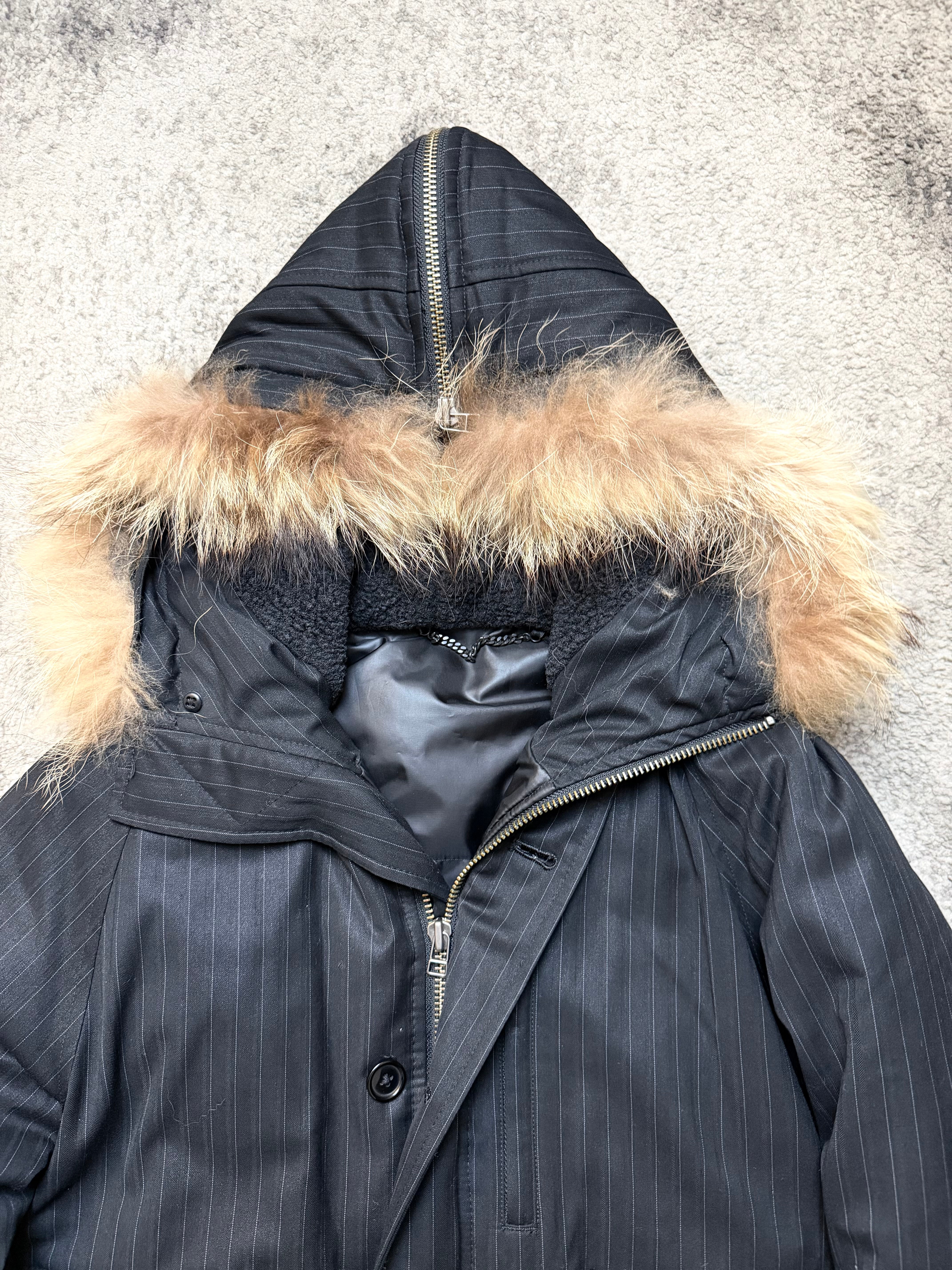 Crafted from a matte pinstripe wool-blend shell, this jacket delivers a unique contrast: sharp suiting aesthetics wrapped around a padded, street-ready silhouette. The removable faux-fur hood lining adds warmth and attitude — a detail that feels both vintage and avant-garde.