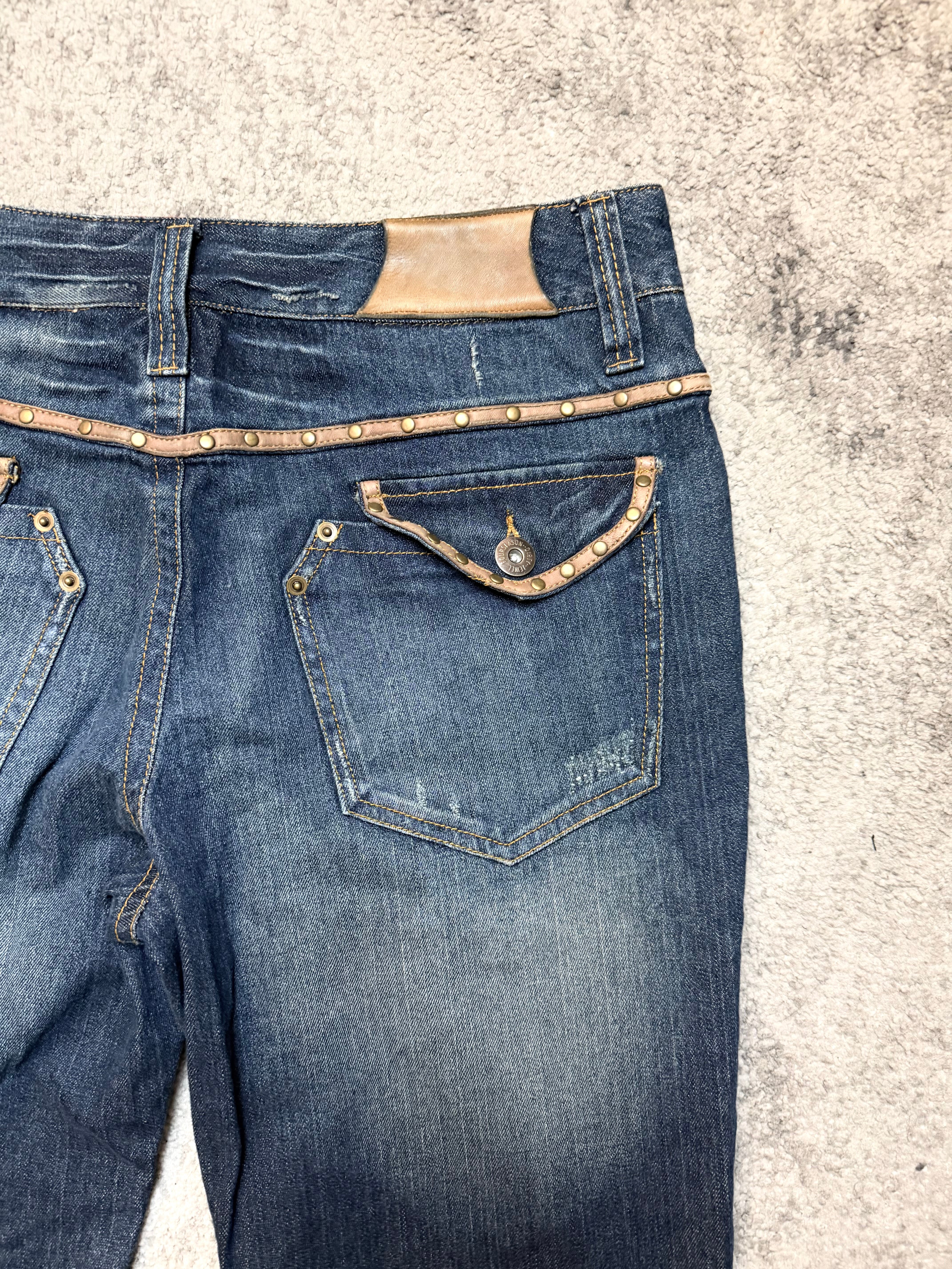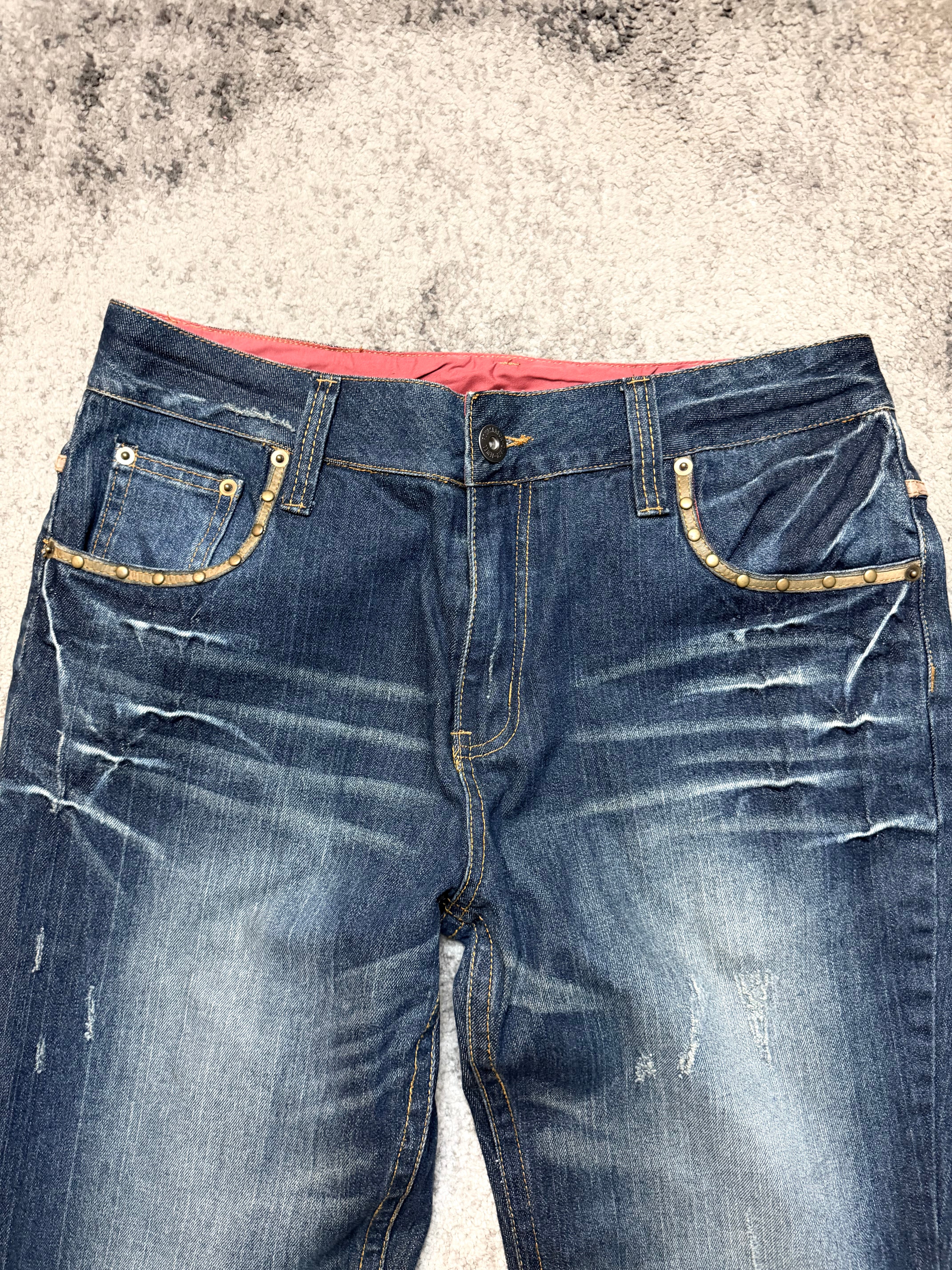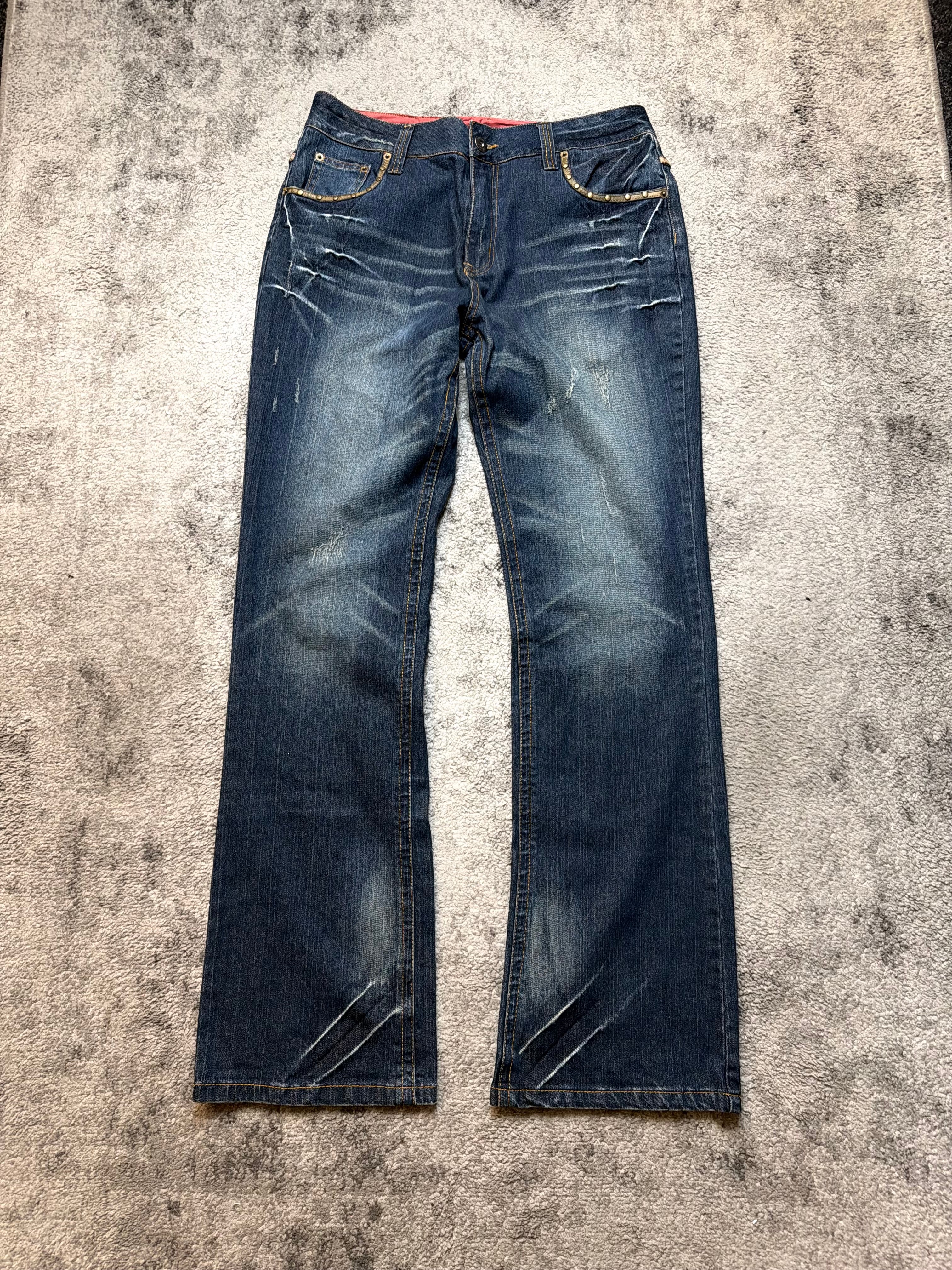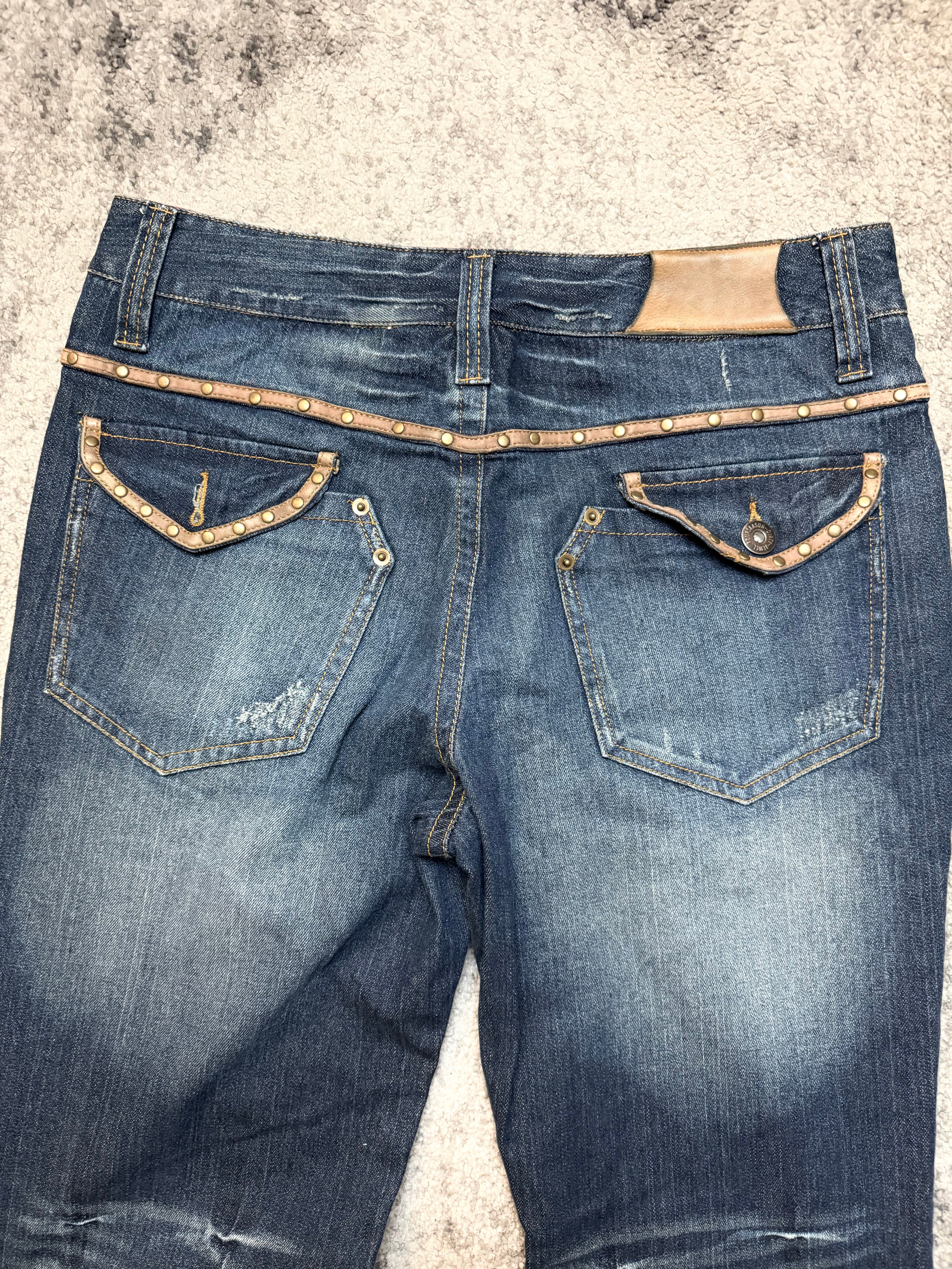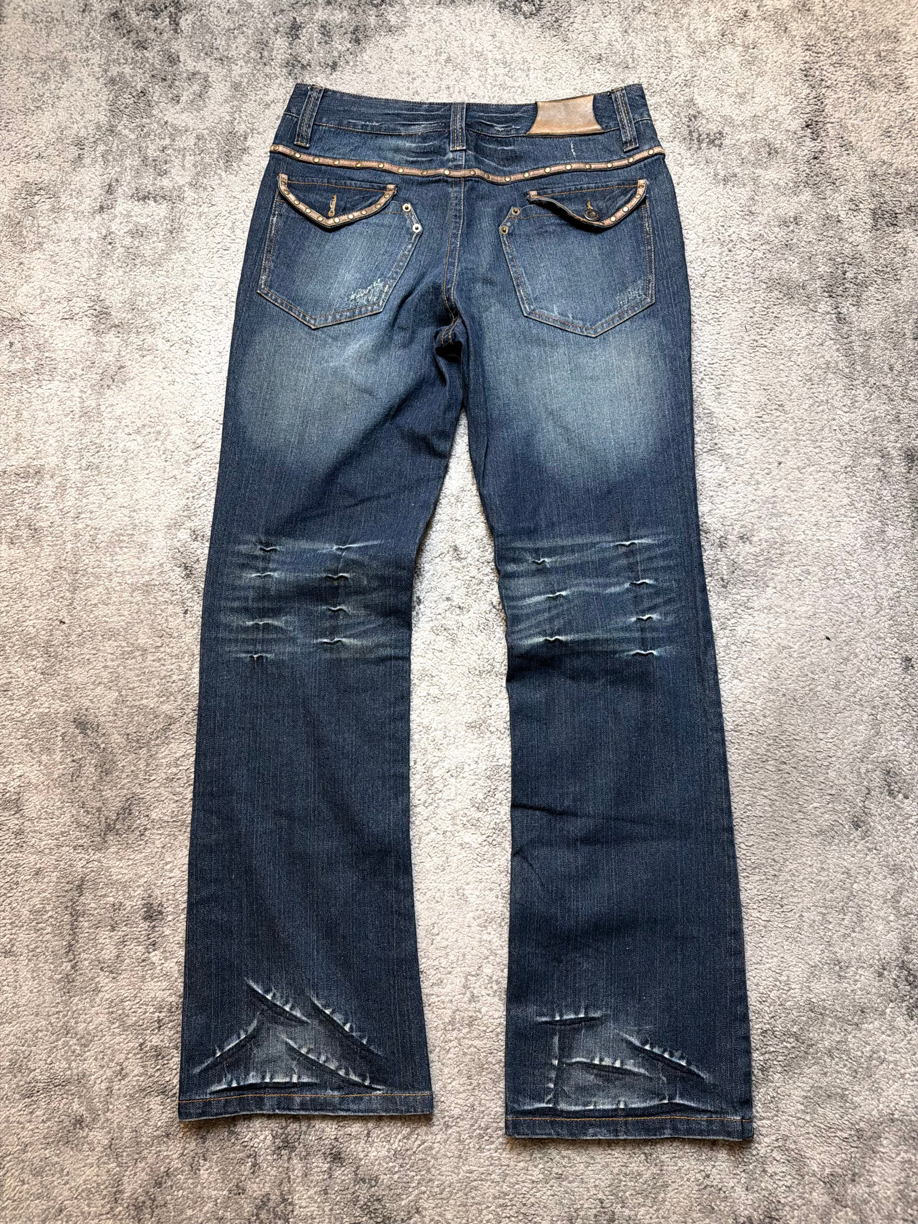 Straight silhouette with a subtle flare, built for people who drift between host-core glam and 2000s Shibuya grit. Front whiskers and scattered micro-distress create that lived-in, lived-through texture. Back shows intense crease storms around the knees and hems – real archive energy.