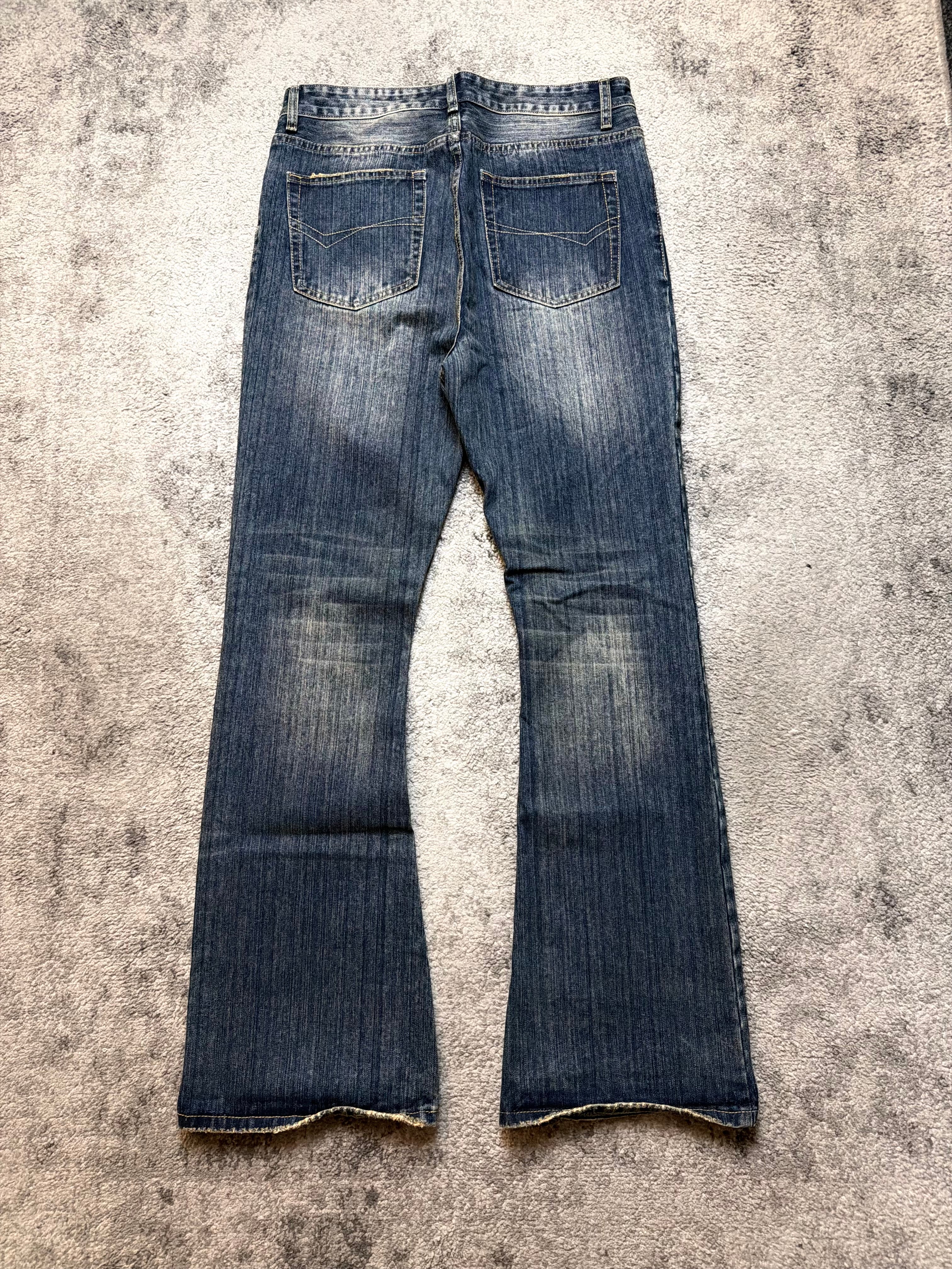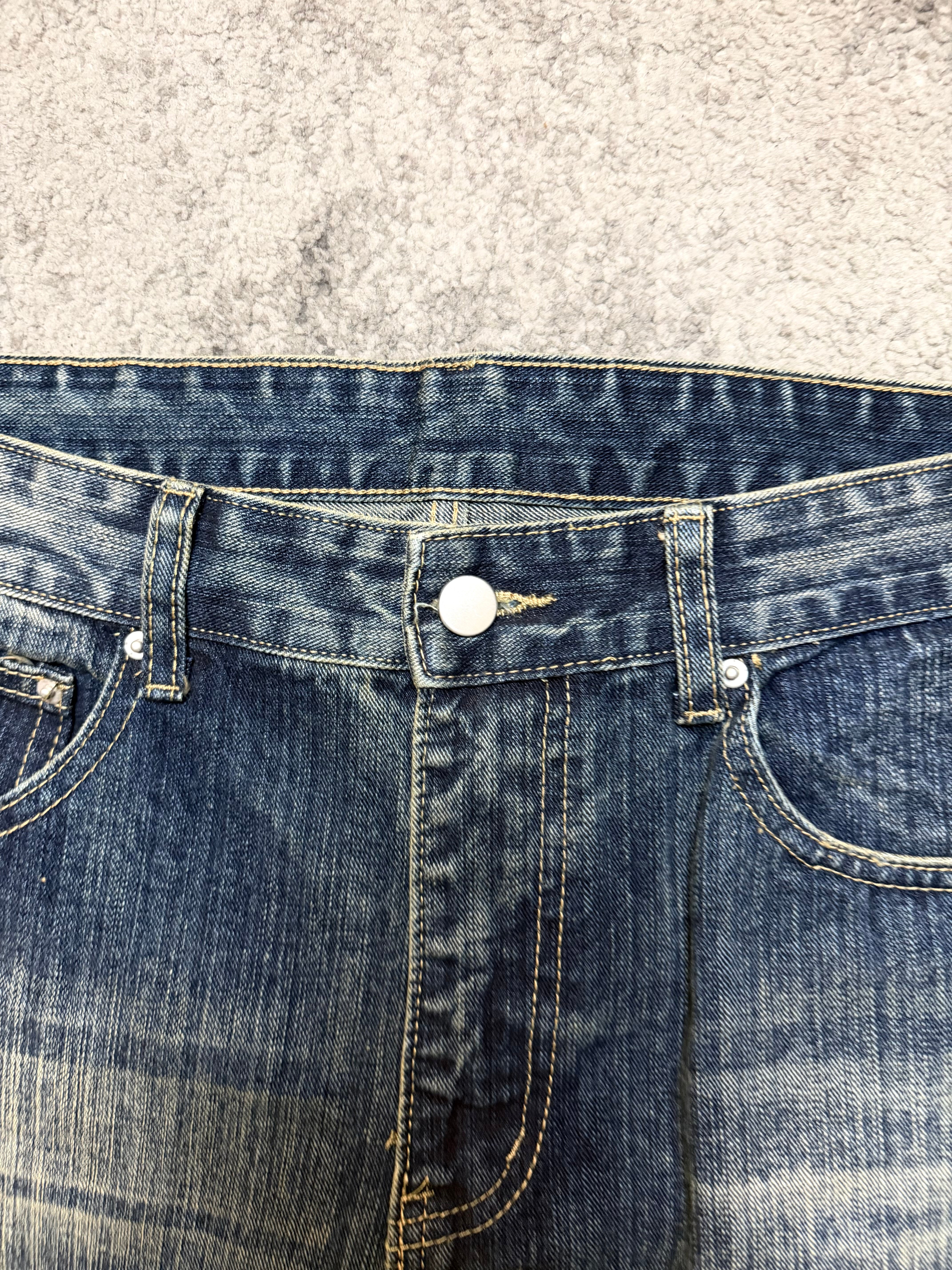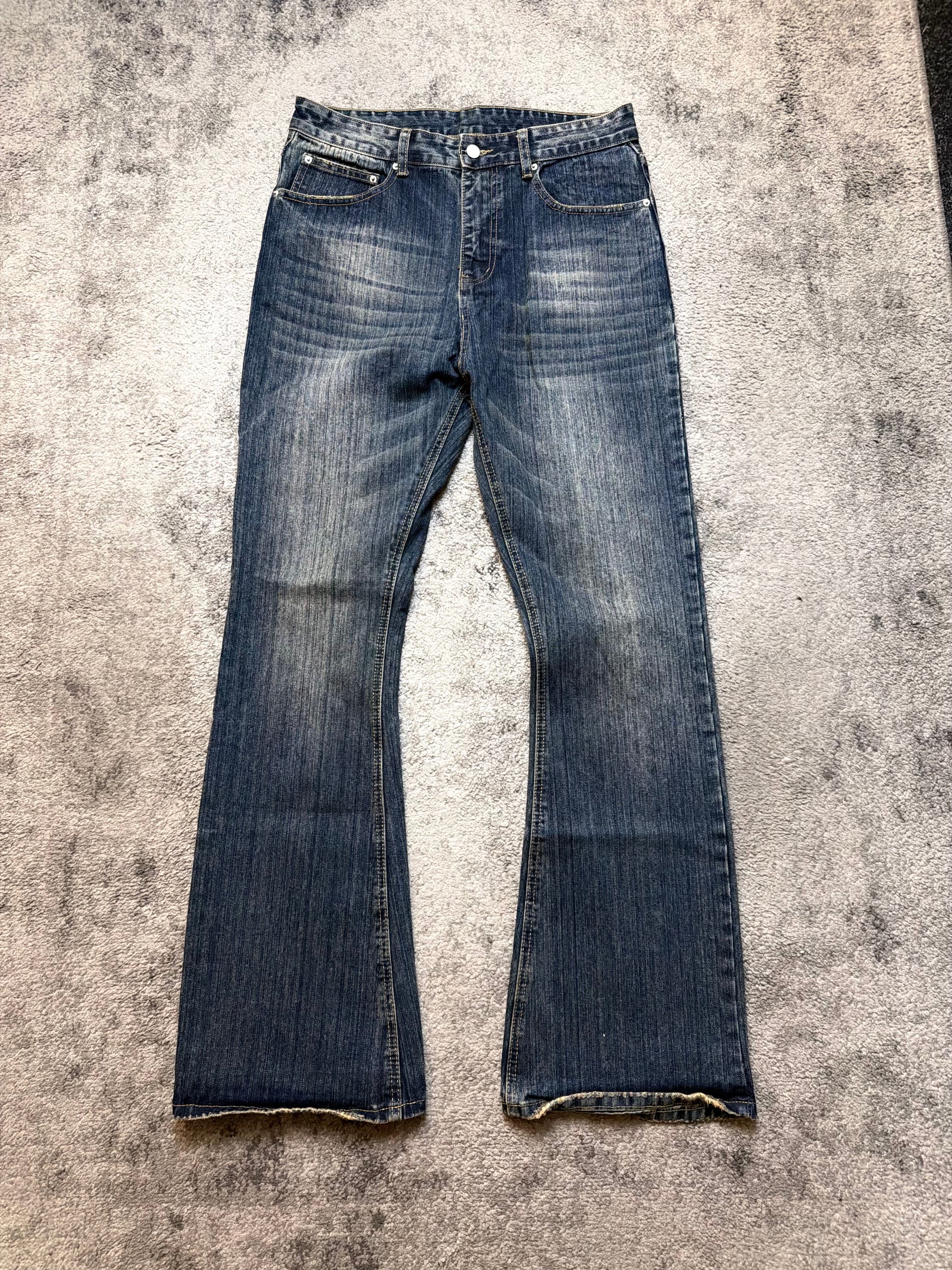 HEISEI “Blue Static Echoes” Denim – built for nights that hum like old amps and alleyway neon. Washed to a ghost-blue tone, these jeans carry that soft Japanese archive melancholy—subtle, worn, and honest.
