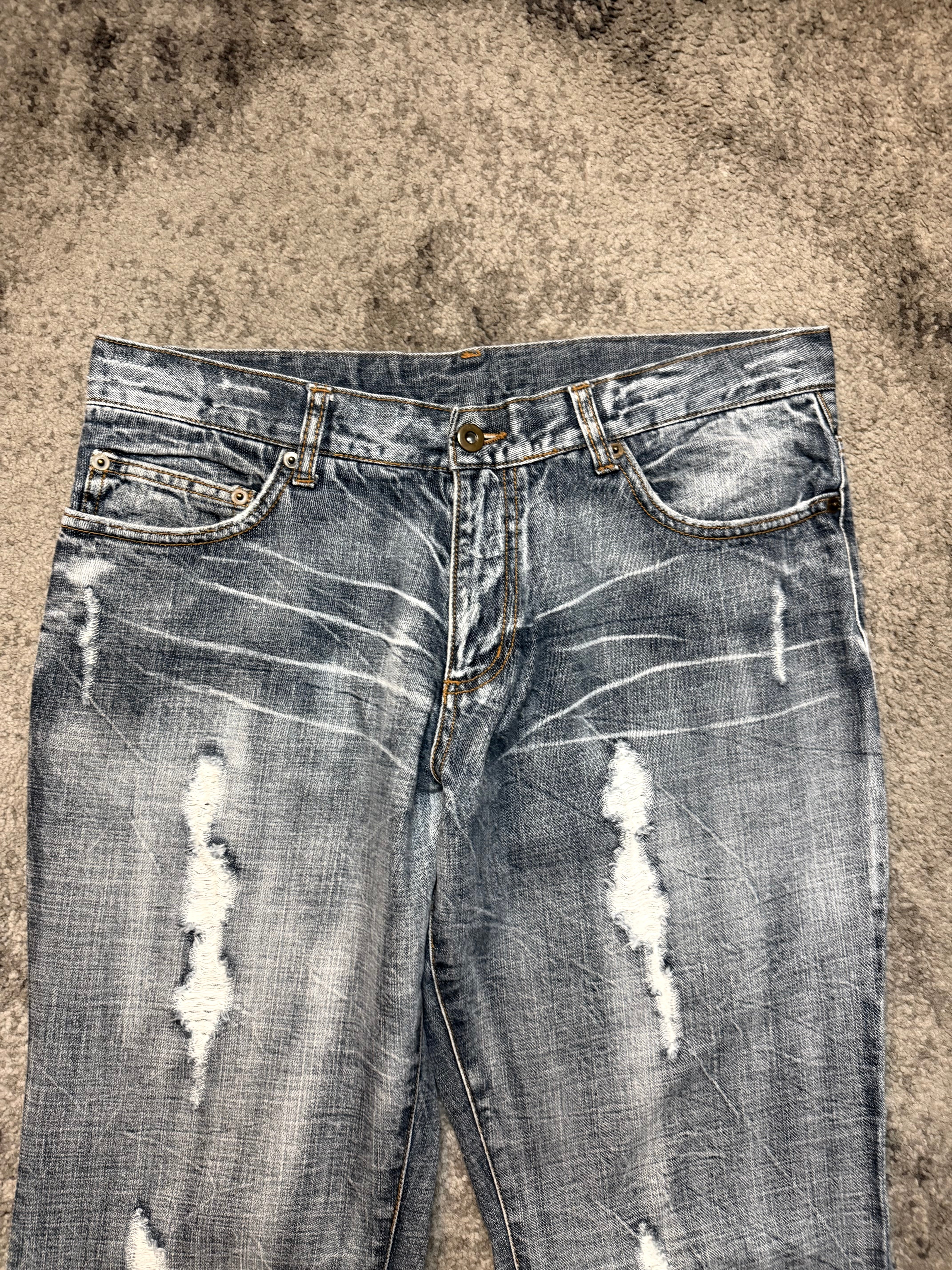 Straight-cut silhouette with uniquely “cracked” whiskering from thigh to hem – a signature Y2K Tokyo look. The light-denim wash gives them that effortless host-core glow: lived, loved, and ready for the next night out.
