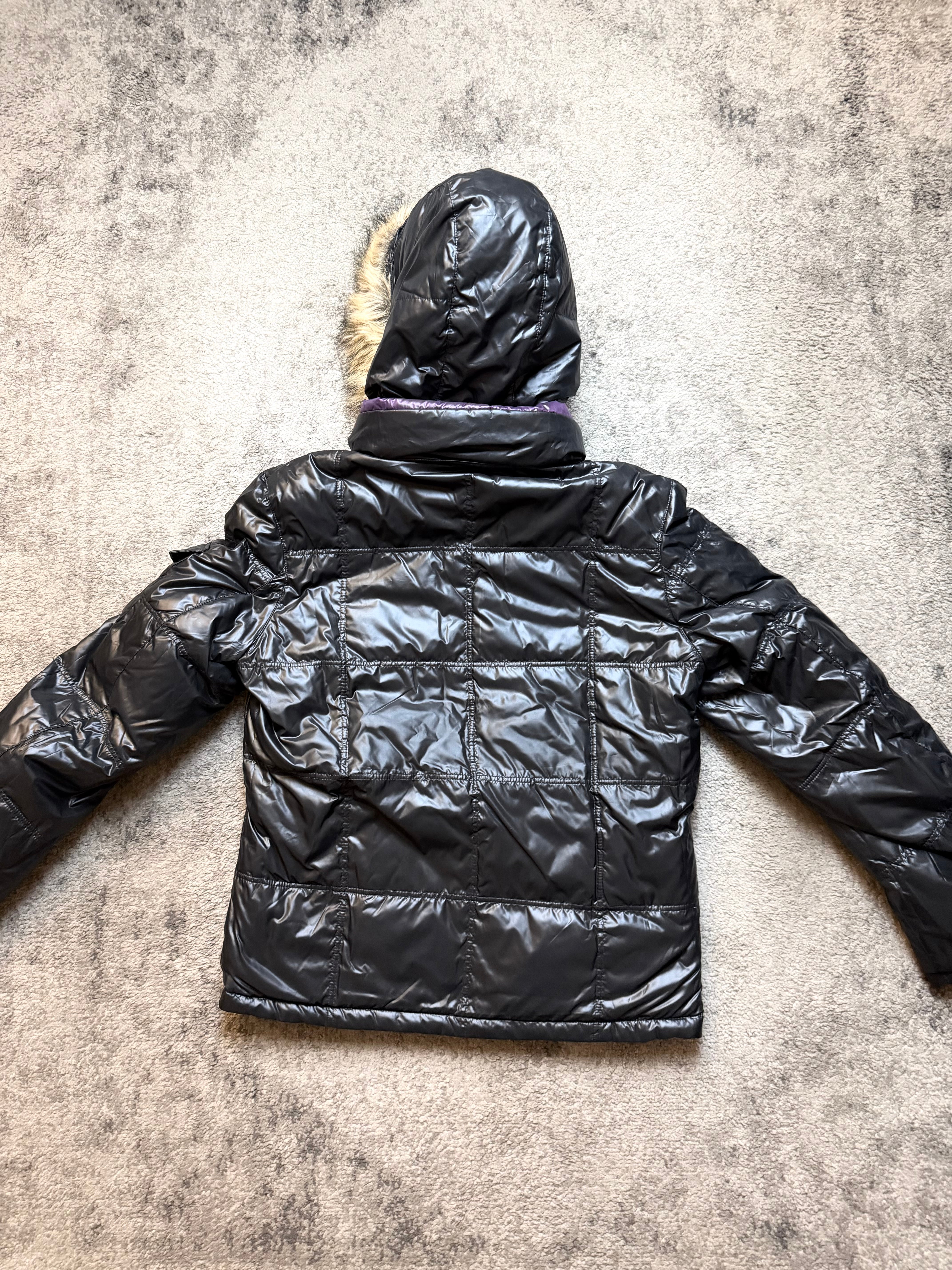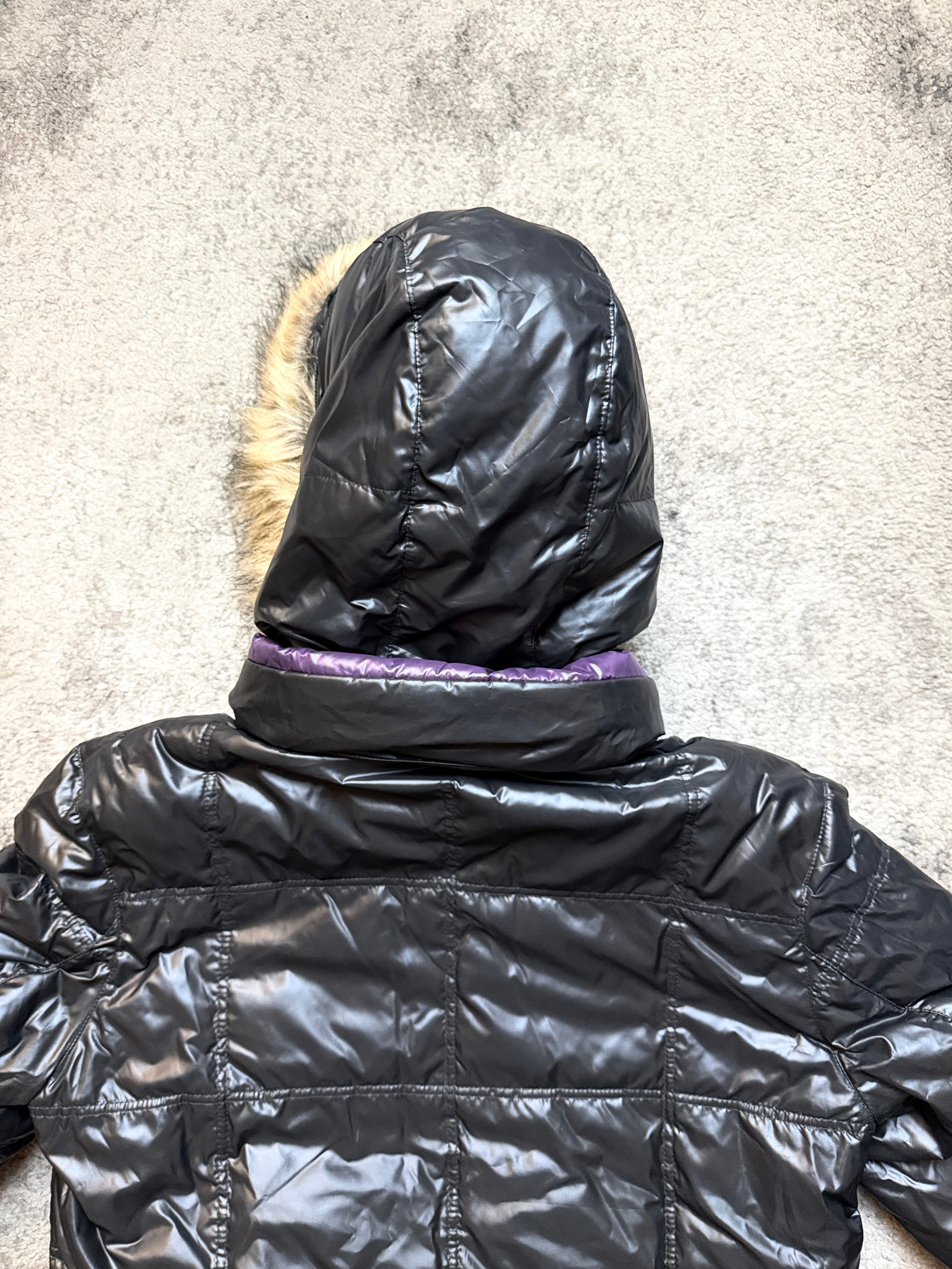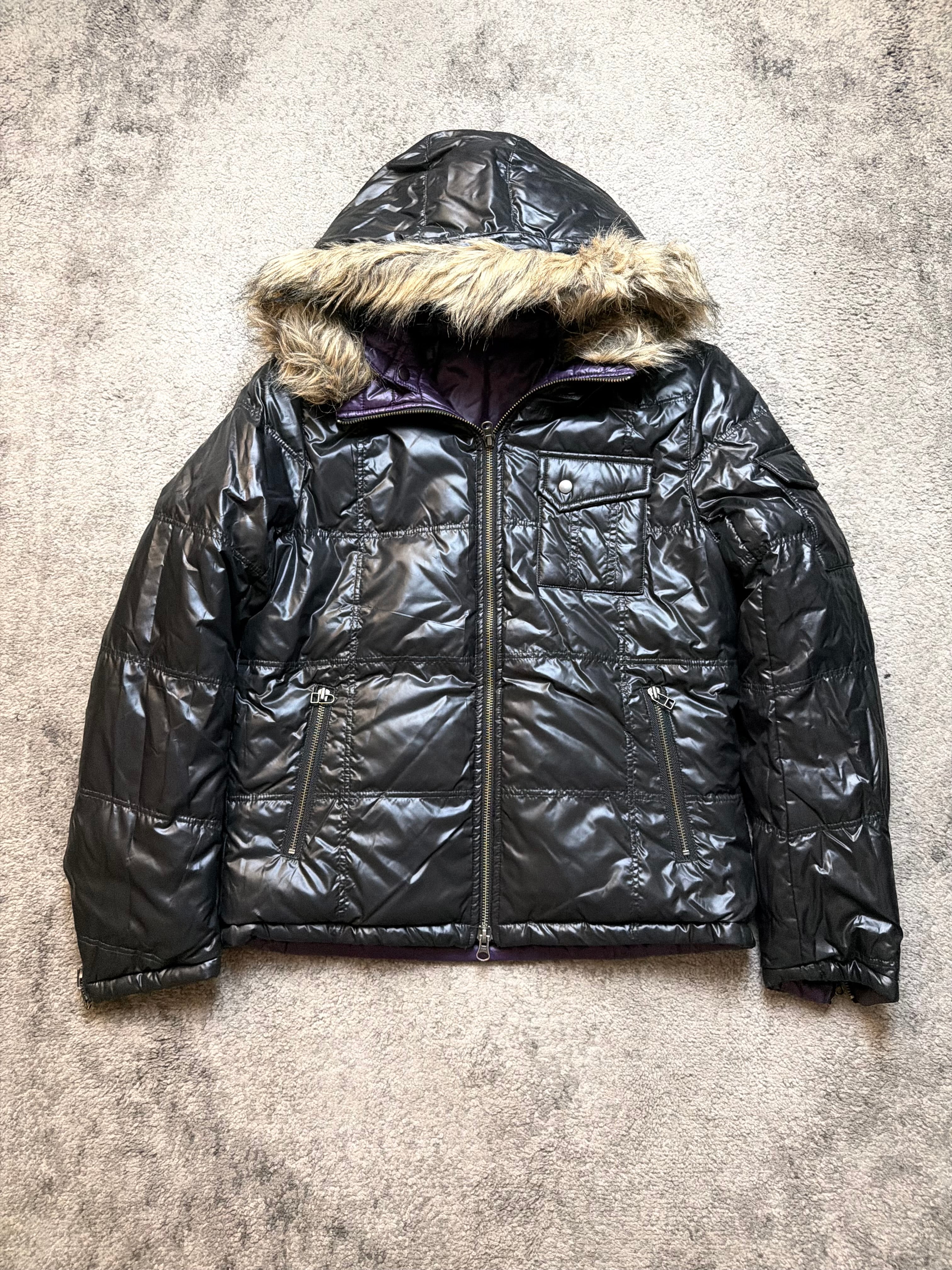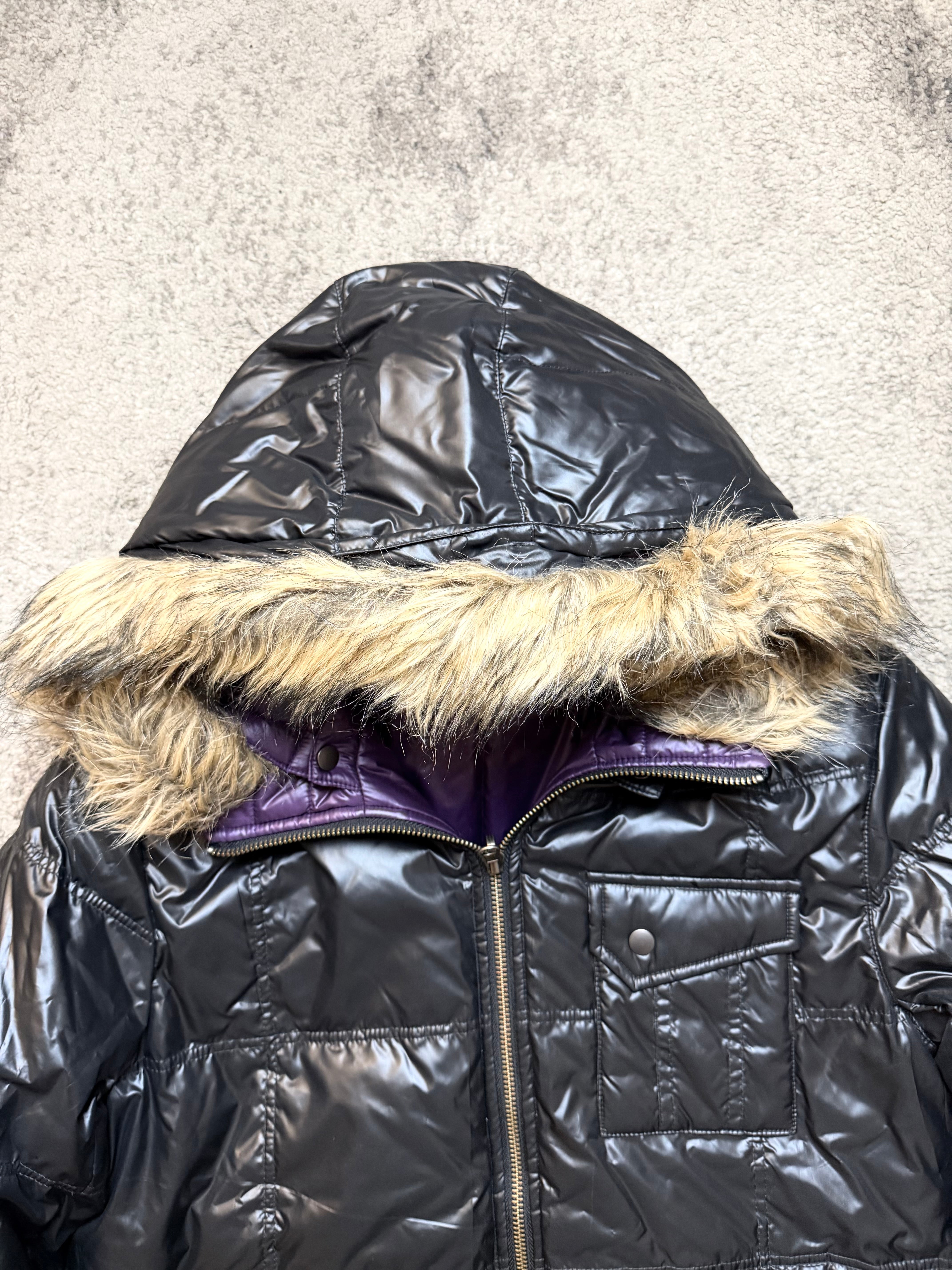 A glossy, midnight-black winter shell built like something straight out of a lost Harajuku archive. Soft faux-fur hood trim, violet inner lining peeking out like a quiet rebellion.