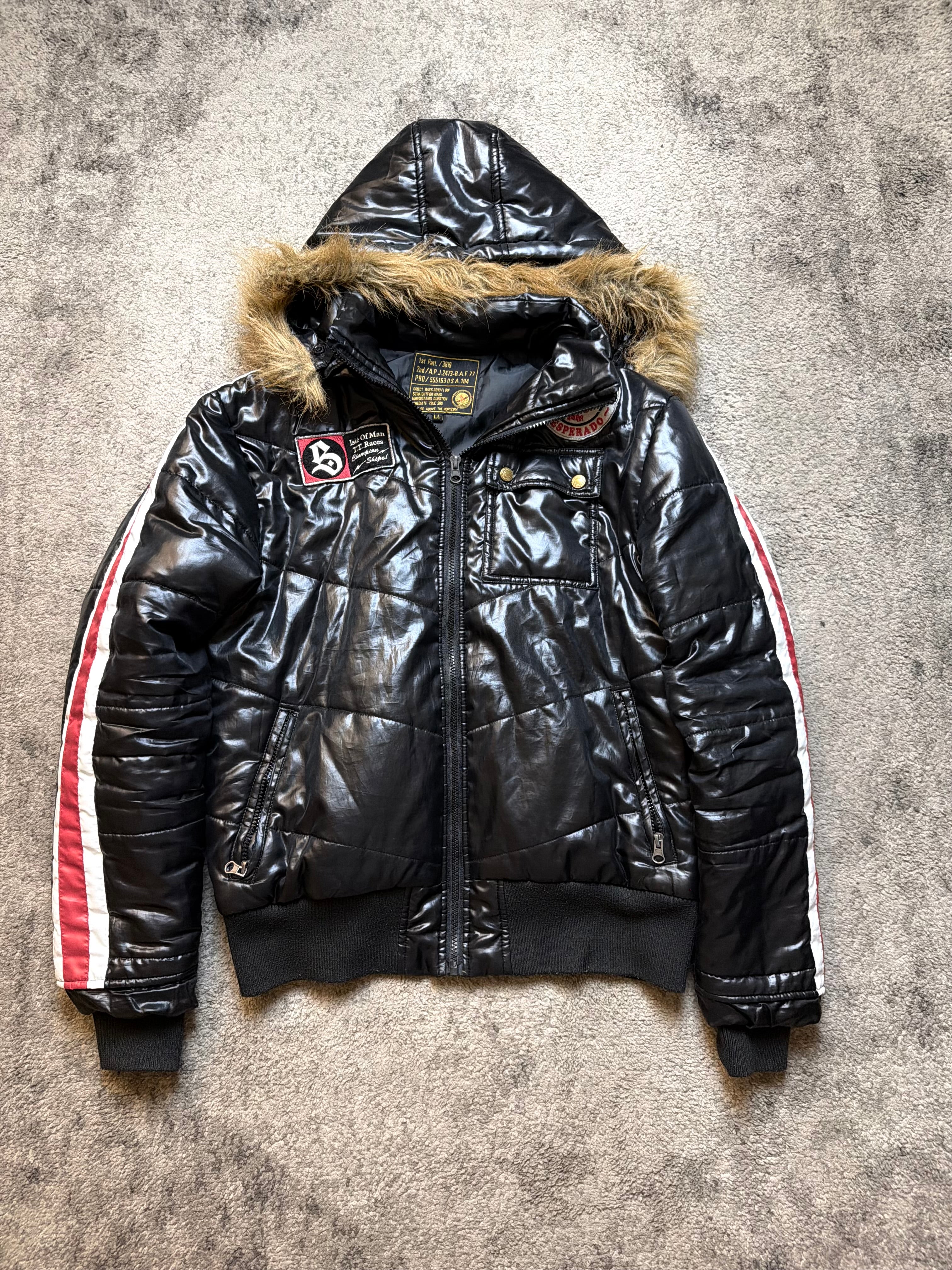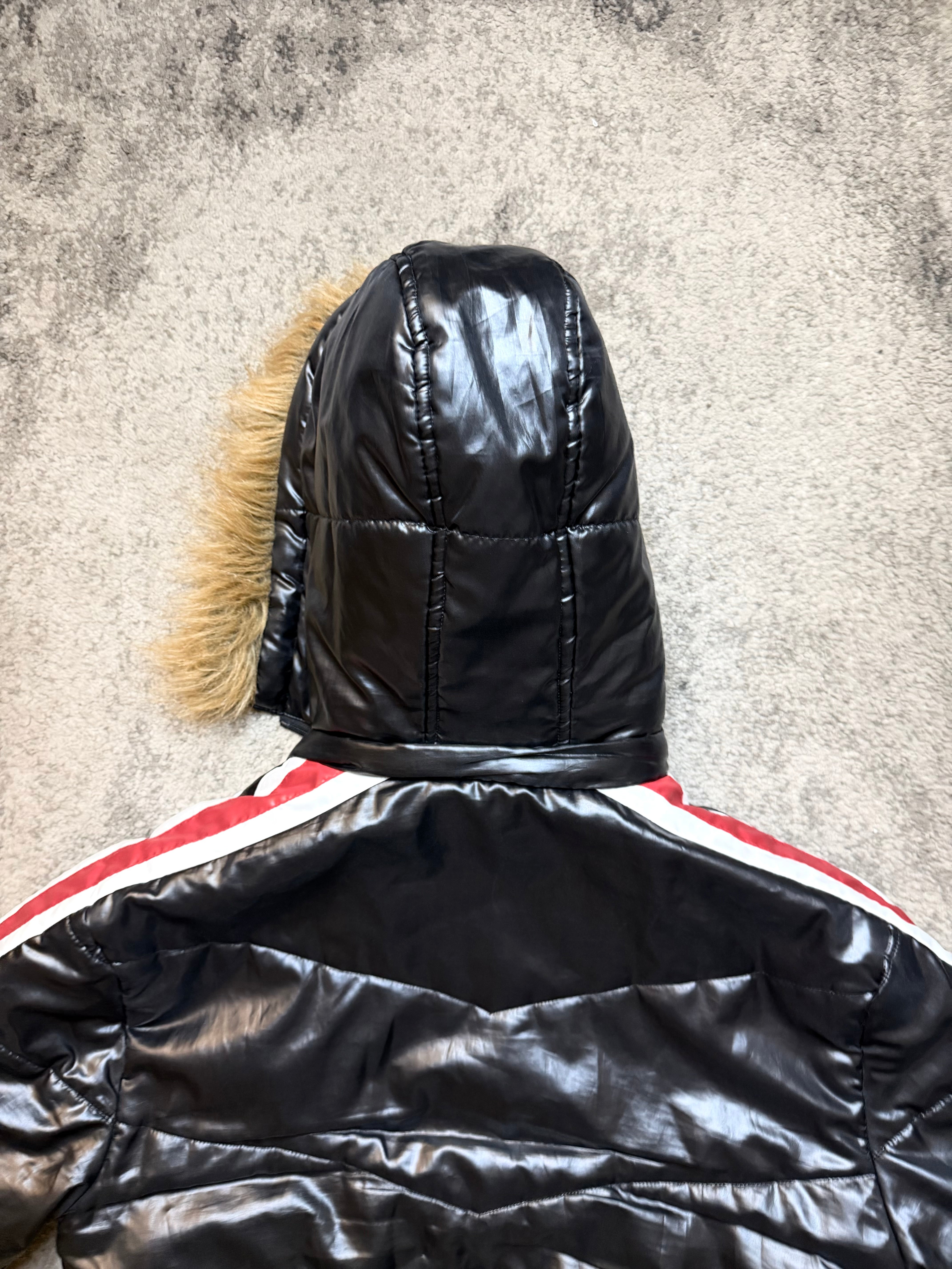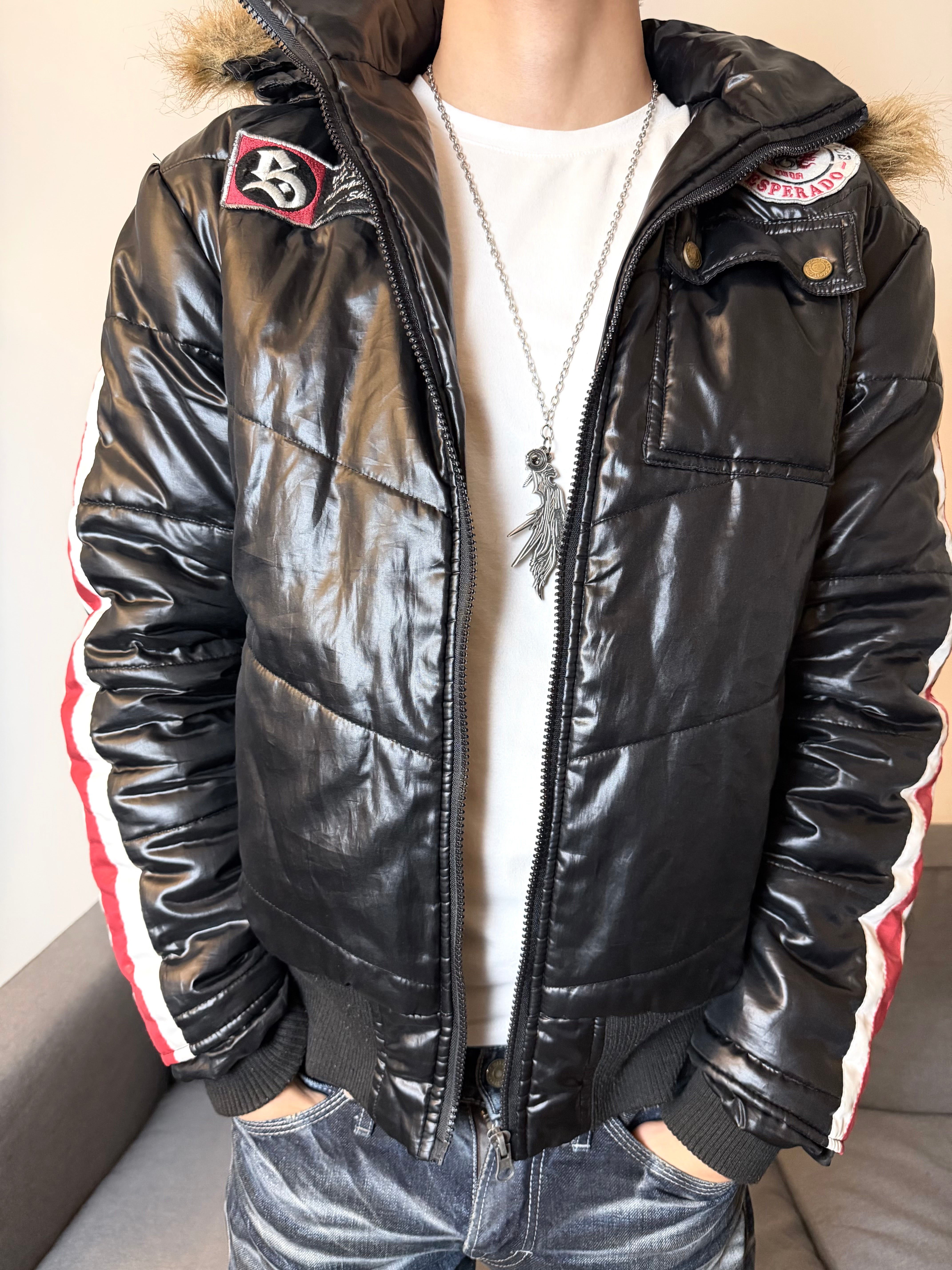 A loud, attitude-heavy winter piece straight from the golden age of Japanese Y2K streetwear. Glossy black shell, bold racing stripes, patched chest, and a fur-trimmed hood that screams midnight rebellion. It’s fast, flashy, and impossible to look away from.