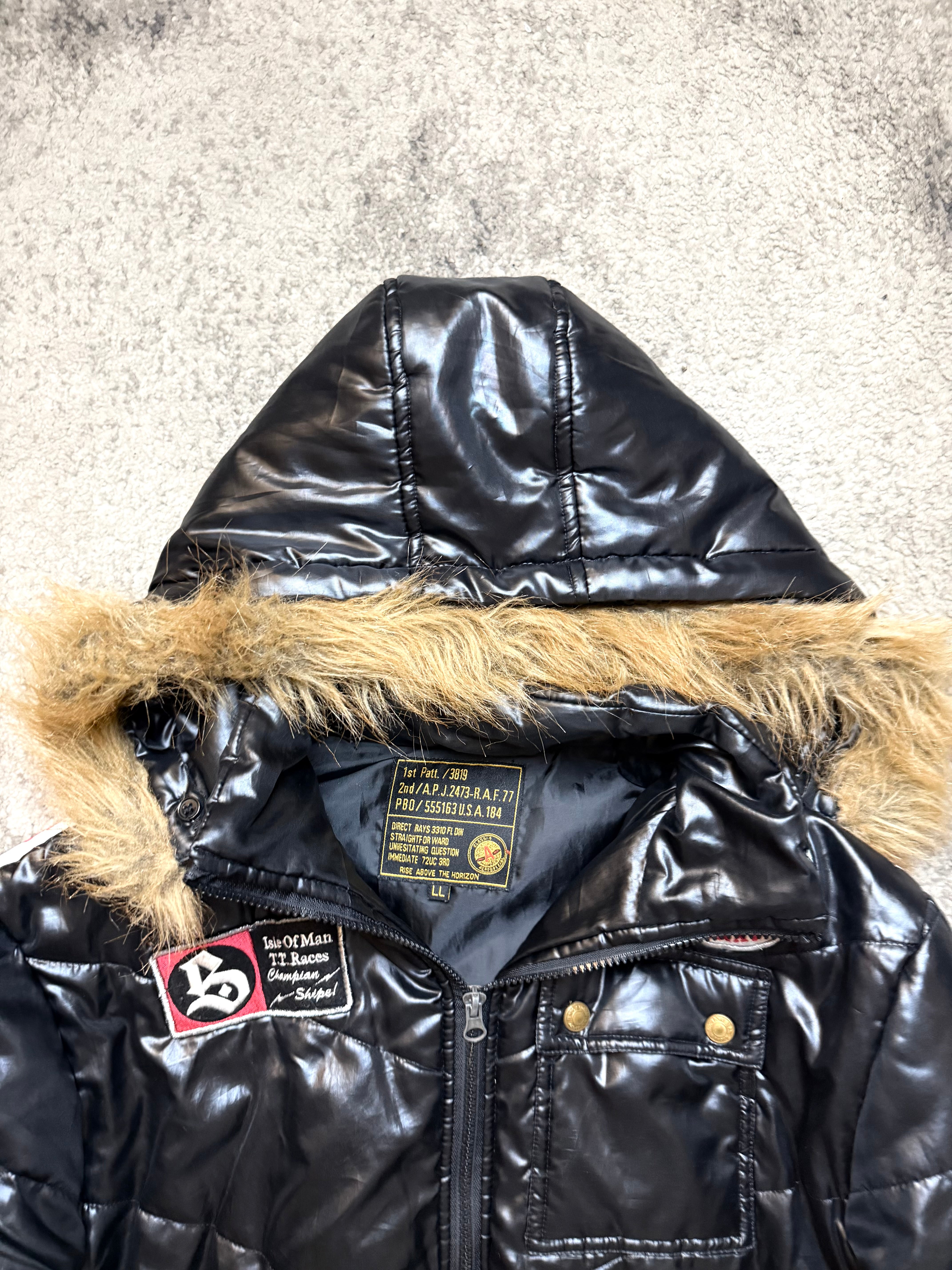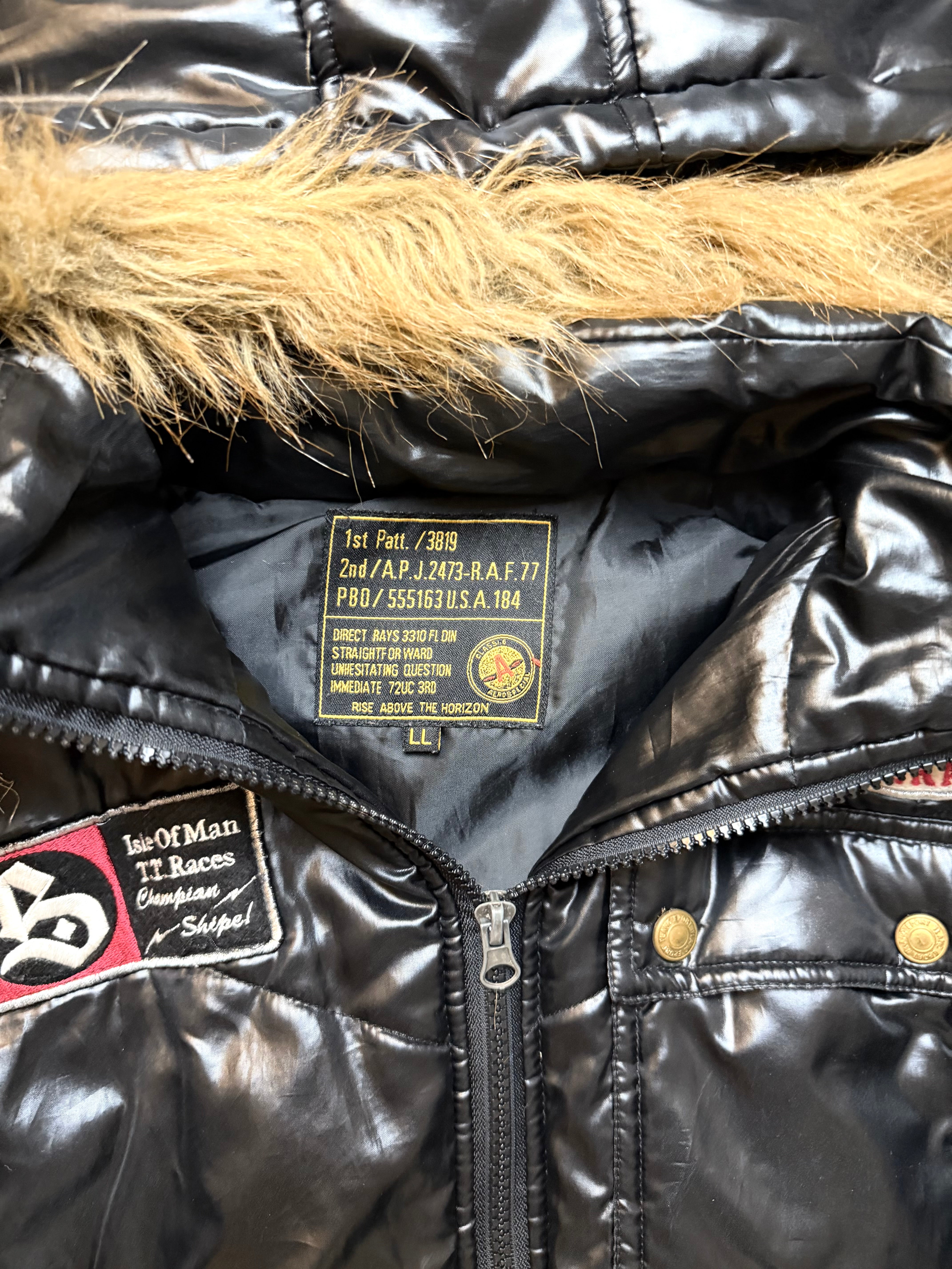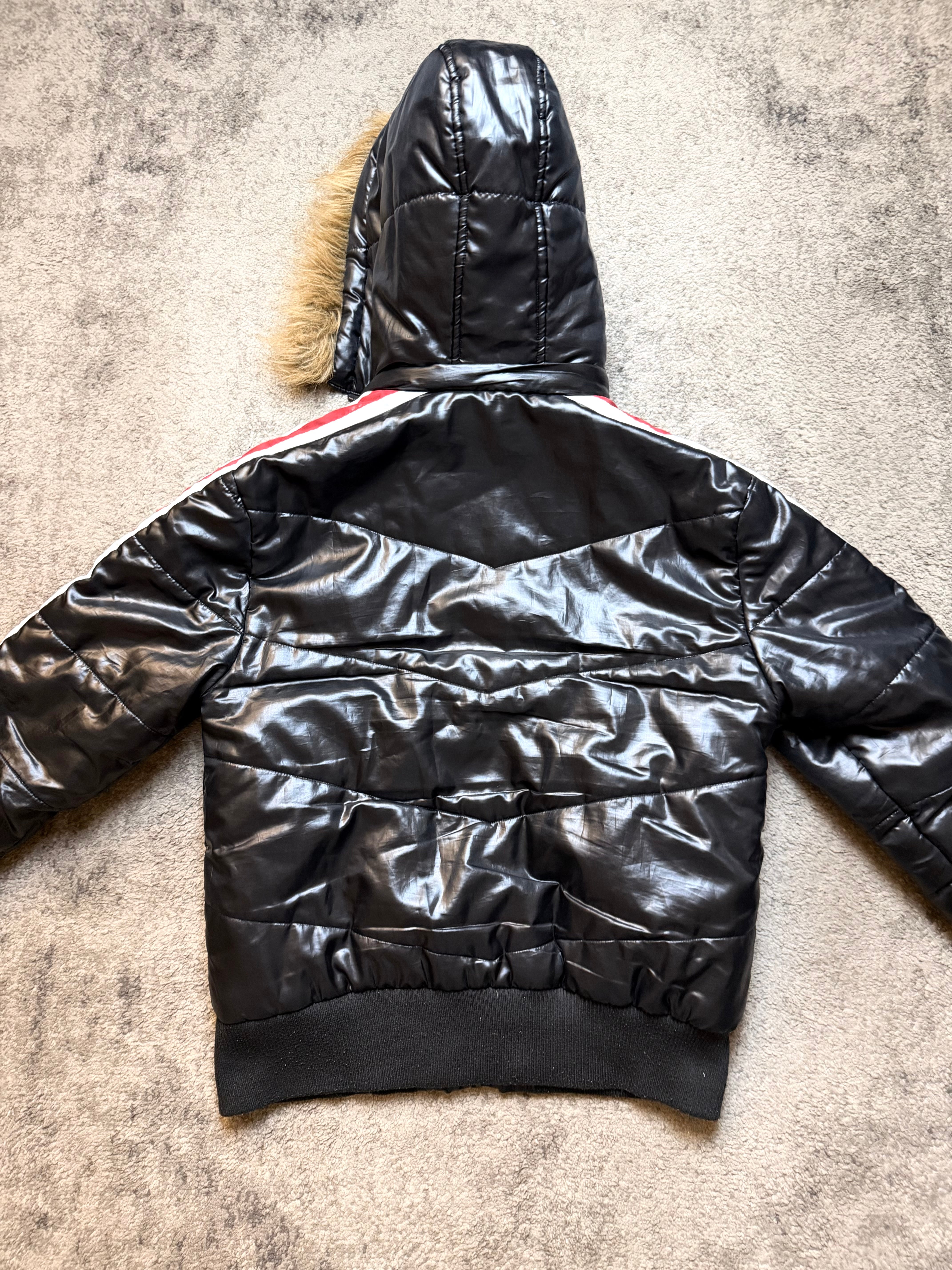 A loud, attitude-heavy winter piece straight from the golden age of Japanese Y2K streetwear. Glossy black shell, bold racing stripes, patched chest, and a fur-trimmed hood that screams midnight rebellion. It’s fast, flashy, and impossible to look away from.